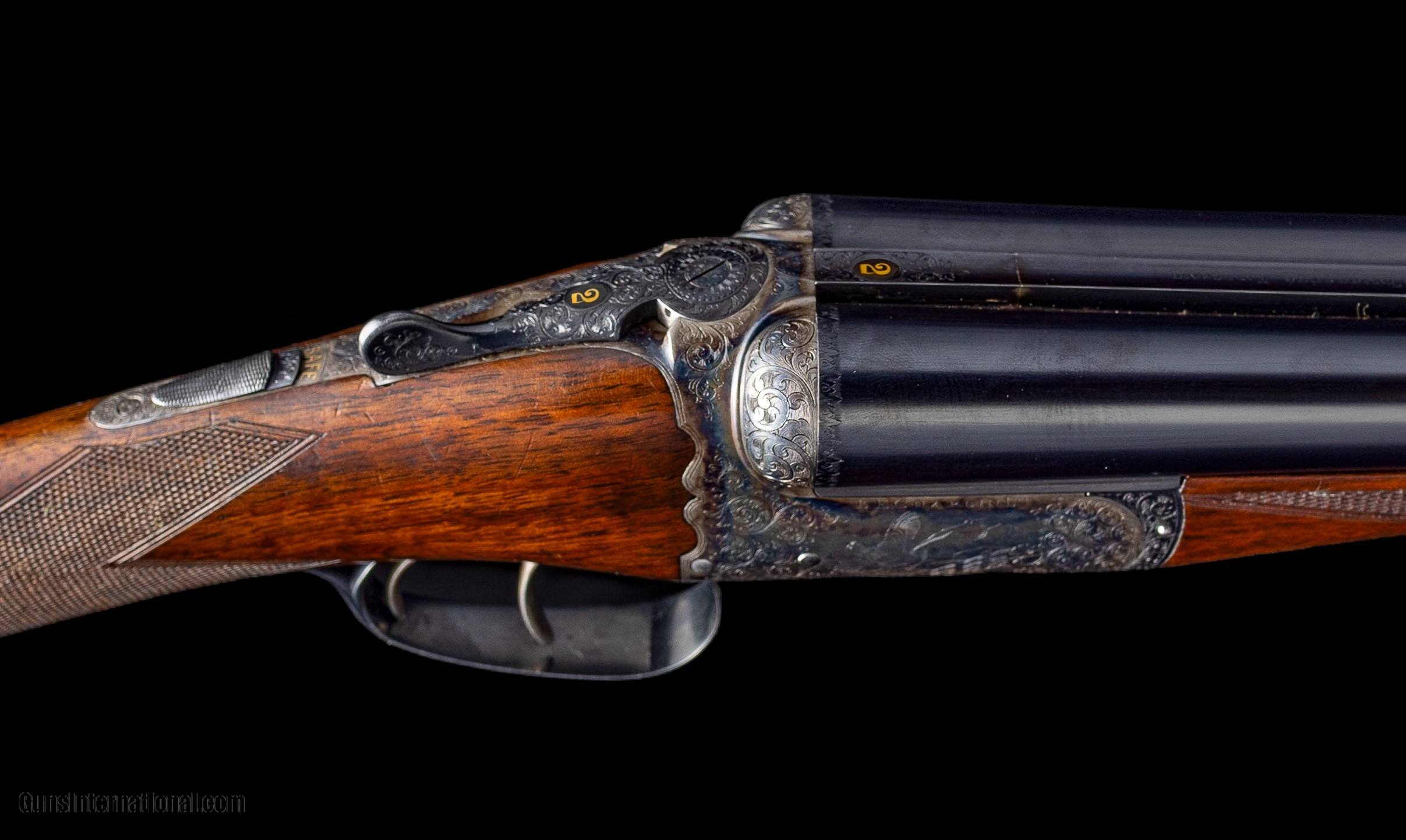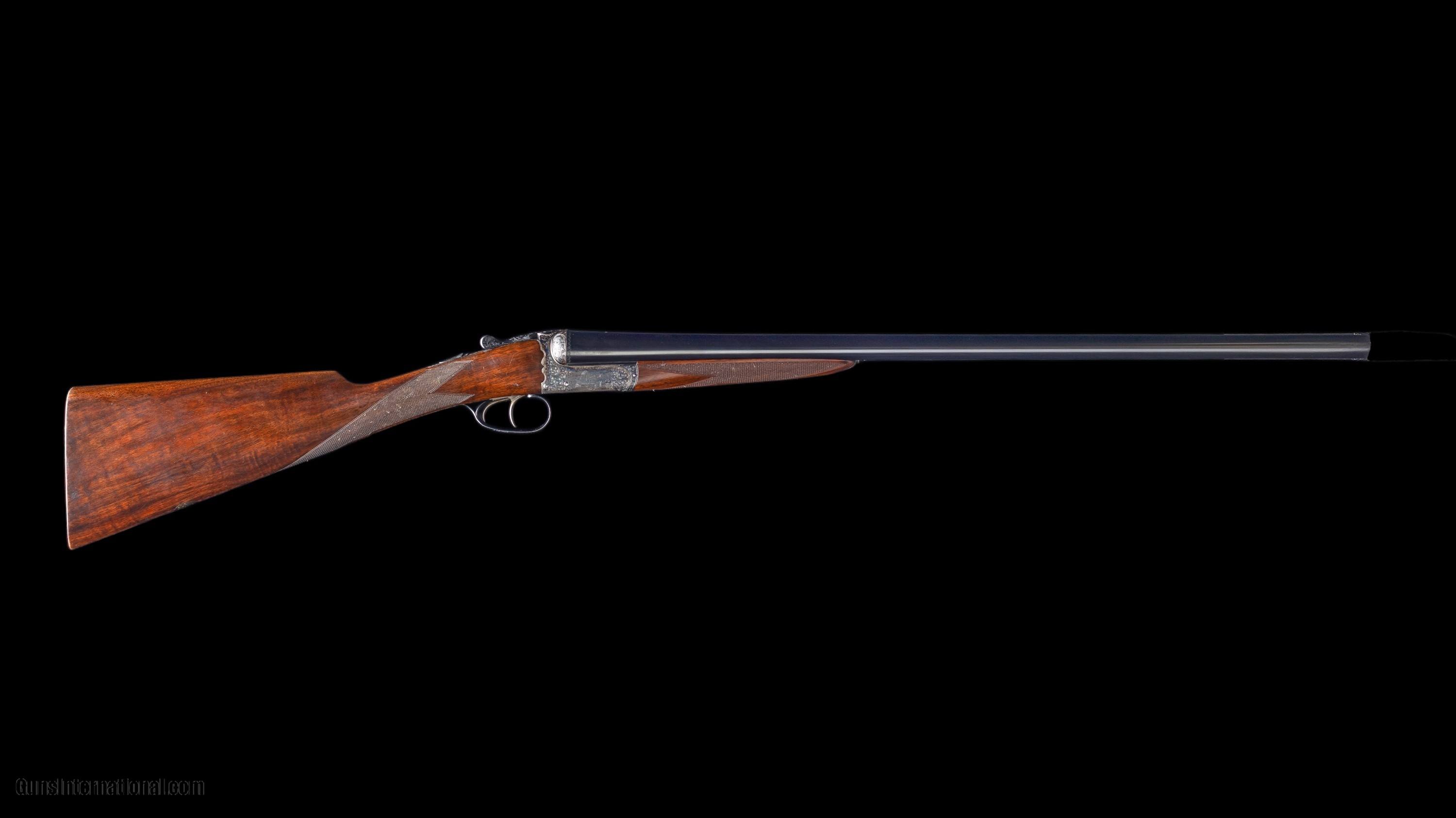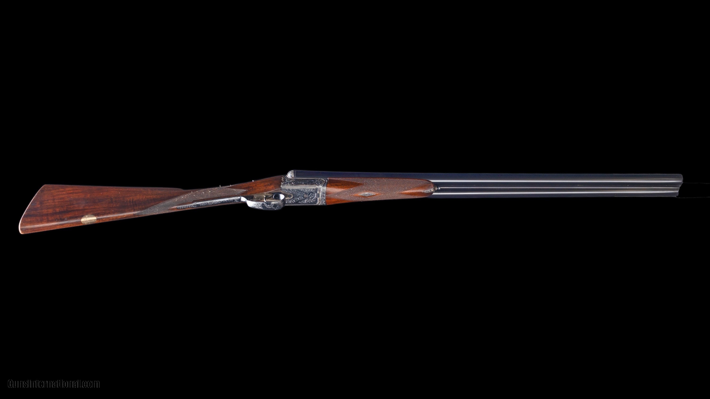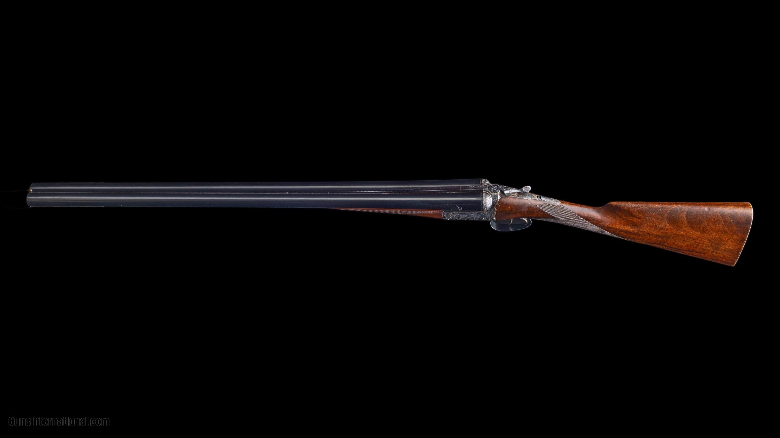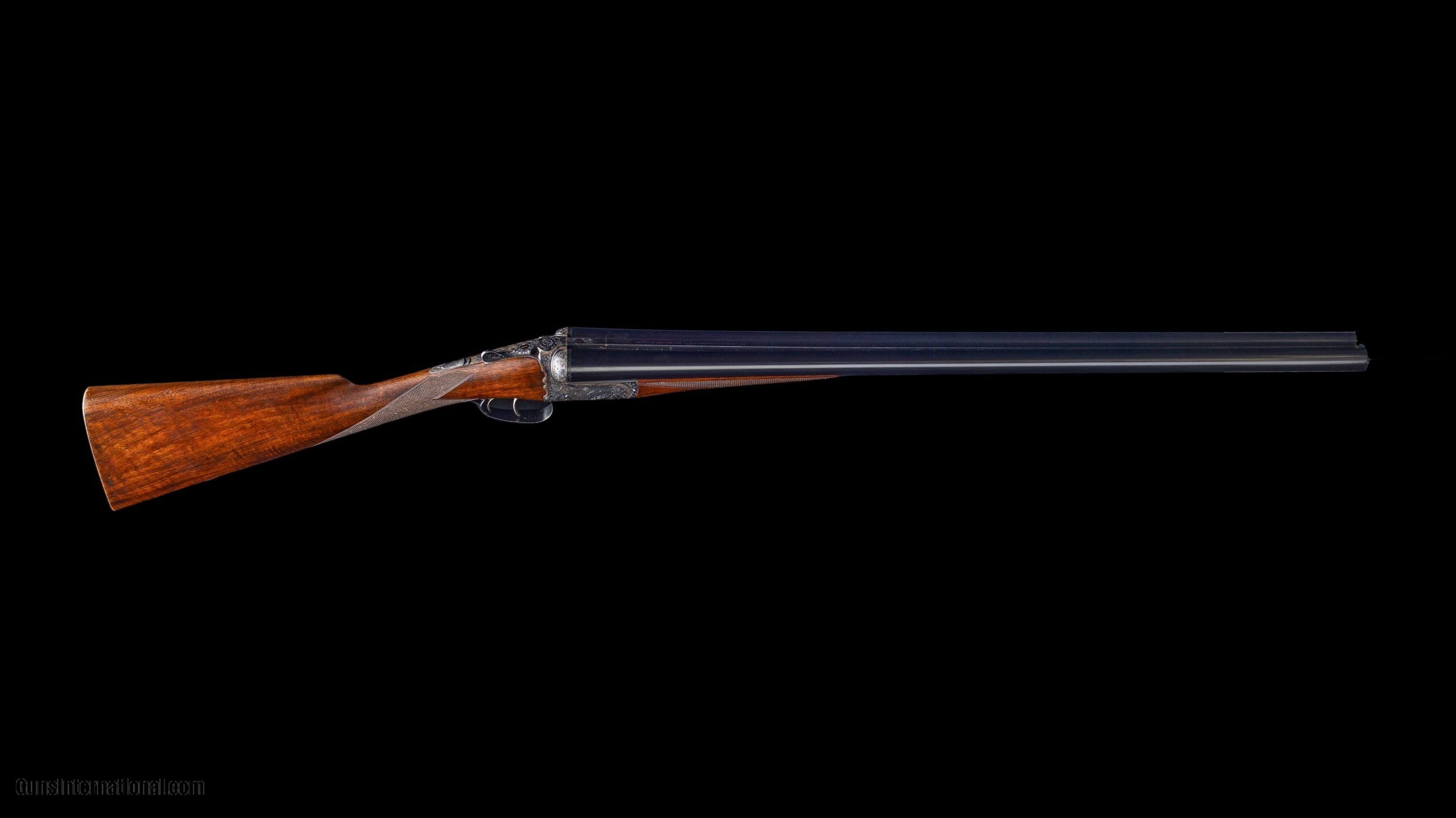 Description: Presented here is an outstanding matched pair of B.E. Chaplin boxlock ejector shotguns in 12 gauge, serial numbers 146301 and 146302, numbered “1” and “2” in gold on the ribs. This consecutive, cased pair is offered in excellent overall condition, complete with their original fitted leather motor case. Specifications (per gun) - Maker / Model: B.E. Chaplin — Boxlock Ejector (Matched Pair) - Gauge: 12 bore (12 ga) - Barrels: 27″, round, nitro-proved - Chambers: 2 3/4″ - Chokes: Fixed — Modified / Improved Modified - Rib: Solid concave smooth rib with single brass bead - Triggers: Double triggers, articulated front trigger (factory) - Stock: English straight grip, finely checkered walnut, oil finish - Length of Pull: 14 3/4″ (over front trigger) - Drops: Drop at comb 1 3/8″ · Drop at heel 2″ - Cast: 3/8″ cast off - Weight: 6 lbs 4 oz each - Serial Numbers: 146301 & 146302 — consecutive, matched, numbered “1” & “2” in gold - Engraving / Finish: Gorgeous fine English scroll engraving; actions retain vivid color case hardening - Accessories: Original fitted leather motor case included Condition Both guns present in excellent overall condition. The stocks are solid and finely figured, checkering remains sharp, and the actions are tight with positive lockup. The barrels and ribs show strong, even finish; bores are bright with no noted defects. The engraving is crisp, and the color case hardening remains vivid. Triggers are crisp, ejectors function properly, and overall mechanics are excellent. The original fitted leather motor case accompanies the pair, showing period-correct wear consistent with age and careful storage. Why this pair Matched pairs of English boxlocks with consecutive serials and original fitted cases are rare and highly desirable. The gold numbering “1” and “2,” fine scroll engraving, and color case-hardened actions elevate this pair well above ordinary field guns. At just 6 lbs 4 oz each, they balance and handle beautifully, making them equally suitable for the field or as part of a focused collection. Shotgun Gauge: 12 Gauge Manufacturer: B.E. Chaplin Model: BLE Serial Number: 146301 and 146302 Barrel Length: 27 Chambers: 2 3/4 Condition: Excellent Metal Condition: Excellent Wood Condition: Excellent Bore Condition: Excellent Barrels: SxS Triggers: Double Stock Comb: 1 3/8 Stock Heel: 2 Stock Cast: 3/8" OFF LOP: 14 3/4 Rib: Concave smooth Weight: 6.4 oz Chokes: Fixed Choke Left: Mod Choke Right: IM Case: Yes Item Location: Michigan Price: $19,999.00 Buy Now Contact Seller |