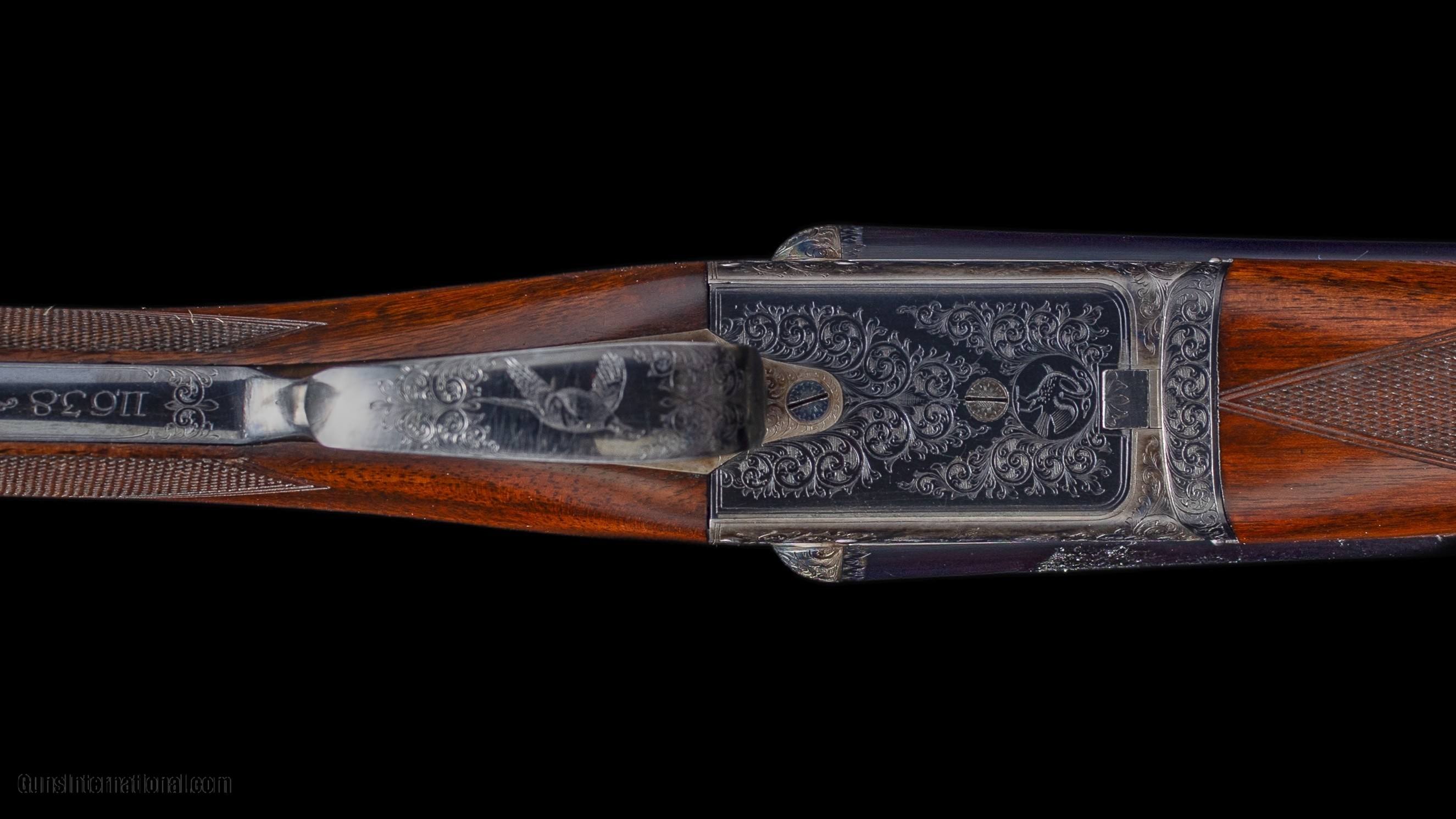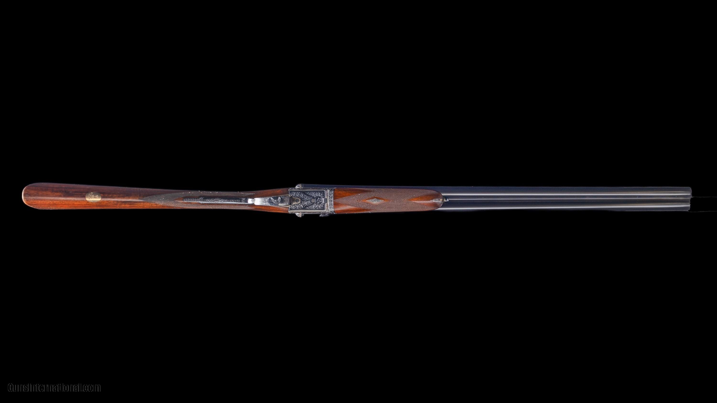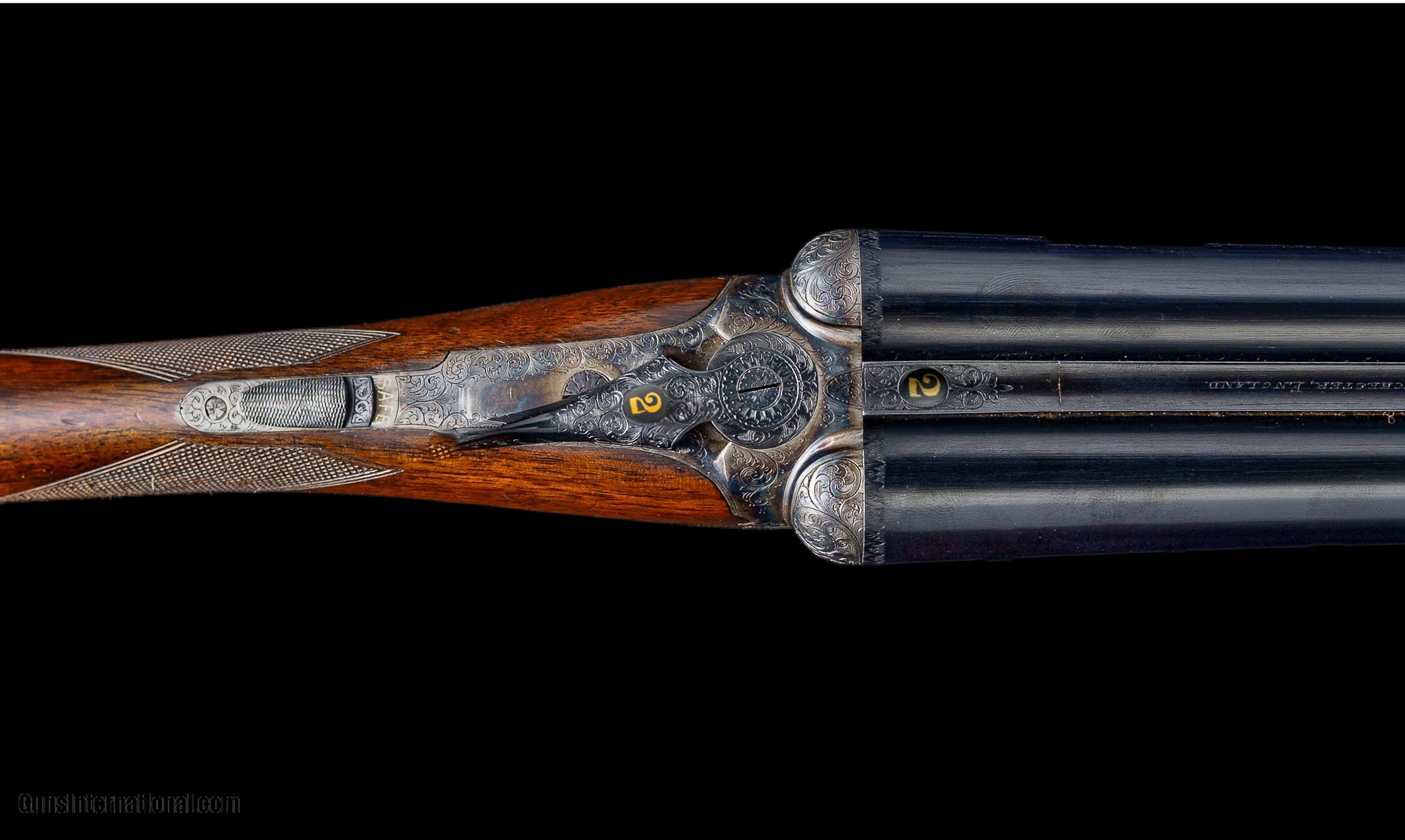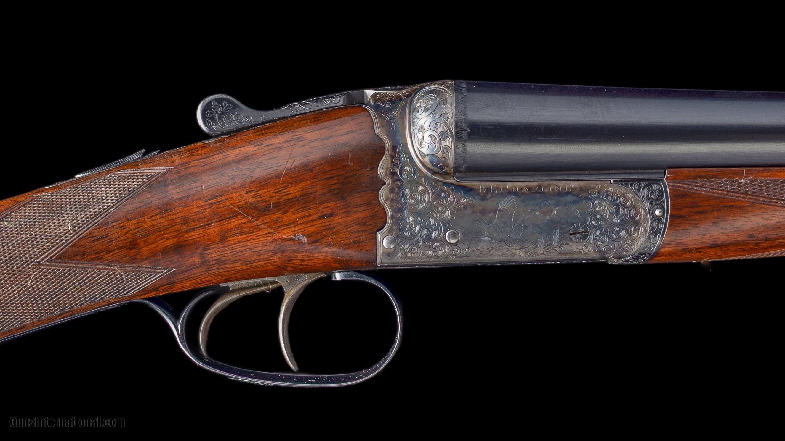 Description: Presented here is an outstanding matched pair of B.E. Chaplin boxlock ejector shotguns in 12 gauge, serial numbers 146301 and 146302, numbered “1” and “2” in gold on the ribs. This consecutive, cased pair is offered in excellent overall condition, complete with their original fitted leather motor case. Specifications (per gun) - Maker / Model: B.E. Chaplin — Boxlock Ejector (Matched Pair) - Gauge: 12 bore (12 ga) - Barrels: 27″, round, nitro-proved - Chambers: 2 3/4″ - Chokes: Fixed — Modified / Improved Modified - Rib: Solid concave smooth rib with single brass bead - Triggers: Double triggers, articulated front trigger (factory) - Stock: English straight grip, finely checkered walnut, oil finish - Length of Pull: 14 3/4″ (over front trigger) - Drops: Drop at comb 1 3/8″ · Drop at heel 2″ - Cast: 3/8″ cast off - Weight: 6 lbs 4 oz each - Serial Numbers: 146301 & 146302 — consecutive, matched, numbered “1” & “2” in gold - Engraving / Finish: Gorgeous fine English scroll engraving; actions retain vivid color case hardening - Accessories: Original fitted leather motor case included Condition Both guns present in excellent overall condition. The stocks are solid and finely figured, checkering remains sharp, and the actions are tight with positive lockup. The barrels and ribs show strong, even finish; bores are bright with no noted defects. The engraving is crisp, and the color case hardening remains vivid. Triggers are crisp, ejectors function properly, and overall mechanics are excellent. The original fitted leather motor case accompanies the pair, showing period-correct wear consistent with age and careful storage. Why this pair Matched pairs of English boxlocks with consecutive serials and original fitted cases are rare and highly desirable. The gold numbering “1” and “2,” fine scroll engraving, and color case-hardened actions elevate this pair well above ordinary field guns. At just 6 lbs 4 oz each, they balance and handle beautifully, making them equally suitable for the field or as part of a focused collection. Shotgun Gauge: 12 Gauge Manufacturer: B.E. Chaplin Model: BLE Serial Number: 146301 and 146302 Barrel Length: 27 Chambers: 2 3/4 Condition: Excellent Metal Condition: Excellent Wood Condition: Excellent Bore Condition: Excellent Barrels: SxS Triggers: Double Stock Comb: 1 3/8 Stock Heel: 2 Stock Cast: 3/8" OFF LOP: 14 3/4 Rib: Concave smooth Weight: 6.4 oz Chokes: Fixed Choke Left: Mod Choke Right: IM Case: Yes Item Location: Michigan Price: $19,999.00 Buy Now Contact Seller |