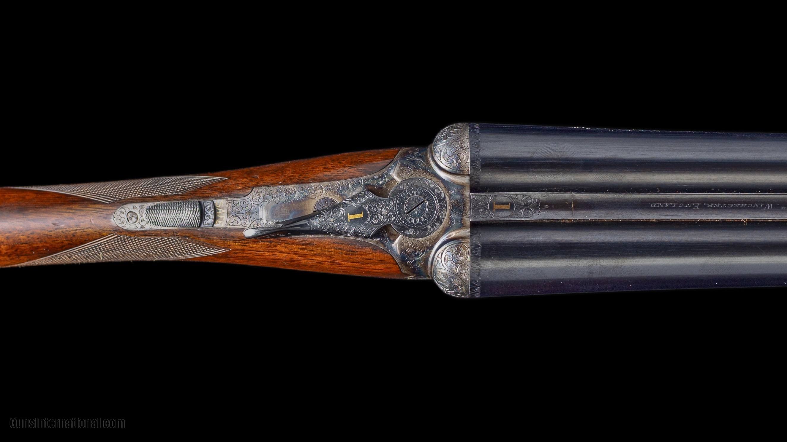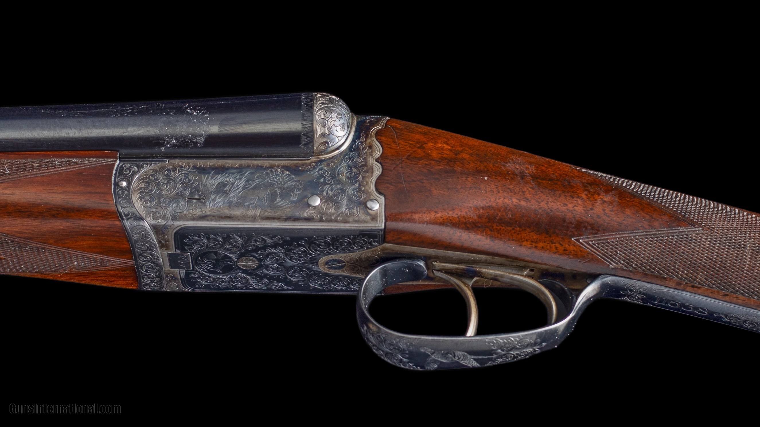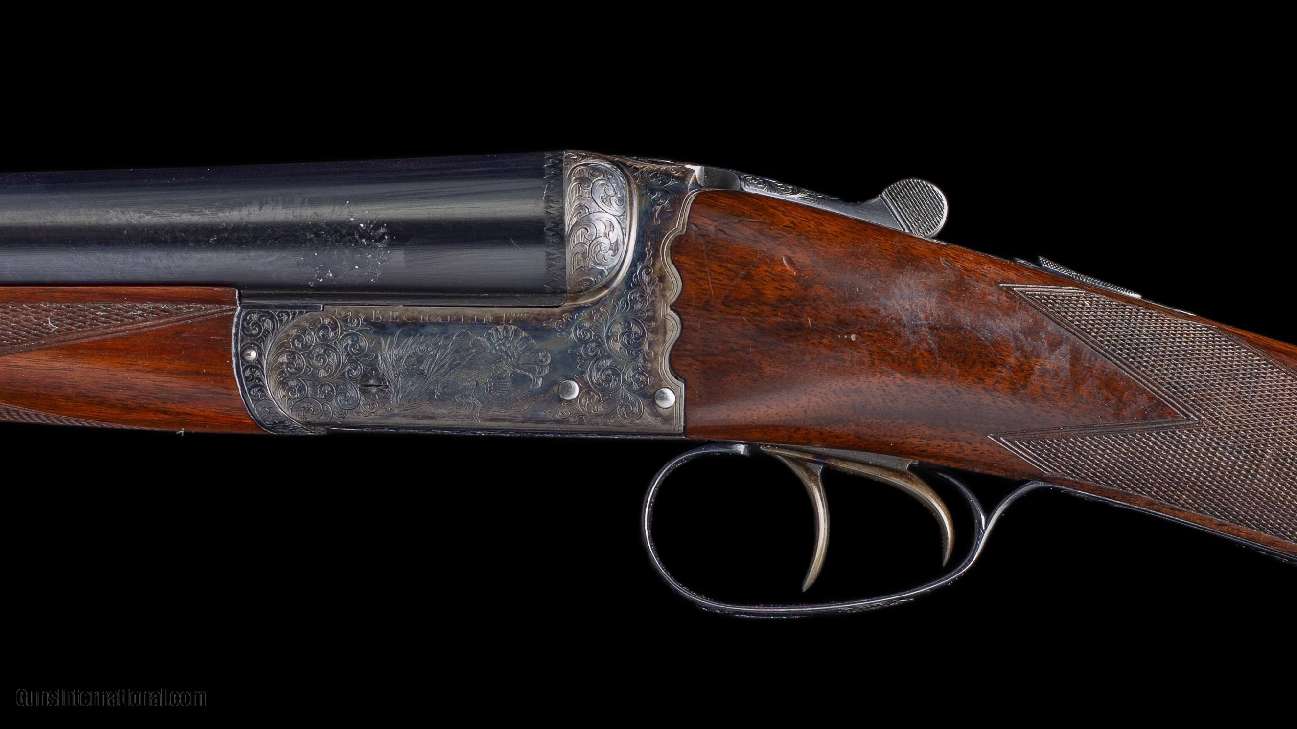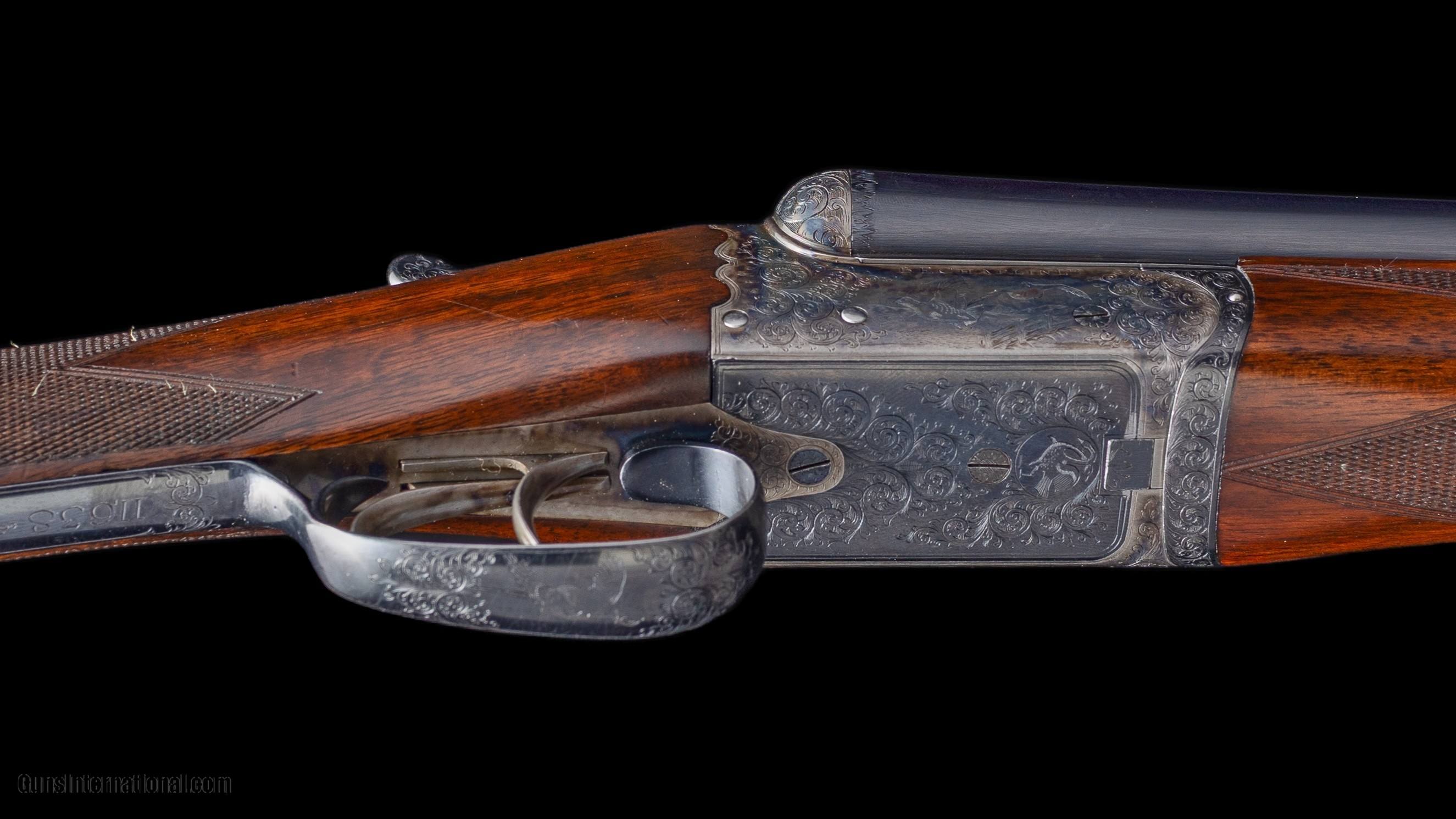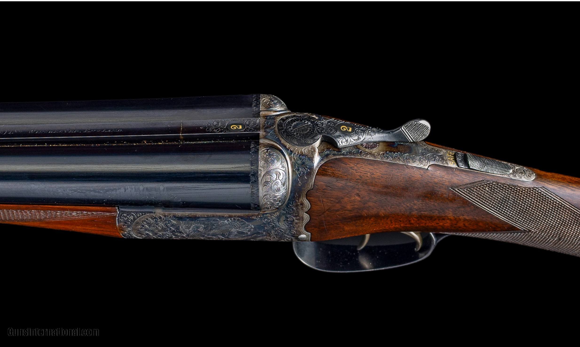 Description: Presented here is an outstanding matched pair of B.E. Chaplin boxlock ejector shotguns in 12 gauge, serial numbers 146301 and 146302, numbered “1” and “2” in gold on the ribs. This consecutive, cased pair is offered in excellent overall condition, complete with their original fitted leather motor case. Specifications (per gun) - Maker / Model: B.E. Chaplin — Boxlock Ejector (Matched Pair) - Gauge: 12 bore (12 ga) - Barrels: 27″, round, nitro-proved - Chambers: 2 3/4″ - Chokes: Fixed — Modified / Improved Modified - Rib: Solid concave smooth rib with single brass bead - Triggers: Double triggers, articulated front trigger (factory) - Stock: English straight grip, finely checkered walnut, oil finish - Length of Pull: 14 3/4″ (over front trigger) - Drops: Drop at comb 1 3/8″ · Drop at heel 2″ - Cast: 3/8″ cast off - Weight: 6 lbs 4 oz each - Serial Numbers: 146301 & 146302 — consecutive, matched, numbered “1” & “2” in gold - Engraving / Finish: Gorgeous fine English scroll engraving; actions retain vivid color case hardening - Accessories: Original fitted leather motor case included Condition Both guns present in excellent overall condition. The stocks are solid and finely figured, checkering remains sharp, and the actions are tight with positive lockup. The barrels and ribs show strong, even finish; bores are bright with no noted defects. The engraving is crisp, and the color case hardening remains vivid. Triggers are crisp, ejectors function properly, and overall mechanics are excellent. The original fitted leather motor case accompanies the pair, showing period-correct wear consistent with age and careful storage. Why this pair Matched pairs of English boxlocks with consecutive serials and original fitted cases are rare and highly desirable. The gold numbering “1” and “2,” fine scroll engraving, and color case-hardened actions elevate this pair well above ordinary field guns. At just 6 lbs 4 oz each, they balance and handle beautifully, making them equally suitable for the field or as part of a focused collection. Shotgun Gauge: 12 Gauge Manufacturer: B.E. Chaplin Model: BLE Serial Number: 146301 and 146302 Barrel Length: 27 Chambers: 2 3/4 Condition: Excellent Metal Condition: Excellent Wood Condition: Excellent Bore Condition: Excellent Barrels: SxS Triggers: Double Stock Comb: 1 3/8 Stock Heel: 2 Stock Cast: 3/8" OFF LOP: 14 3/4 Rib: Concave smooth Weight: 6.4 oz Chokes: Fixed Choke Left: Mod Choke Right: IM Case: Yes Item Location: Michigan Price: $19,999.00 Buy Now Contact Seller |