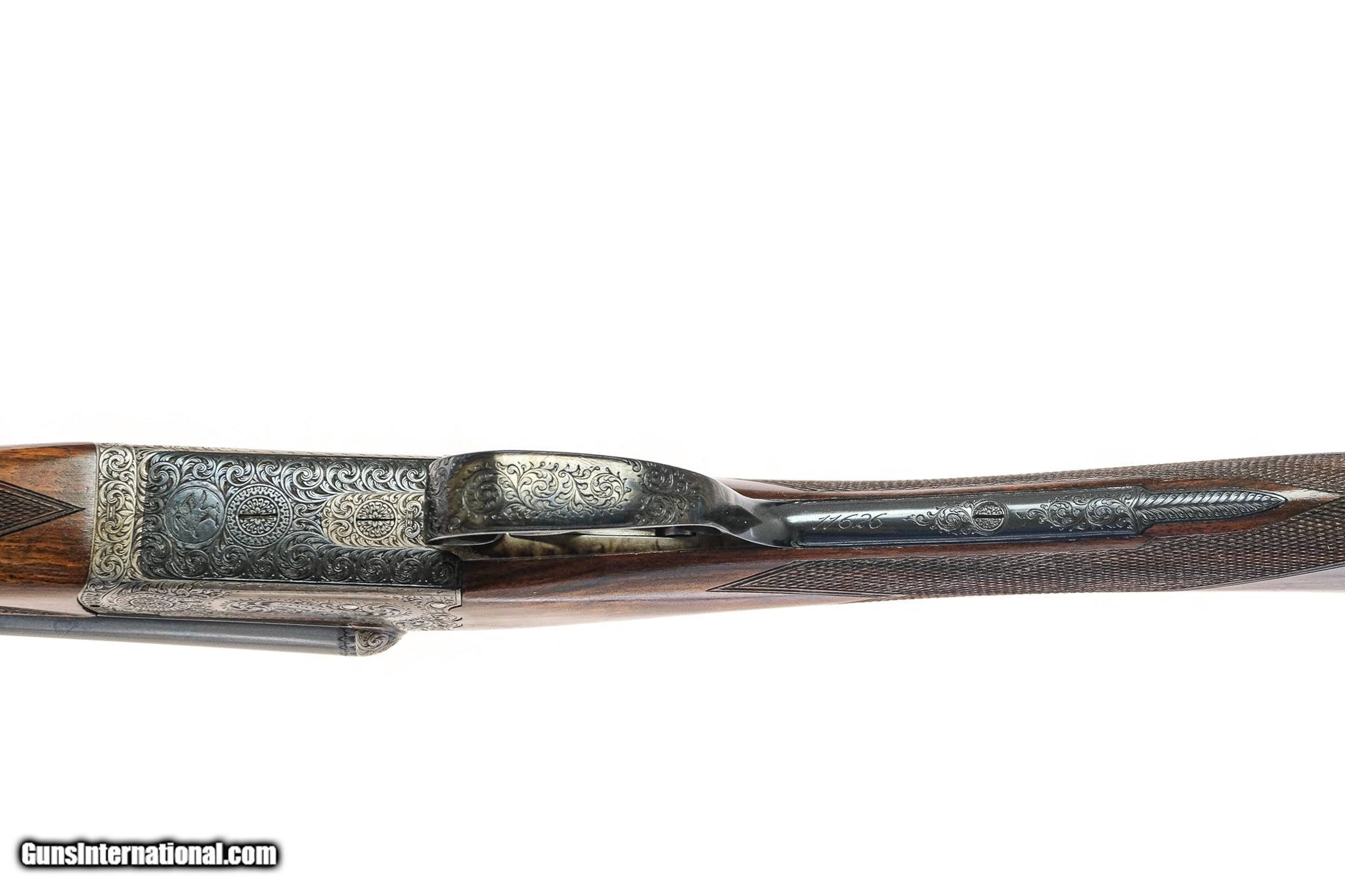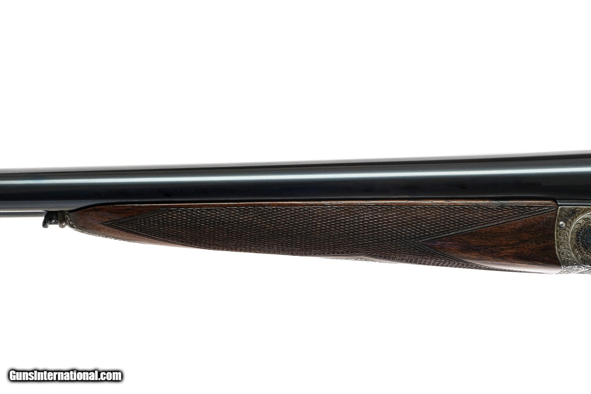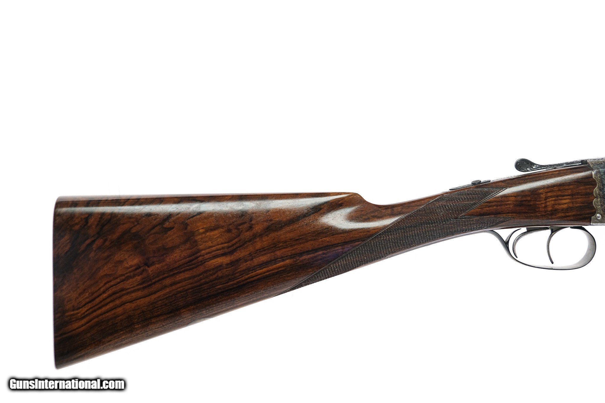 Description: B.E. Chaplin - Scalloped Boxlock, SxS, Casbard Engraved, 28ga. 26" Barrels Choked M/IM. Casbard Engraved scalloped box lock automatic ejector 26" barrels, 2 ½" chambers. Choked M/IM. This gun is profusely engraved with foliate scroll, maker’s name, and banner. 14" highly figured stock, built in 1979 for Lord Rank and was engraved by Casbard. The gun is 100% unused and new. Straight grip, checkered butt. This is a very high-grade gun built to the highest standards. In the maker’s lightweight leather case, this gun has 100% case color, barrel blue and wood finish. A gorgeous lightweight small bore English gun that is new. Inv: 82977 4 lbs. 10 oz. 14 1/8" x 1 ½" x 2 ¼" $8,995.00 The largest, most diverse, high-grade shotgun and firearms inventory in history. There is no one even close and a service department to back up everything we sell with our unparalelled warranty to support our customers exclusively. If someone tells you they have a larger inventory, just look for yourself. SOLD |