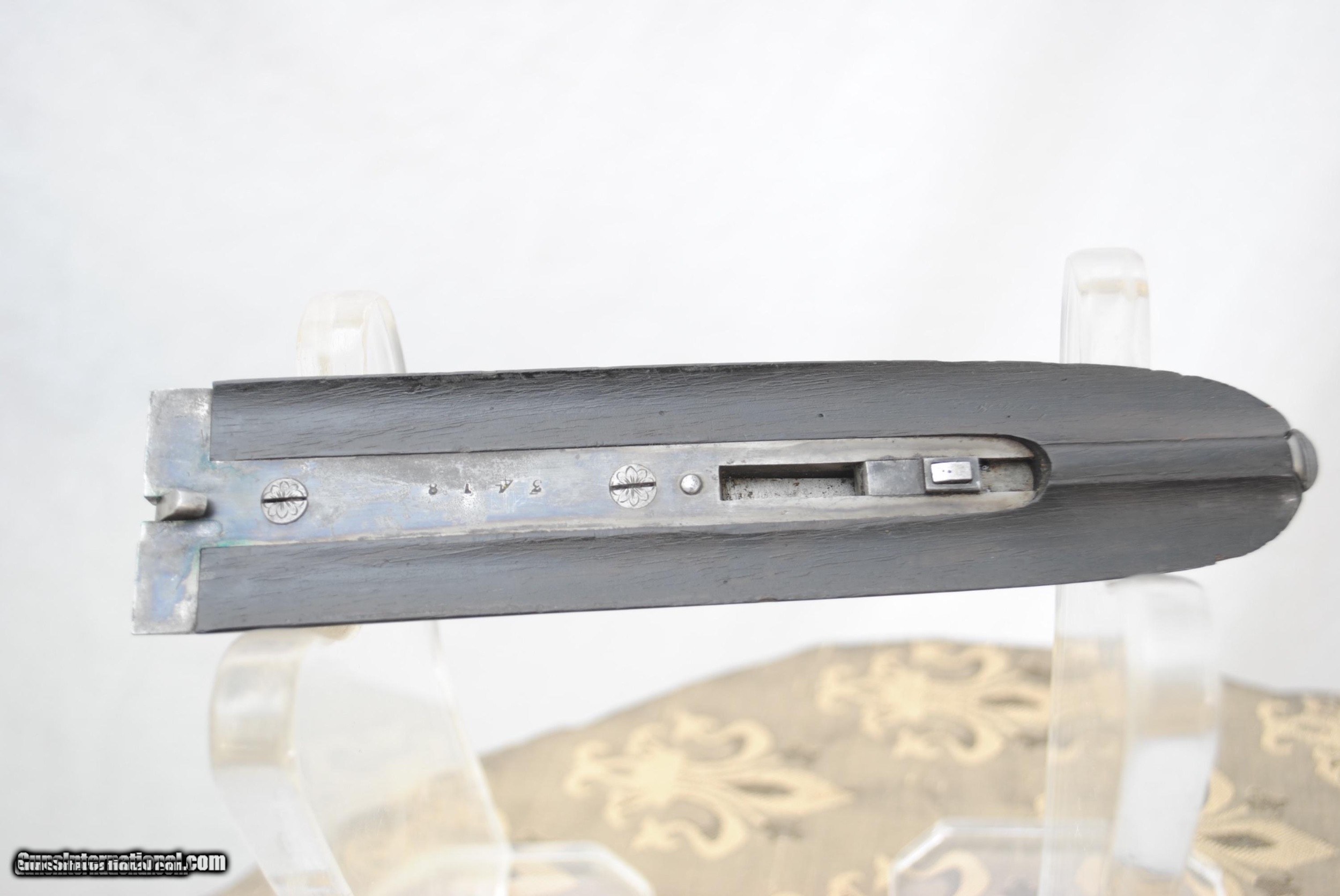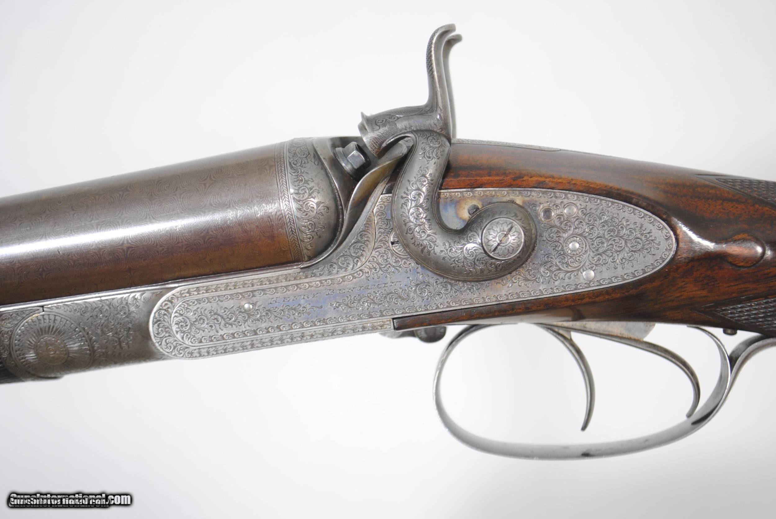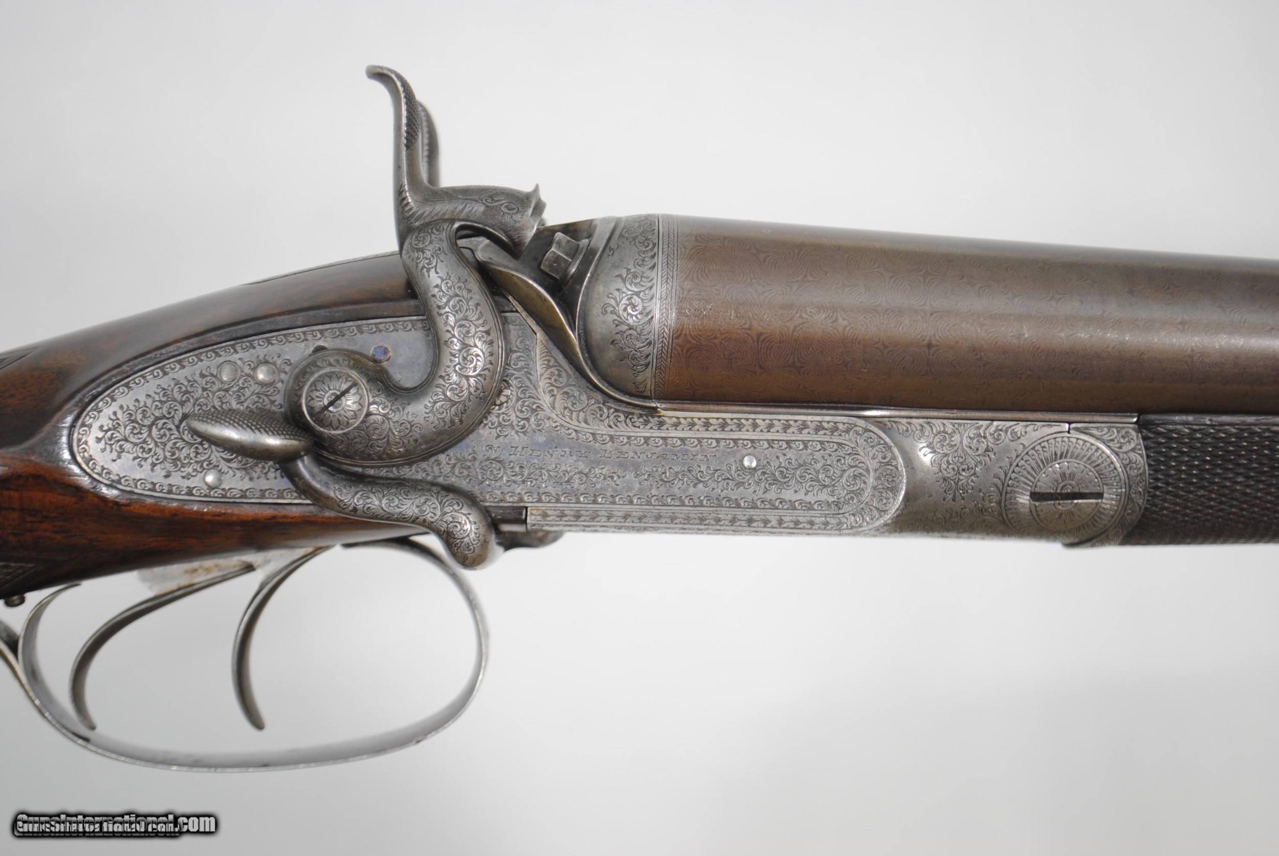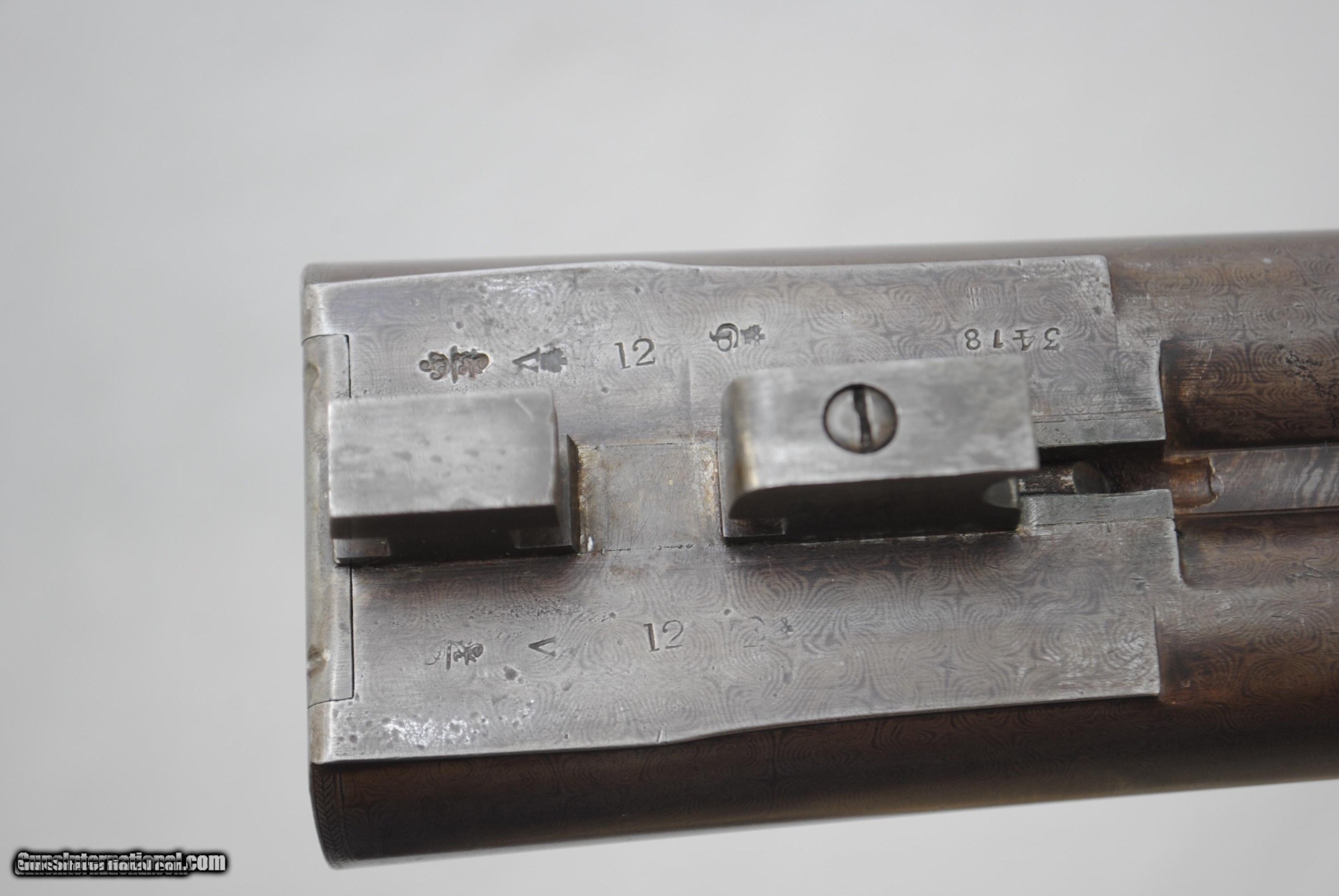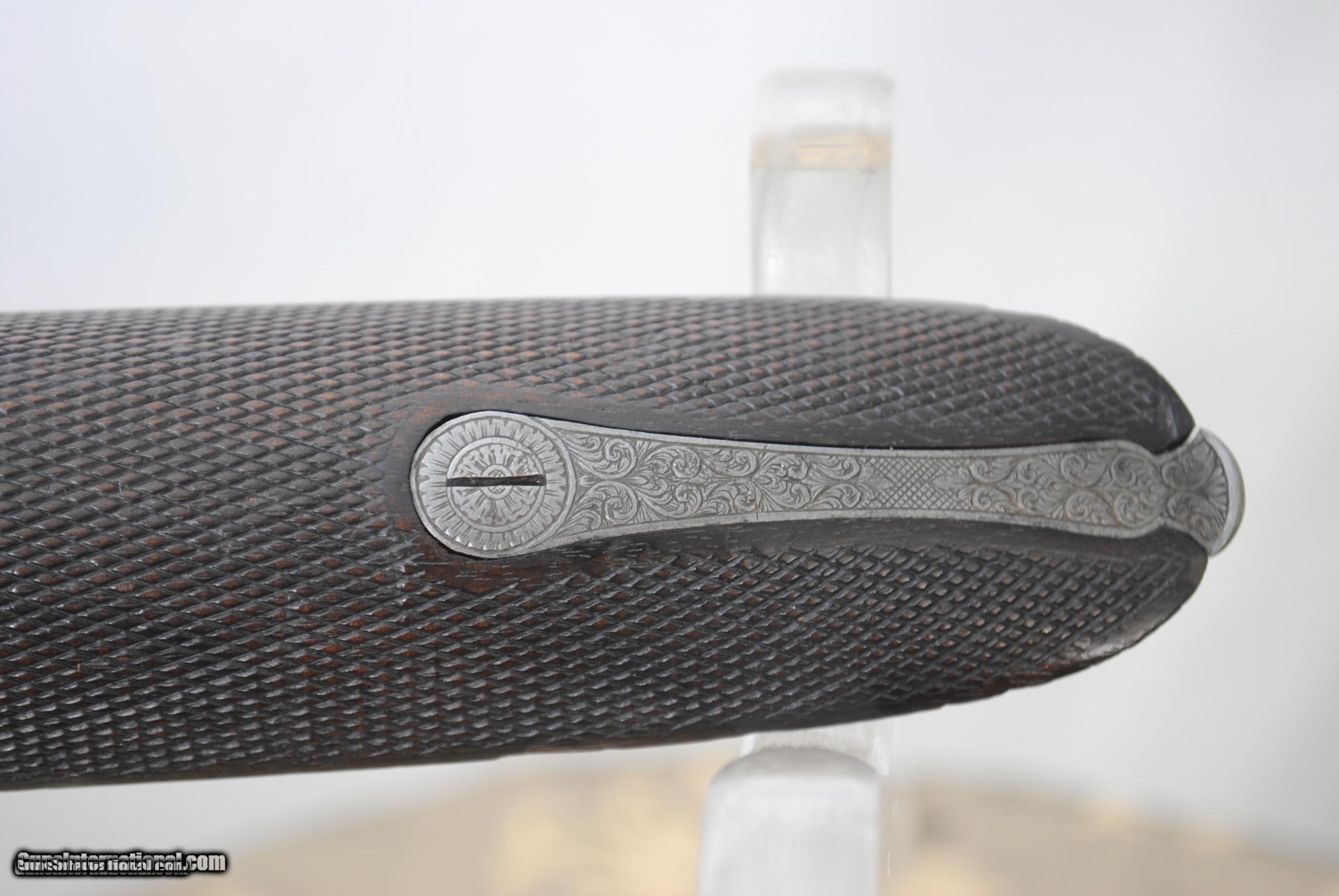Description: Description:Here is a Henry Bejamin 12 gauge hammer gun utilizing the Stephan Grant Sidelever locking system. Exceptional quality in all ways equal to Maker Stephan Grant or better. Original case colors and detailed tight English Scroll engraving. Barrels are 30" fine damascus, proofed at "12" and retain their original bore diameter at .726 in each barrel. Excllent bores. Chambers measure 2 1/2". Chokes appear to be light IC in both barrels. The mechanics of the gun are quite good also. Tight on face. No loose ribs. No cracks to the wood. Rebounding hammers. The forend latch is an elegant system patented by Scott (of WC Scott) in 1876. Breech face is clean with no corrosion. Wall thickness is good with a minimum of 32/1000. Weight is 6 LBS 14 OZ. The stock has a desirable long trigger guard tang and contemporary stock dimensions. LOP is 14 9/16". Drop at Comb of 1 1/2", while drop at heel is 2 1/8". Buttplate is the elegant skeleton style with engraving. Very nice figure to the wood. This fine shotgun is an antique and can be shipped directly as local law allows (No NYC or NJ). $5750 plus shipping and insurance. SOLD Antique: Yes |