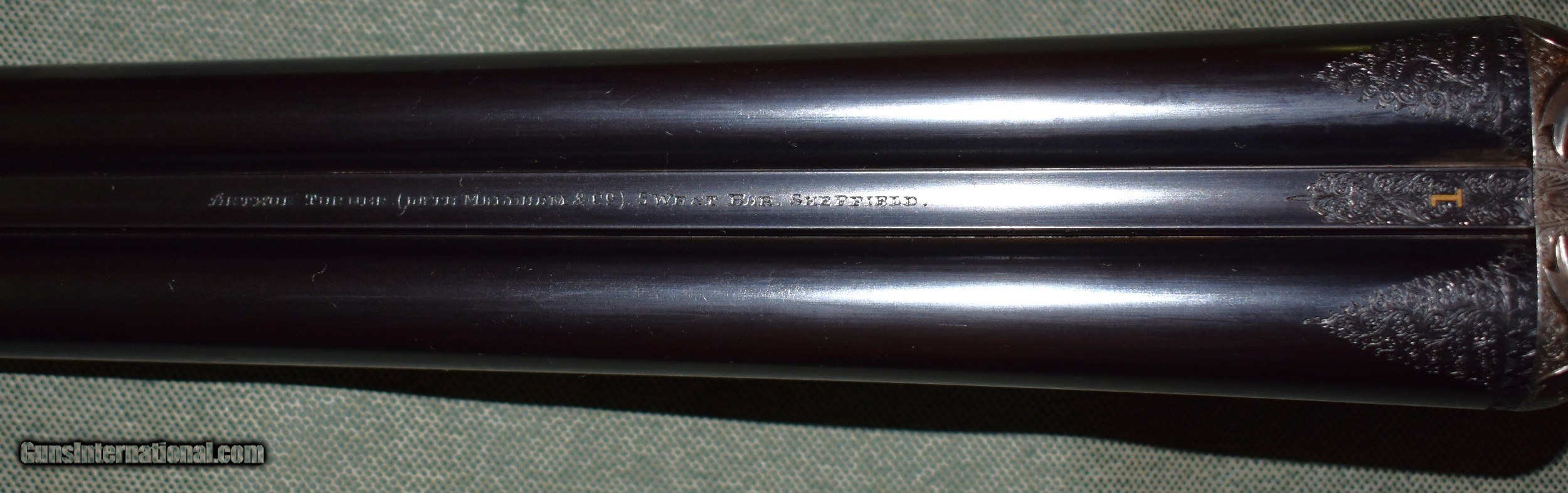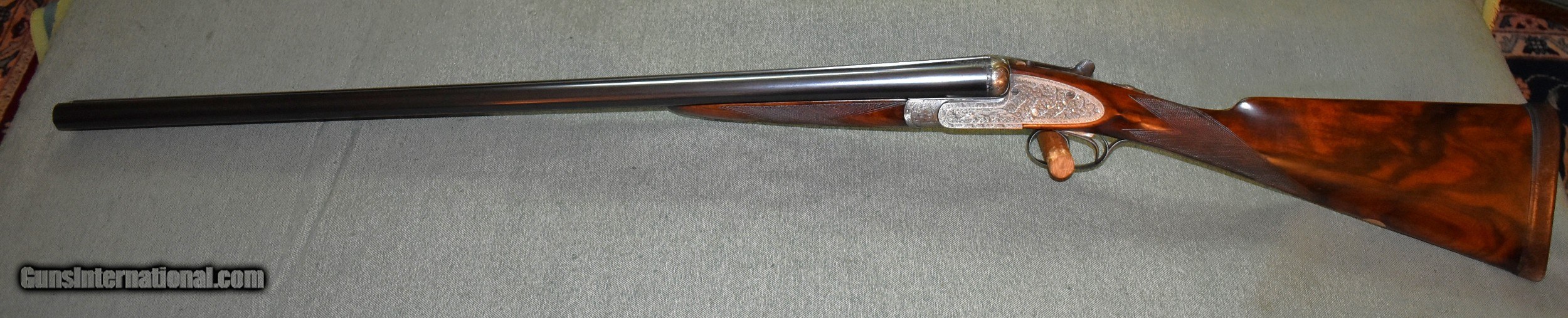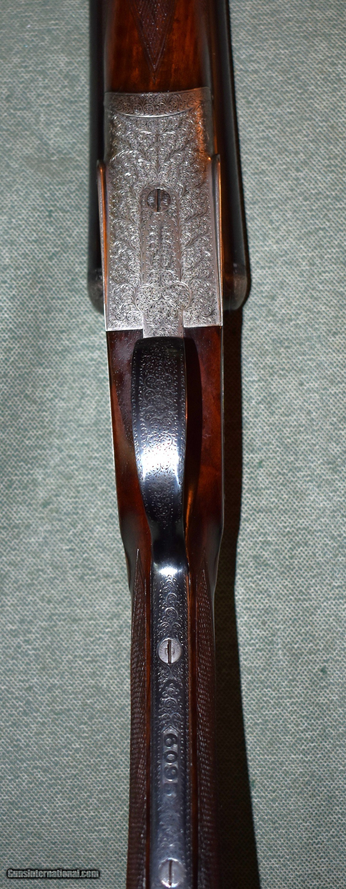 Description: Best Quality sidelock ejector 12 gauge built for Arthur Turner of Sheffield,England. This gun has 28" chopper lump barrels choked improved cylinder (.005") and modified (.020"). The action is fully engraved with English scroll and ribbons. The barrels are on face and lock up tightly to the action with no play. The stock is beautiful dark European walnut with dark figure. The gun is in excellent original condition retaining 98% of the wood and metal finishes. The stock dimensions are 141/2" LOP,11/4" at comb,and 21/4" at heel,with 1/4" cast off. The gun weighs 6-8. Cased in an oak and leather case. Built in the late 1920s so it is C&R eligibile. SOLD Shotgun Gauge: 12 Gauge Manufacturer: Arthur Turner Model: Sidelock Ejector Serial Number: 6095 Barrel Length: 28 Chambers: 21/2 Ejectors: Yes Condition: excellent Metal Condition: excellent Wood Condition: excellent Bore Condition: mint Action: Double Barrel Triggers: Double Stock Dimensions: 141/2"x11/4"x21/4 Butt Pad: Leather Covered Pad Choke Left: Mod (,020") Choke Right: IC (.005") |