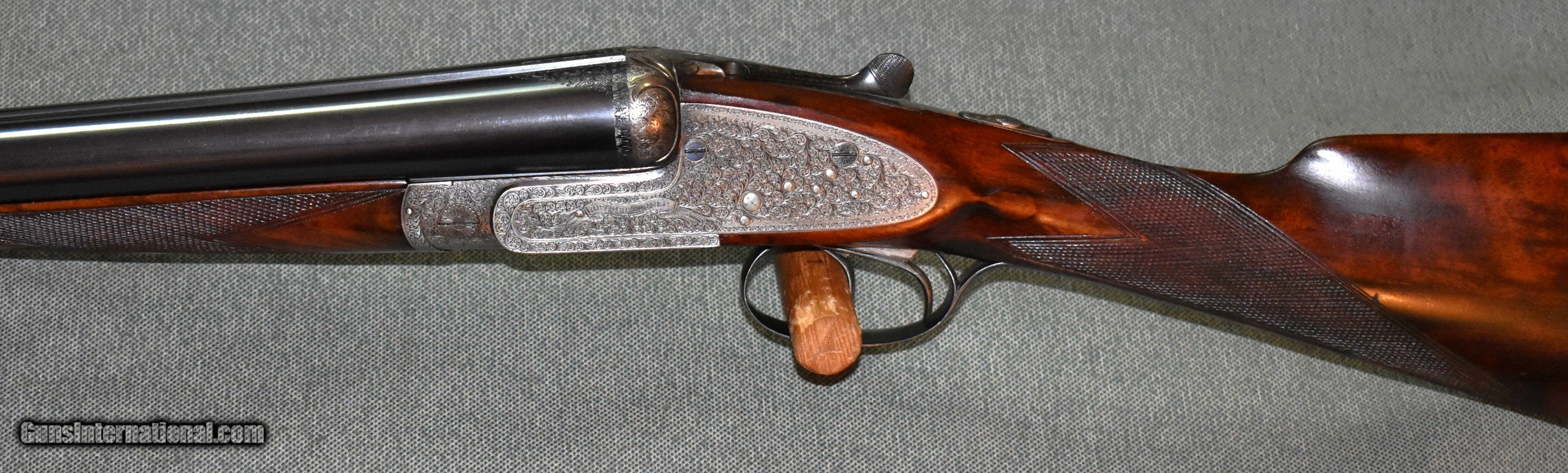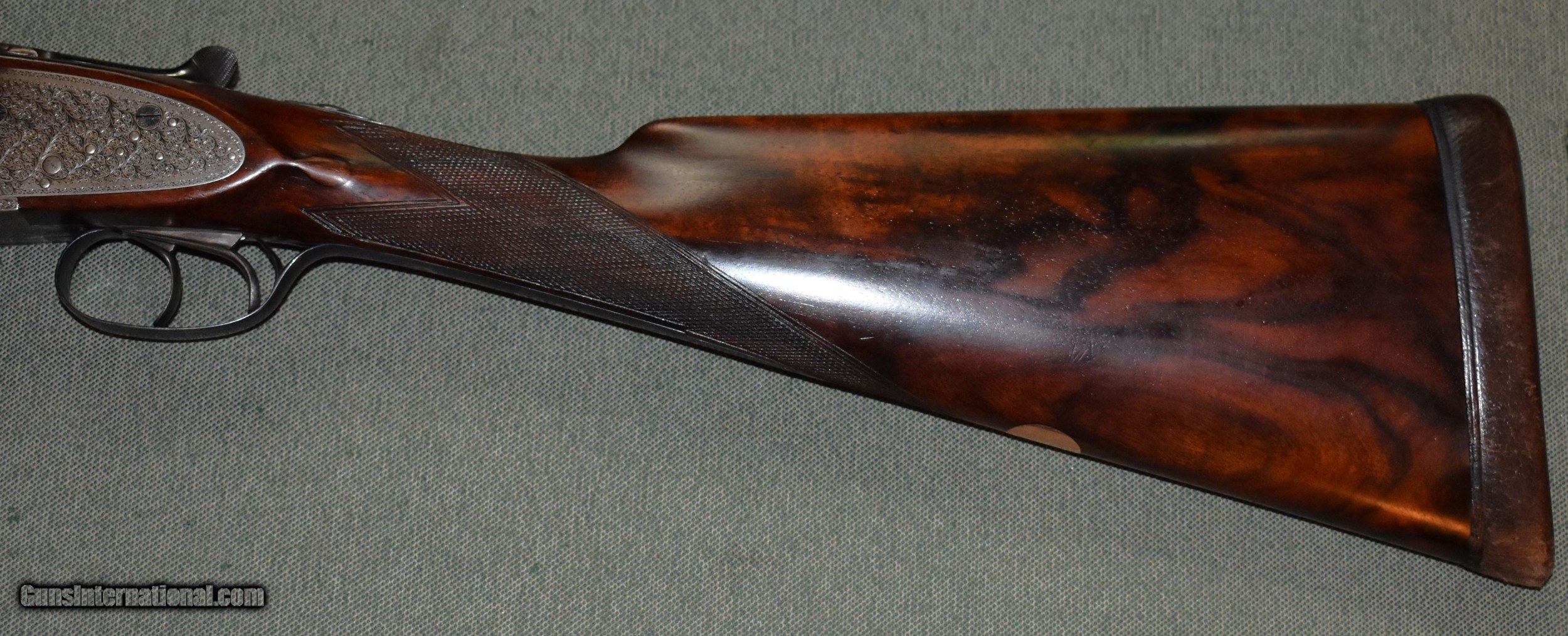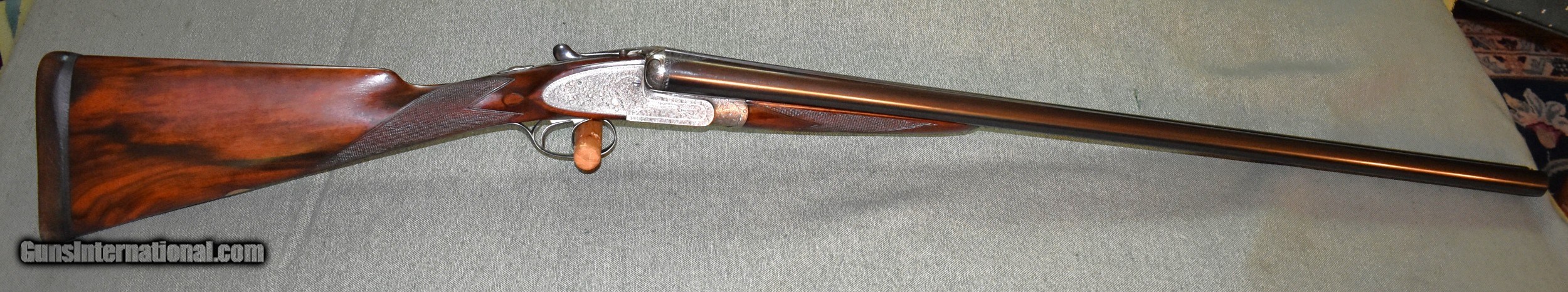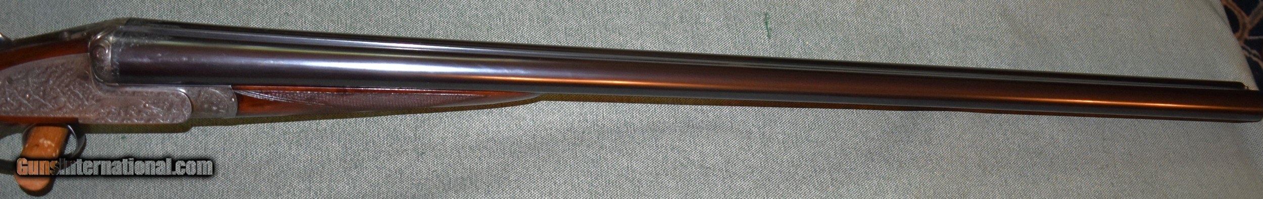 Description: Best Quality sidelock ejector 12 gauge built for Arthur Turner of Sheffield,England. This gun has 28" chopper lump barrels choked improved cylinder (.005") and modified (.020"). The action is fully engraved with English scroll and ribbons. The barrels are on face and lock up tightly to the action with no play. The stock is beautiful dark European walnut with dark figure. The gun is in excellent original condition retaining 98% of the wood and metal finishes. The stock dimensions are 141/2" LOP,11/4" at comb,and 21/4" at heel,with 1/4" cast off. The gun weighs 6-8. Cased in an oak and leather case. Built in the late 1920s so it is C&R eligibile. SOLD Shotgun Gauge: 12 Gauge Manufacturer: Arthur Turner Model: Sidelock Ejector Serial Number: 6095 Barrel Length: 28 Chambers: 21/2 Ejectors: Yes Condition: excellent Metal Condition: excellent Wood Condition: excellent Bore Condition: mint Action: Double Barrel Triggers: Double Stock Dimensions: 141/2"x11/4"x21/4 Butt Pad: Leather Covered Pad Choke Left: Mod (,020") Choke Right: IC (.005") |