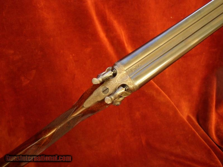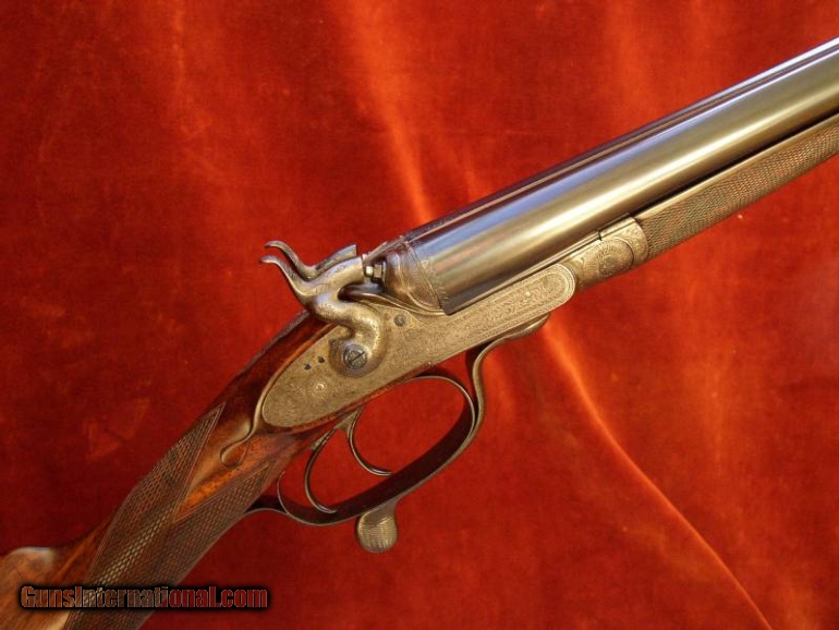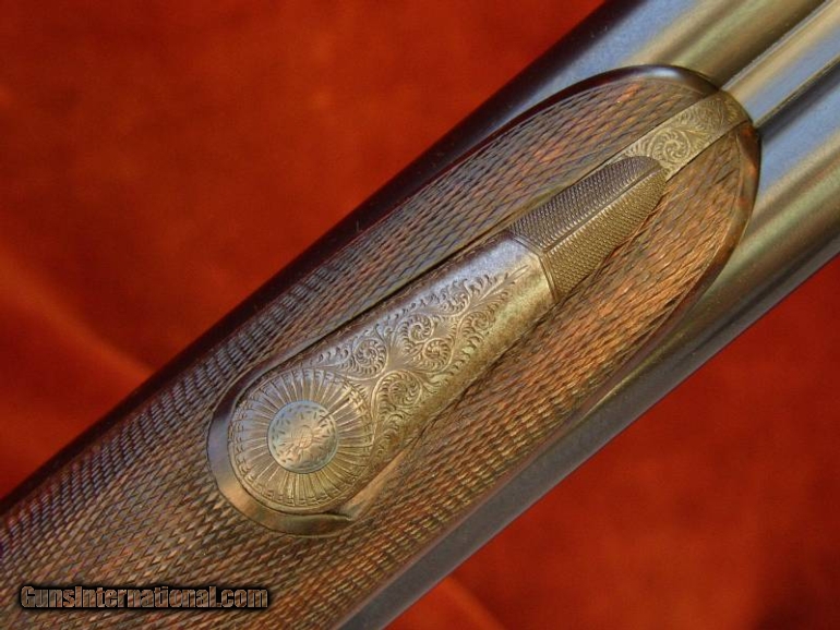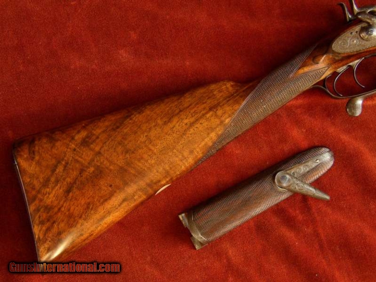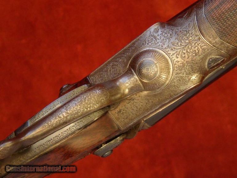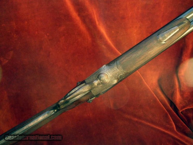 Description: *** SOLD *** This gun no.1692 started life as one of a pair of 14b muzzleloaders, ordered by Thomas L Fitzhugh in 1859 from Boss and recently refurbished by Toby Barclay of Heritage Guns UK. According to Donald Dallas's book on Boss & Co, Boss converted them to centrefire in 1870. At some point after this the pair were separated and then sometime between 1904 and 1925 this gun was rebarrelled with 26" 16 bore barrels by F Reece of Price Street, Birmingham. Another interesting feature of the gun is that the stock and forend are chequered at different LPI: stock at 18, forend at 23. This is most unusual but appears to be original, at least dating back to the rebarrelling. *** As a result of all these changes, we think that the only parts that remain of the original muzzleloader are the lock and trigger plates with some of their component parts. The wood, Boss RUL action and forend obviously date from the 1870's so the gun remains an antique by any definition but the serial number is somewhat misleading. Regardless, this gun is a very attractive example of this illustrious Maker's work and with the modern barrels would make an excellent gun for shooting game over dogs. *** The action is of traditional design and features: double triggers; Stanton Patent rebounding bar action locks; Jones Patent rotary double bite underlever and 'Grip' forend fastener. The breech can of course be opened with the RH hammer at full cock. *** Engraving style Best Open Foliate Scroll with Ornate Borders. Gun weights 5lb 14oz and is a joy to carry afield. Trigger pulls measure approximately: Front trigger 3-1/2lbs Rear trigger 3-1/2lb. *** The replacement steel barrels are 26" in length, chambered for 2 3/4 " (70mm) cartridges and are of brazed 'dovetail' lump construction with soft soldered ribs. Top rib is of the smooth, concave, game type and is engraved 'NEW BARRELS BY F. REECE, PRICE ST, BIRMINGHAM'. London reproof for 70mm nitro powder cartridges in 2012. Right barrel is bored 0.662 with a constriction of 0.004 for Skeet choke. Minimum wall thickness is 0.024. The Left barrel is bored 0.660 with a constriction of 0.016 for Modified choke. Minimum wall thickness is 0.028. *** Straight hand grip Stock and Splinter Forend are crafted from highly figured walnut. The stock features a vacant white metal oval, well defined drop points and is finished with engraved iron heal & toe plates secured with engraved screws. The stock is very lightly cast-off for a right-handed shot. Stock dimensions are 14-1/8” by 1-1/2” by 2-3/8”. Negligible cast. *** How many 16 bore hammerguns do you think Boss made? I don’t know the exact answer I give a 3-day non-firing inspection and will only accept returns if gun is not as described.either but this is obviously a very rare gun. Don’t let it get away. *** US Agent for Heritage Guns UK. SOLD Antique: Yes |
