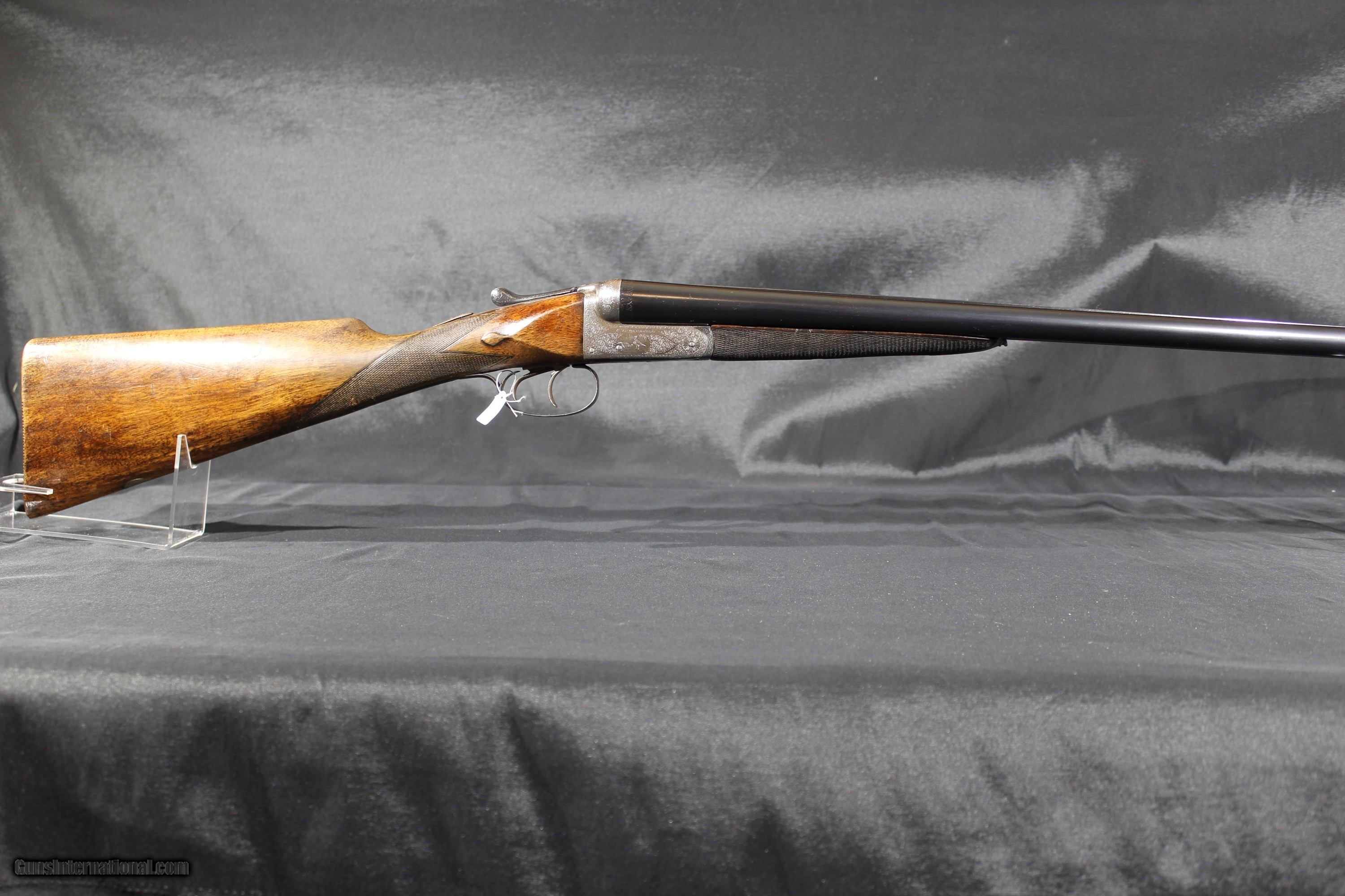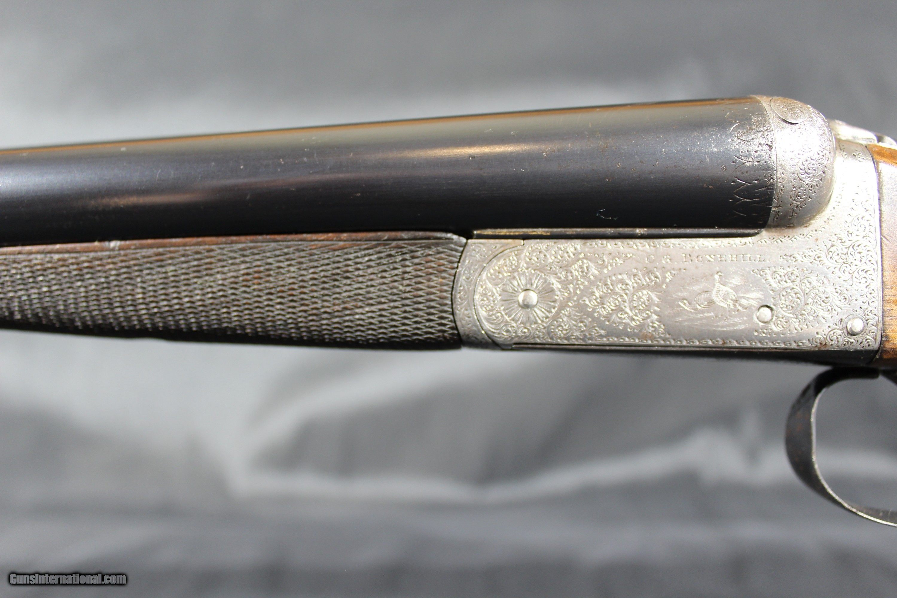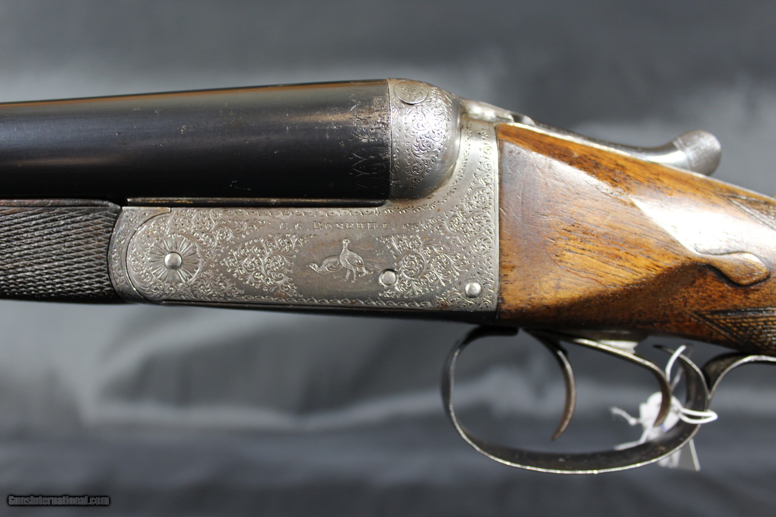 Description: C.G. Bonehill 12ga 21/2" chambers is nice condition. Gun is engraved wit birds on both sides of the locks. It is a 12ga ejector with a lop of 14 1/4" choked Full and Cylinder. The drop at comb is 13/8" and drop at heel is 23/8" barrels are 30" and weight is 6.2LBS. Bonehill were a major gun maker in Birmingham, England, and produced guns ranging from sound middling quality up to very nearly "best". Their "Belmont Interchangeable" was one of the first quality shotguns to be made using what was known as "the American system" ; all parts could be replaced without hand fitting. In early 1880 Winchester entered into an agreement with Christopher G. Bonehill of Birmingham to produce double barrel shotguns bearing the name of the Winchester Repeating Arms Company. Sold through the company's New York City Depot, these shotguns retailed for prices between $40 and $85, a tidy sum in those days and indicative of good quality. SOLD Curio/Relic: Yes Shotgun Gauge: 12 Gauge Manufacturer: C.G Bonehill Model: sxs Serial Number: 414X Barrel Length: 30 Bore: vg Chambers: 21/2 Ejectors: yes Condition: good Metal Condition: good Bore Condition: vg Barrels: good Barrel Type: steel Action: Boxlock Ejector Triggers: double Stock: walnut |