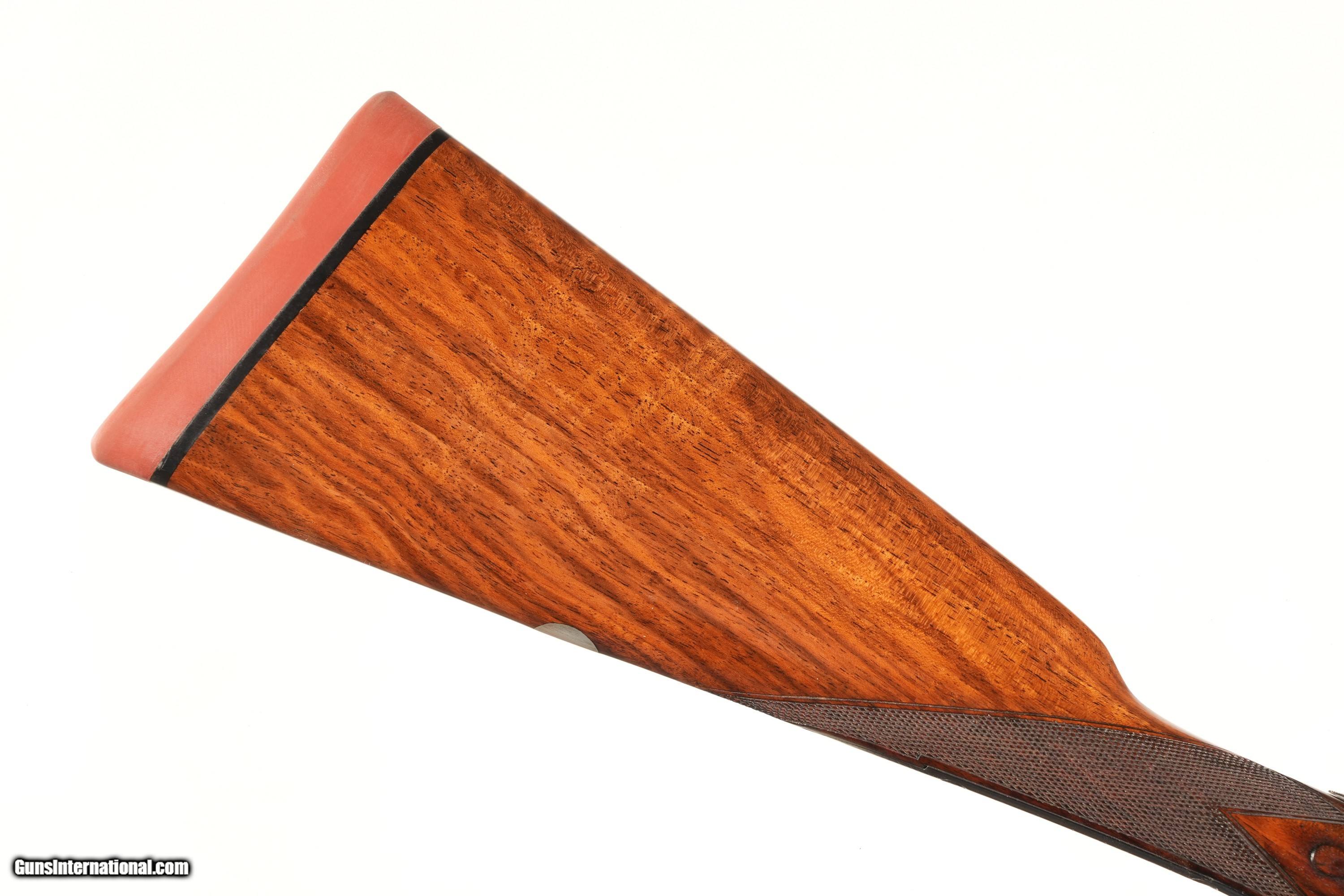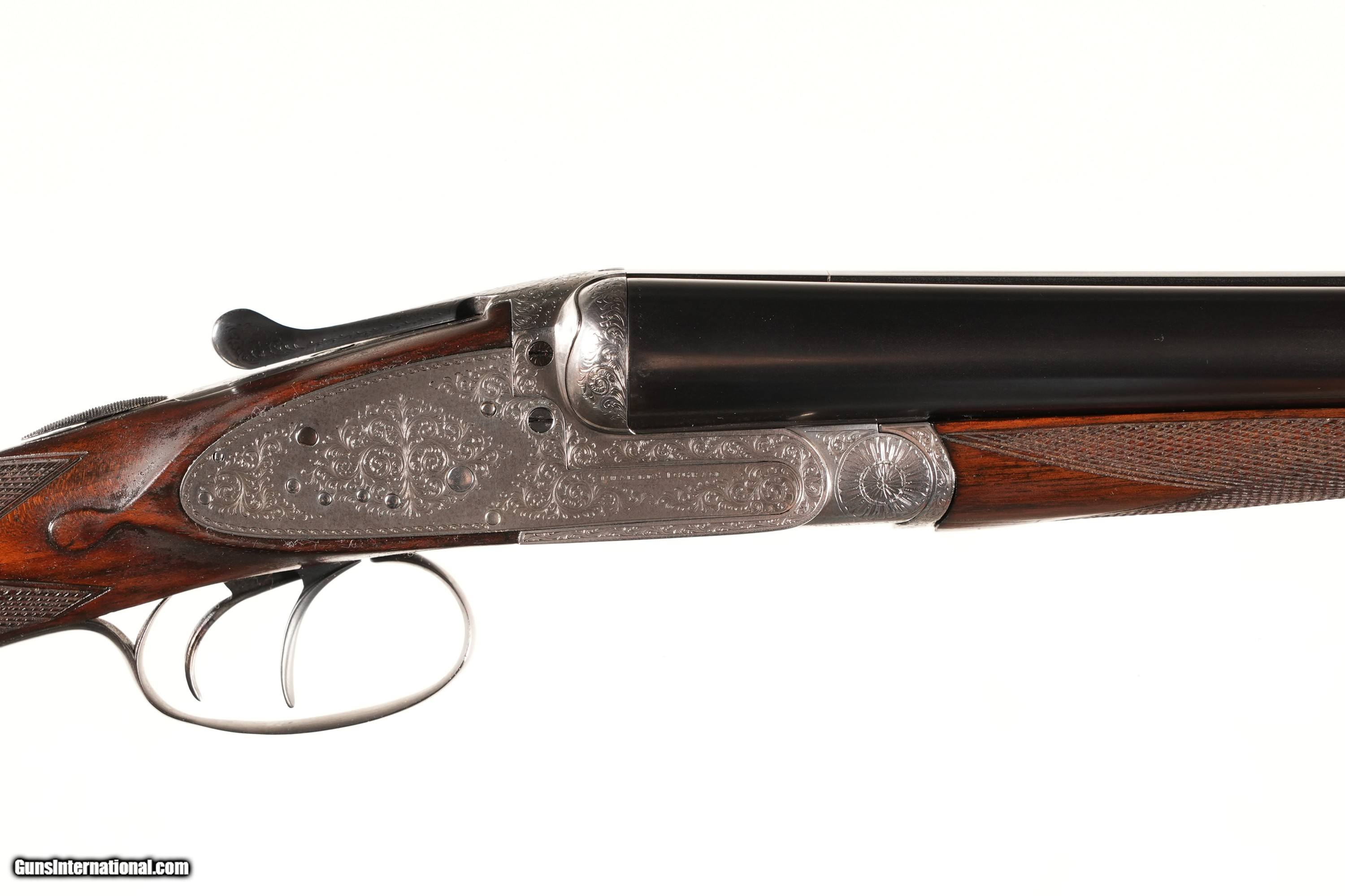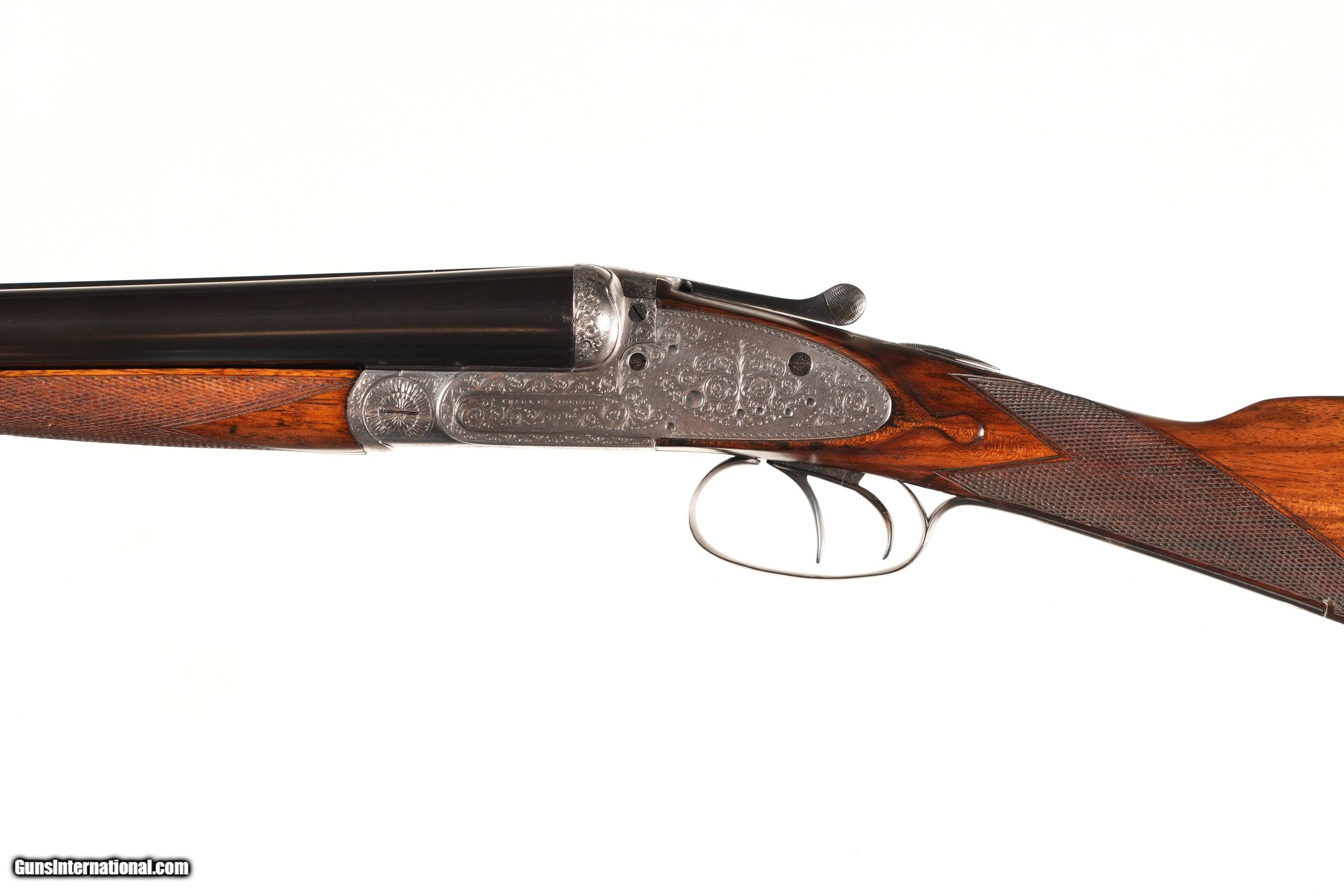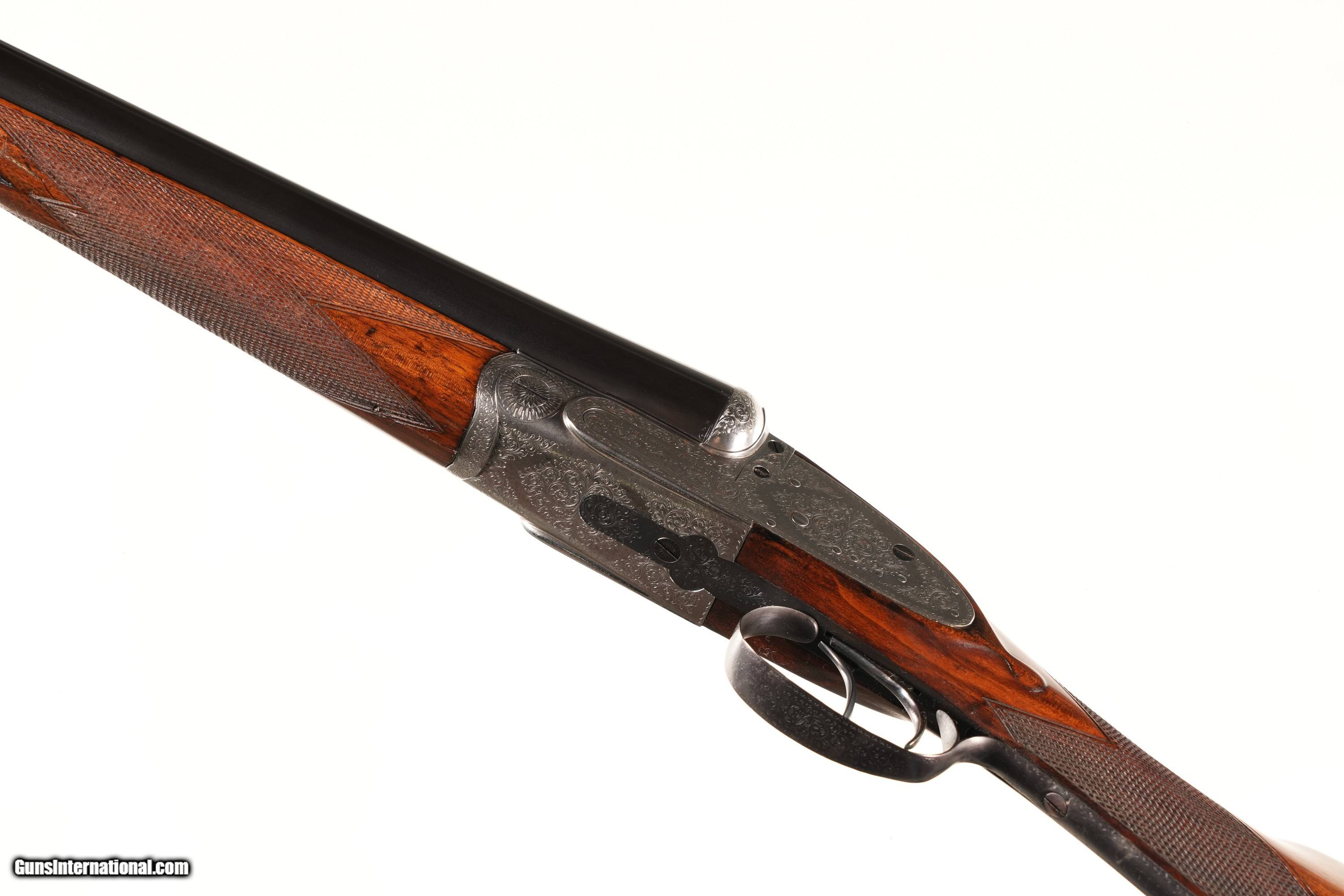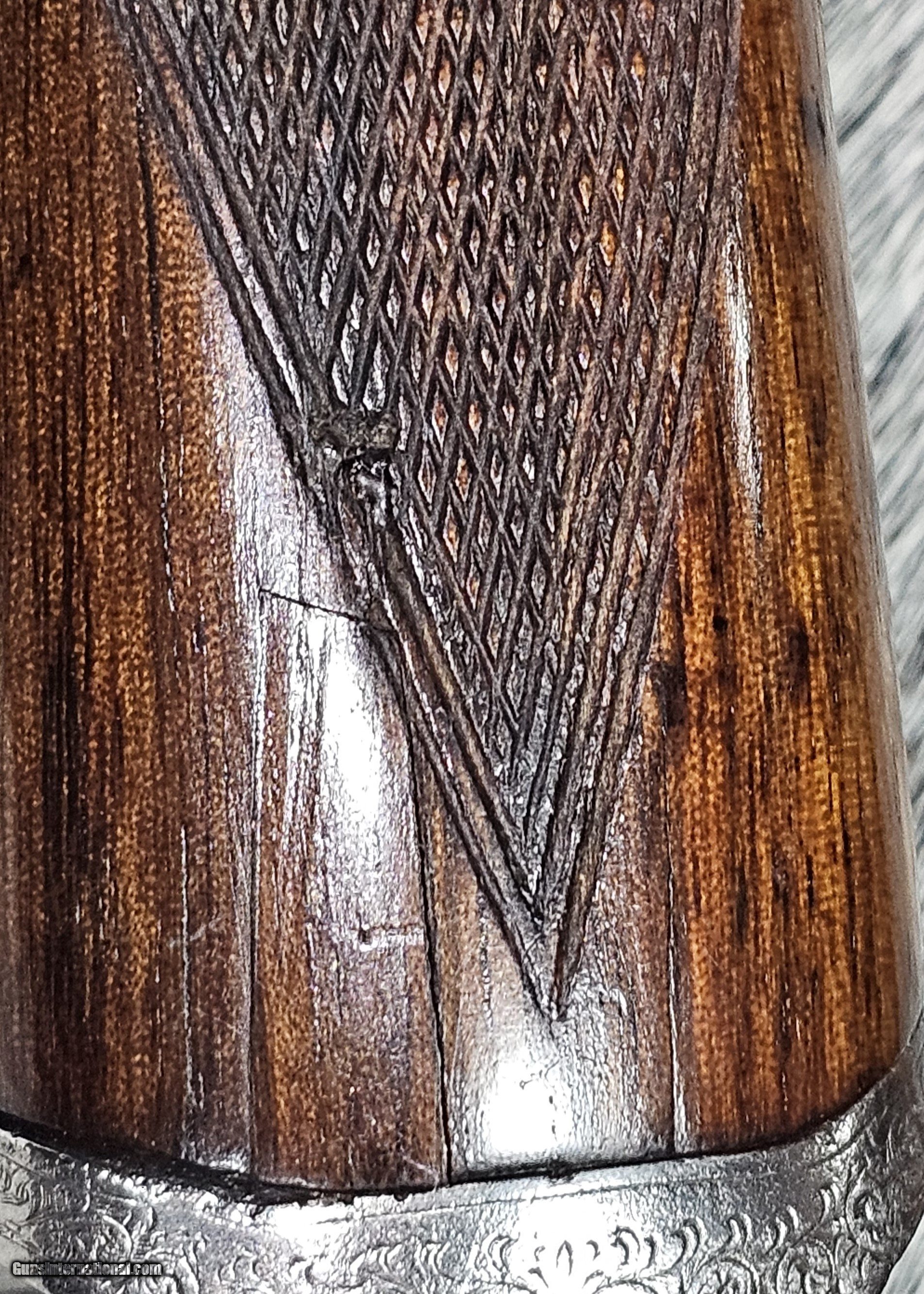 Description: Charles Ingram Glasgow Scotland. 9 pin side lock with gold lined cocking indicators; Ejectors. 2 1/2" chambers proved 1 1/8 oz. Choked IC & Cyl, Double trigger. 14 7/8" LOP over 1" pad. 1 5/8" DAC 2 1/4" DAH . Housed in leather trunk pattern case. Condition, Very good as refinished with good checkering. Engraving and legends are soft. LB .022 RB .024, Barrel retain 99% blue finish with brilliant bore. Locks and and receiver are bright. Stocks are very good with 2 small cracks in forearm. Mechanically fine • Free Shipping, No Credit Card Fees. • Lay-a-way available for this firearm. • 1/3 Down, a 1/3 in 30 Days 1/3 in 60 Days. SOLD Manufacturer: Charles Ingram Model: Sidelock Serial Number: A5115 Barrel Length: 30 |