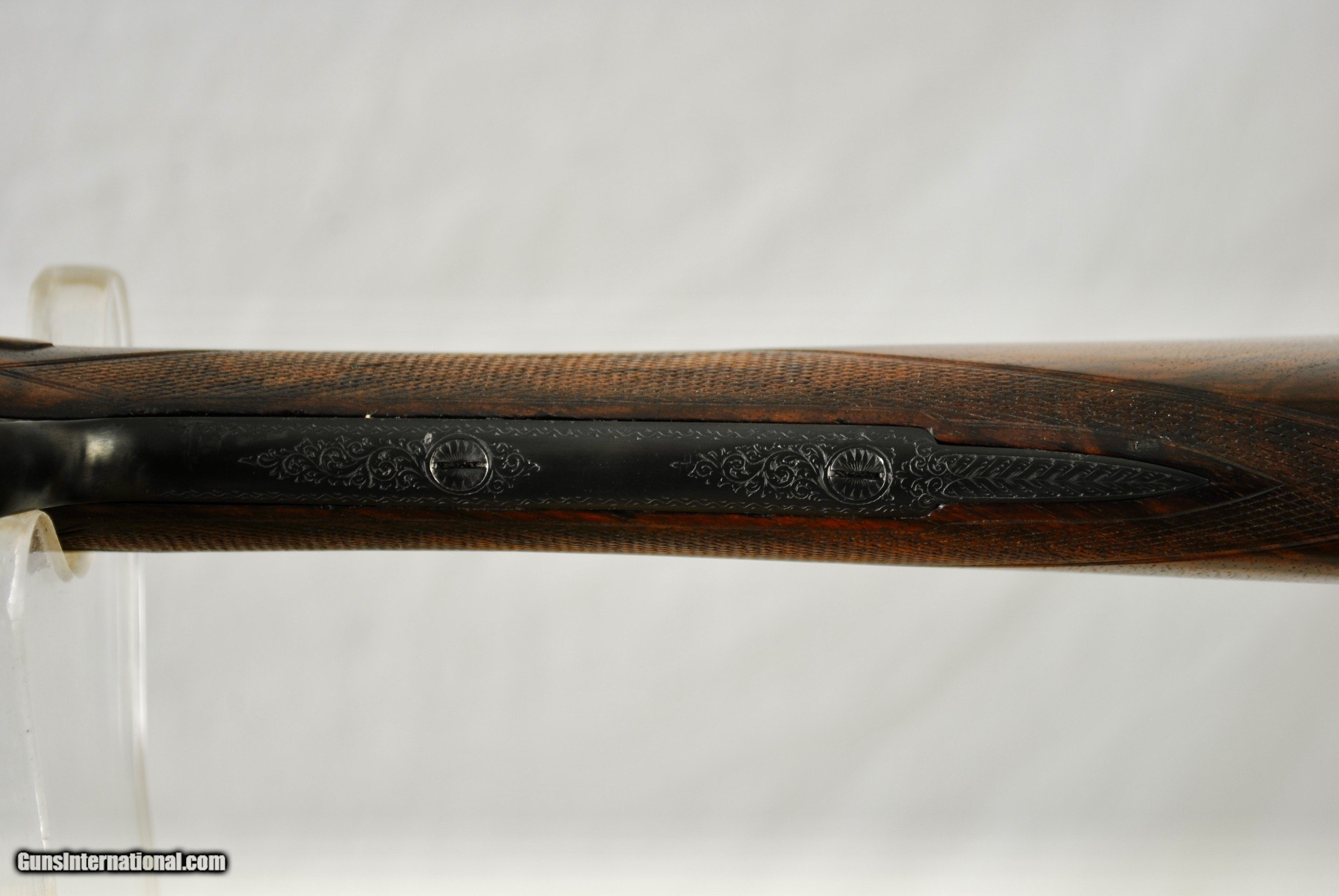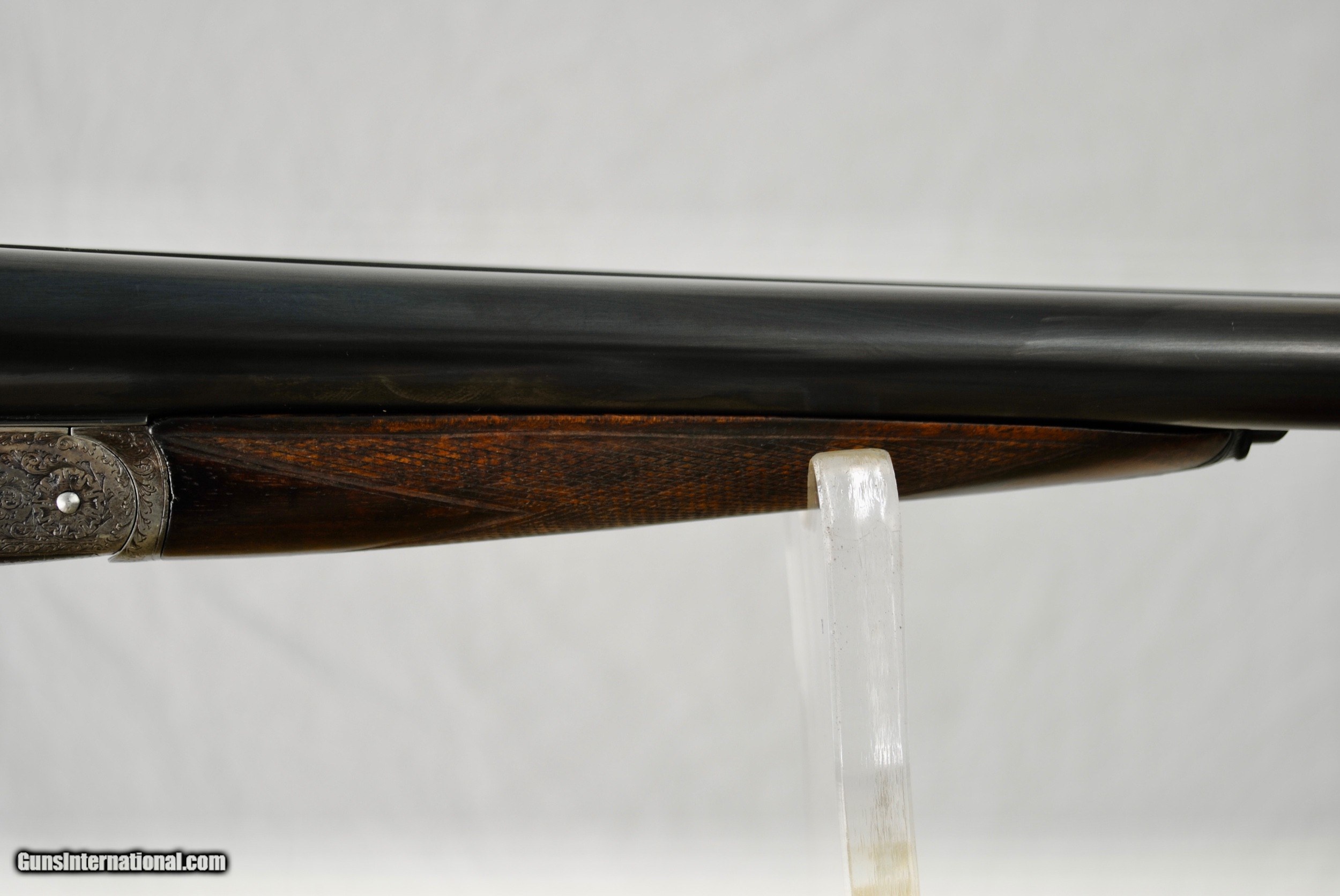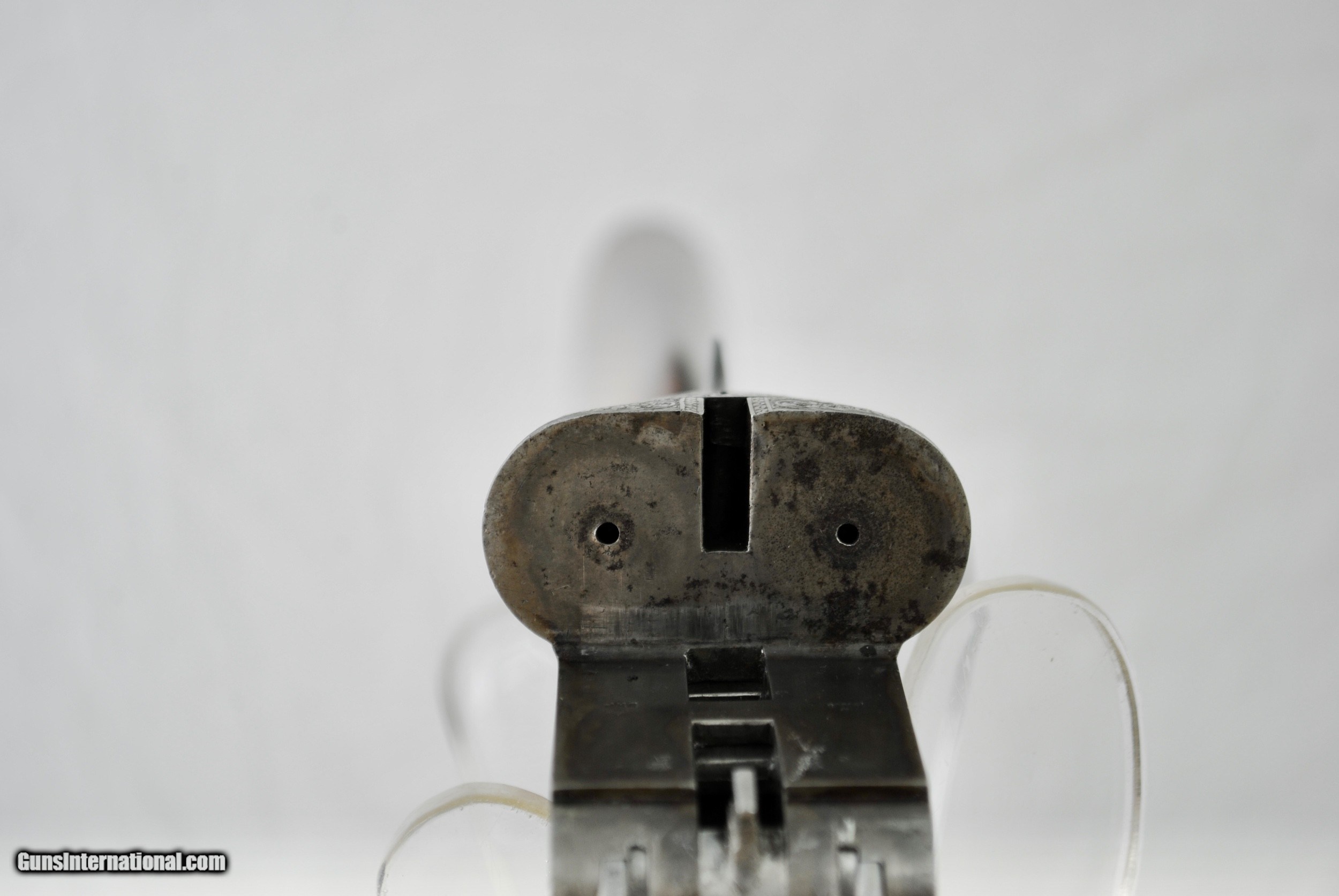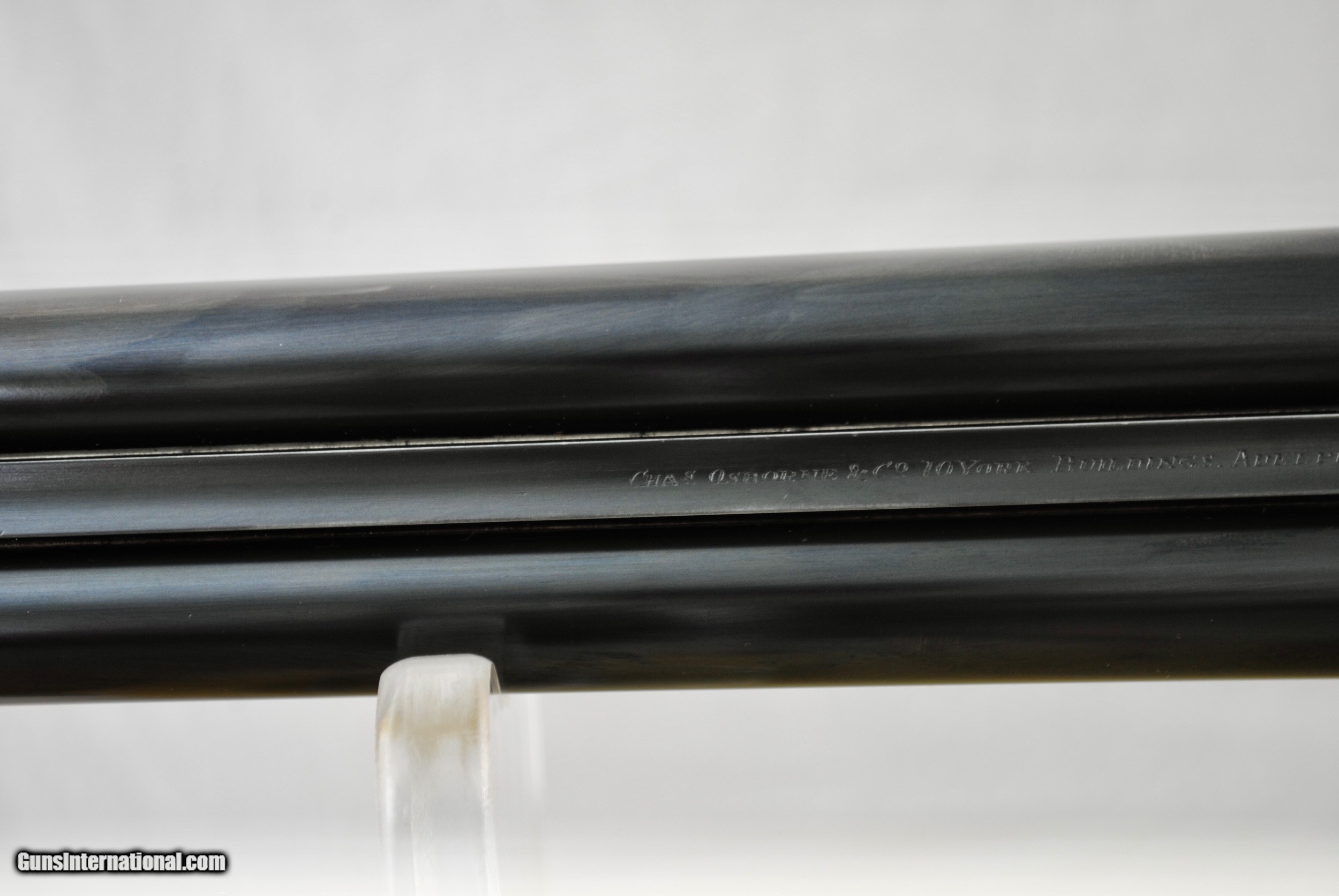Description: Charles Osborne, best quality boxlock ejector English made in 1920. This gun features supurb Holland style acanthus scroll engraving and highly figured wood. Original case colors. Straight grip. Rib extension third fastener. Well timed ejectors. Barrels are 30" with 2 3/4" chambers. Right barrel measures .729 with 9/1000 choke (IC) while left barrel is .736 with 20/1000 choke (Mod). Gun is tight on face, recently rejointed. No cracks to wood. No loose ribs. Manual safety. Auto safety mechanism is included if you want to install it. Weight of gun is 6 LBS 8 OZ. Horn butt plate. Vacant stock oval. LOP - 14 3/8". Drop at Comb - 1 1/2". Drop at Heel - 2 1/4". C&R OK. Shipping is $50. SOLD Curio/Relic: Yes Shotgun Gauge: 12 Gauge |