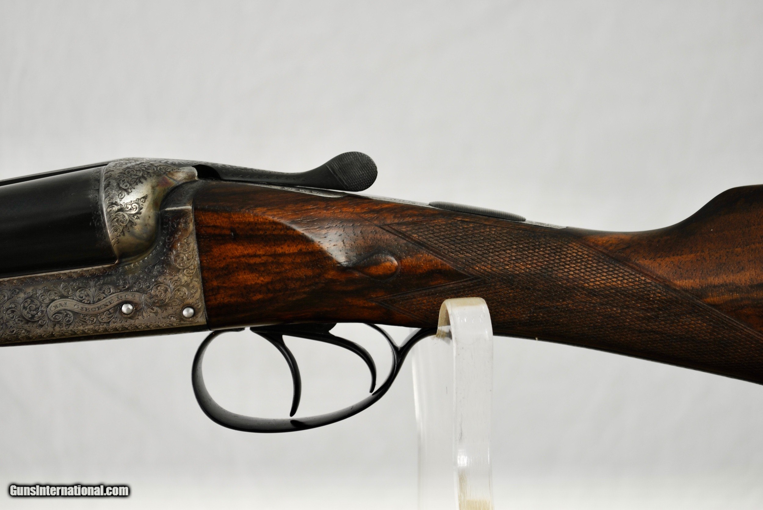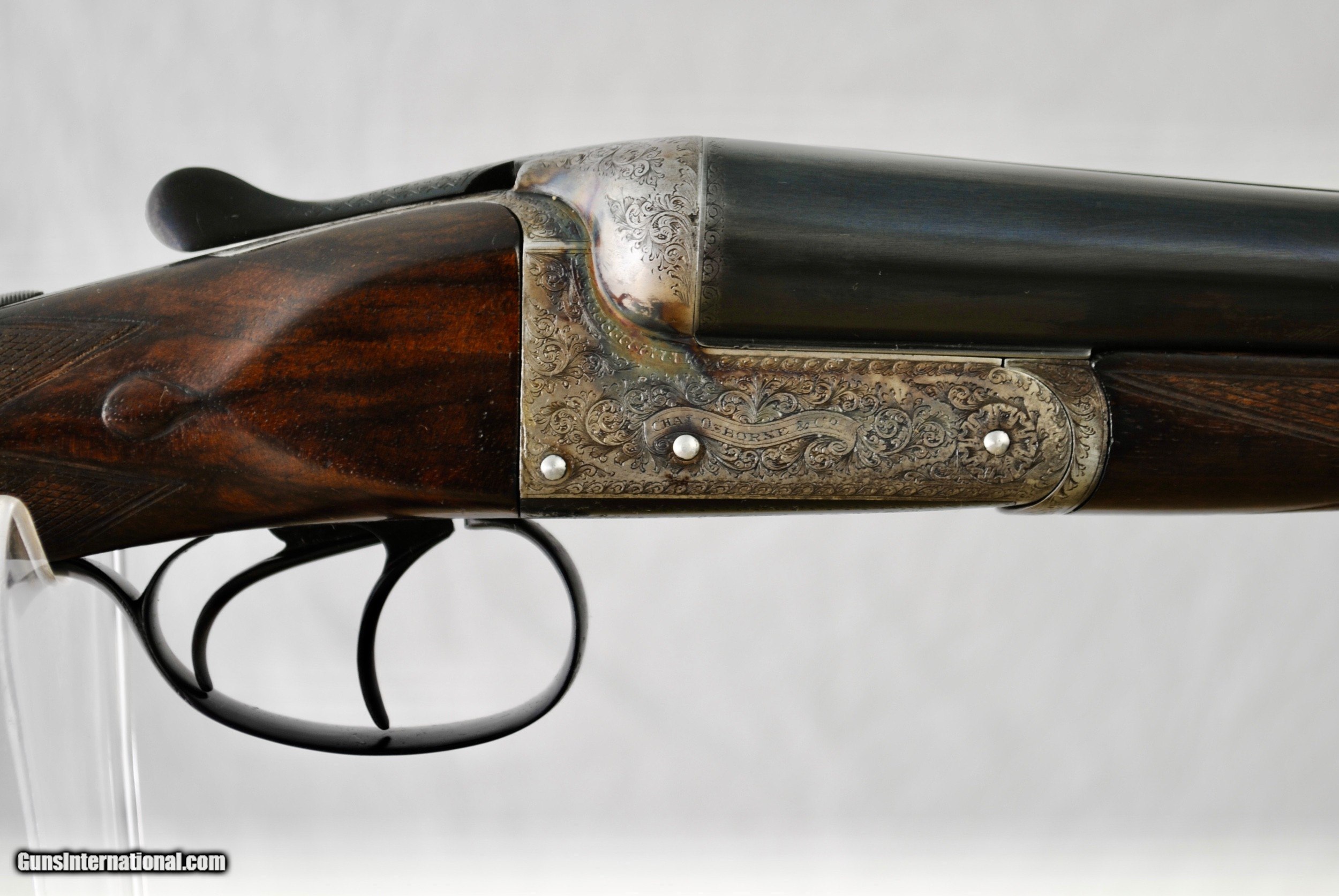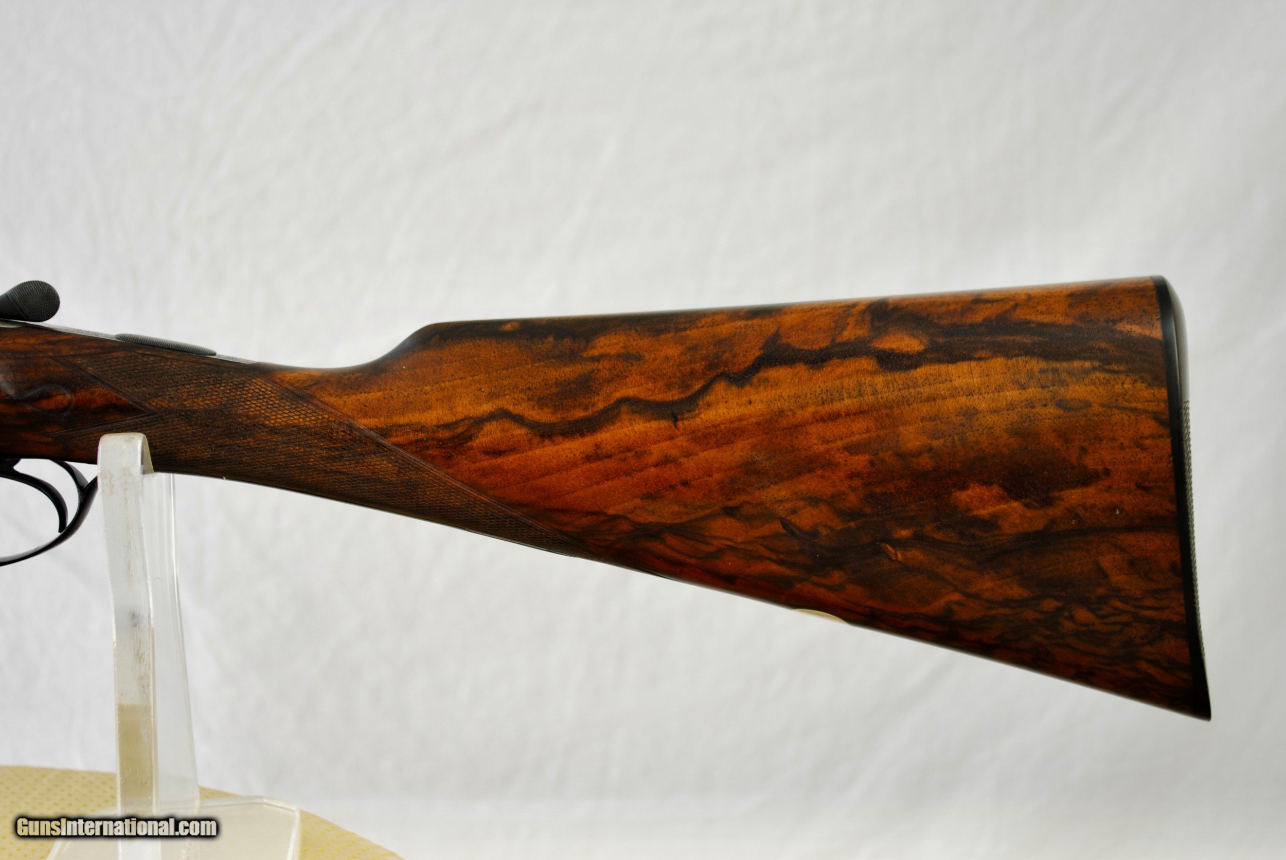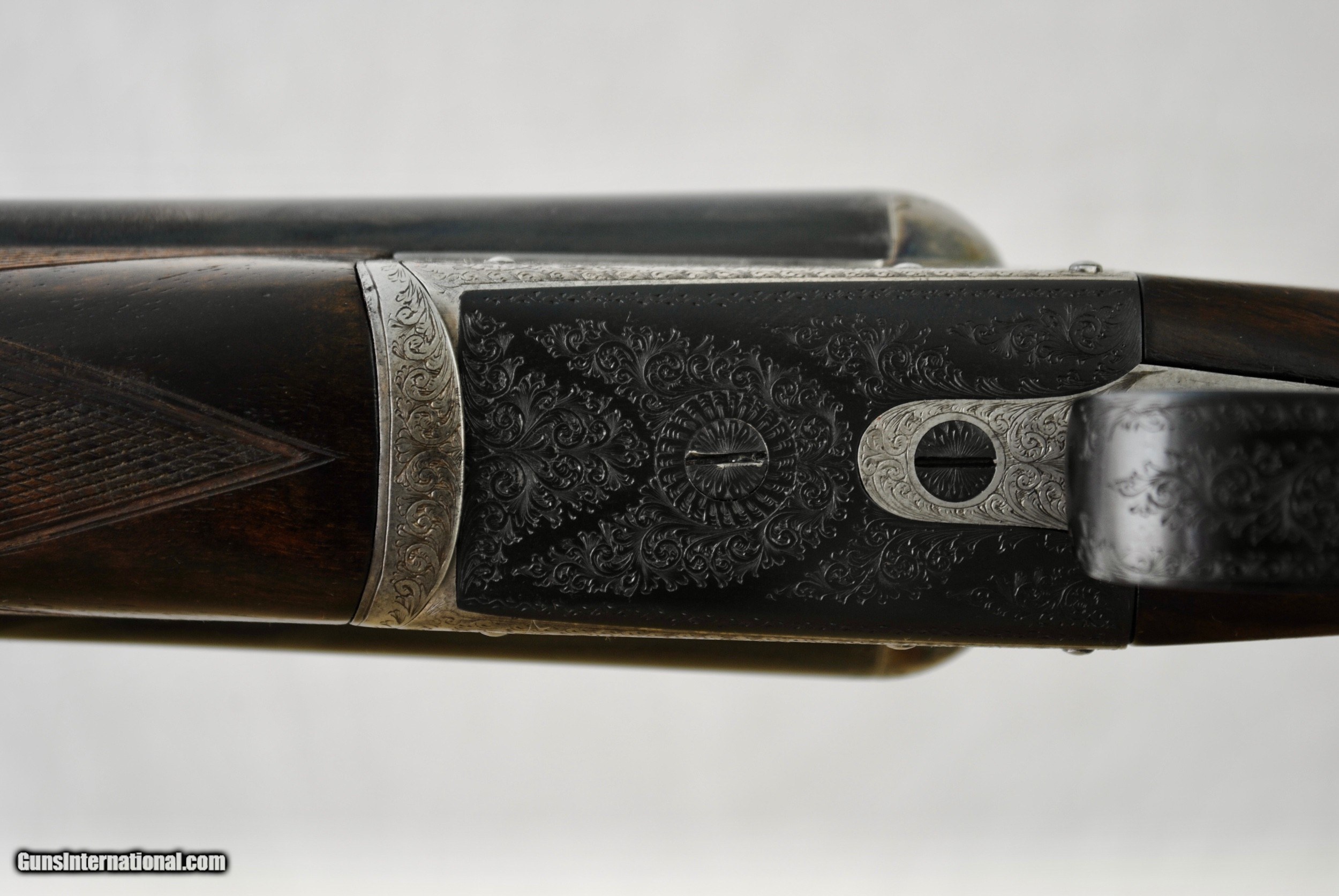 Description: Charles Osborne, best quality boxlock ejector English made in 1920. This gun features supurb Holland style acanthus scroll engraving and highly figured wood. Original case colors. Straight grip. Rib extension third fastener. Well timed ejectors. Barrels are 30" with 2 3/4" chambers. Right barrel measures .729 with 9/1000 choke (IC) while left barrel is .736 with 20/1000 choke (Mod). Gun is tight on face, recently rejointed. No cracks to wood. No loose ribs. Manual safety. Auto safety mechanism is included if you want to install it. Weight of gun is 6 LBS 8 OZ. Horn butt plate. Vacant stock oval. LOP - 14 3/8". Drop at Comb - 1 1/2". Drop at Heel - 2 1/4". C&R OK. Shipping is $50. SOLD Curio/Relic: Yes Shotgun Gauge: 12 Gauge |