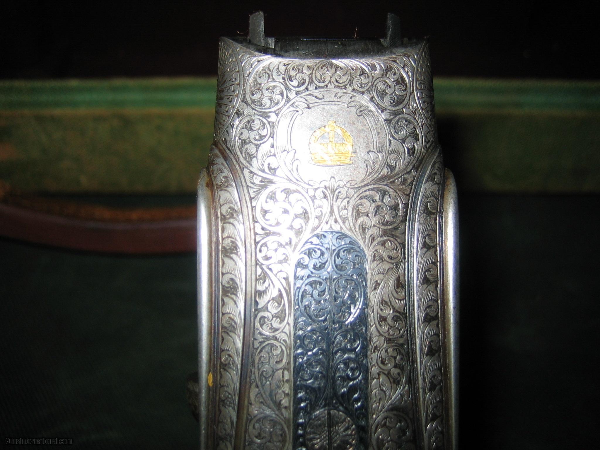 Description: THIS BEAUTIFUL UNTOUTCHED GOLD INLAID HIGH GRADE SHOTGUN WAS MANUFACTURED FOR H.S.H. PRINCESS VALERIE HOHENLOHE IN 1938. THIS 20 GAUGE SIDE BY SIDE COMES IN THE ORIGINAL HARD CASE WITH THE ORIGINAL ACCESSORIES (SNAP CAPS, LEATHER CHEEK PAD AND CLEANING KIT). I HAVE A COPY OF THE INVOICE FROM CHURCHILL FOR THE SHOTGUN WITH THE EXTRAS THAT WERE REQUESTED SUCH AS THE GOLD INLAYS AND PRINCESS VALERIE'S CREST INLAIED INTO THE STOCK. THE WOOD IS GEORGIOUS AND THE FINISH ON THE WEAPON IS IN 99%. THIS SHOTGUN HAS NOT BEEN OUT OF ITS CASE FOR OVER 60 YEARS. THE BARRELS ARE 25 INCHES WITH BORING OF 1/8 RIGHT AND 1/2 LEFT. PULLS ARE 3 1/2 RIGHT AND 4 1/2 LEFT. THE CHAMBERS ARE 2 1/2" THE STOCK IS DARK WELL FIGURED ENGLISH WALNUT WITH A LENGTH OF 13" THE SHOTGUN WAS SPECIAL ORDERED BY COUNT GYRAF SIERSTORPFF FOR THE PRINCESS AND IN THE SPECIAL REQUEST THAT THE SHOTGUN ARRIVE IN HUNGARY PRIOR TO 20, JULY 1934 FOR SOME SPECIAL OCCCAISION. IF YOU NEED ANY OTHER INFORMATION, PLEASE FEEL FREE TO CONTACT ME. THE ASKING PRICE FOR THIS PIECE OF HISTORY IS $23,500.00 U.S. SOLD |