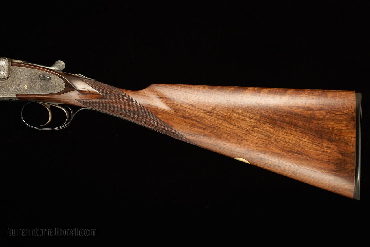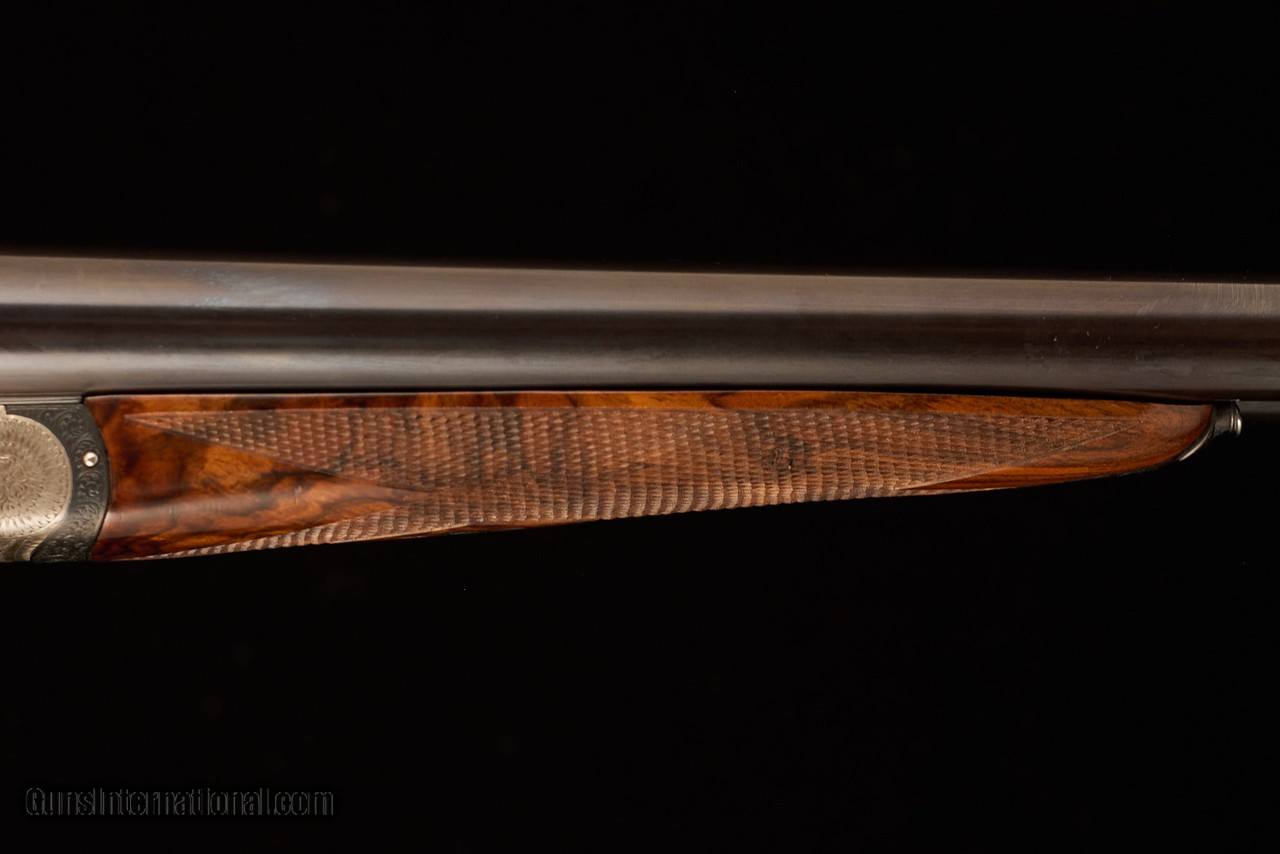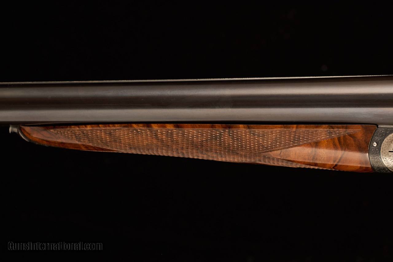 Straight hand grip, double triggers on a square bar action, pin-less hand detachable locks, auto-safety, matted raised Churchill rib, small brass front bead, vacant gold oval, drop points, gold inlaid "SAFE" ahead of the safety catch, gold inlaid “THE PREMIER QUALITY” on the underside and XXV on the rib, gold lined cocking indicators, maker's name on both lockplates, double beaded trigger guard, an Anson push button forend release, checkered splinter forend, and a checkered wrist. The gun is housed in a maker’s compact toe-under leather case with burgundy baize, maker’s label, and snap caps. Circa 1930 gun proofed in London for 1 1/8 oz loads and 2 ½” chambers that measure the same.