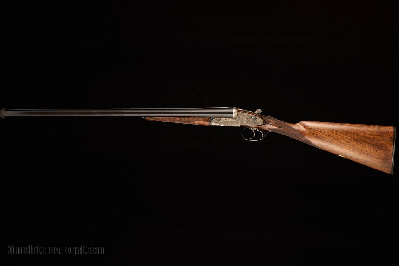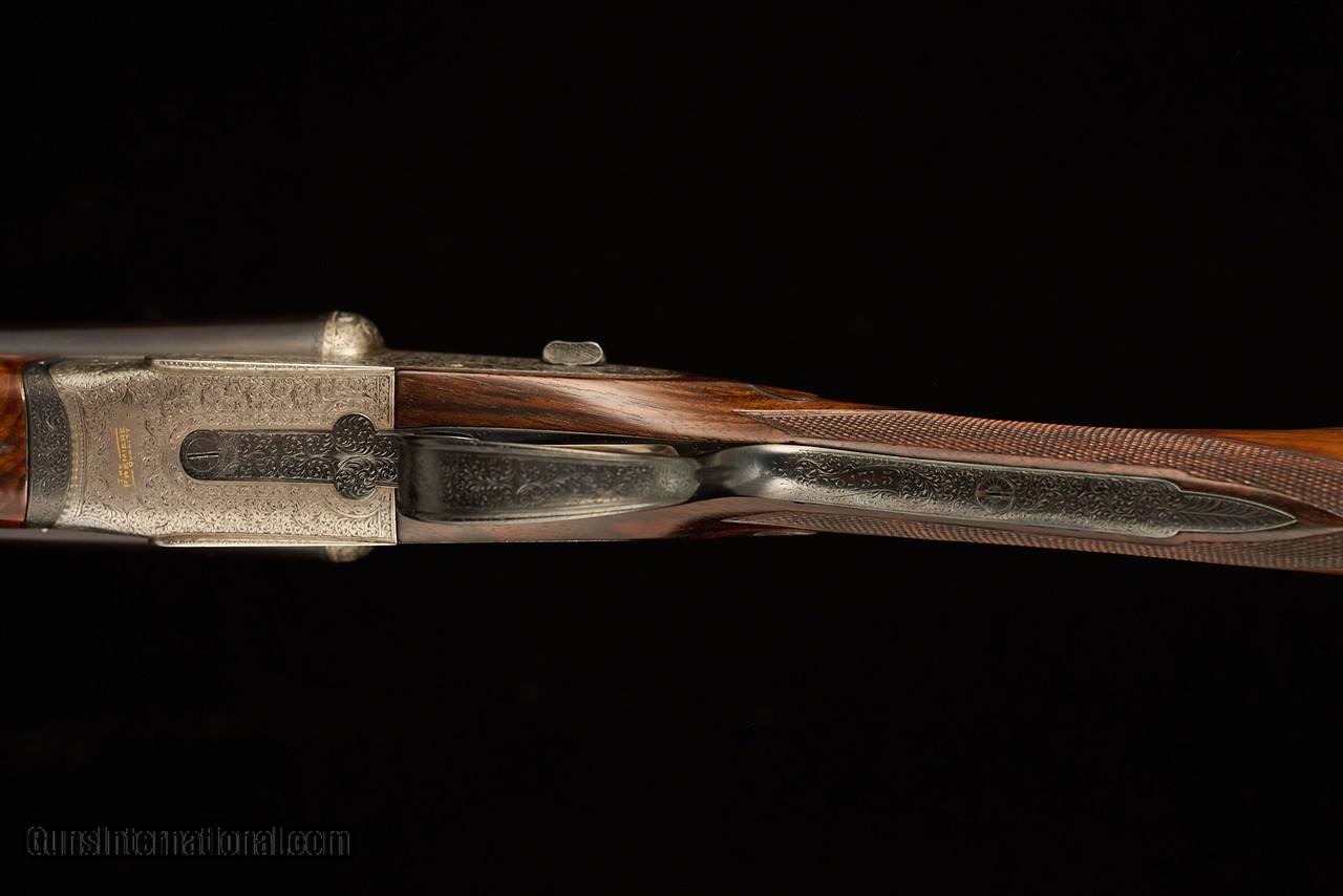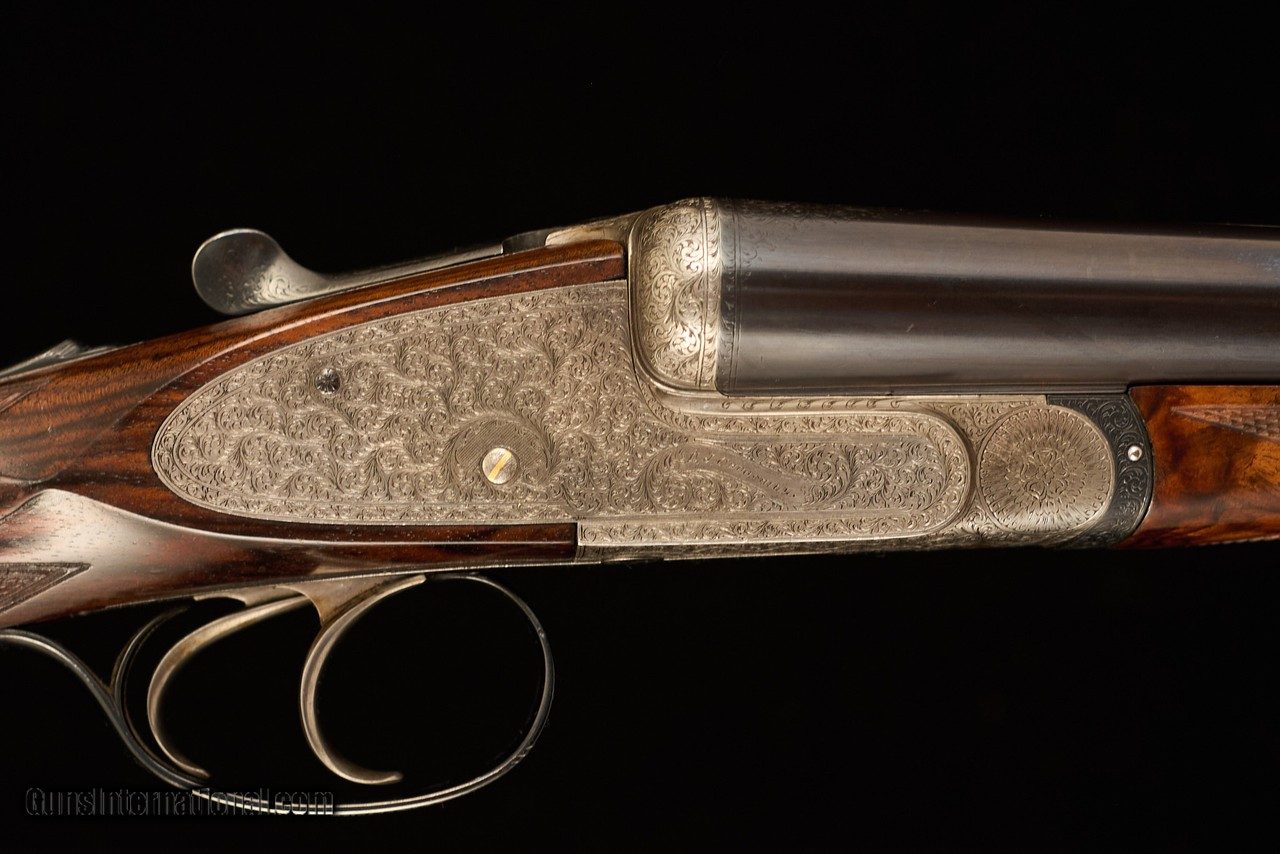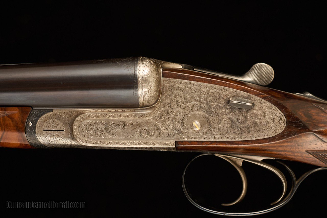 Straight hand grip, double triggers on a square bar action, pin-less hand detachable locks, auto-safety, matted raised Churchill rib, small brass front bead, vacant gold oval, drop points, gold inlaid "SAFE" ahead of the safety catch, gold inlaid “THE PREMIER QUALITY” on the underside and XXV on the rib, gold lined cocking indicators, maker's name on both lockplates, double beaded trigger guard, an Anson push button forend release, checkered splinter forend, and a checkered wrist. The gun is housed in a maker’s compact toe-under leather case with burgundy baize, maker’s label, and snap caps. Circa 1930 gun proofed in London for 1 1/8 oz loads and 2 ½” chambers that measure the same.