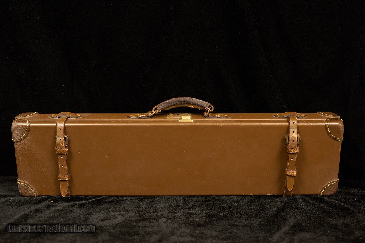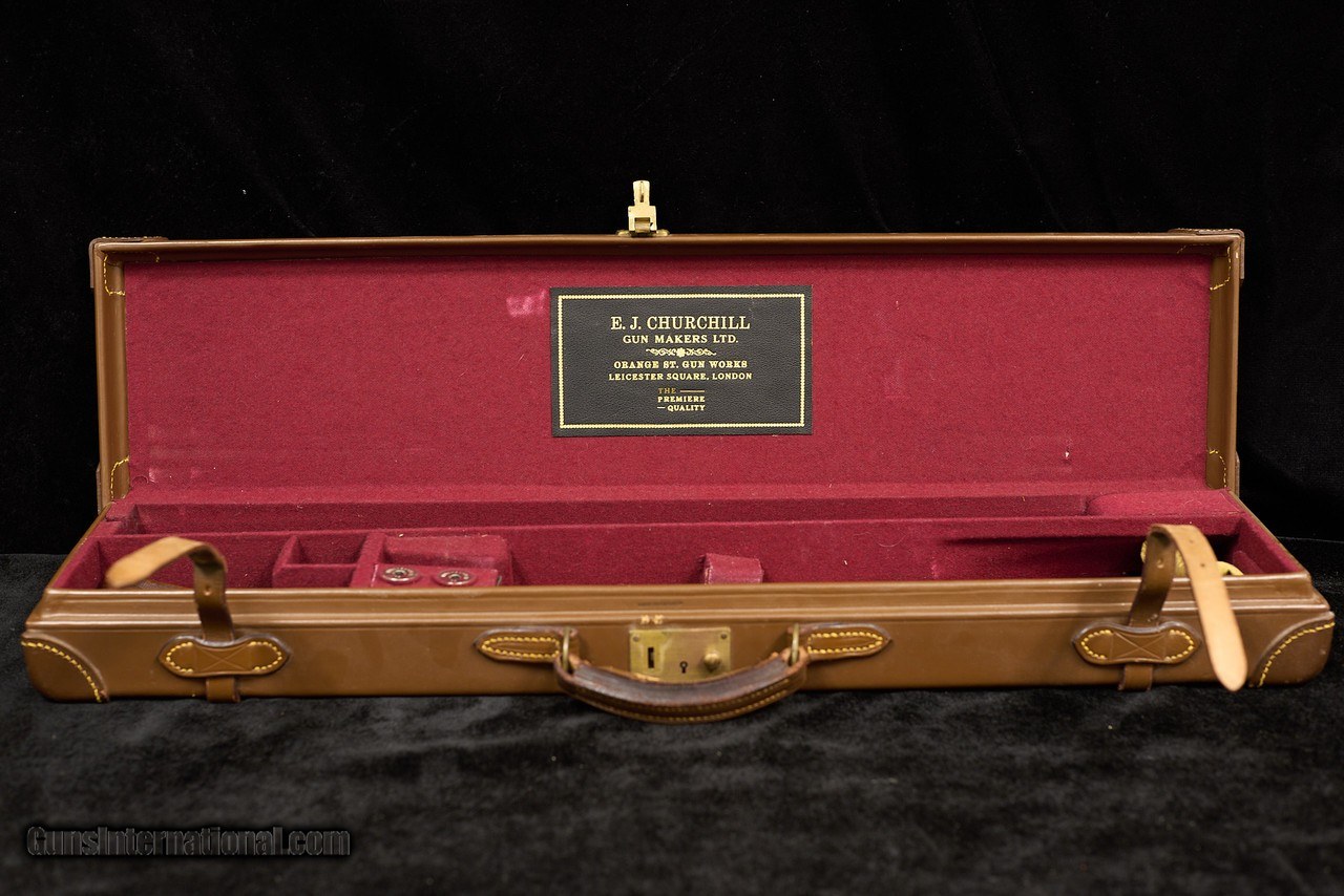 Embellished with the very recognizable Churchill's Premier grade small scroll engraving. Case color hardened action and blued furniture. Action has mostly silvered. Well figured walnut stock. Excellent checkering and stock with minimal sign of field use. The forend has been replaced with the original forend in the case. The reblacked barrels remain in near perfect condition. The bores are excellent. Top lever right of center, the gun is on face, and ejectors are out of time.