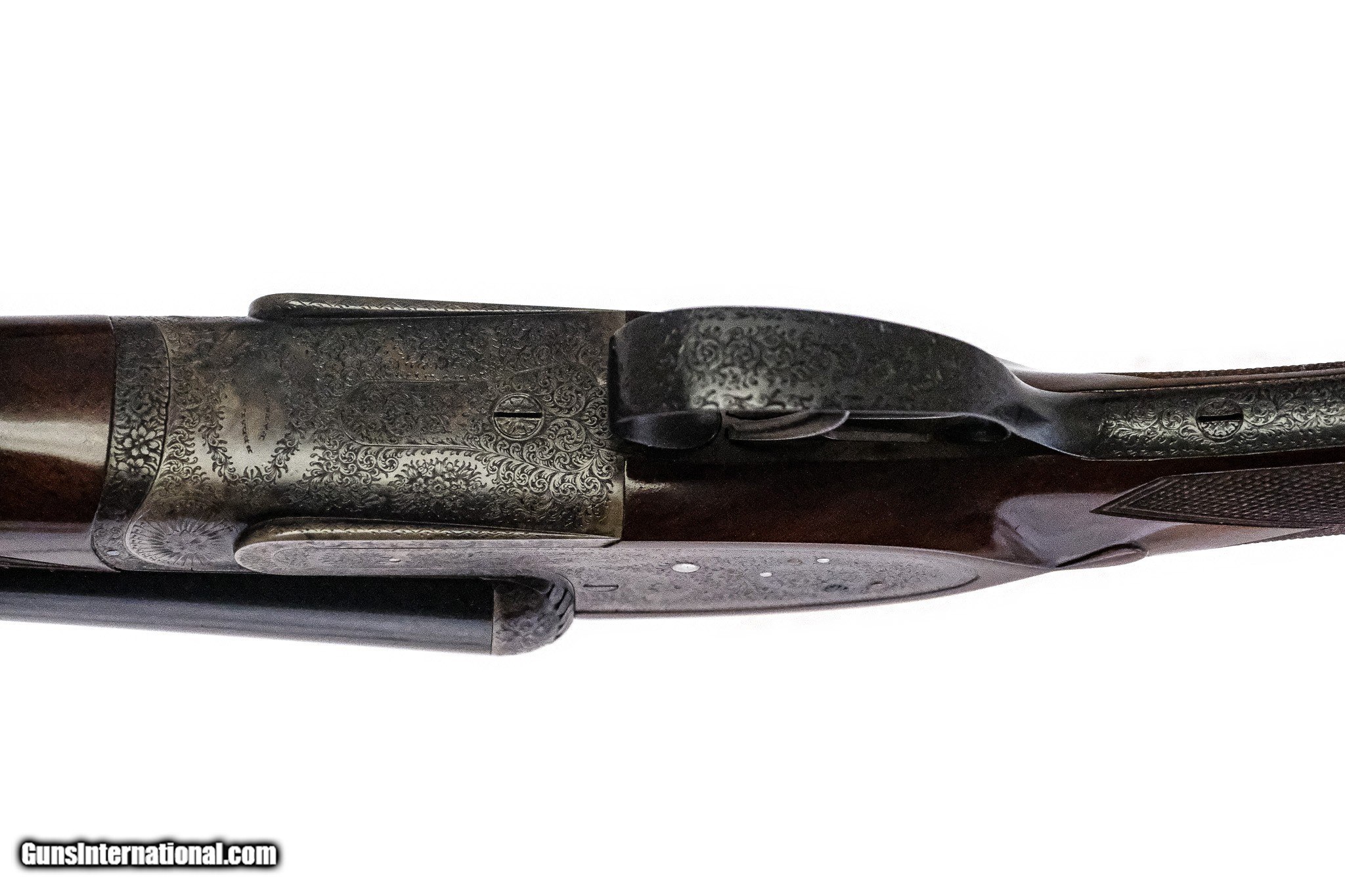 Description: F. Beesley - Best Quality Full Sidelock, SxS, 12ga. 28" Barrels Choked IC/IM. Double trigger automatic ejector, 100% Case Colored, Barrel Blue, and wood finish. “James Woodward’s Fluid Press steel” marked on both barrels, London Pali, Mall Corner Address. Number 2 of a pair, outstanding full coverage Rose and Scroll engraving, with deep chiseled breeches and name in banners on each side of the frame. Beautifully marble cake Turkish Walnut. This gun has gone through a complete London style refurbishment and looks absolutely new! Every screw is perfect, engraving is sharp and clear, wood is without any defects. Blue is English and perfect (We have the corresponding gun that we’ll sell as a pair). Inv: 71689 6 lbs. 9 oz. 15 3/8" x 1 3/8" x 2 ¾" $10,995.00 SOLD |