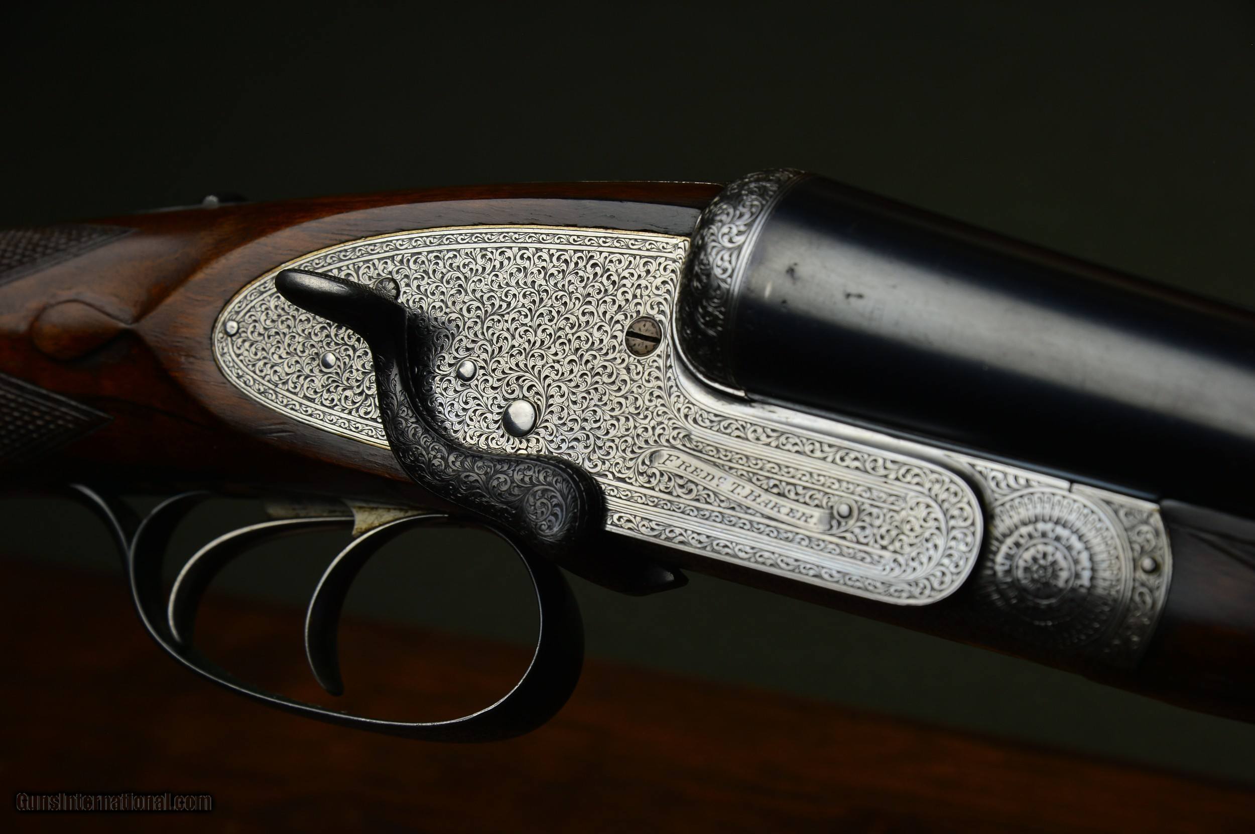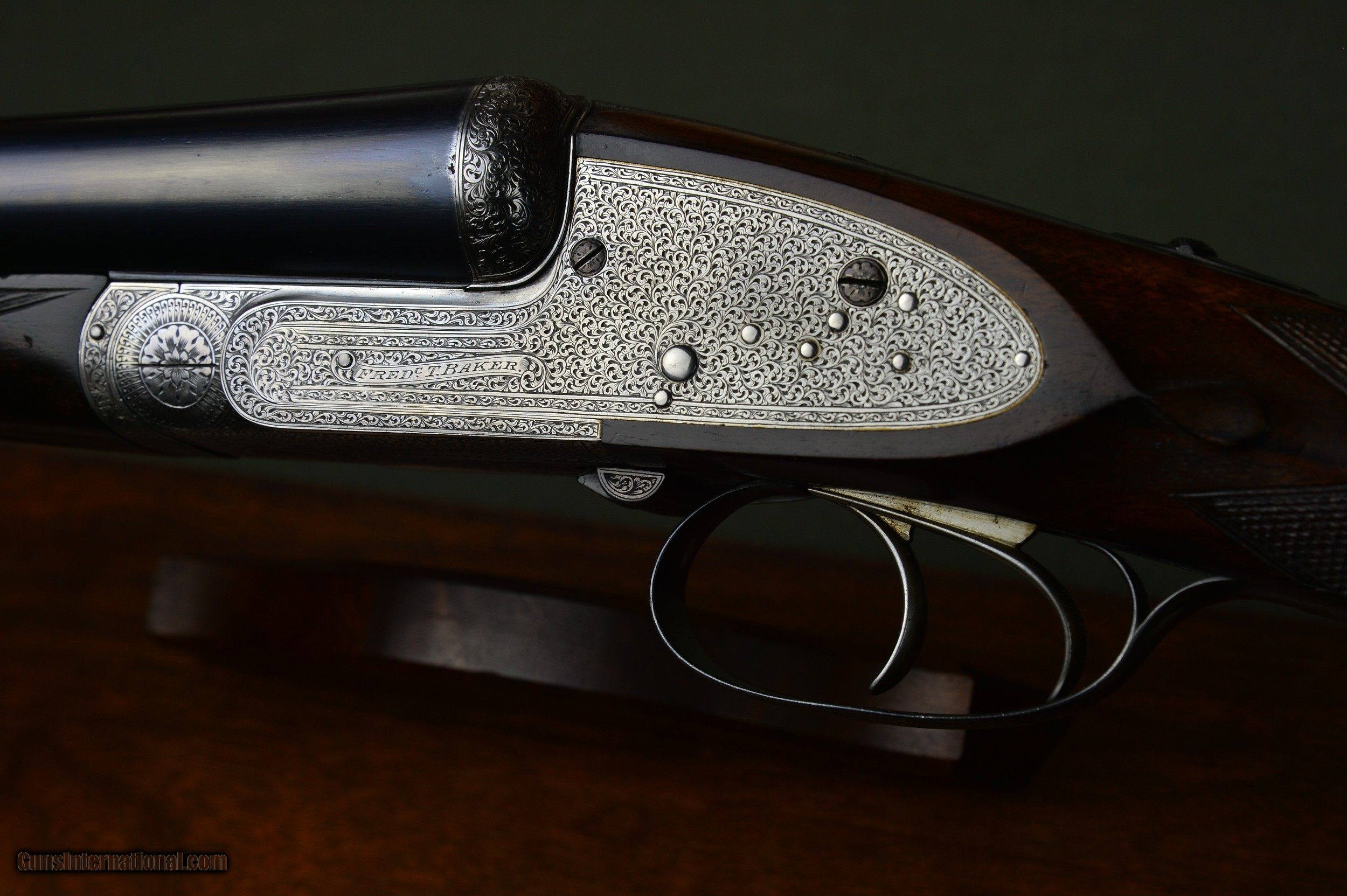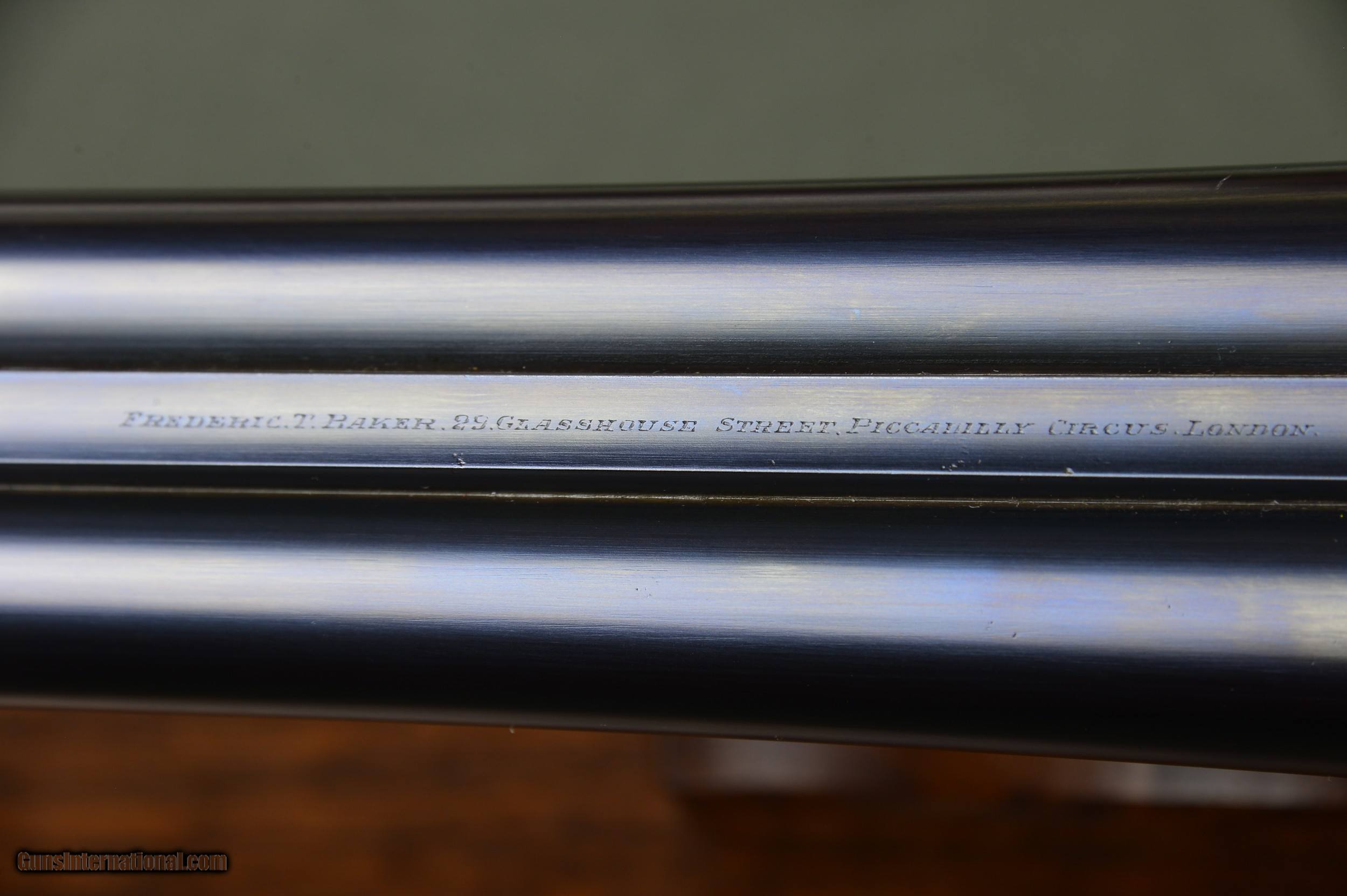 Description: *** SOLD *** Very handsome F.T. Baker 12 bore sidelock ejector game gun with the desirable and rare sidelever and intricate and profuse engraving. Highly figured French walnut stock and forearm. Double trigger and auto ejectors. Great handling and well balanced game gun. Weighs 6lb 14oz. Serial number 8038. Manufactured circa 1913. *** The 28” nitro steel barrels are chambered for 2-1/2” shotshells. They are topped by a raised solid concave gamestyle rib. The rib is inscribed “ Frederic T Baker. 29 Glasshouse Street. Picadilly Circus. London. “. The right barrel is bored 0.730 with a constriction of 0.012 for Improved Cylinder choke. Minimum wall thickness is 0.024. The left barrel is also bored 0.730 and has a constriction of 0.018 for Modified choke. Minimum wall thickness is 0.023. *** The straight grip stock and splinter forearm are made of highly figured French walnut with a nice satin hand rubbed oil finish. Checkering is crisp. Stock dimensions are 15-1/4” over a checkered butt by 1-1/2” by 2”. Very slightly cast off for the righthanded shooter. *** Frederic T. Baker was known as one of the better quality London gunmakers and was also known for the intricate and profuse engraving on his guns. The photos speak for themselves. This is a well balanced and great handling game gun perfect for clays or game. *** Please note that the photos are part of the description. I am an FFL and will need a signed copy of your dealer’s FFL license. Buyer is responsible for all shipping, insurance, and any other related charges. I give a 3-day non-firing inspection period and will only accept returns at buyer’s expense. SOLD |