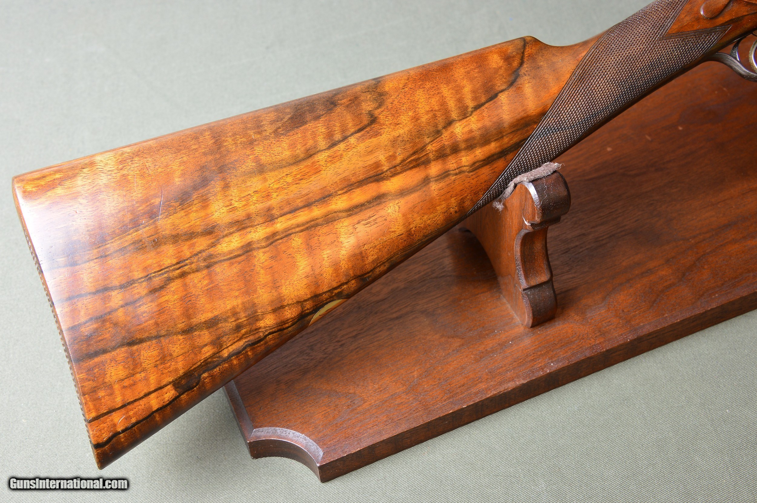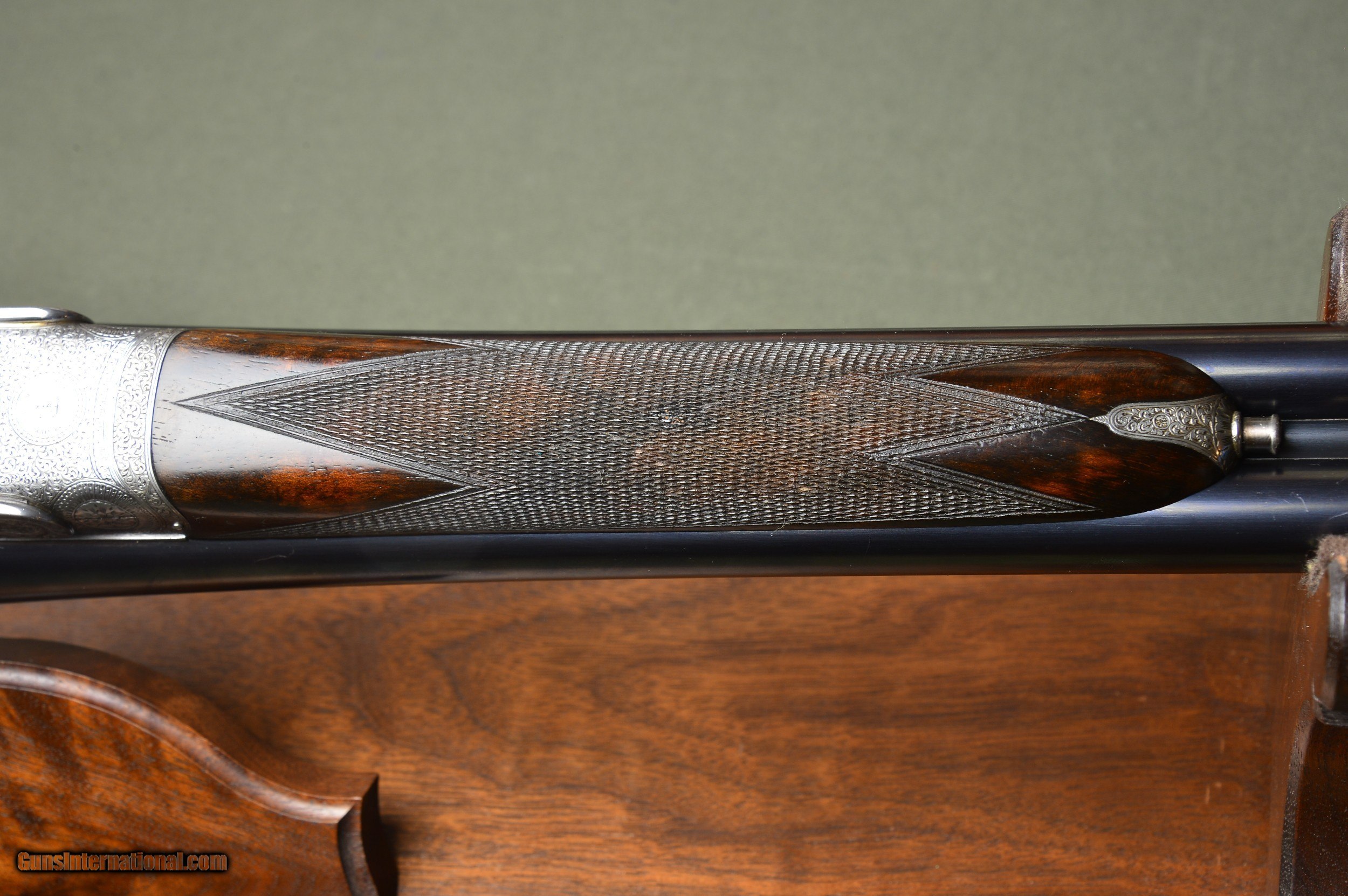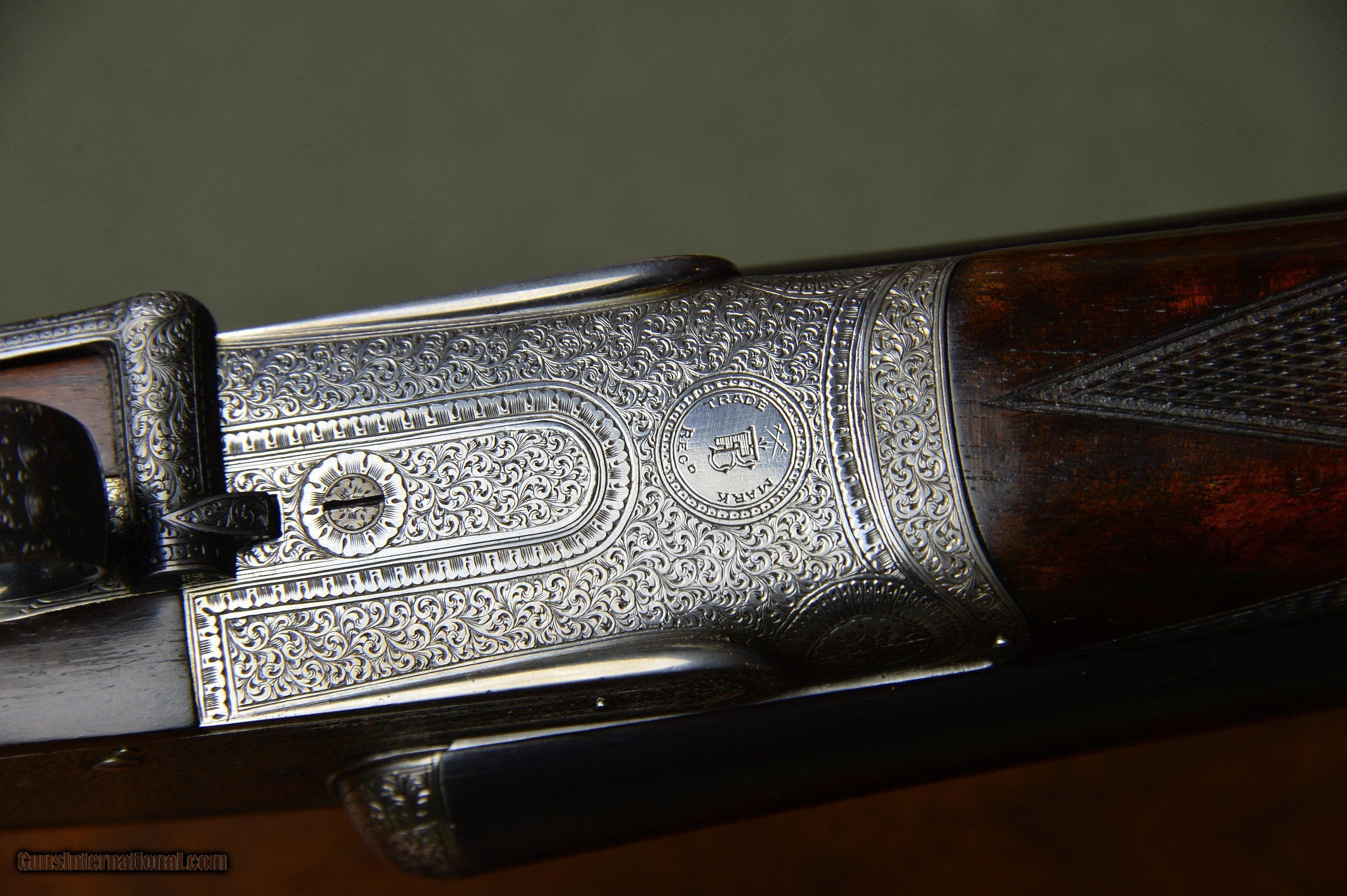Description: *** SOLD *** Very handsome F.T. Baker 12 bore sidelock ejector game gun with the desirable and rare sidelever and intricate and profuse engraving. Highly figured French walnut stock and forearm. Double trigger and auto ejectors. Great handling and well balanced game gun. Weighs 6lb 14oz. Serial number 8038. Manufactured circa 1913. *** The 28” nitro steel barrels are chambered for 2-1/2” shotshells. They are topped by a raised solid concave gamestyle rib. The rib is inscribed “ Frederic T Baker. 29 Glasshouse Street. Picadilly Circus. London. “. The right barrel is bored 0.730 with a constriction of 0.012 for Improved Cylinder choke. Minimum wall thickness is 0.024. The left barrel is also bored 0.730 and has a constriction of 0.018 for Modified choke. Minimum wall thickness is 0.023. *** The straight grip stock and splinter forearm are made of highly figured French walnut with a nice satin hand rubbed oil finish. Checkering is crisp. Stock dimensions are 15-1/4” over a checkered butt by 1-1/2” by 2”. Very slightly cast off for the righthanded shooter. *** Frederic T. Baker was known as one of the better quality London gunmakers and was also known for the intricate and profuse engraving on his guns. The photos speak for themselves. This is a well balanced and great handling game gun perfect for clays or game. *** Please note that the photos are part of the description. I am an FFL and will need a signed copy of your dealer’s FFL license. Buyer is responsible for all shipping, insurance, and any other related charges. I give a 3-day non-firing inspection period and will only accept returns at buyer’s expense. SOLD |