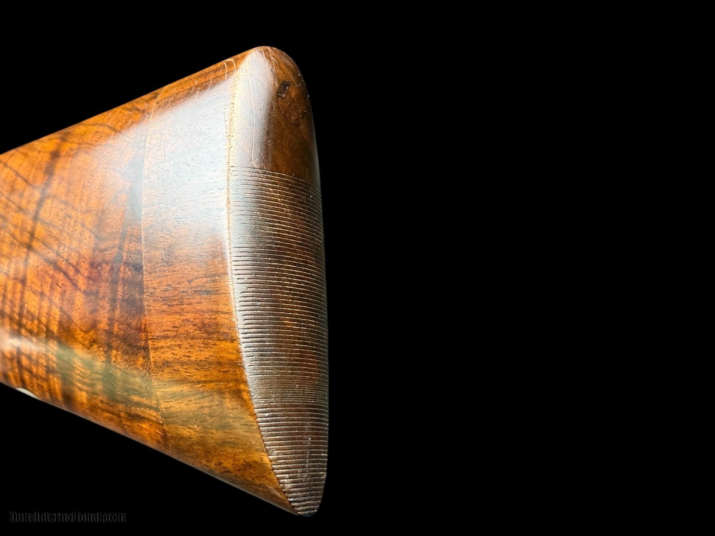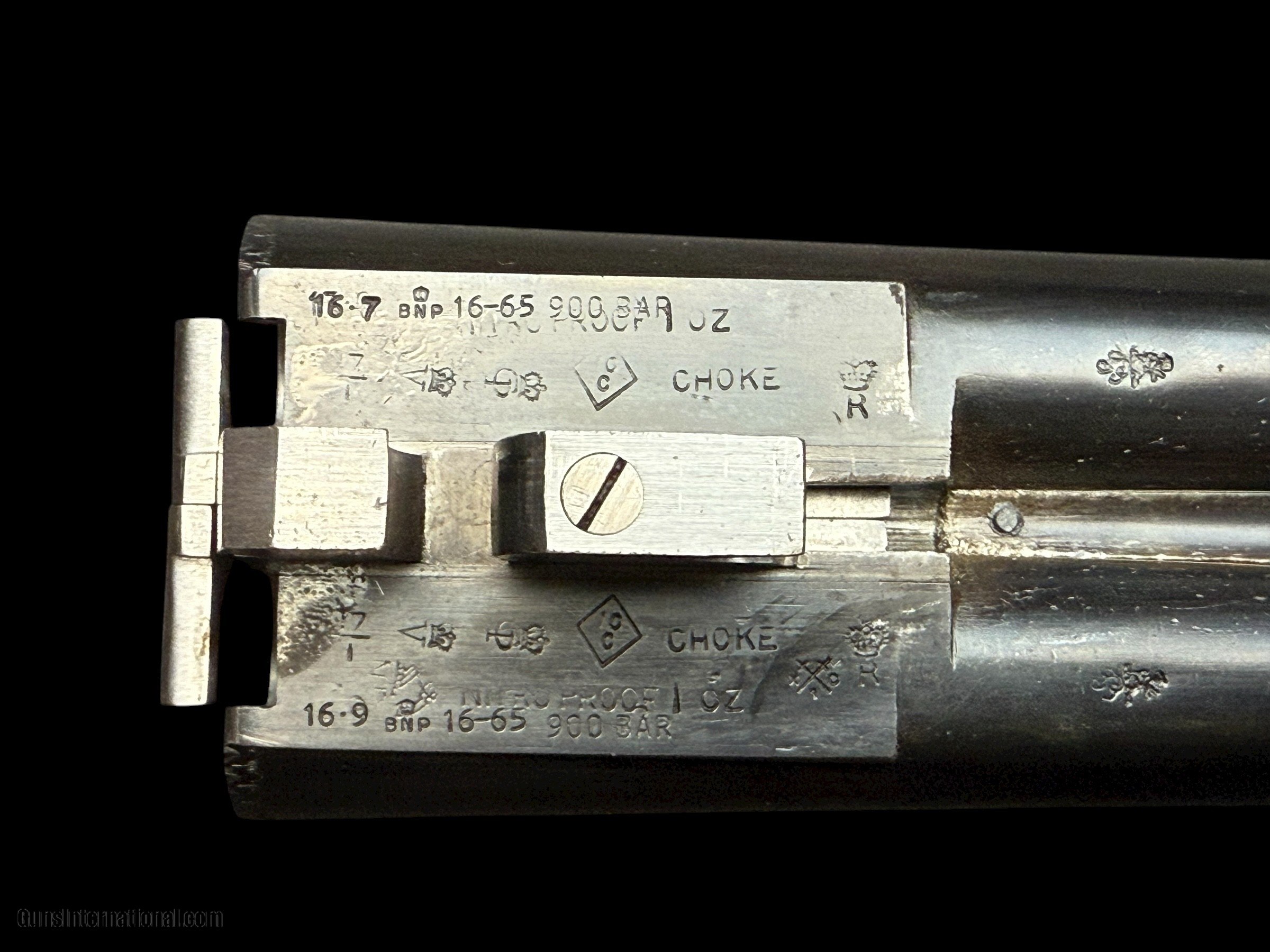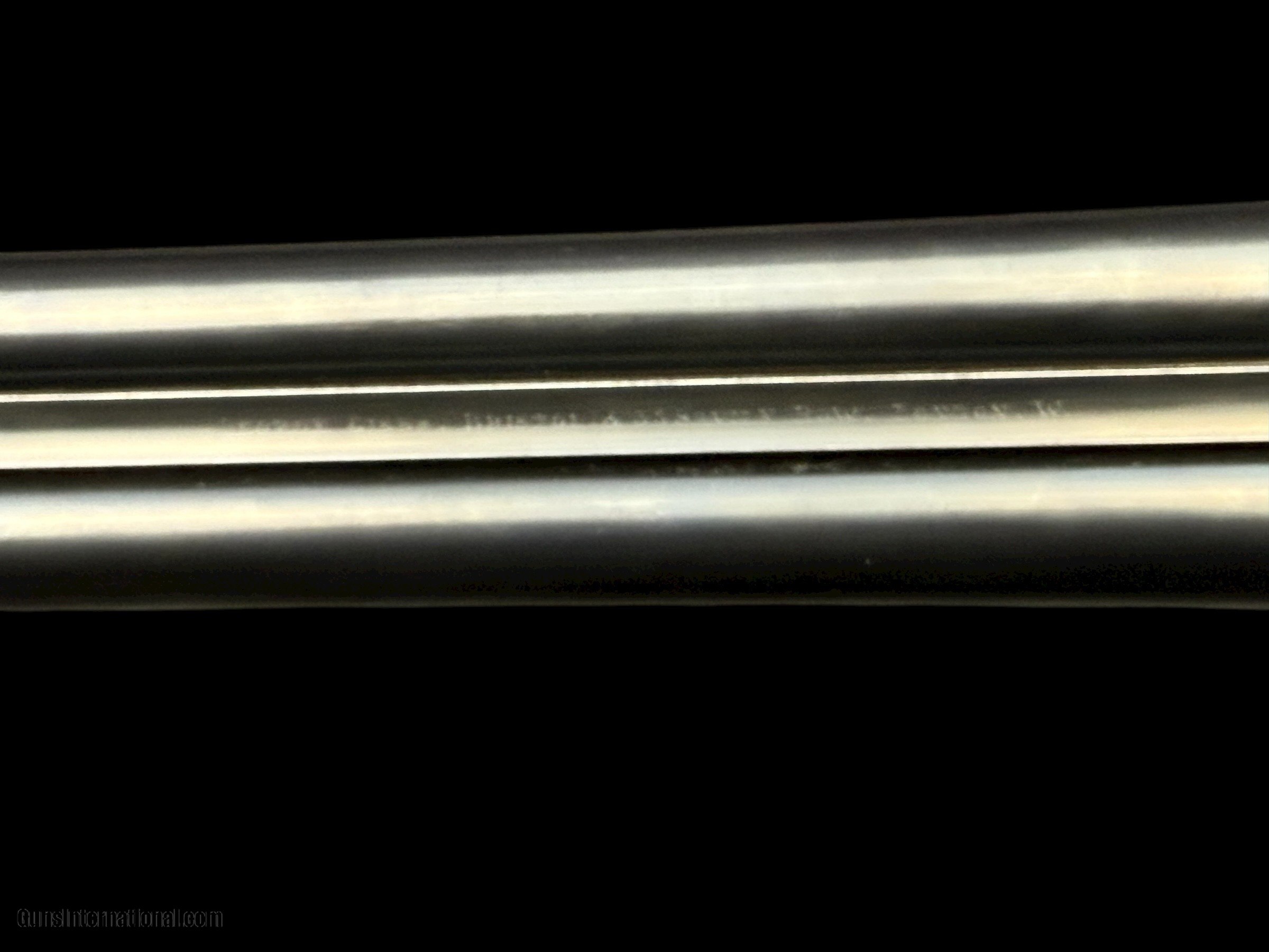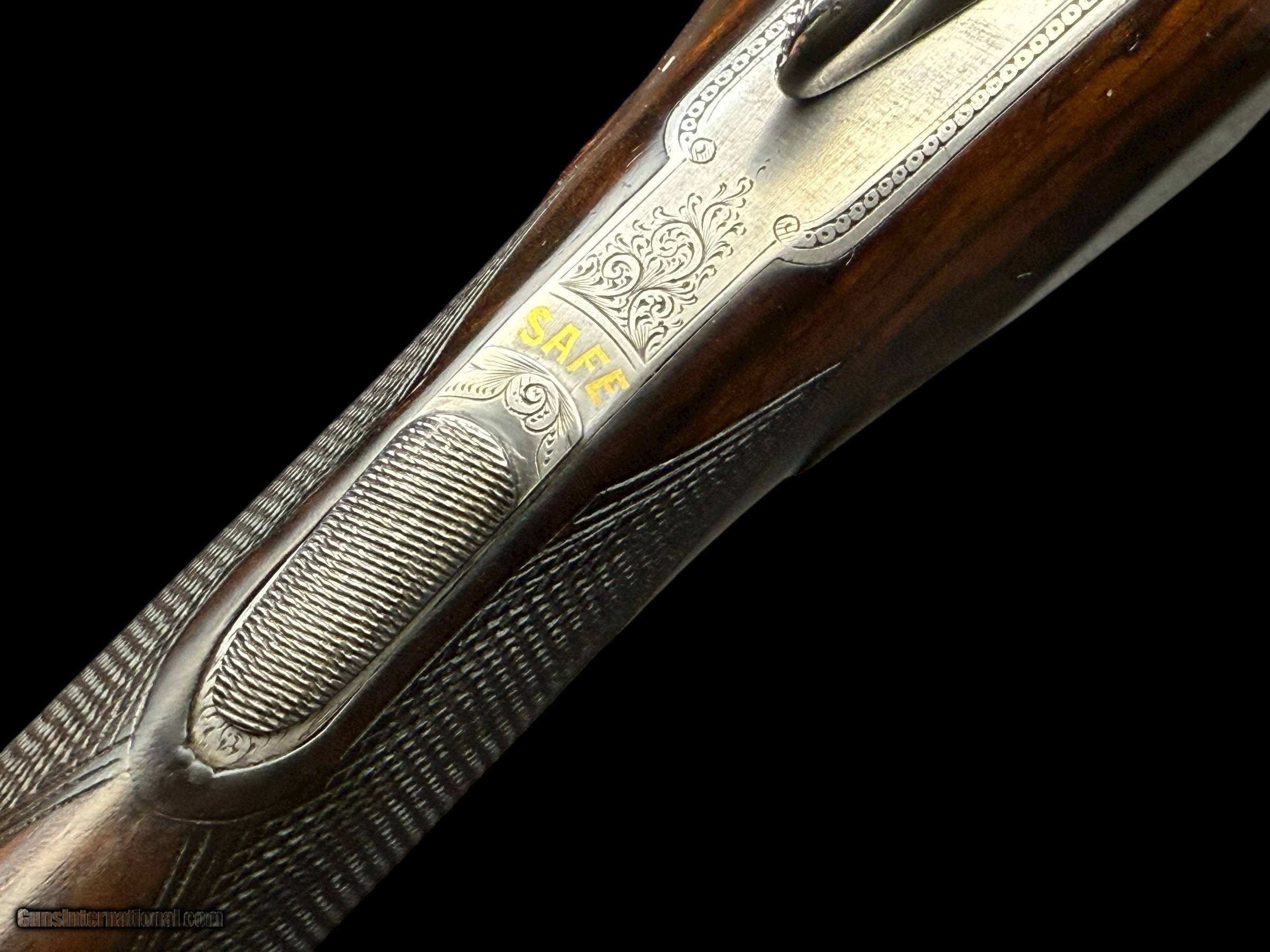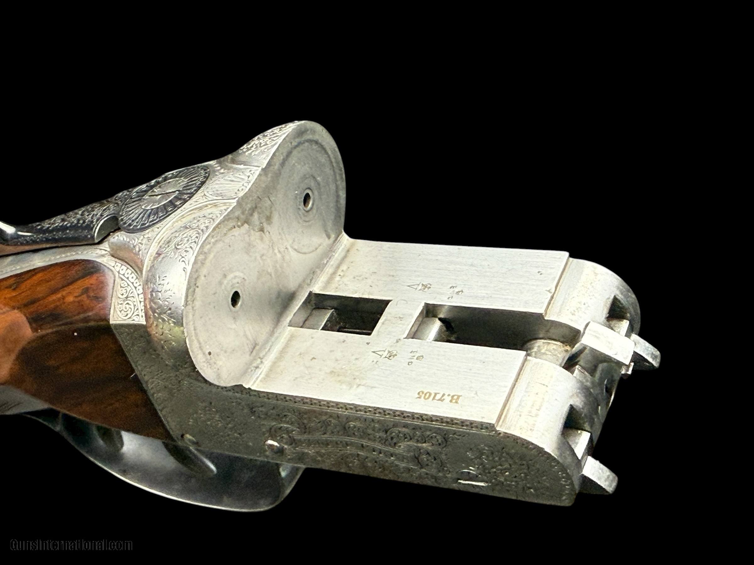 Description: GEORGE GIBBS - BRISTOL & 35 SAVILE ROW - LONDON W. - ENGLAND MODEL: ENGRAVED BOXLOCK GAME GUN - SCROLL ENGRAVED RECEIVER W/ "GEORGE GIBBS" IN BANNERS ON BOTH ACTION SIDES - 16GA - 2 1/2" CHAMBERS WITH MODERN BNP PROOFS - 28" BARRELS - CHOKES: .017 / .025 EJECTORS - DOUBLE TRIGGERS - AUTO SAFETY W/ "SAFE" IN GOLD - NICELY FIGURED ENGLISH WALNUT STRAIGHT GRIP STOCK AND SPLINTER FOREND W/ STRAIGHT LINE CHECKERED BUTT - DIMS: LOP: 14 7/8" W/ 1 5/8" EXTENSION (WE CAN PROVIDE SERVICES TO REMOVE AND REPLACE WITH PAD TO YOUR DIMENSIONS ) | DAC: 1 5/8" | DAH: 2 1/8" - WEIGHT: 5LBS 9OZ CONDITION: GUN IS IN VERY GOOD OVERALL CONDITION. ACTION TIGHT AND ON-FACE. BORES CLEAR. TRIGGERS CRISP. EJECTORS IN-TIME. BLUING VERY GOOD. WOOD FINISH AND CHECKERING VERY GOOD AS LONDON QUALITY MAITAINED. GENTLEMEN, THIS IS A CLASSIC LIGHTWEIGHT GAME GUN AND WOULD A PLEASURE TO CARRY AFIELD ON YOUR NEXT DOVE, QUAIL, GROUSE, OR PHEASANT HUNT. Curio/Relic: Yes Shotgun Gauge: 16 Gauge Manufacturer: GEORGE GIBBS Model: SXS Serial Number: B7105 Barrel Length: 28 Chambers: 2 1/2" OR 65MM Ejectors: YES Condition: VERY GOOD Metal Condition: VERY GOOD Wood Condition: VERY GOOD Bore Condition: VERY GOOD Action: BOXLOCK EJECTOR Triggers: DOUBLE Price: $1,850.00 Contact Seller |