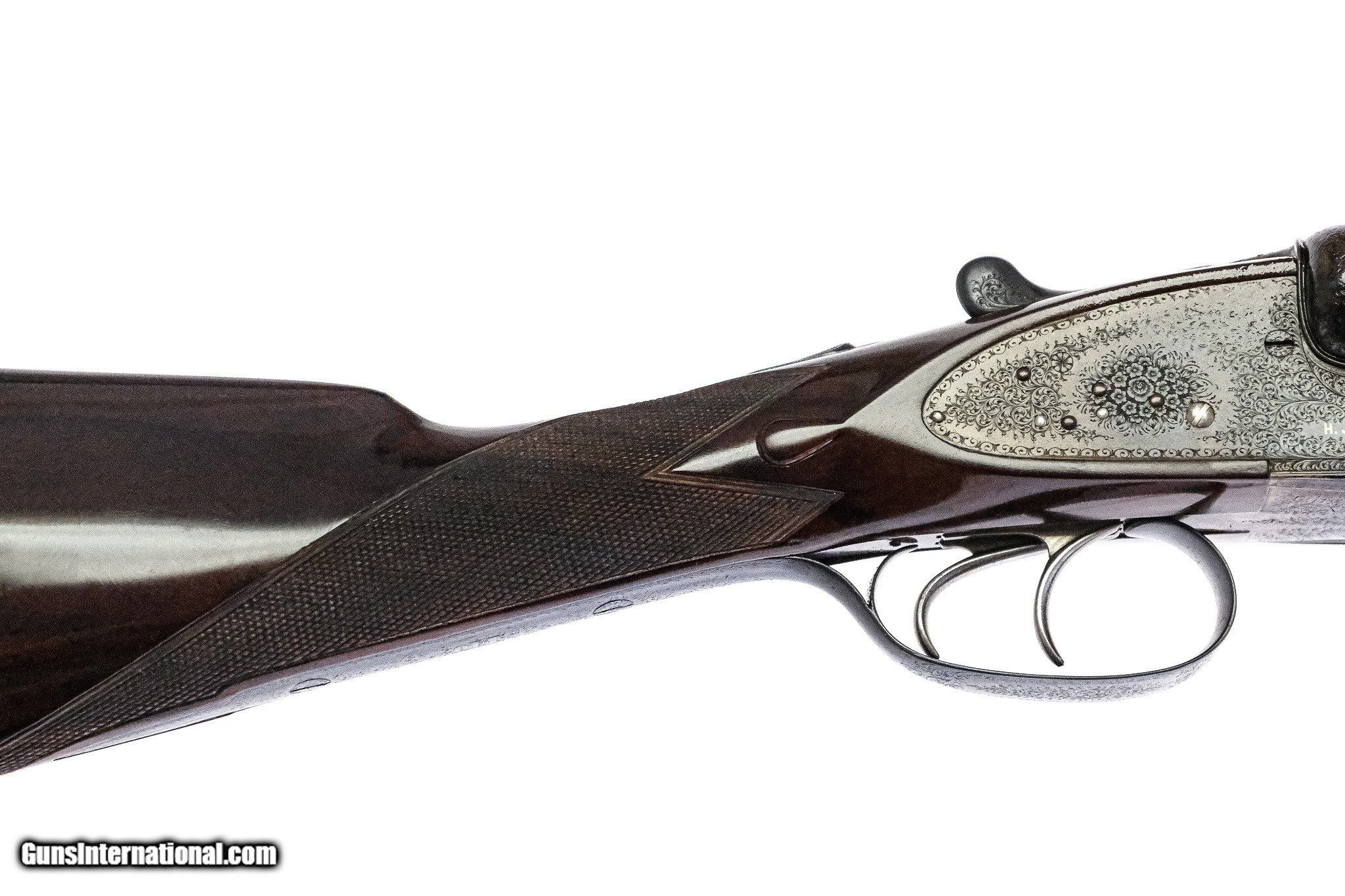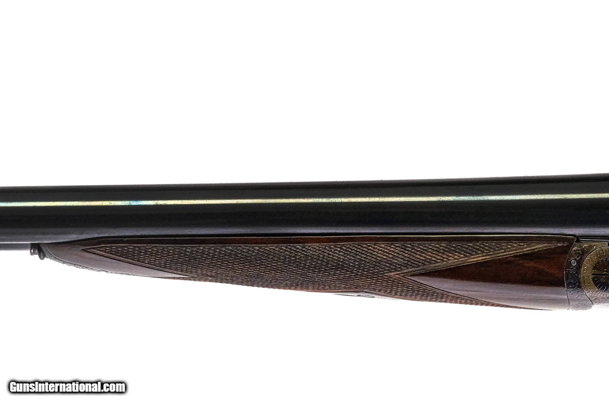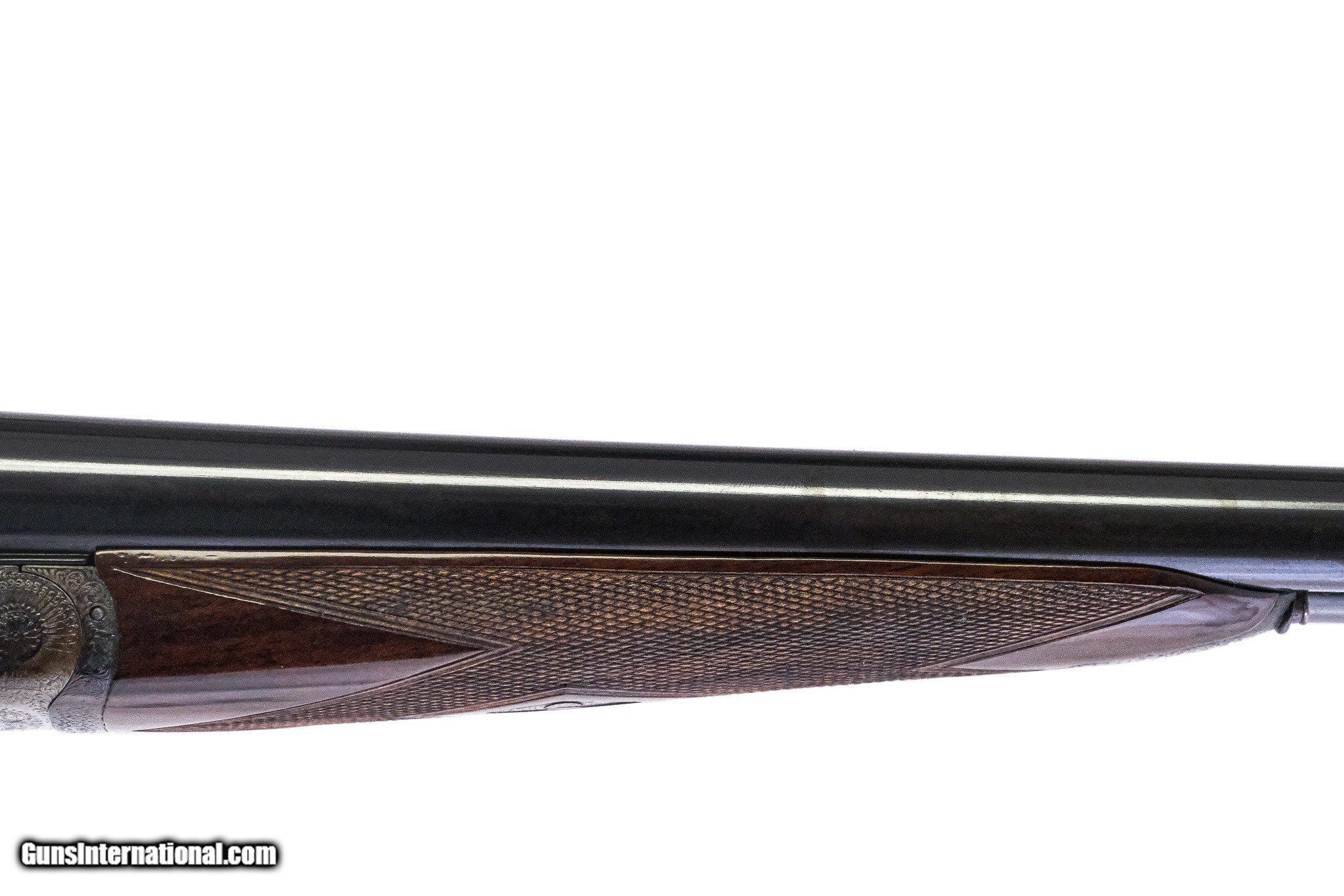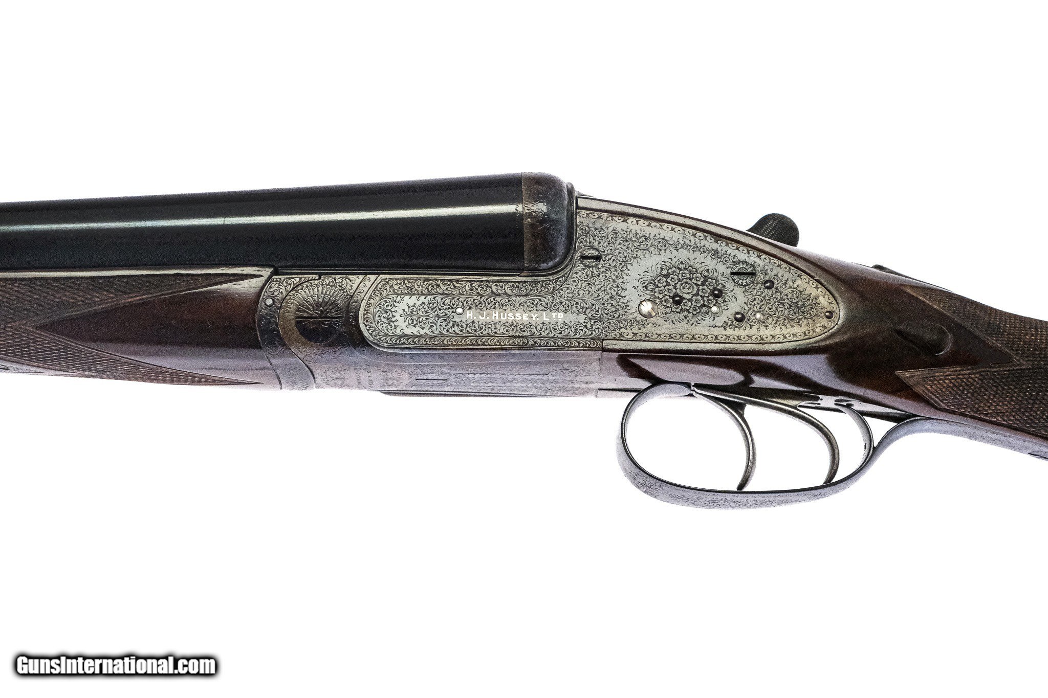 Description: H.J. Hussey - SxS, Imperial Ejector, 12ga. 28" Barrels Choked IC/IM. 2 ½" chambers, reproofed in 1985. Straight grip, original horn butt, double trigger, automatic ejector, splinter forend, best quality English rose and scroll engraving with H.J HUSSEY LIMITED on each side of the lock plate inlayed in gold. Number 2 of a pair, perfect screws and drop points, marked “Imperial ejector” on bottom of the frame. This gun has had a complete English make over and appears virtually as brand-new. Perfect screws Engraving is sharp and clear, gun operates perfectly. Tight and crisp as the day it was made. Perfect barrel lettering. Slight cast off. Inv: 74193 6 lbs. 2 oz. 14 5/8" x 1 1/2" x 1 3/4" $9,250.00 SOLD |