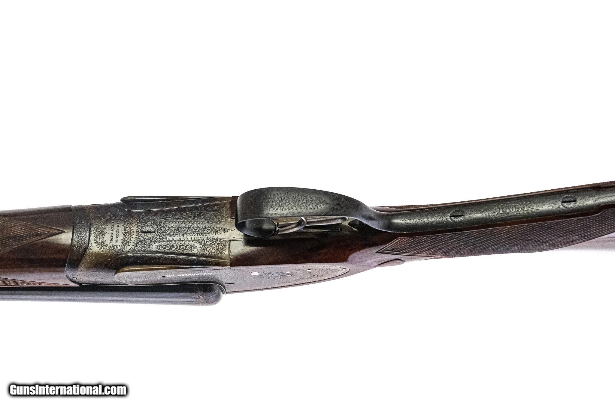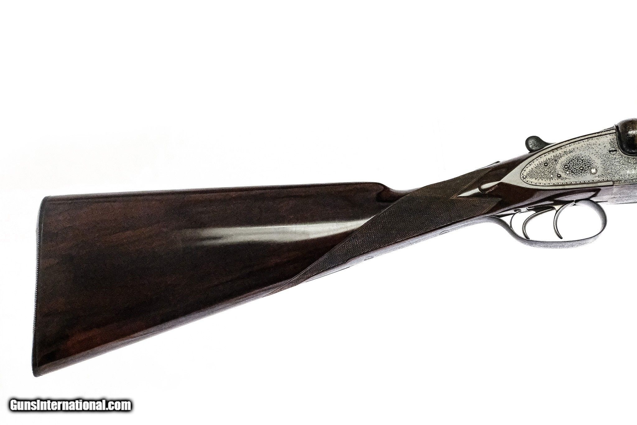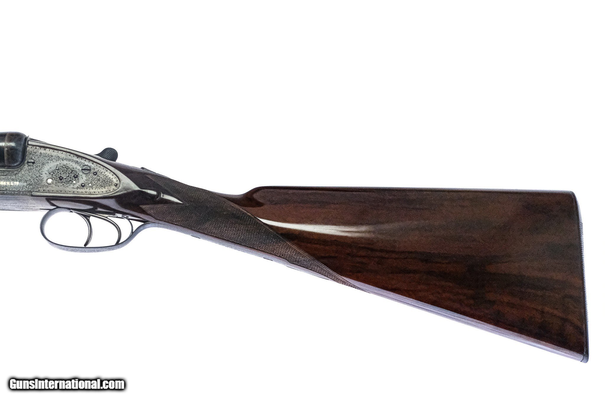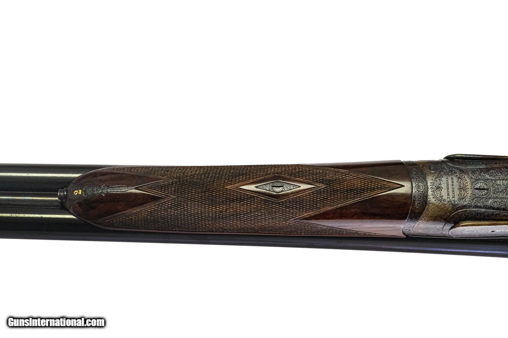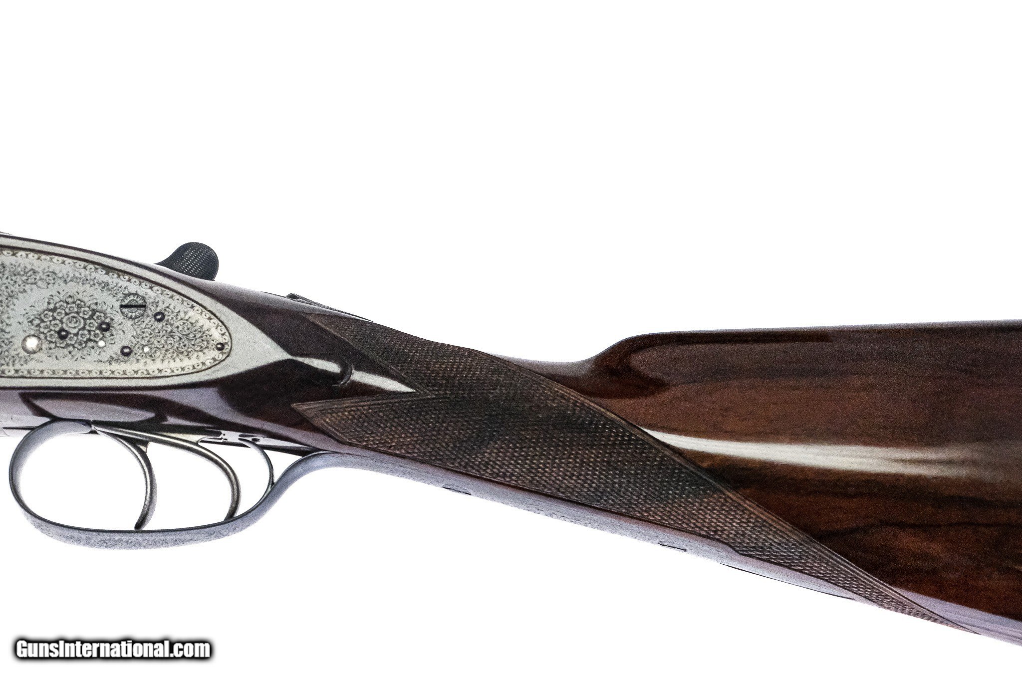 Description: H.J. Hussey - SxS, Imperial Ejector, 12ga. 28" Barrels Choked IC/IM. 2 ½" chambers, reproofed in 1985. Straight grip, original horn butt, double trigger, automatic ejector, splinter forend, best quality English rose and scroll engraving with H.J HUSSEY LIMITED on each side of the lock plate inlayed in gold. Number 2 of a pair, perfect screws and drop points, marked “Imperial ejector” on bottom of the frame. This gun has had a complete English make over and appears virtually as brand-new. Perfect screws Engraving is sharp and clear, gun operates perfectly. Tight and crisp as the day it was made. Perfect barrel lettering. Slight cast off. Inv: 74193 6 lbs. 2 oz. 14 5/8" x 1 1/2" x 1 3/4" $9,250.00 SOLD |
