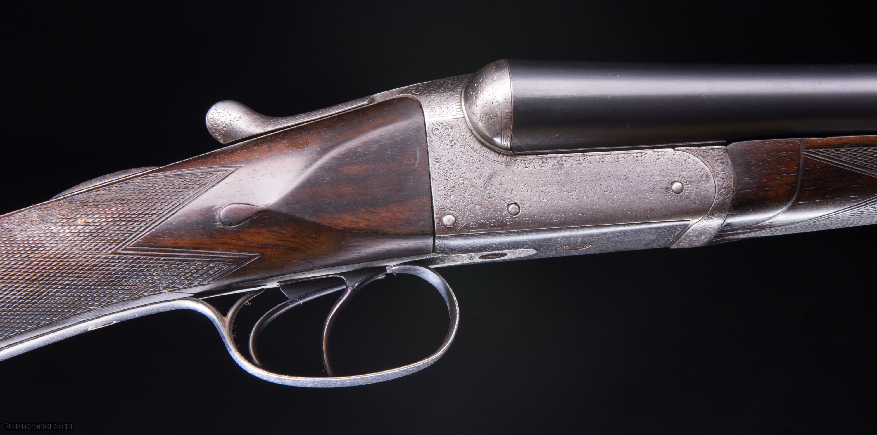 Description: Boxlocks - This gun has a lot to offer for the price. Wood worthy of a Boss or Purdey for one. It is tight on face and ready to shoot. There is honest engraving wear showing this old girl has spent a considerable amount of time afield. I detect and old stock repair in the wrist that has been expertly done and reinforced with an extended top tang.
