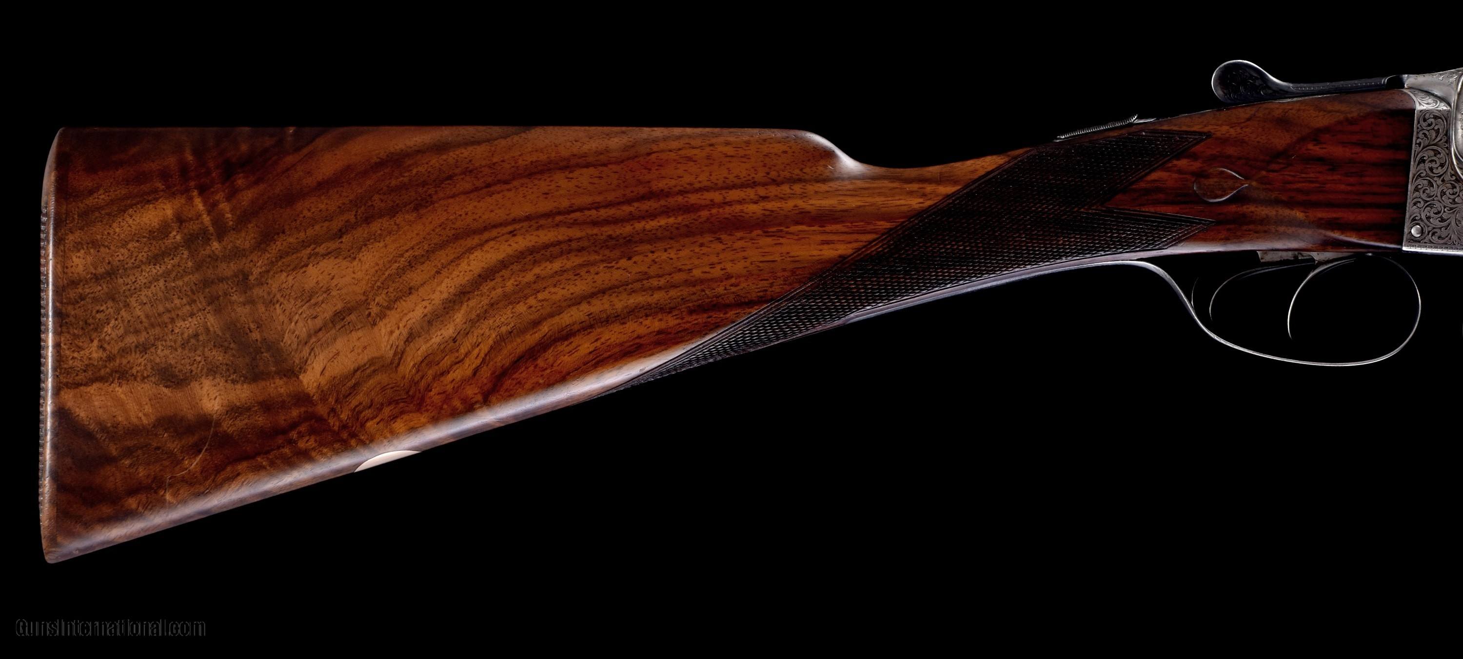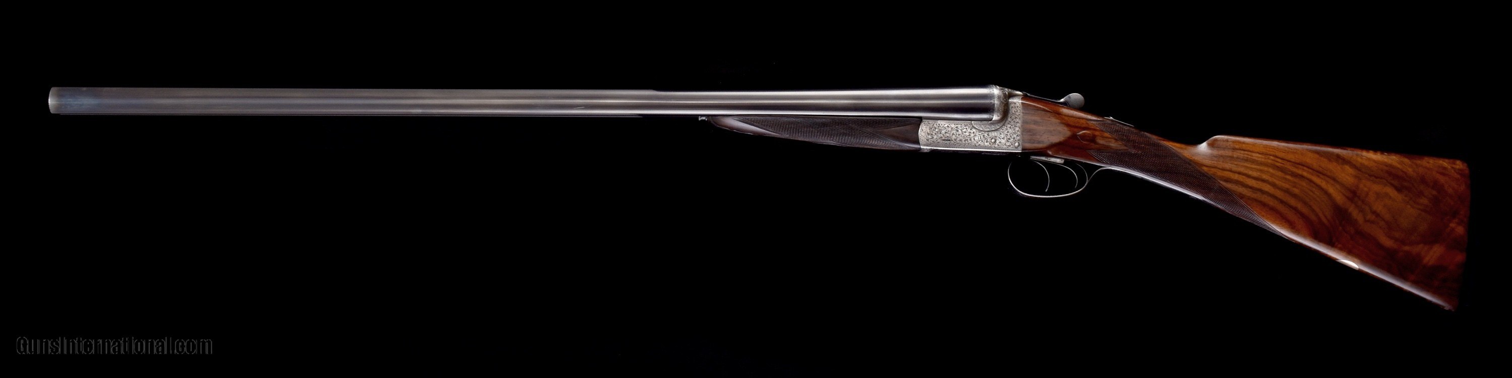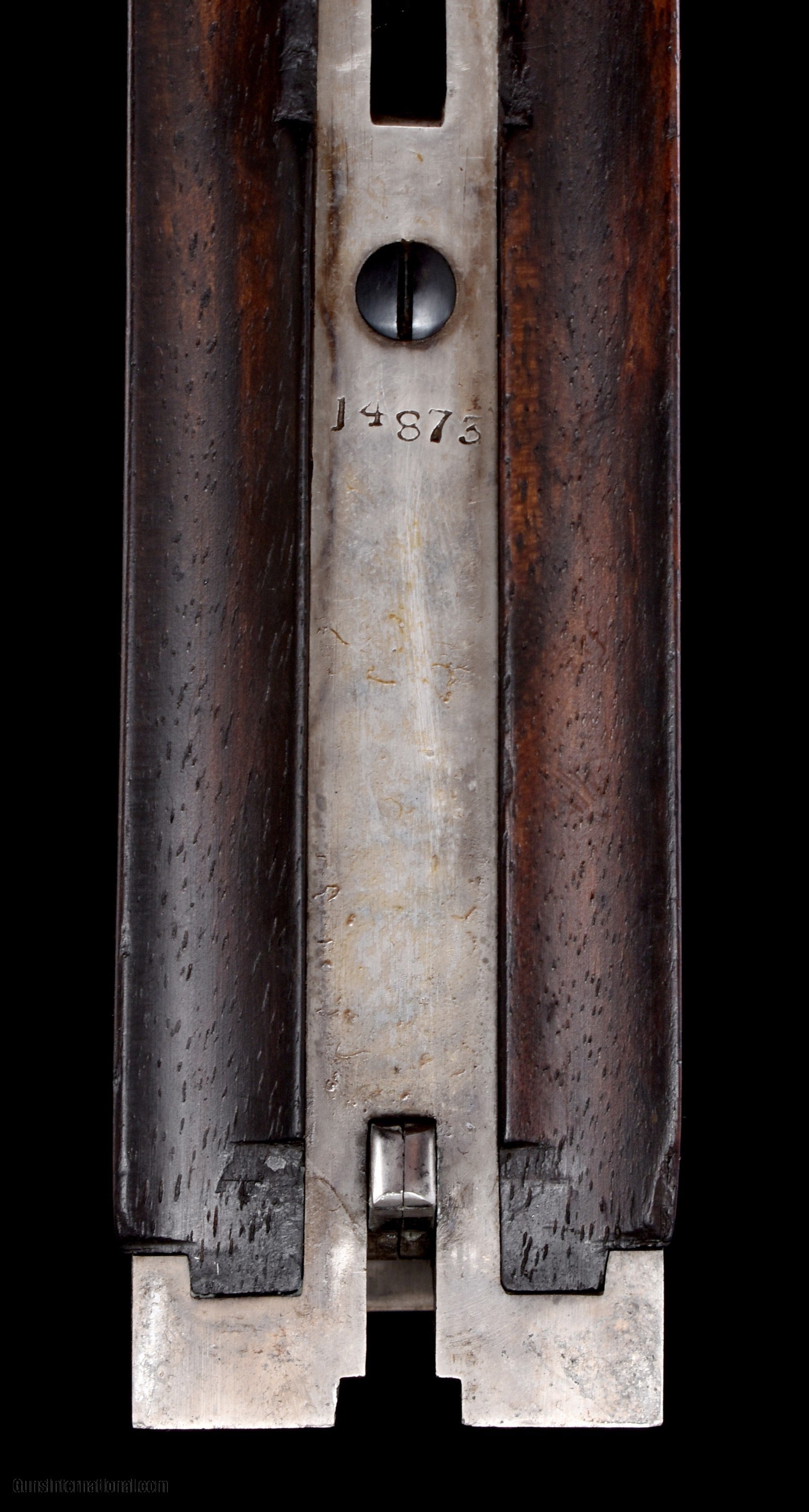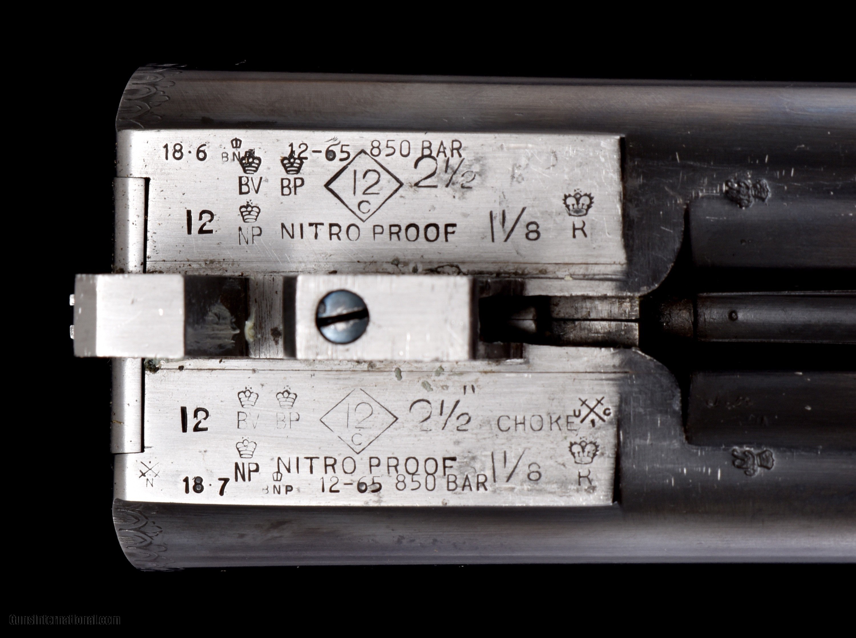 Description: Awesome lightweight 12ga game gun built with 28" English fluid steel brls that have Churchill rib with small steel front bead. Maker's name "G.E. LEWIS & SONS 32 & 33 LOWER LOVEDAY ST BIRMINGHAM" engraved on rib and breech ends of barrels with small ring of engraving. Polished barrel flats with current proof stamps. Splinter forearm checkered in point pattern with scroll engraved Anson type push button release and iron. Beaded and reinforced boxlock receiver is near full coverage scroll engraved on sides with maker's name in relief banner. Barrel fences and top of frame are nicely scroll engraved. Blued top lever is gold inlaid at picot point "THE ARIEL" and scroll engraved throughout. Top tang engraved en-suite with gold inlaid "SAFE" in front of safety slide. Blued trigger plate engraved in about 80% scroll coverage. Blued long tang trigger guard with scroll on bow and tang with SN at center. Gun made with double triggers, auto ejectors, auto safety, and hidden third fastener. Very nicely figured walnut buttstock has carved teardrop behind receiver, is checkered in 2 point pattern through the wrist, has gold oval on toeline, and terminates with a thin 1/4" checkered butt wood buttplate. Gun remains in very good to excellent overall condition. Barrel, trigger plate, and trigger guard have been professionally restored and retain about 90% of those proper blued finishes. Buttstock and forearm are sound and retain most of their proper restored hand rubbed finishes. Frame has drifted to mostly gray with engraving still crisp. Bores are bright and shiny. Mechanics are excellent. A really good looking very lightweight 12 gauge which would be a ball to carry in grouse and woodcock cover. This fine G.E. Lewis is priced at $3995 plus shipping to your FFL. Please dont hesitate to contact me with any questions at (704) 280-2382 or via PM on this site. Curio/Relic: Yes Shotgun Gauge: 12 Gauge Manufacturer: George Lewis Model: Ariel Serial Number: 14873 Barrel Length: 28 Chambers: 2-1/2 Ejectors: Yes Condition: Excellent Metal Condition: Excellent Wood Condition: Excellent Bore Condition: Bright and shiny Triggers: Double Triggers Stock Comb: 1-9/16 Stock Heel: 2-3/8 Fore End: Splinter LOP: 14-1/8 Weight: 5lbs. 9oz. Choke Left: .028 Choke Right: .005 Minimum Wall Thickness Left: .024 Minimum Wall Thickness Right: .024 Price: $3,995.00 Shipping: $55.00 Buy Now Contact Seller |