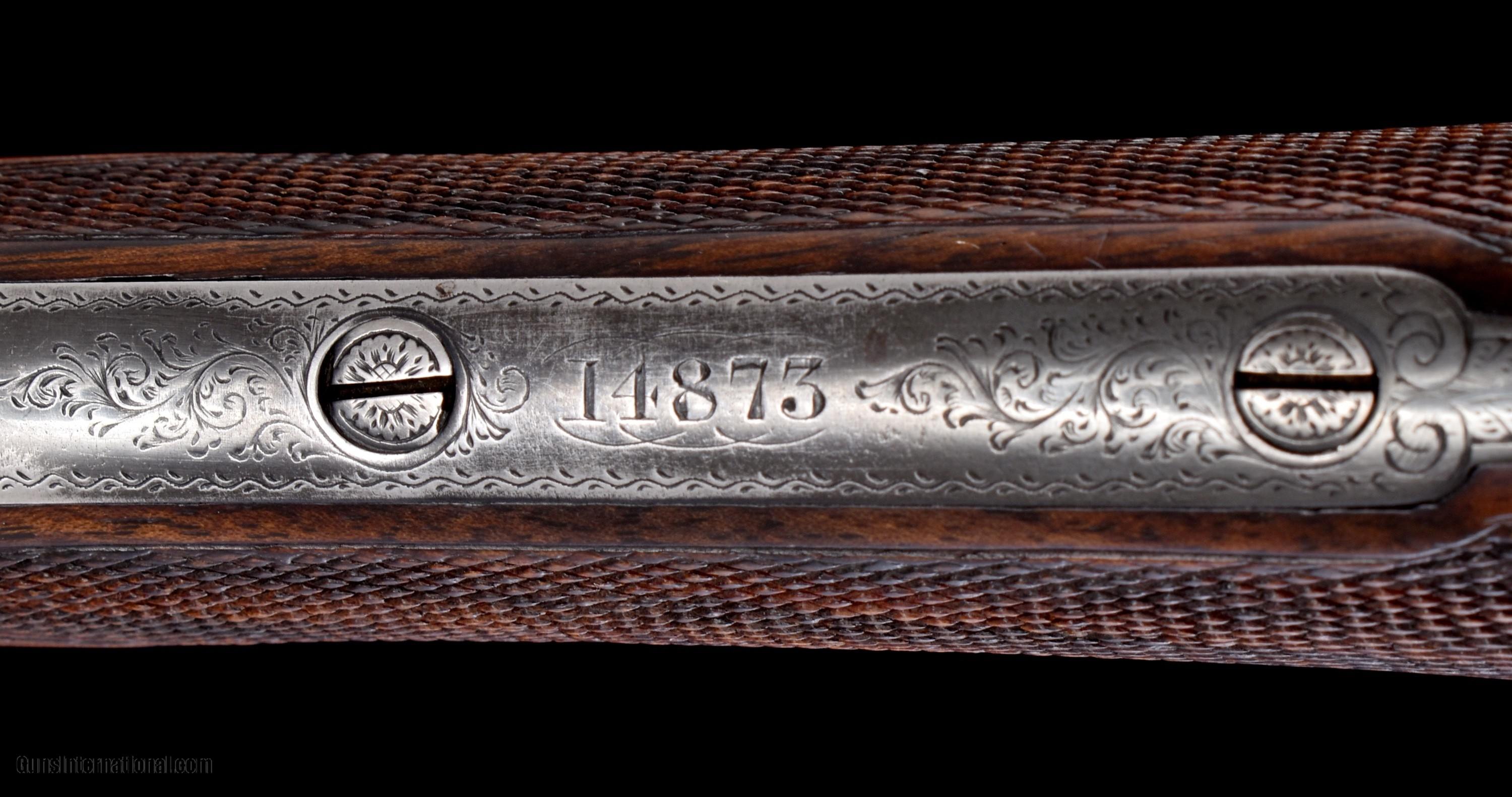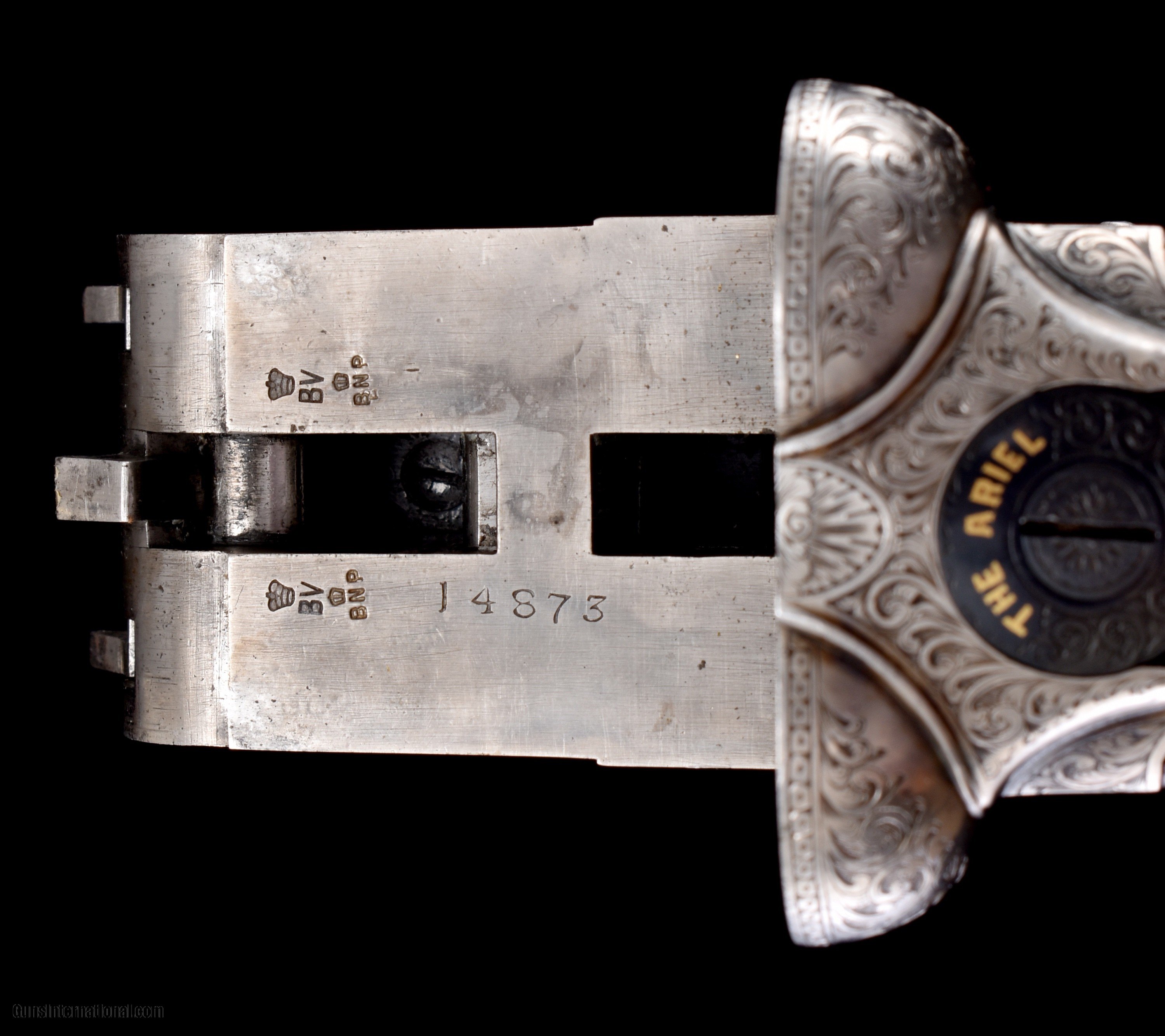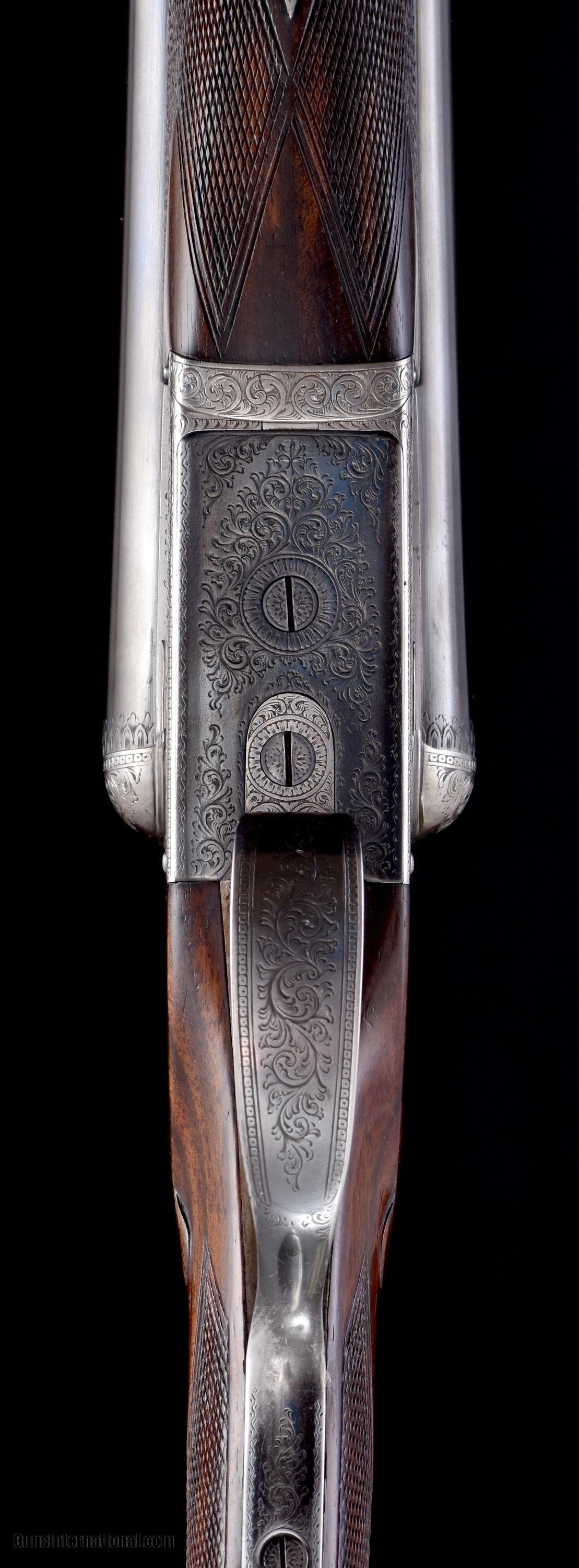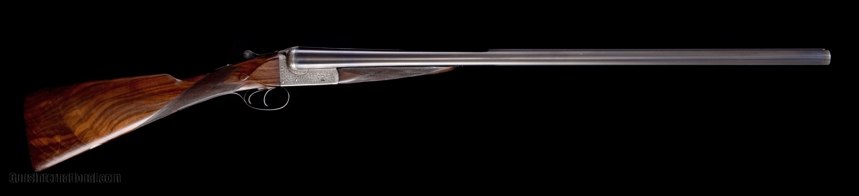 Description: Awesome lightweight 12ga game gun built with 28" English fluid steel brls that have Churchill rib with small steel front bead. Maker's name "G.E. LEWIS & SONS 32 & 33 LOWER LOVEDAY ST BIRMINGHAM" engraved on rib and breech ends of barrels with small ring of engraving. Polished barrel flats with current proof stamps. Splinter forearm checkered in point pattern with scroll engraved Anson type push button release and iron. Beaded and reinforced boxlock receiver is near full coverage scroll engraved on sides with maker's name in relief banner. Barrel fences and top of frame are nicely scroll engraved. Blued top lever is gold inlaid at picot point "THE ARIEL" and scroll engraved throughout. Top tang engraved en-suite with gold inlaid "SAFE" in front of safety slide. Blued trigger plate engraved in about 80% scroll coverage. Blued long tang trigger guard with scroll on bow and tang with SN at center. Gun made with double triggers, auto ejectors, auto safety, and hidden third fastener. Very nicely figured walnut buttstock has carved teardrop behind receiver, is checkered in 2 point pattern through the wrist, has gold oval on toeline, and terminates with a thin 1/4" checkered butt wood buttplate. Gun remains in very good to excellent overall condition. Barrel, trigger plate, and trigger guard have been professionally restored and retain about 90% of those proper blued finishes. Buttstock and forearm are sound and retain most of their proper restored hand rubbed finishes. Frame has drifted to mostly gray with engraving still crisp. Bores are bright and shiny. Mechanics are excellent. A really good looking very lightweight 12 gauge which would be a ball to carry in grouse and woodcock cover. This fine G.E. Lewis is priced at $3995 plus shipping to your FFL. Please dont hesitate to contact me with any questions at (704) 280-2382 or via PM on this site. Curio/Relic: Yes Shotgun Gauge: 12 Gauge Manufacturer: George Lewis Model: Ariel Serial Number: 14873 Barrel Length: 28 Chambers: 2-1/2 Ejectors: Yes Condition: Excellent Metal Condition: Excellent Wood Condition: Excellent Bore Condition: Bright and shiny Triggers: Double Triggers Stock Comb: 1-9/16 Stock Heel: 2-3/8 Fore End: Splinter LOP: 14-1/8 Weight: 5lbs. 9oz. Choke Left: .028 Choke Right: .005 Minimum Wall Thickness Left: .024 Minimum Wall Thickness Right: .024 Price: $3,995.00 Shipping: $55.00 Buy Now Contact Seller |