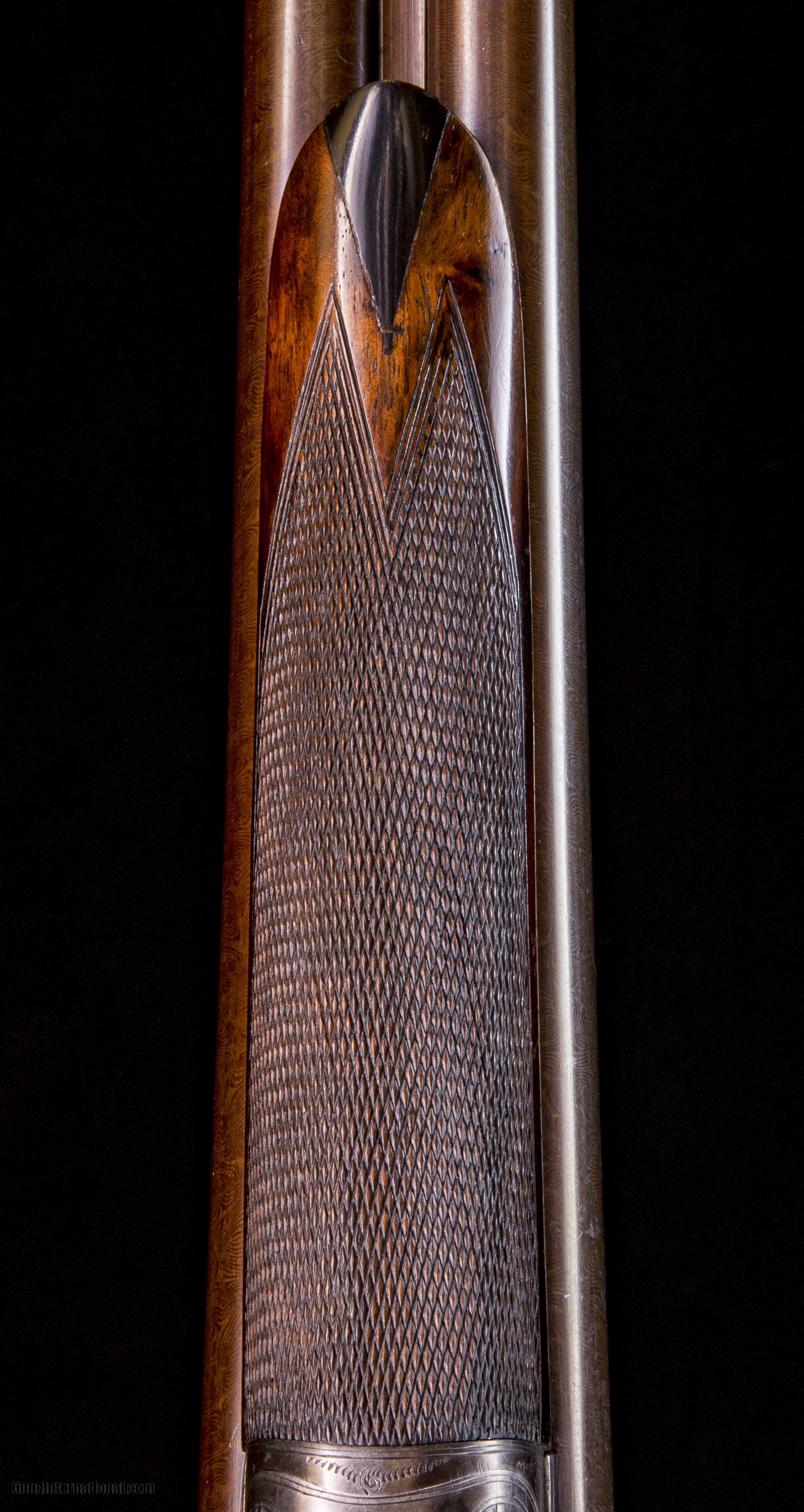 Description: Hammerguns - Dating from 1878 this nice little English double has elegant 30" barrels with exceptional wall thickness. Note the high modern dimensions and the very new when made rebounding hammers. *** Note: To see this gun with high resolution photos and a zoom-in feature, go to the vintagedoubles main site and search for the gun ID: 5696 or browse the main site to see our full gun collection. SOLD Antique: Yes Manufacturer: Horatio Jones, 25 High St., Wrexham ~ No ffl needed Antique but nitro proofed Damascus Model: Sidelock hammer Serial Number: 326 Ejectors: No Barrels: 30 Barrel Type: Damascus Action: Sidelock Gauge Info: 12 gauge Stock Comb: 1 7/16 Stock Heel: 2 Stock Cast: 0 LOP: 14 3/8" with b Weight: 6lbs 10ozs Choke Left: .007" IC Choke Right: Cyl Proof:Nitro: 2 1/2 Minimum Wall Thickness Left: .031 Minimum Wall Thickness Right: .030 |