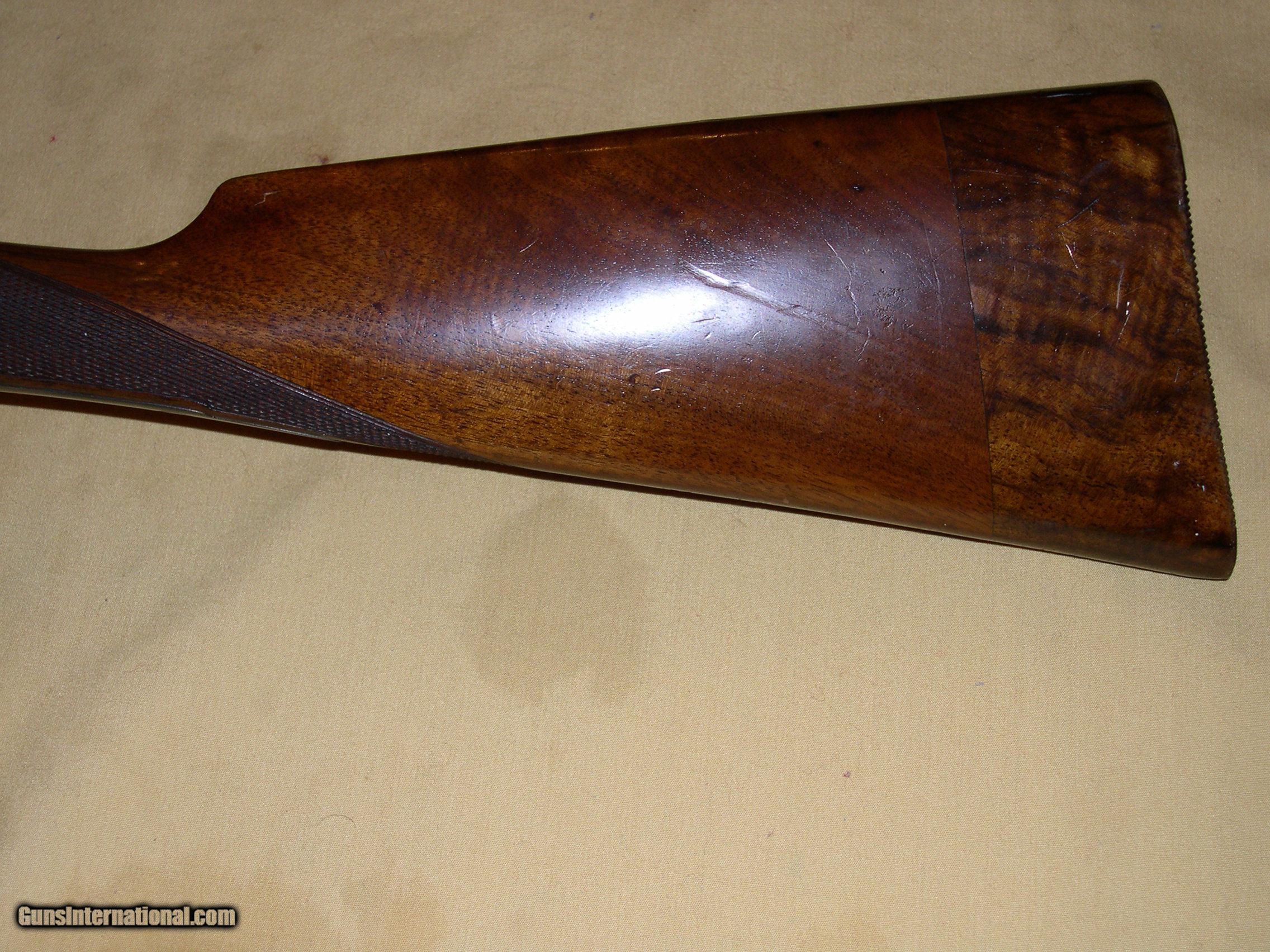 Description: Reducing my colection. This is a English double shotgun likely post war in very good conditoin with 28" barrells straight grip and extrators in 12 gauge. A tight and very usable gun with very nice handling, double triggers, excellent bores and choked I/C and Full. The chambers aare 2 1/2" and proofed nitro. Numbers are matching. The buttstock has been lengthened to a 15" pull and has a grooved butt. The drop at the comb is 1 1/2" and at the heel 2 1/4". There is a skight cast off. There is a nick/dent in the checkering on the left side. The case colors have been worn off and it never had engraving. Shipped to an FFL in a new hard case. Add $25 (my cost) for a new hard case to prevent damage in shipping. Actual shipping costs are paid by the buyer. Shoot a real classic. SOLD Curio/Relic: Yes Manufacturer: J. Hughes & Son Bore: 12 gauge Chambers: 2 1/2 Ejectors: no Condition: very good Metal Condition: very good Wood Condition: good nick in the checkering, pieced butt Bore Condition: excellent Barrels: 28 Barrel Type: steel Action: box Triggers: double Gauge Info: 12 Stock: straight Fore End: splinter Proof:Nitro: yes |