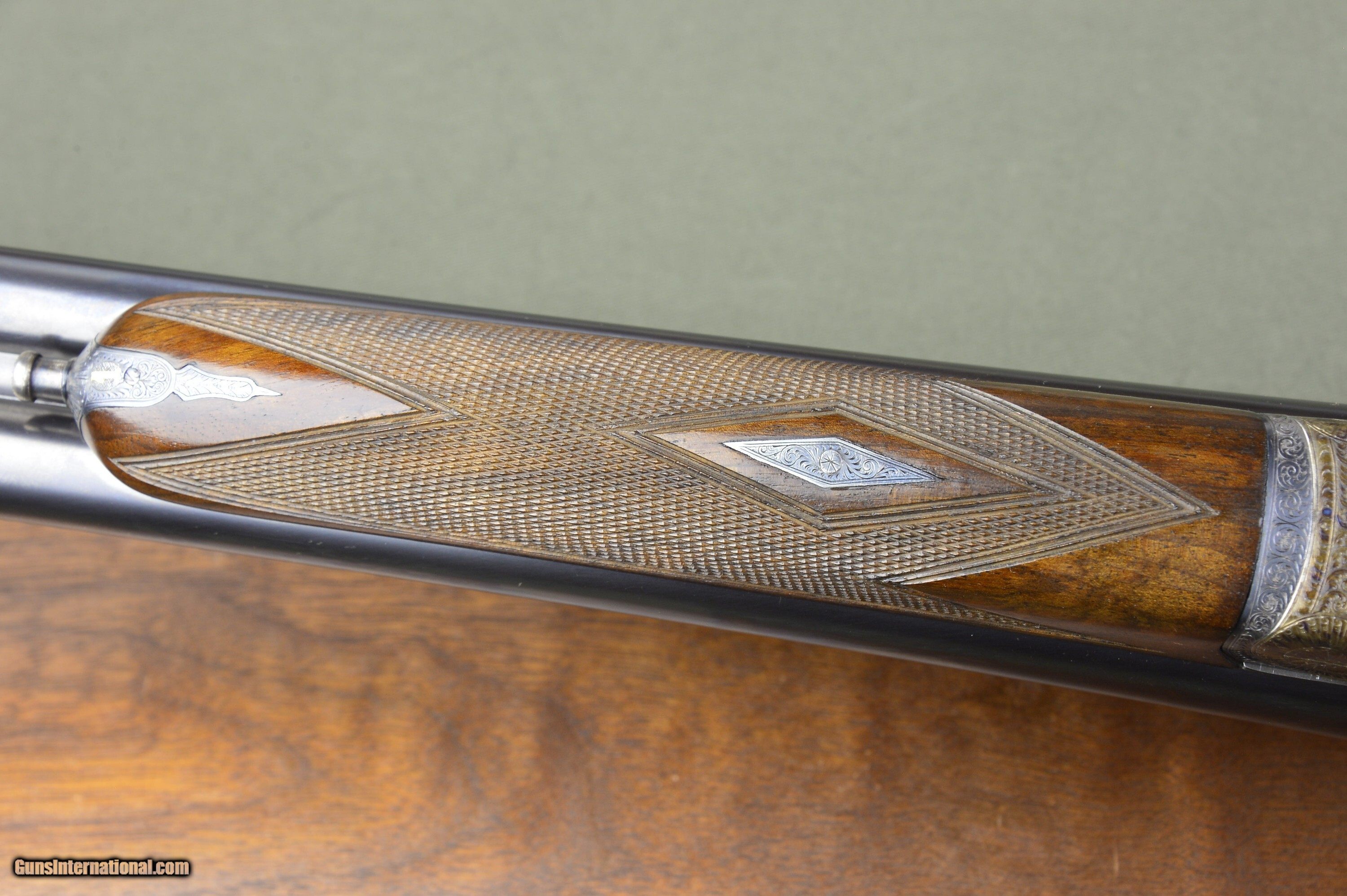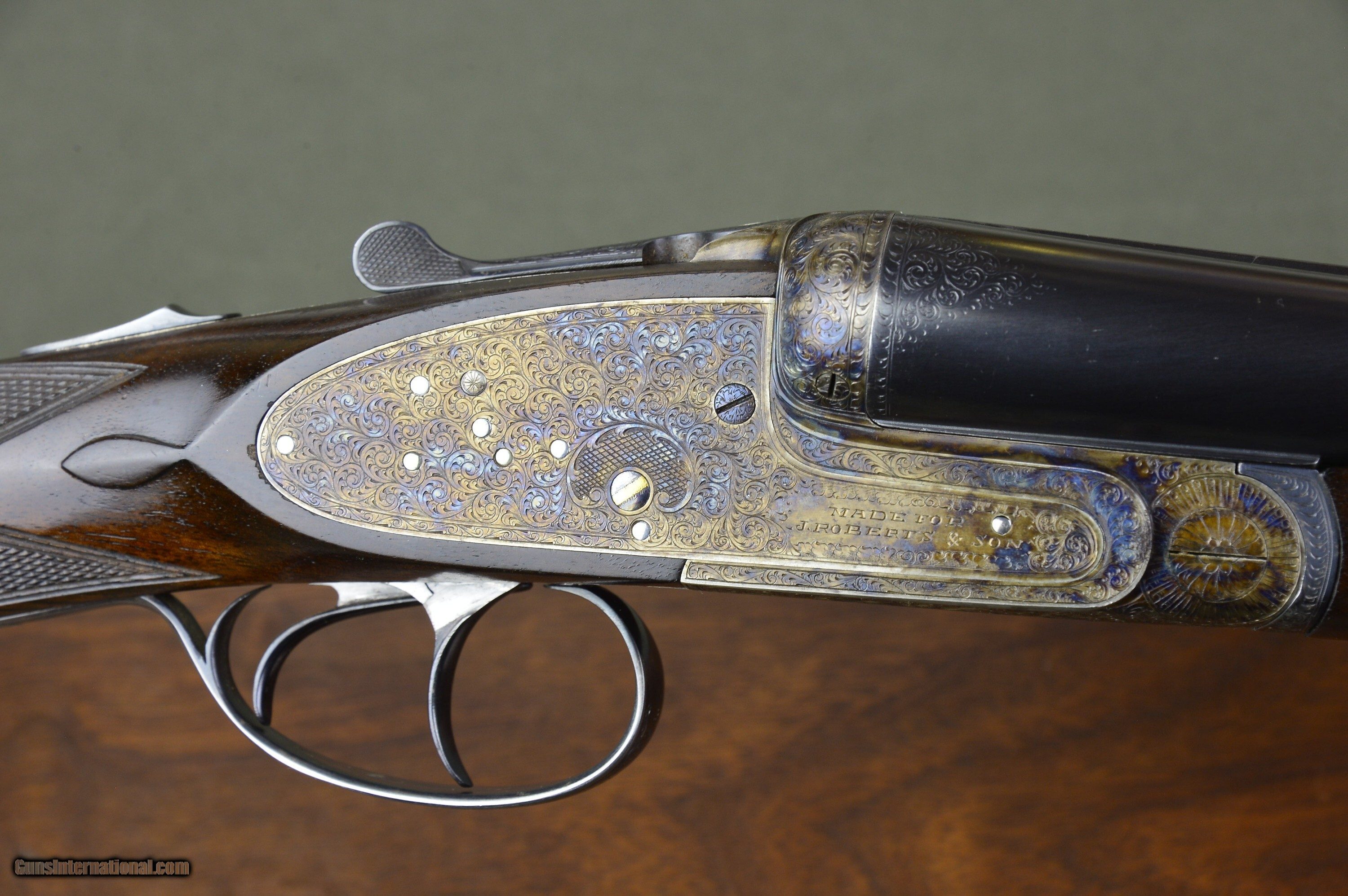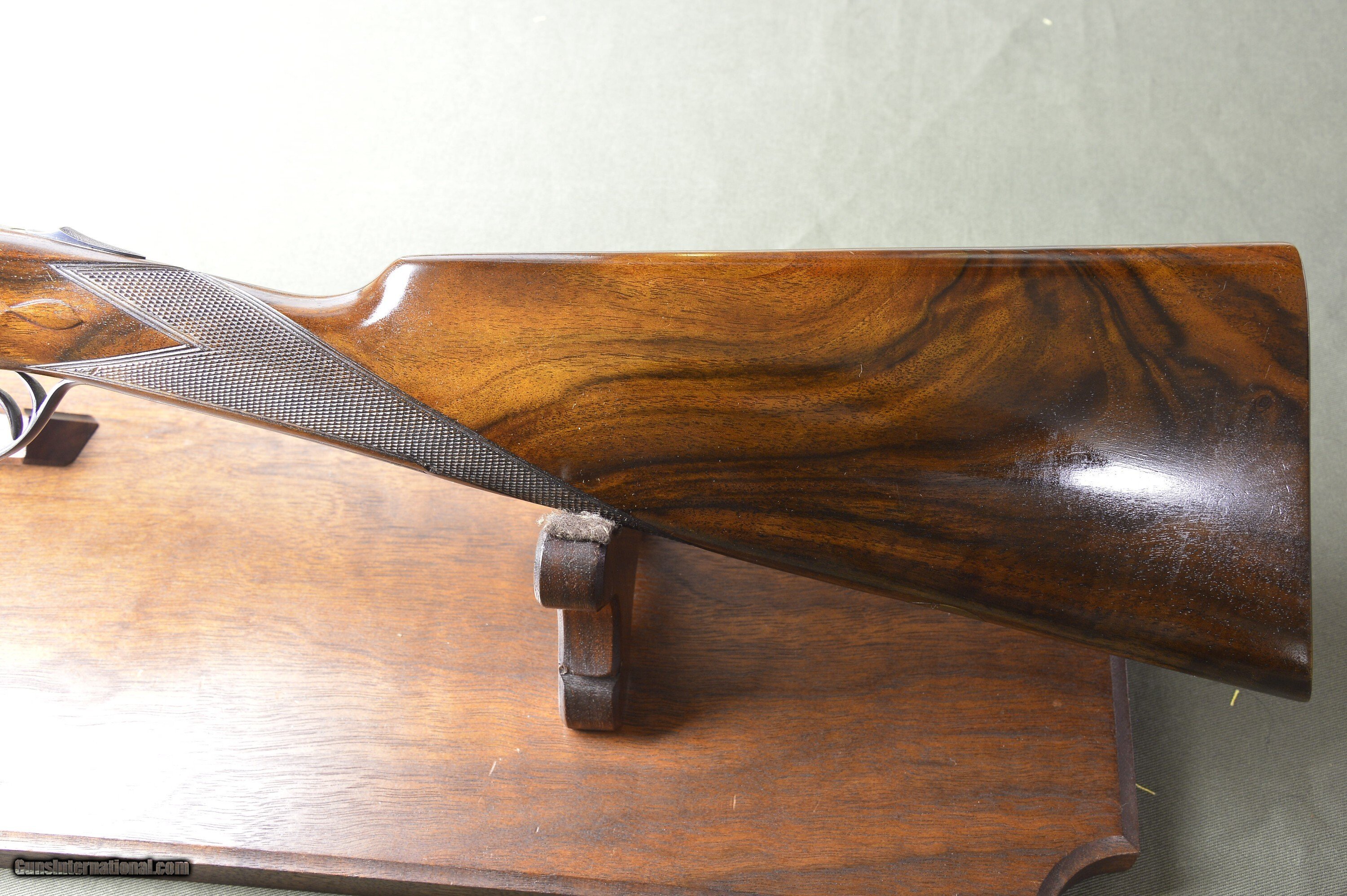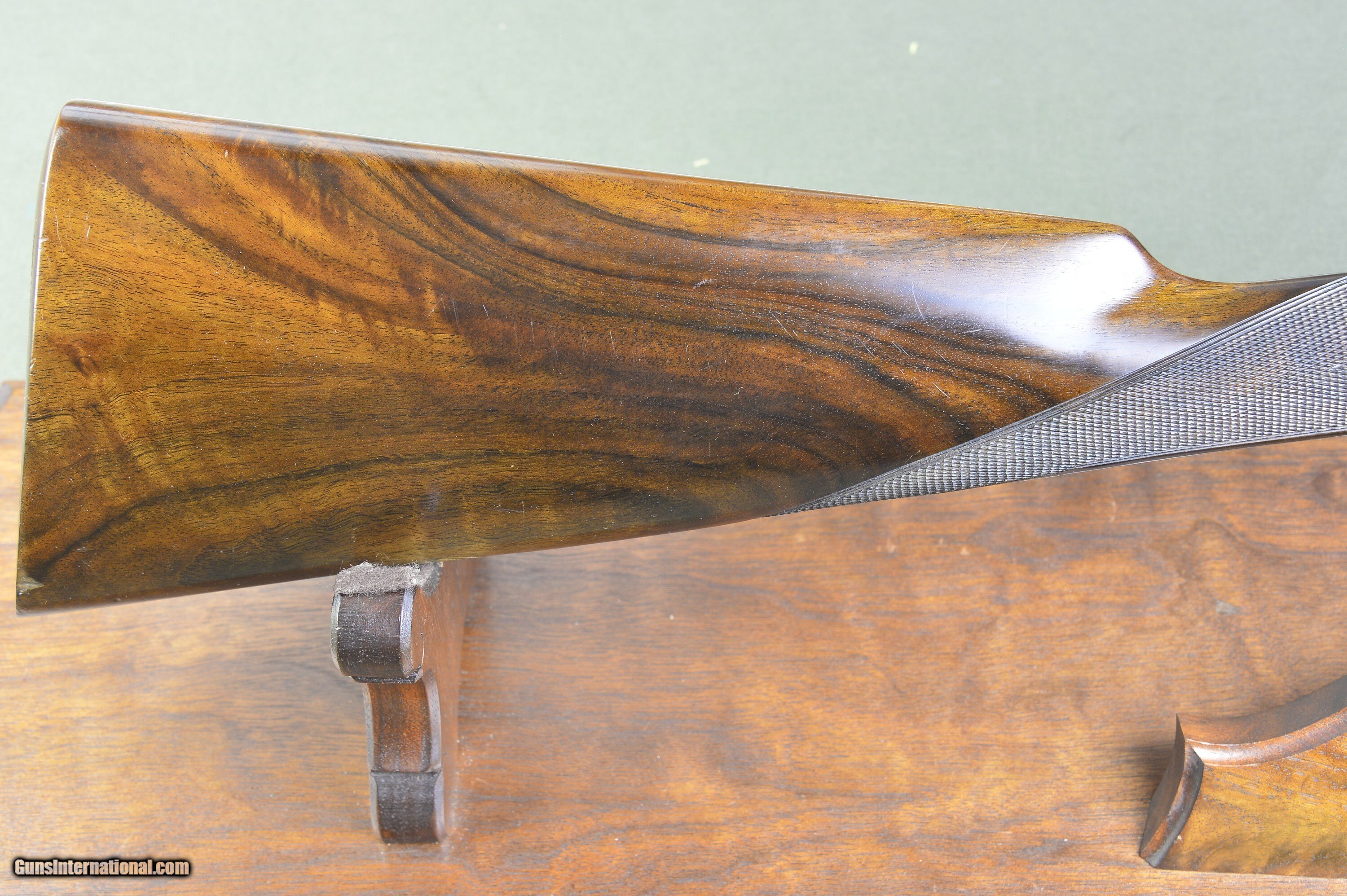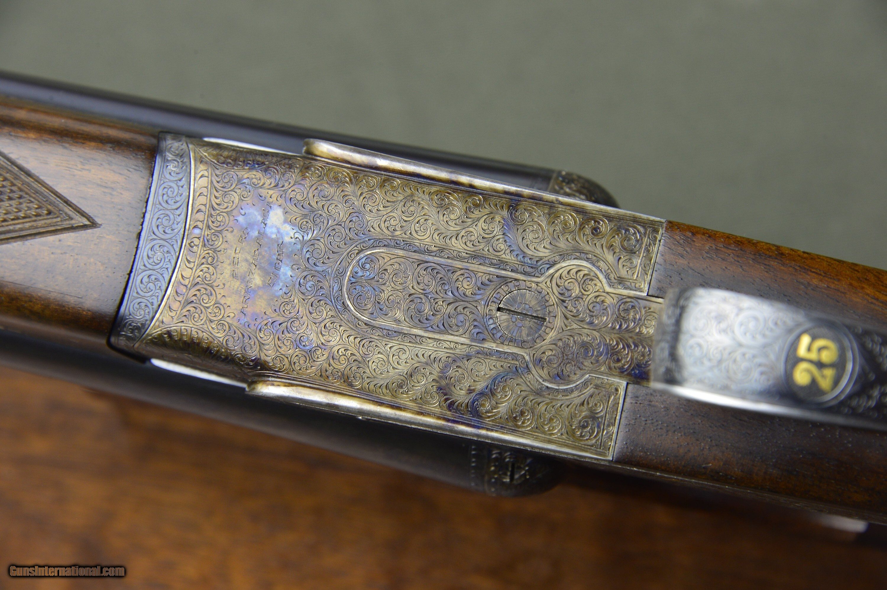 Description: Very handsome, well balanced, and quick handling 12 bore Model 25 sidelock ejector with highly figured European walnut stocks and forearms. Lots of residual case coloring and hand rubbed oil finish on the stock. Wonderful condition 7-pin sidelock with self-opener, disc set strikers, auto safety, rolled edge trigger guard, articulated front trigger, gold lined cocking indicators, automatic selective ejectors, and long length of pull. Easy to swing and carry for a day afield at 6lb 7oz. The 25” steel barrels are chambered for 2-3/4” shotshells and are topped by a thin, tapered hand crosshatched rib. The top of the right barrel is inscribed “Made by Pedro Arrizabalaga in Eibar, Spain”. The top of the left barrel is inscribed “For J. Roberts & Son, King St. London.” The right barrel is bored 0.729 with a constriction of 0.008 for Improved Cylinder choke. The left barrel is also bored 0.729 and has a constriction of 0.015 for Light Modified choke. The straighthand stock and splinter forearm are made of nicely figured European walnut with a handrubbed satin oil finish. Checkering is crisp. There are a few minor handling marks from normal usage. Stock dimensions are 15” to a checkered butt by 1-1/2” by 2” and cast off for the righthand shot. These unique doubles are made by one of Spain’s greatest gunmakers. They are in excellent mechanical condition. Long length of pull and great handling. The barrels and the stock of both guns show some minor scratches and wear from normal usage. An excellent buy for the experienced upland gunner who appreciates the quick handling of short-barreled doubles. “Horses for courses.” Please note that the photographs are part of the description. I am an FFL and require a copy of your dealer’s FFL license. Not for sale where prohibited by state or local laws. Buyer is responsible for all shipping, insurance, and any other related charges. I give a 3-day non-firing inspection period which begins when it arrives at the buyer’s FFL or specified address if the gun is classified as an Antique. Returns at buyer’s expense. Price: $4,995.00 Contact Seller |