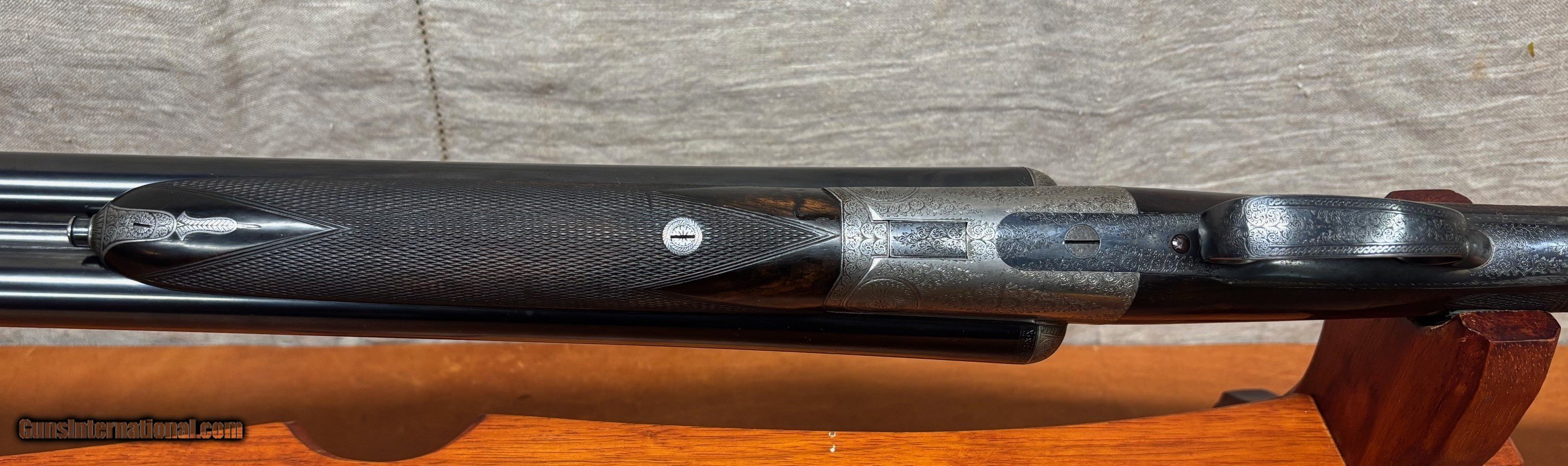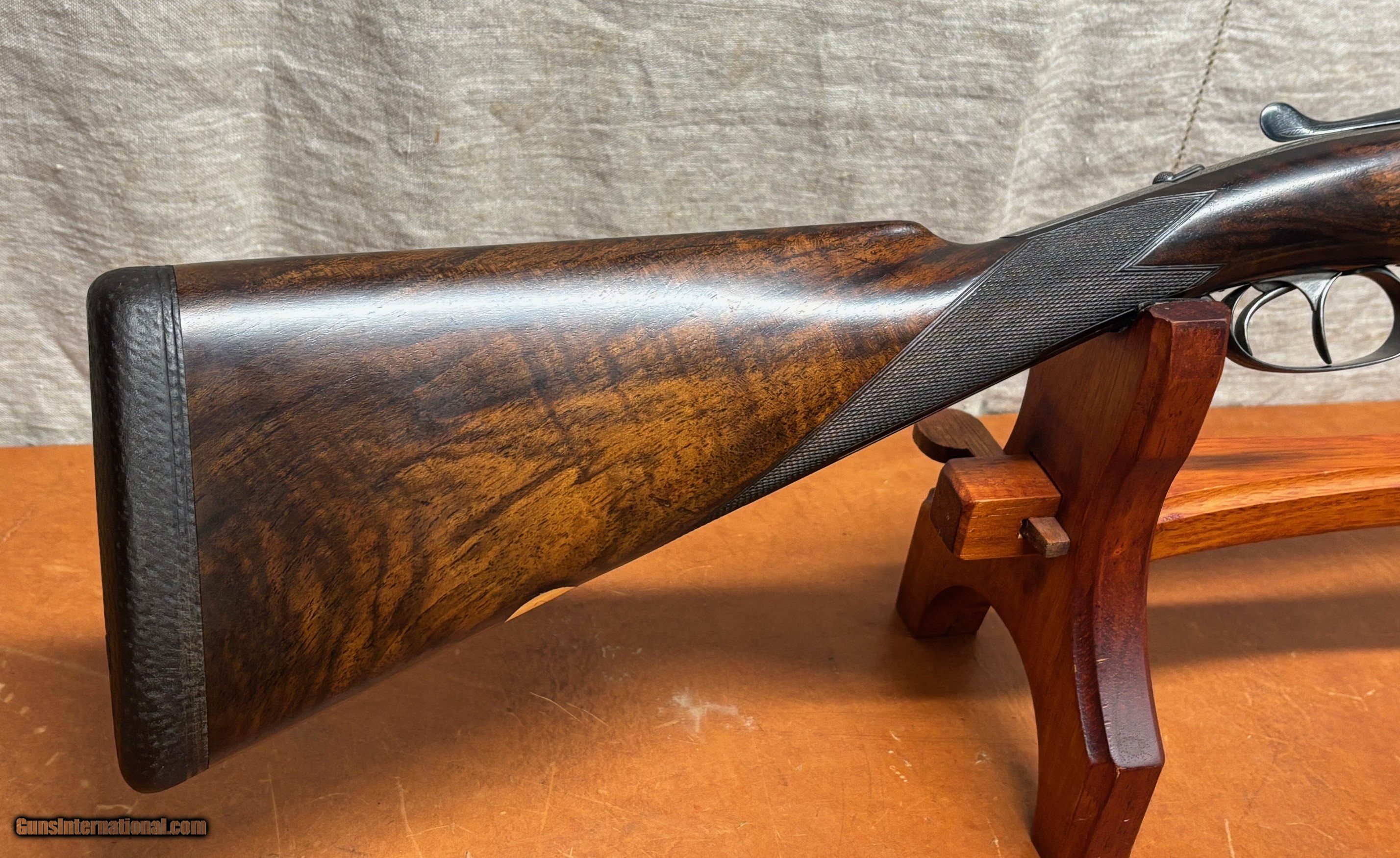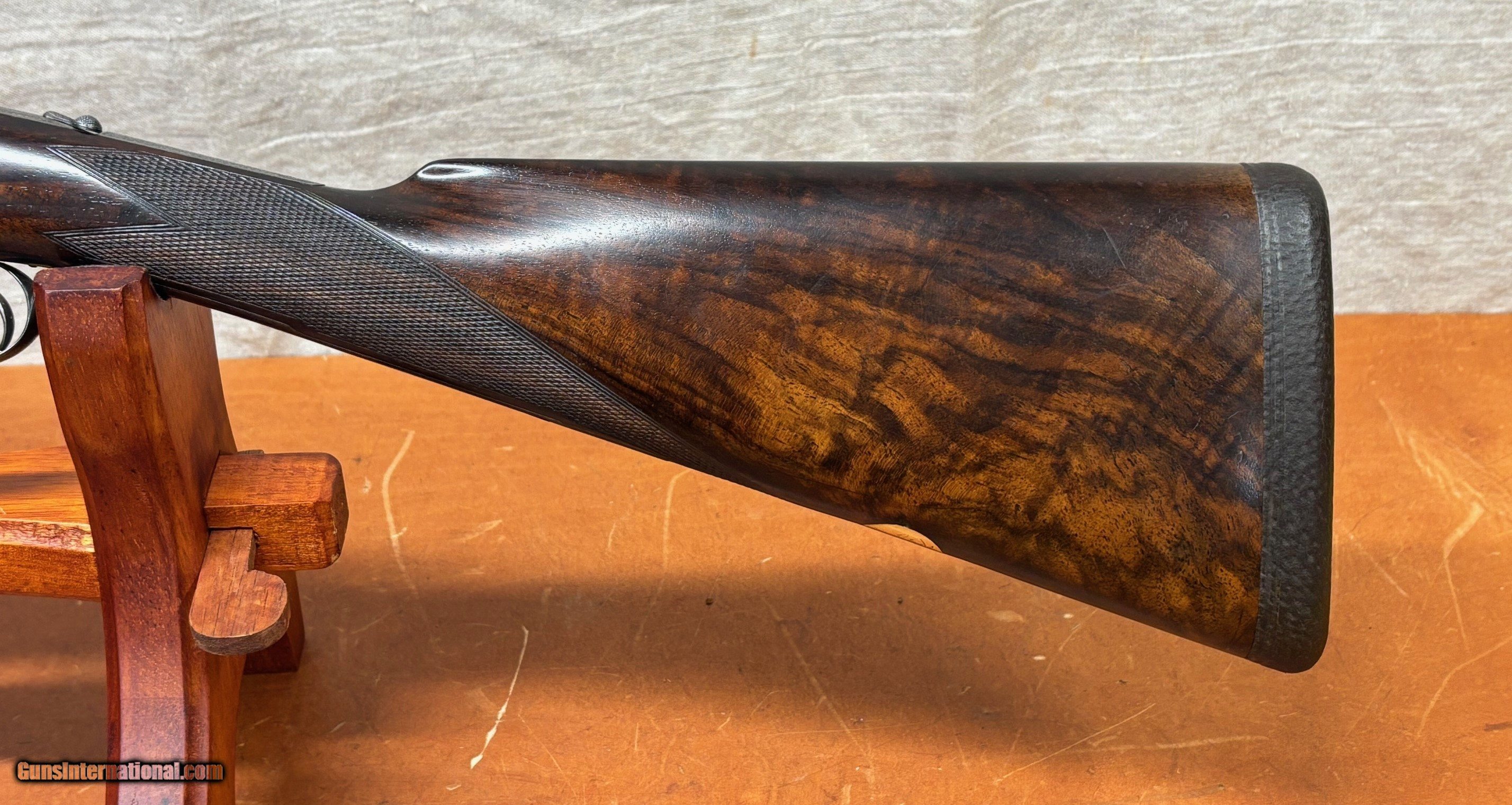 Description: This is a great example of the other Scottish trigger plate manufacturer. Technically, MacNaughton was the pioneer in the trigger plate action arena. Having apprenticed at John Dickson, you can see the influences in the 2 designs. This shotgun features long, elegant lines with a couple uniquely MacNaughton features like the swing lever safety, unrestricted ejectors and long upper tang. The barrel has the inscription "James MacNaughton 26 Hanover Street Edinburgh & Perth". The barrels, water table, and top lever all are adorned by the number 2 which says this gun was part of a matched pair at one time. From a practical standpoint, the gun has amazing balance on the swing and also has some very useful chokes for Amercian wingshooting. Comes with a very nice substantial oak/leather case with cleaning rod and and tools. Shotgun Gauge: 12 Gauge Manufacturer: James MacNaughton Model: Round Action/Trigger Plate Serial Number: 2552 Barrel Length: 28 Bore Info: .729/.729 Chambers: 2 1/2 Ejectors: Yes Condition: Excellent Metal Condition: Excellent Wood Condition: Excellent Bore Condition: Excellent Barrels: Fluid Steel Action: Break Triggers: Double Stock: Straight Stock Comb: 1 1/2 Stock Heel: 2 1/16 Stock Cast: Off Fore End: Splinter Butt Pad: Leather LOP: 14 7/16 Rib: Concave Weight: 6/9 Sights: Metal Bead Manufacture Date: 1901 Chokes: Mod/IC Choke Left: .022 Choke Right: .007 Proof:Nitro: Yes Minimum Wall Thickness Left: .030 Minimum Wall Thickness Right: .030 Price: $11,500.00 Contact Seller |