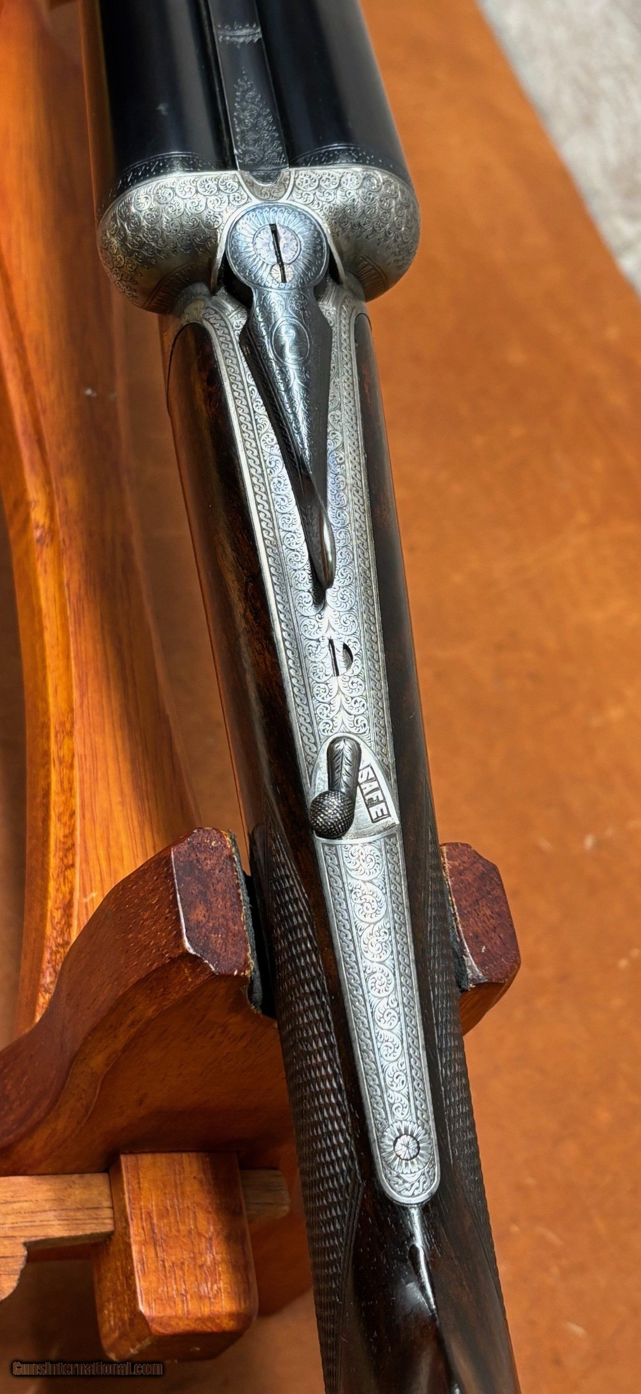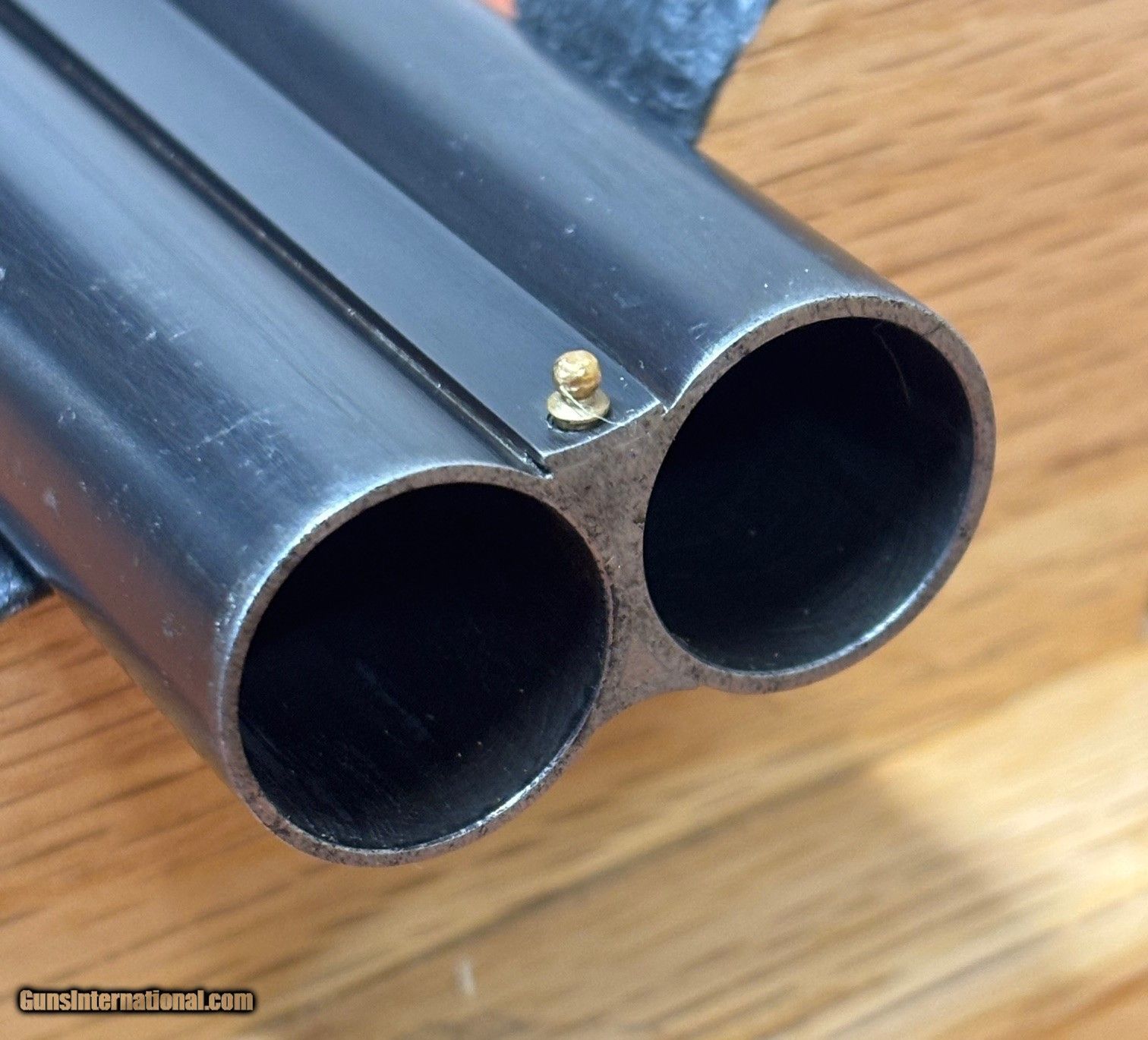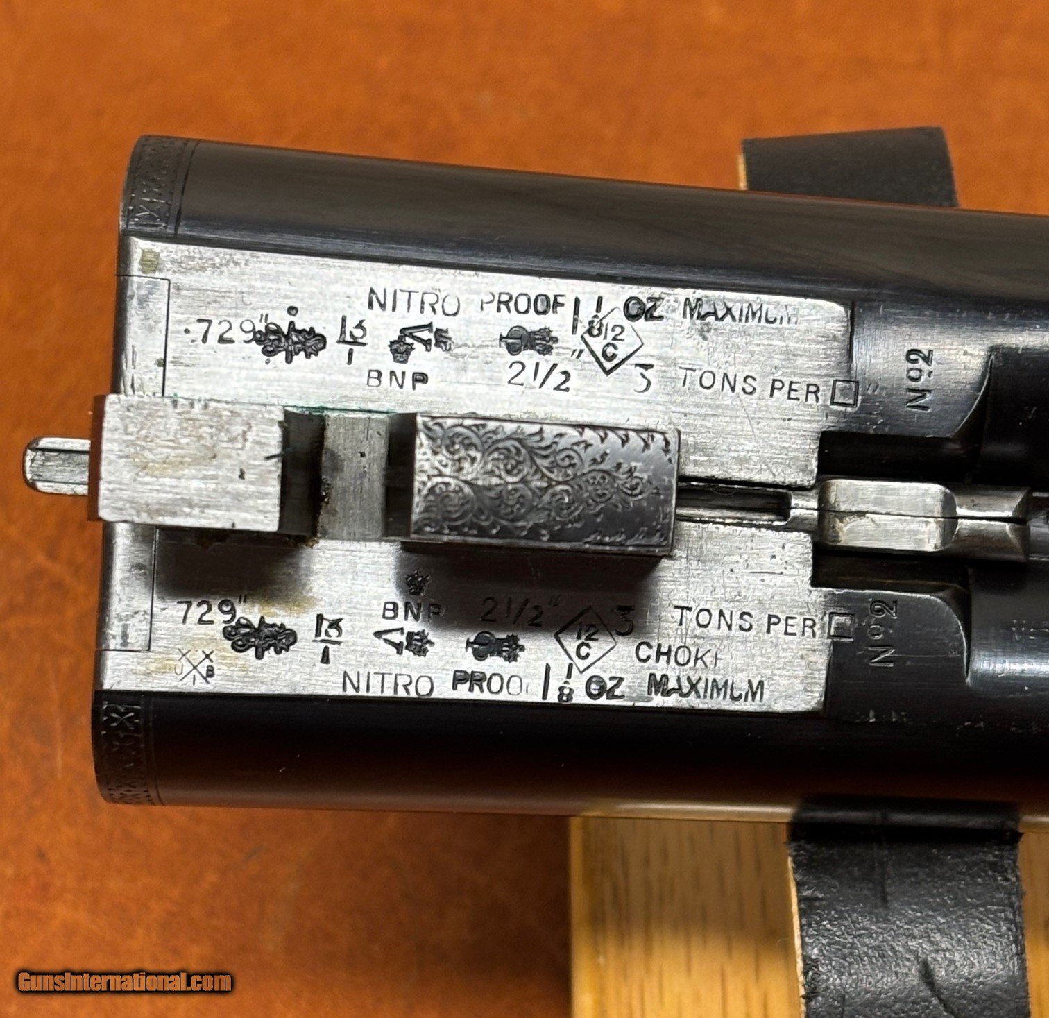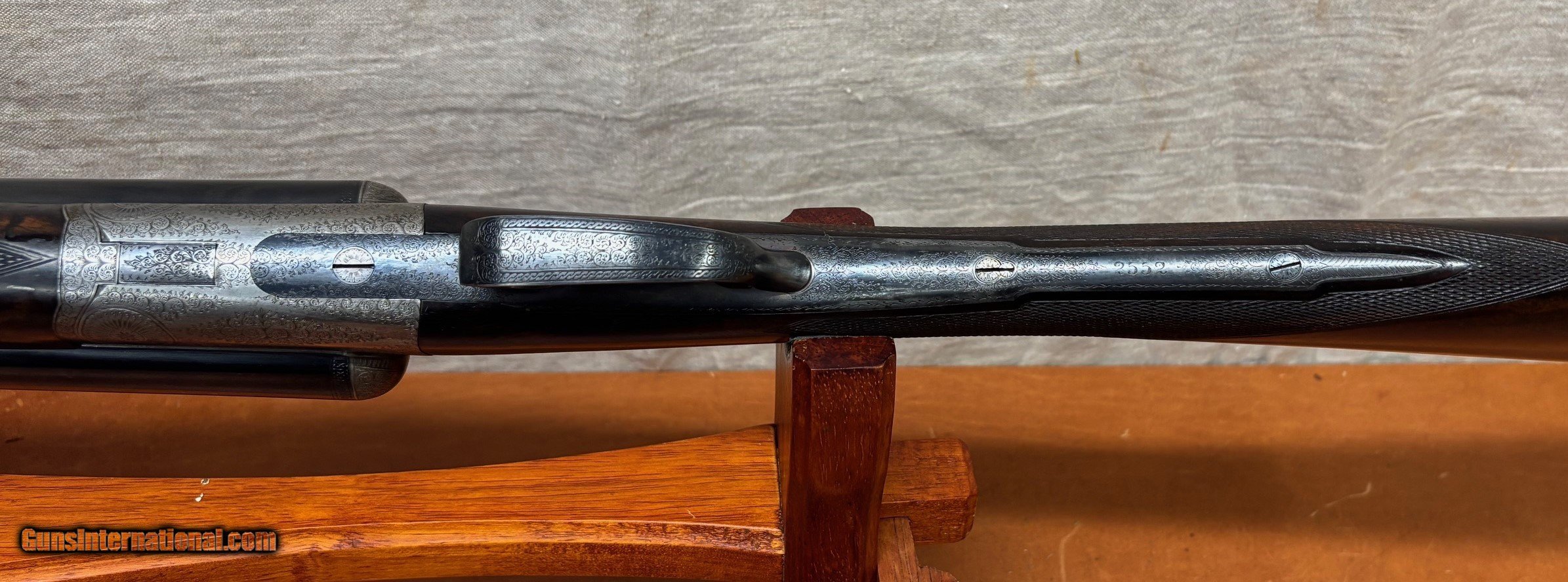 Description: This is a great example of the other Scottish trigger plate manufacturer. Technically, MacNaughton was the pioneer in the trigger plate action arena. Having apprenticed at John Dickson, you can see the influences in the 2 designs. This shotgun features long, elegant lines with a couple uniquely MacNaughton features like the swing lever safety, unrestricted ejectors and long upper tang. The barrel has the inscription "James MacNaughton 26 Hanover Street Edinburgh & Perth". The barrels, water table, and top lever all are adorned by the number 2 which says this gun was part of a matched pair at one time. From a practical standpoint, the gun has amazing balance on the swing and also has some very useful chokes for Amercian wingshooting. Comes with a very nice substantial oak/leather case with cleaning rod and and tools. Shotgun Gauge: 12 Gauge Manufacturer: James MacNaughton Model: Round Action/Trigger Plate Serial Number: 2552 Barrel Length: 28 Bore Info: .729/.729 Chambers: 2 1/2 Ejectors: Yes Condition: Excellent Metal Condition: Excellent Wood Condition: Excellent Bore Condition: Excellent Barrels: Fluid Steel Action: Break Triggers: Double Stock: Straight Stock Comb: 1 1/2 Stock Heel: 2 1/16 Stock Cast: Off Fore End: Splinter Butt Pad: Leather LOP: 14 7/16 Rib: Concave Weight: 6/9 Sights: Metal Bead Manufacture Date: 1901 Chokes: Mod/IC Choke Left: .022 Choke Right: .007 Proof:Nitro: Yes Minimum Wall Thickness Left: .030 Minimum Wall Thickness Right: .030 Price: $11,500.00 Contact Seller |