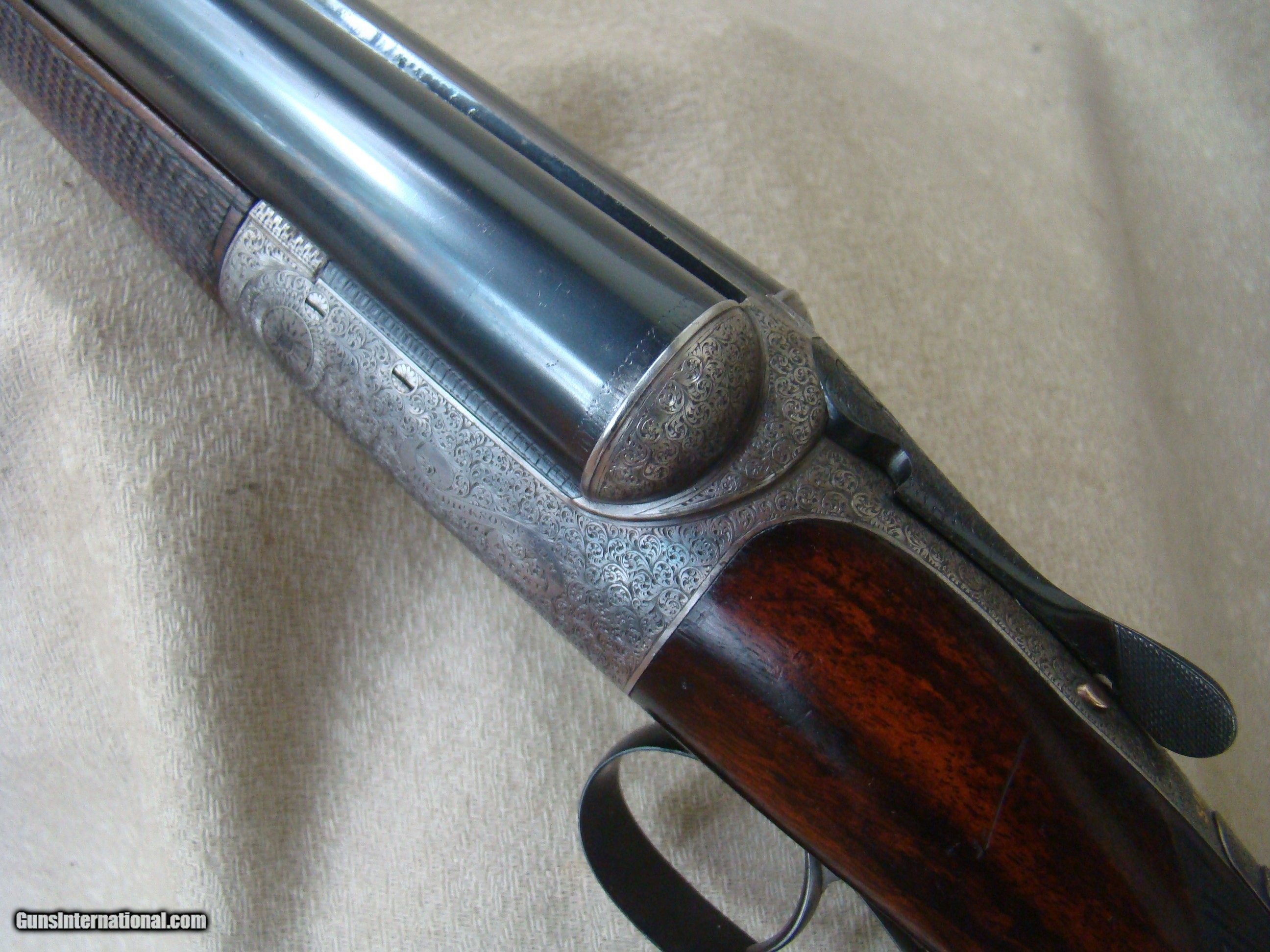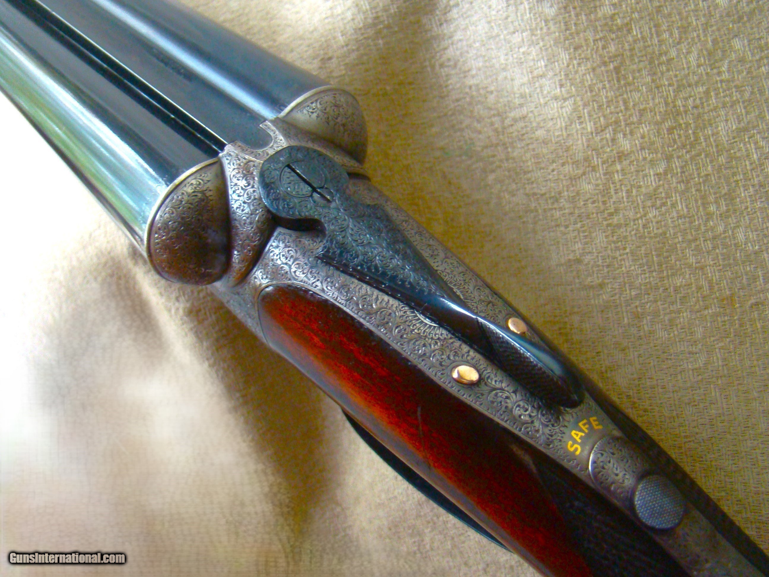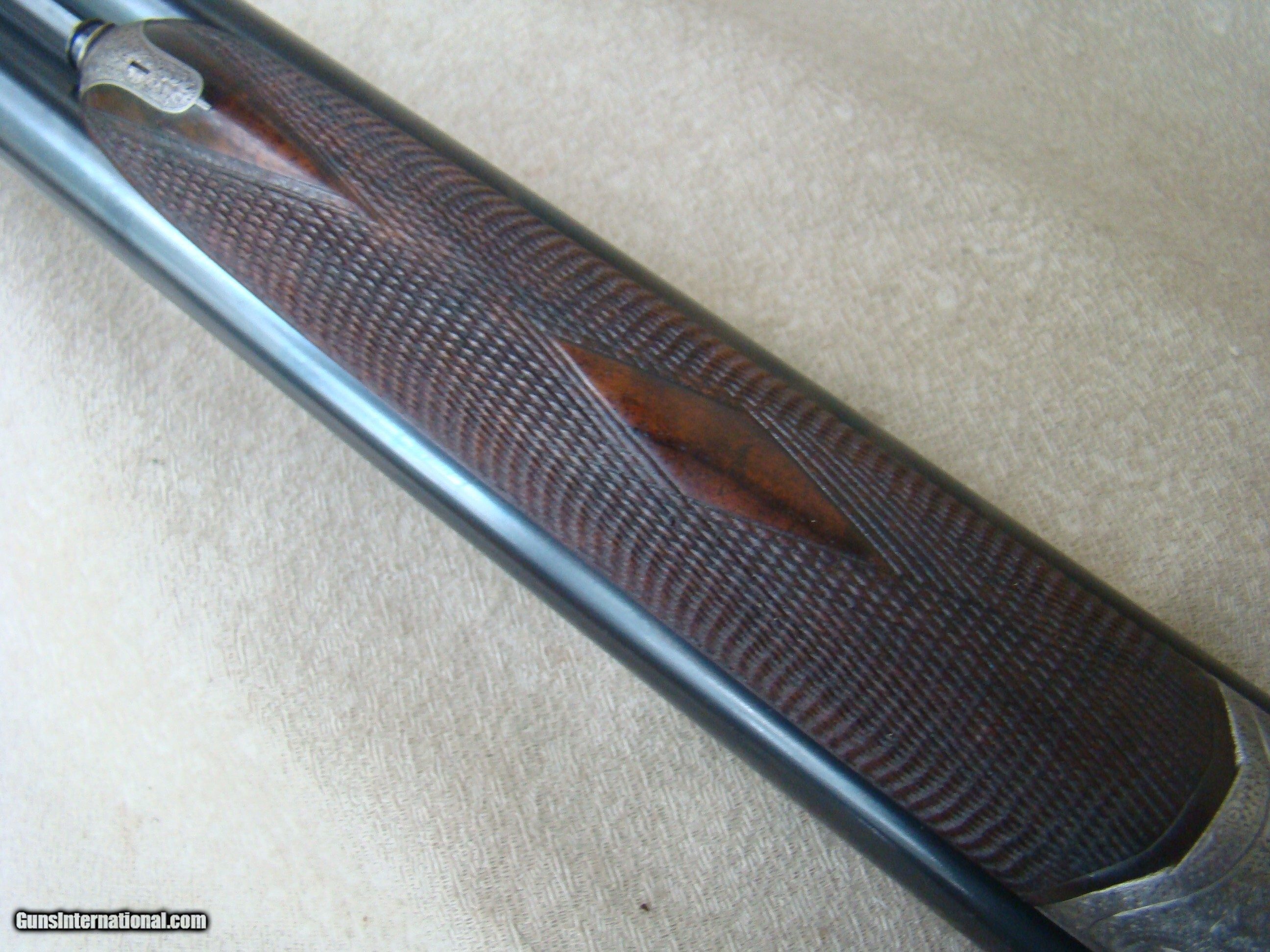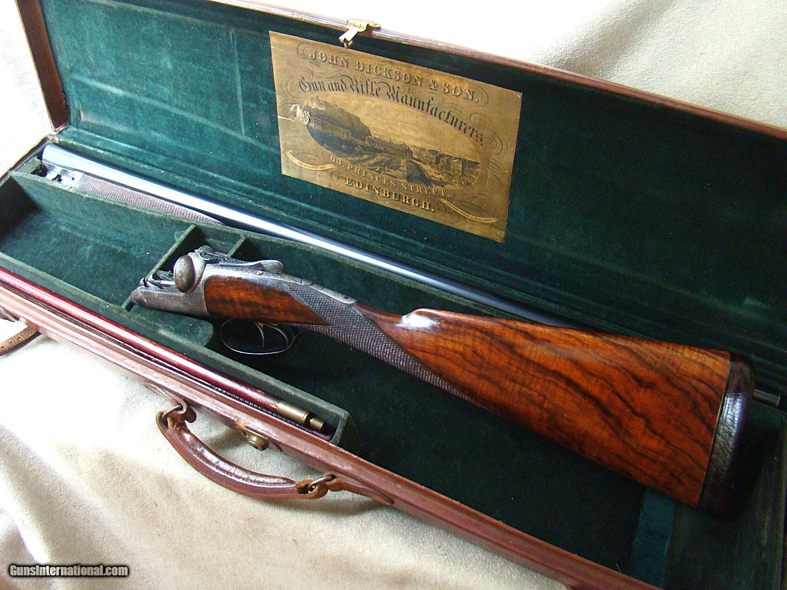 Description: John Dickson 12 ga., 29" nitro proof steel barrels, game rib, choked open improved and improved cylinder (.004/.009), 2-1/2" chambers. A very nice example from Scotland's celebrated original Best. Auto ejectors, double triggers, auto safe. The action retains a pleasing blush of case color and remains extremely crisp, detailing the finest scroll and "John Dickson & Son Patent" in a flowing banner. Barrels are inscribed with the 63 Princes Street Edinburgh address. This round action features the desirable raised gold cocking indicators on the broad top strap flanking the opening lever. Highly figured straight hand stock of wonderful true French walnut shows streaming black bold ribbons against an amber background flowing towards the toe. Measures 1-3/8", comb 2" heel, 14-5/8" over a 3/4" mahogany color leather pad. Overall in lovely condition with a few handling marks. True lightweight at 6 lbs, 5oz. This circa 1895 beauty can be sold direct. Leather case lined in green velvet with Maker's label. A true highland treasure. Price: $18,500.00 Contact Seller |