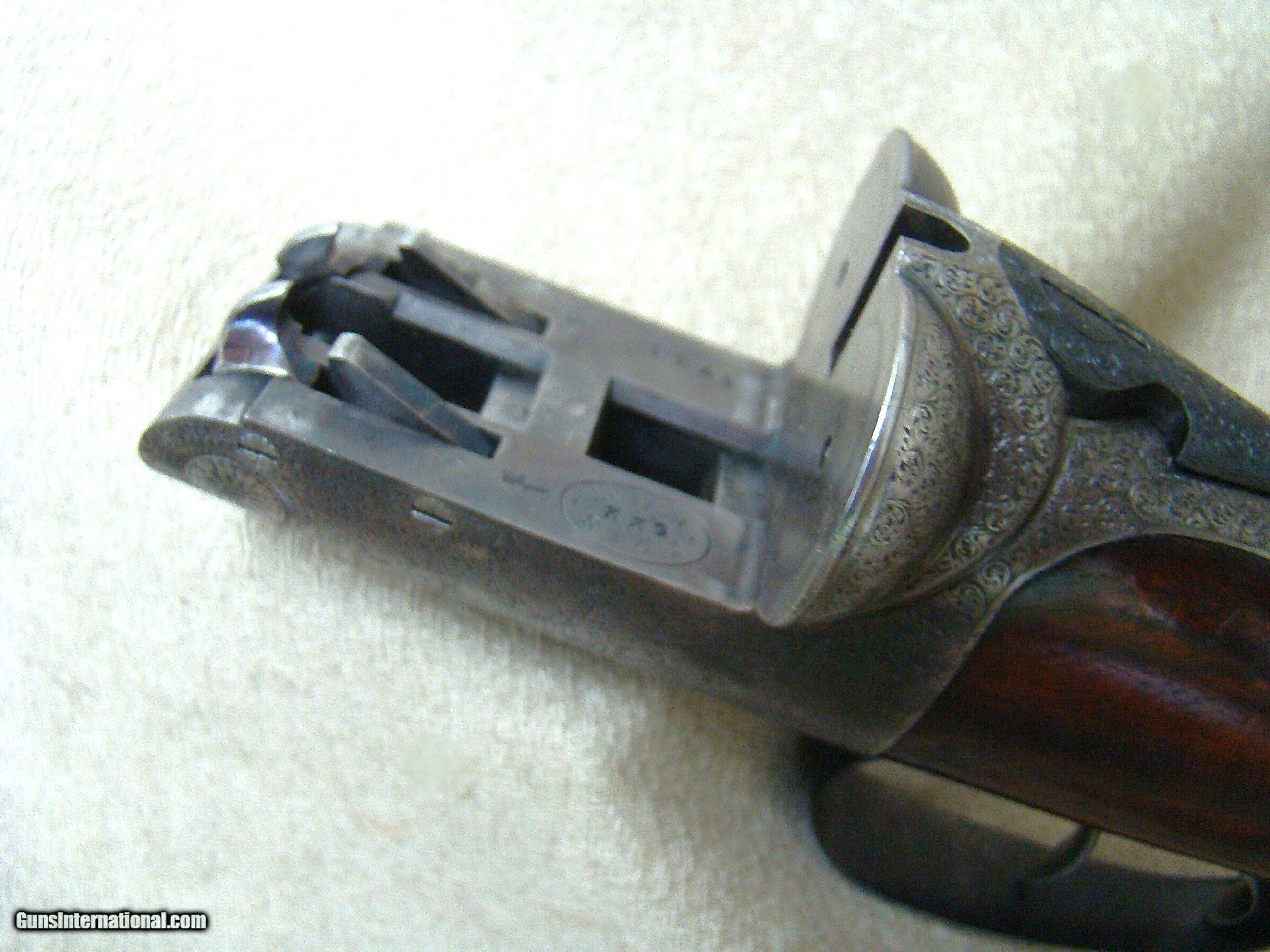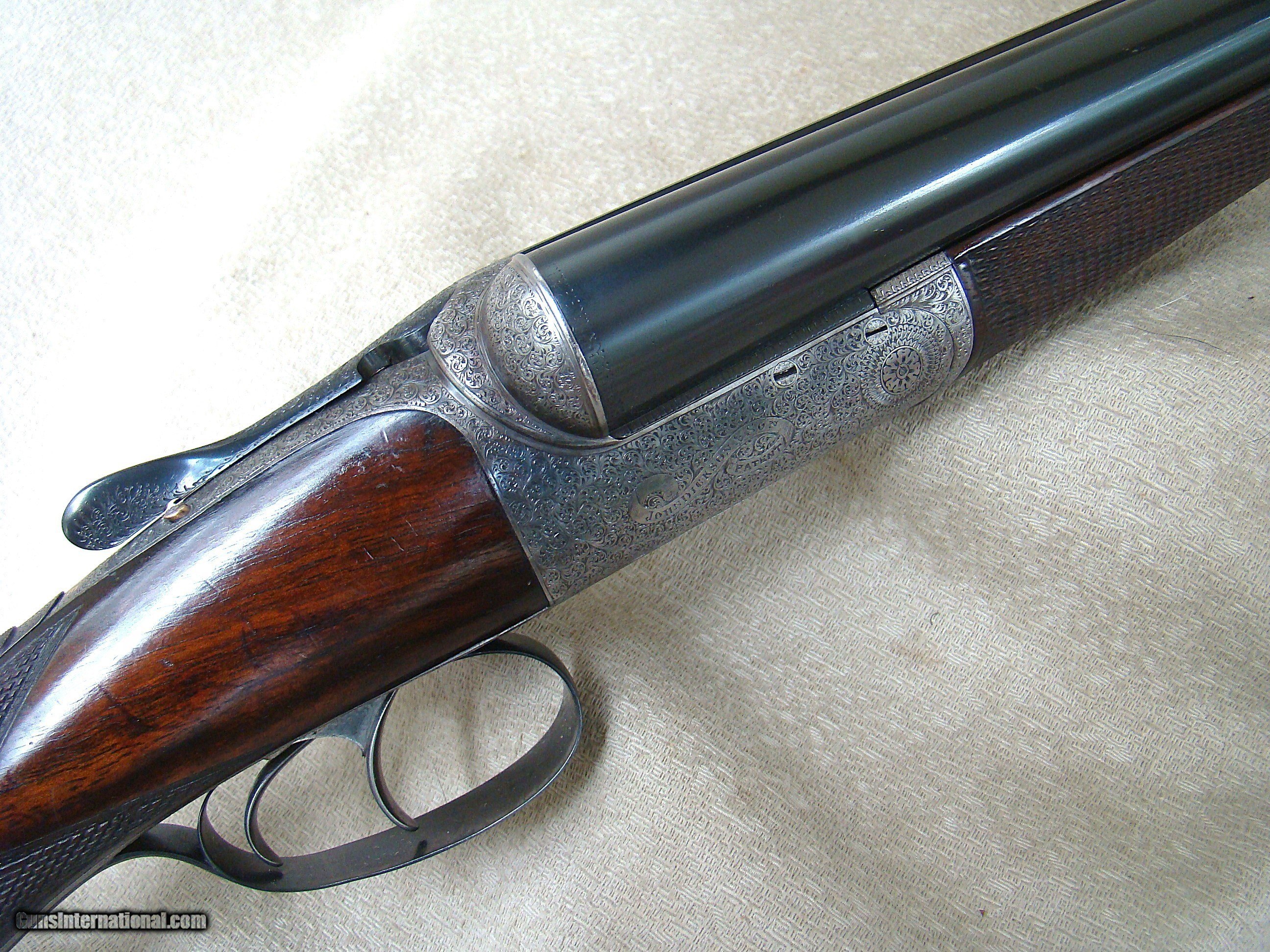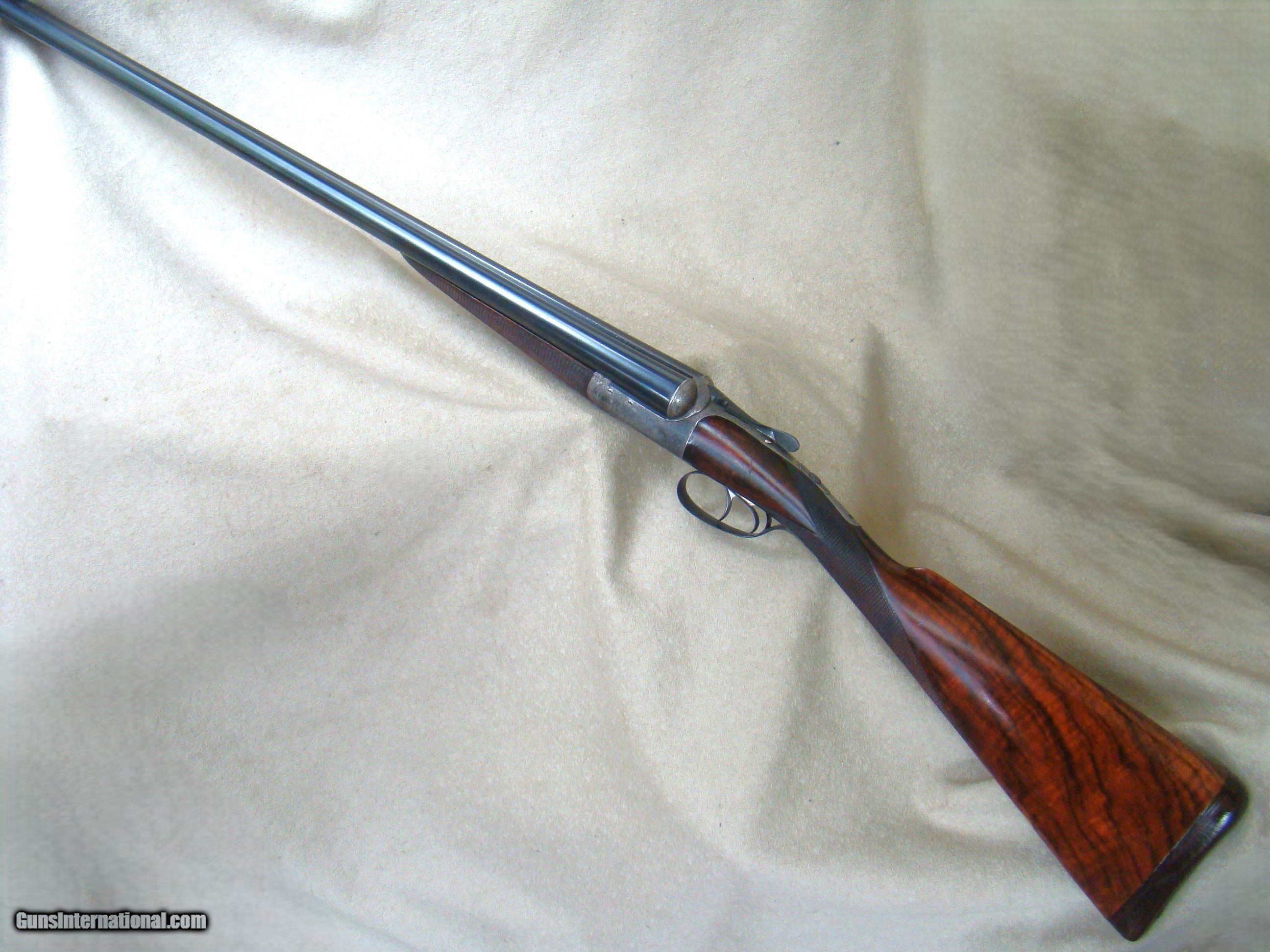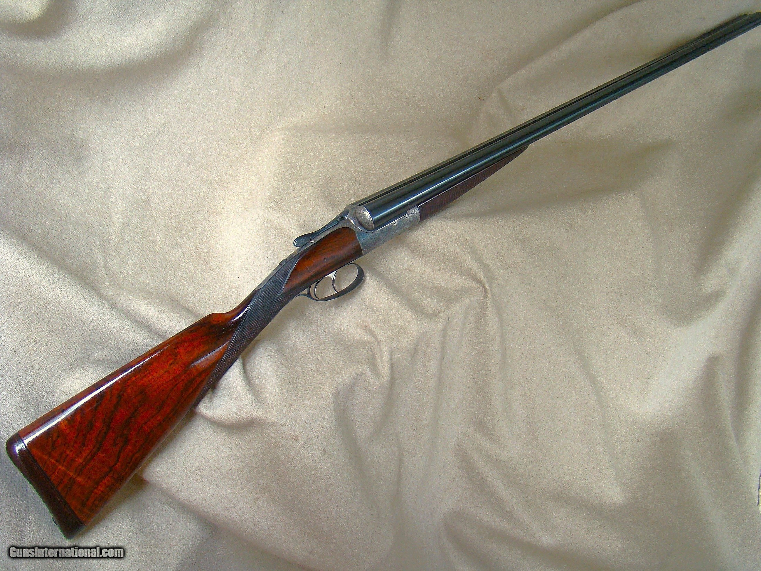 Description: John Dickson 12 ga., 29" nitro proof steel barrels, game rib, choked open improved and improved cylinder (.004/.009), 2-1/2" chambers. A very nice example from Scotland's celebrated original Best. Auto ejectors, double triggers, auto safe. The action retains a pleasing blush of case color and remains extremely crisp, detailing the finest scroll and "John Dickson & Son Patent" in a flowing banner. Barrels are inscribed with the 63 Princes Street Edinburgh address. This round action features the desirable raised gold cocking indicators on the broad top strap flanking the opening lever. Highly figured straight hand stock of wonderful true French walnut shows streaming black bold ribbons against an amber background flowing towards the toe. Measures 1-3/8", comb 2" heel, 14-5/8" over a 3/4" mahogany color leather pad. Overall in lovely condition with a few handling marks. True lightweight at 6 lbs, 5oz. This circa 1895 beauty can be sold direct. Leather case lined in green velvet with Maker's label. A true highland treasure. Price: $18,500.00 Contact Seller |