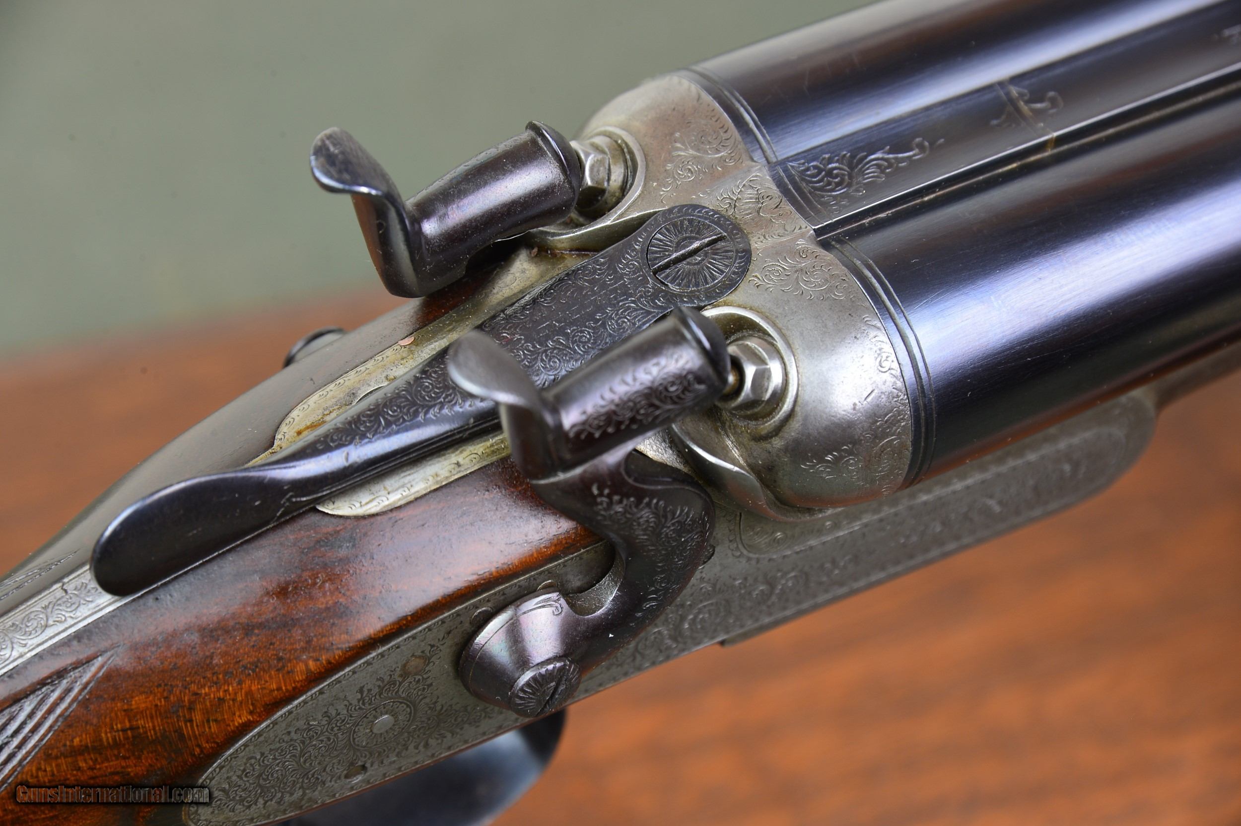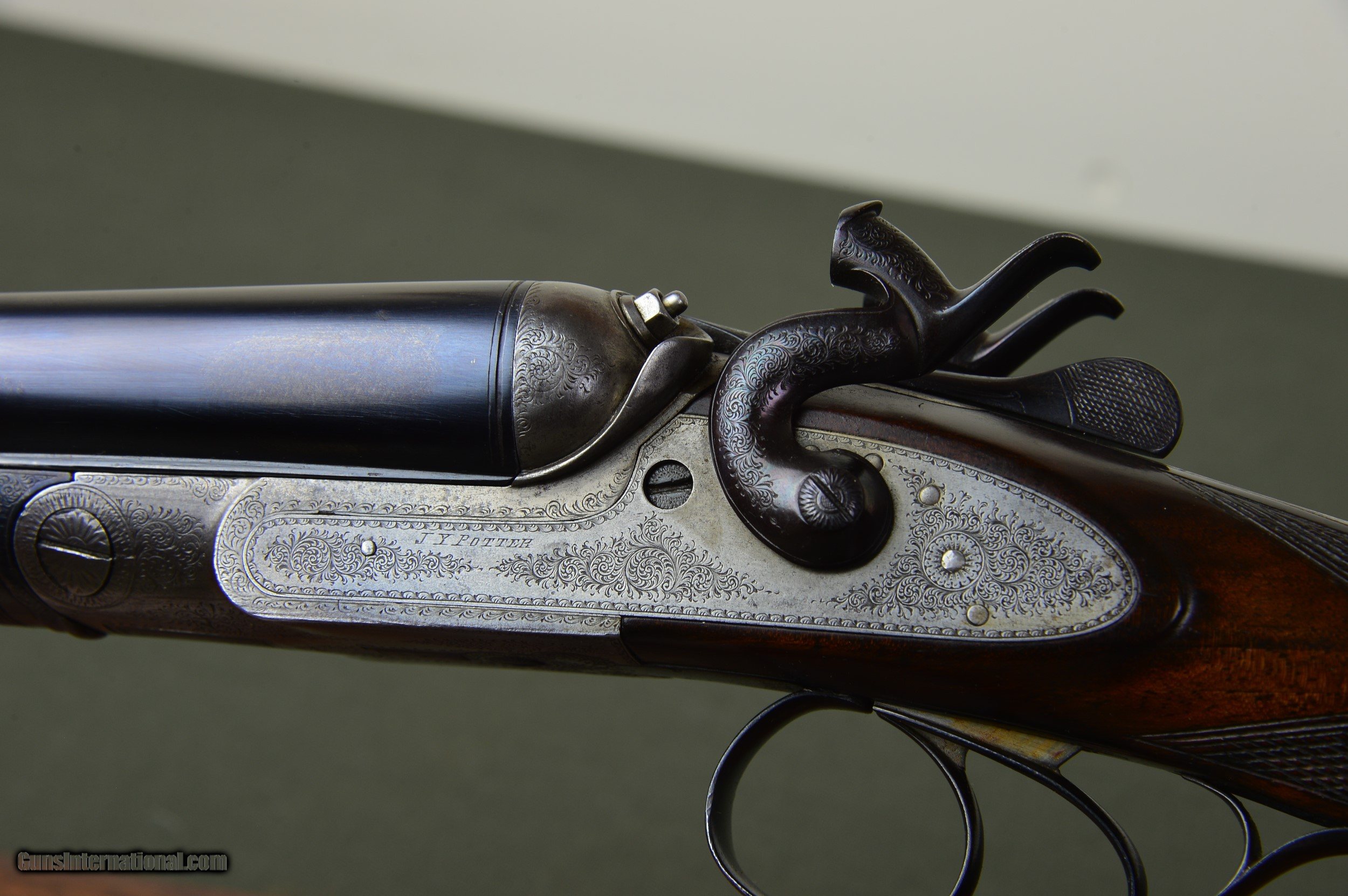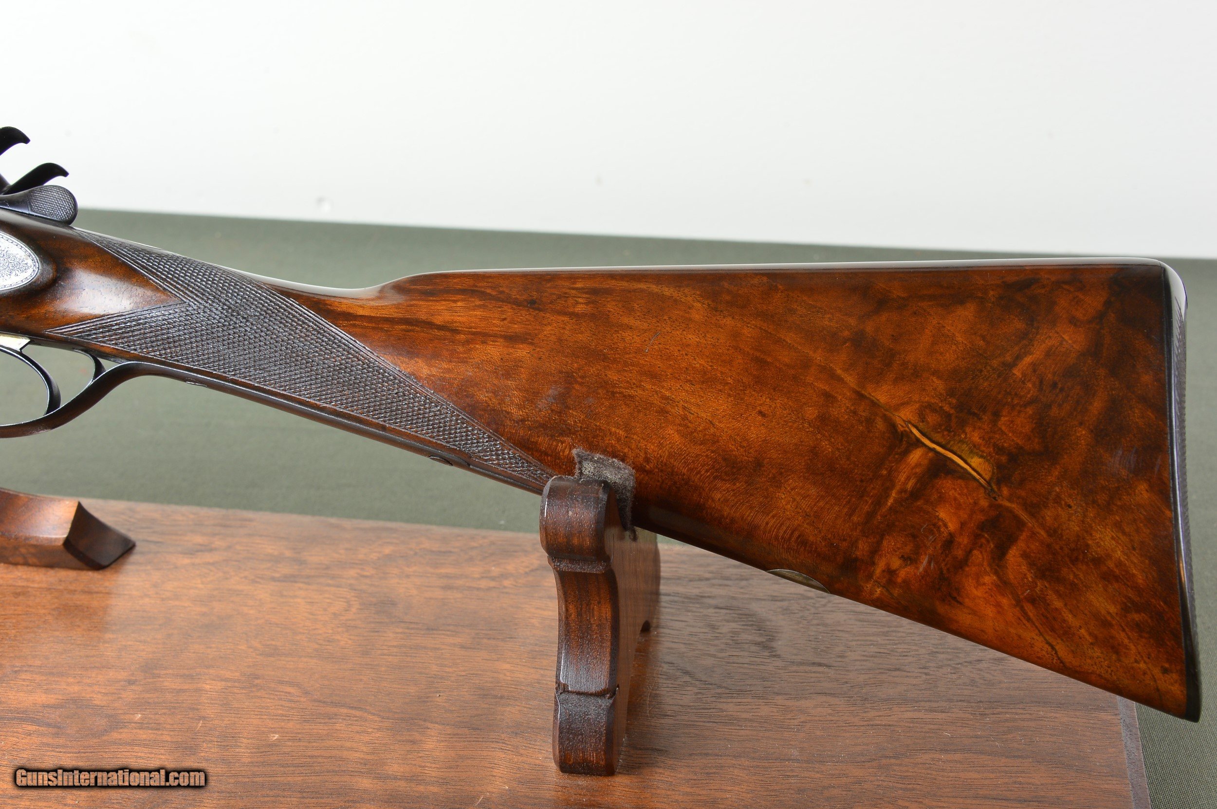 Description: *** REDUCED *** Handsome and great handling John Potter 12 bore hammergun with highly figured English walnut stock and sharp engraving set up for the upland gunner with open chokes. The gun, number 684, was manufactured sometime in the period 1875 - 1887 and is in good mechanical and cosmetic condition. It has graceful percussion style fences and weighs 6lb 13oz. The frame is nicely engraved and the barrels and trigger guard have recently been reblacked. *** The gun was rebarreled some time in the period 1925 - 1954 by A. Hill & Son. They are chambered for 2-1/2" shotshells. The barrels are topped by a raised solid concave game style rib. The rib is inscribed "Barrels by A. Hill & Son Horncastle". The right barrel is bored 0.726 and has a constriction of 0.003 for Skeet choke. Minimum wall thickness is 0.034. The left barrel is bored 0.727 and also has a constriction of 0.003 for Skeet choke. Minimum wall thickness is 0.036. Nitro proofed to 1-1/8 oz shot. What a great gun to take afield for upland game like quail, grouse, and woodcock ! *** Nicely figured straight grip stock and splinter forearm. Excellent wood finish with crisp checkering. Stock dimensions are 14-1/4" over a thin butt plate by 1-1/2" by 2-1/4". Neutral cast. There is professionally repaired surface scratch on the left side of the stock. *** Wood and metal finishes have been professionally redone. There is some pitting on the breed face typical of guns of this era and the trigger guard shows engraving wear on the tang where the hand grips the wrist of the gun. *** Imagine walking up to pointed upland game with a great handling hammergun! Attractively priced. *** Buyer is responsible for all shipping, insurance, and other related fees. I give a three-day inspection and will only accept the time in return if not as described in the listing. SOLD Antique: Yes |