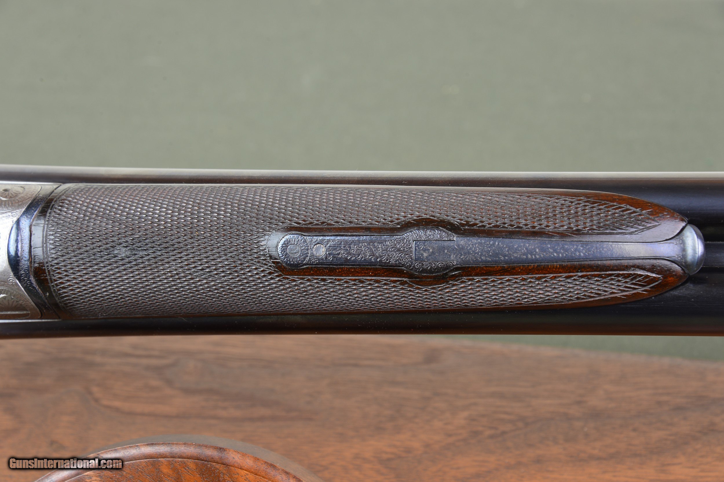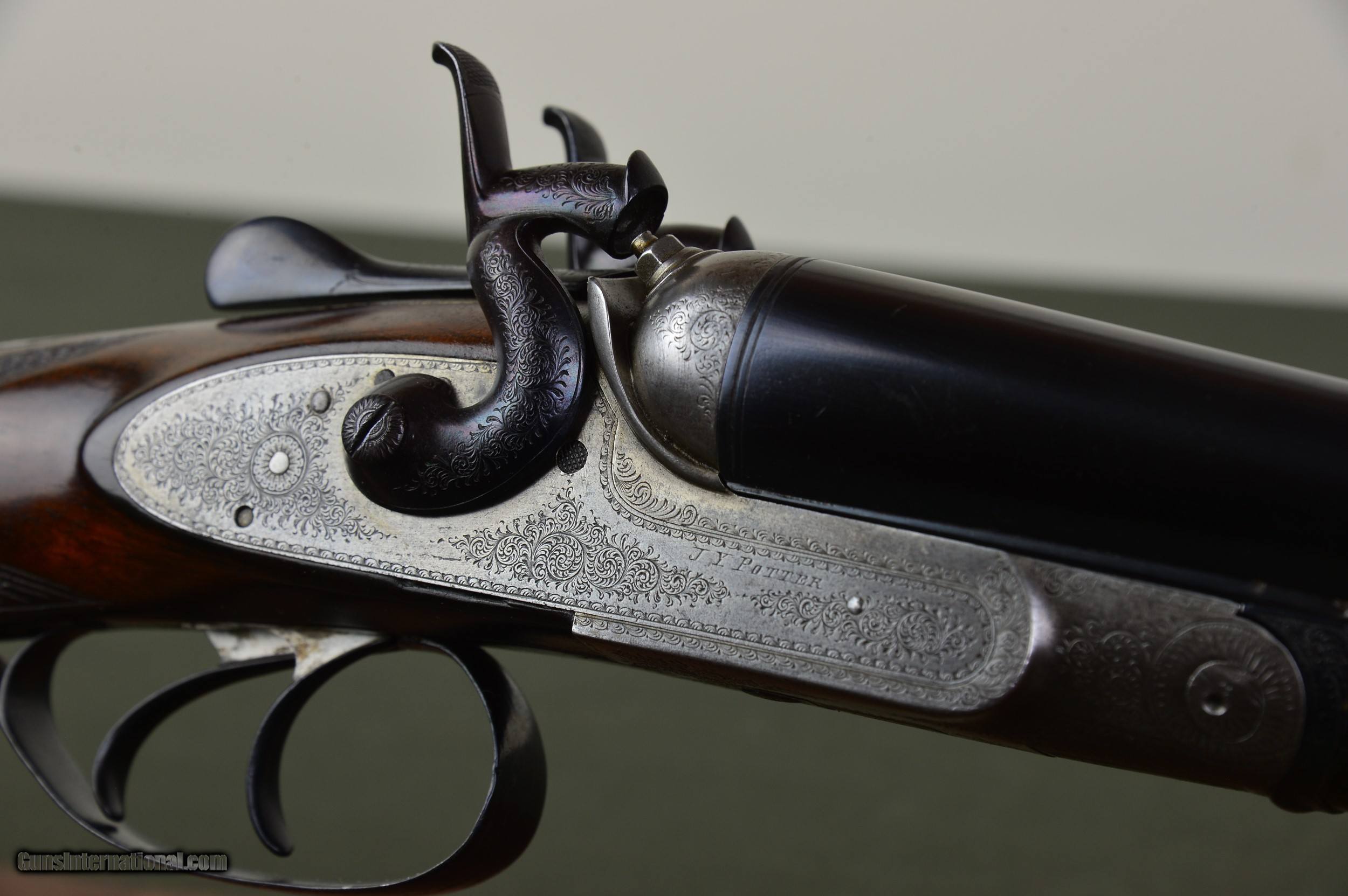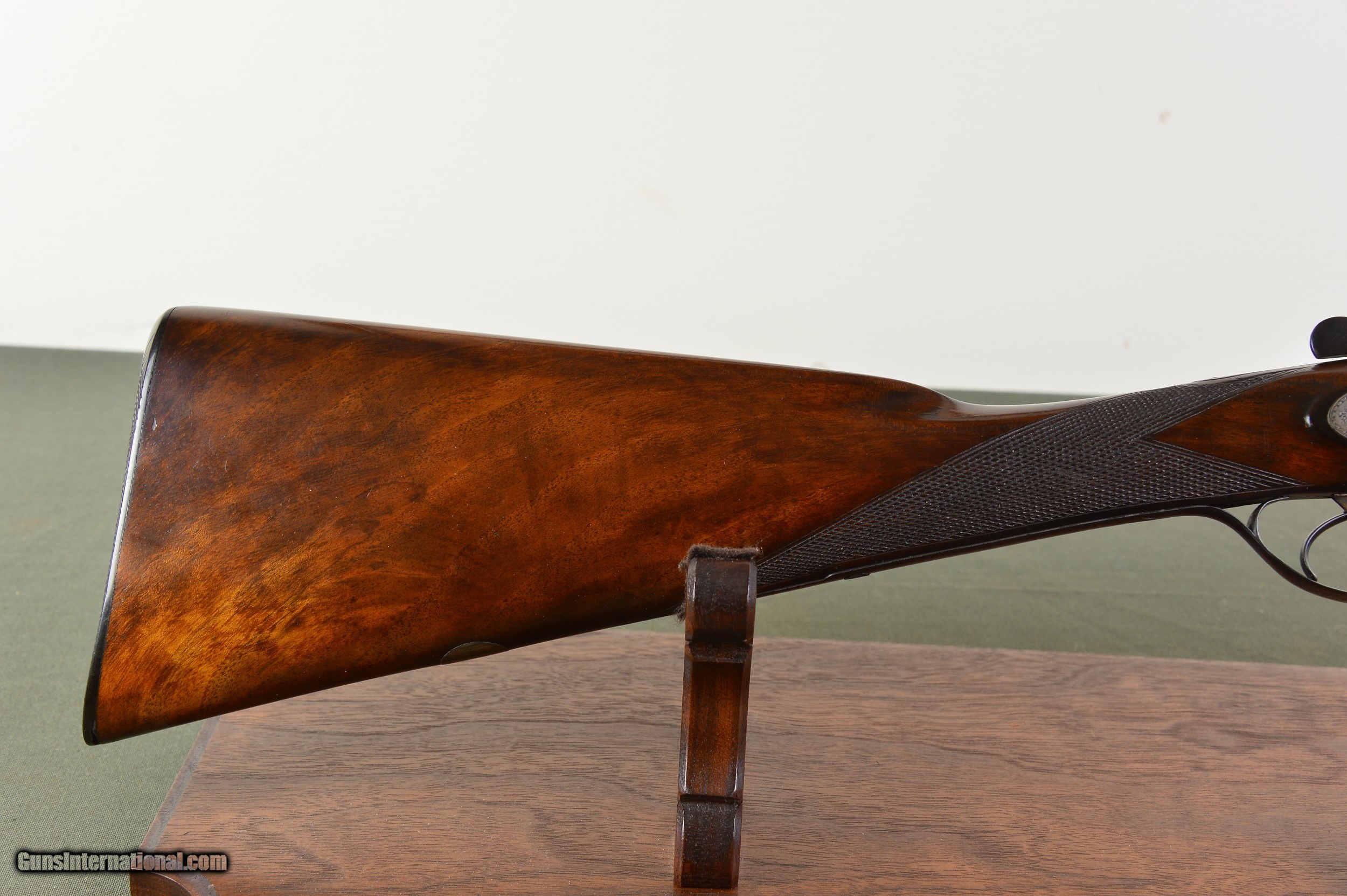 Description: *** REDUCED *** Handsome and great handling John Potter 12 bore hammergun with highly figured English walnut stock and sharp engraving set up for the upland gunner with open chokes. The gun, number 684, was manufactured sometime in the period 1875 - 1887 and is in good mechanical and cosmetic condition. It has graceful percussion style fences and weighs 6lb 13oz. The frame is nicely engraved and the barrels and trigger guard have recently been reblacked. *** The gun was rebarreled some time in the period 1925 - 1954 by A. Hill & Son. They are chambered for 2-1/2" shotshells. The barrels are topped by a raised solid concave game style rib. The rib is inscribed "Barrels by A. Hill & Son Horncastle". The right barrel is bored 0.726 and has a constriction of 0.003 for Skeet choke. Minimum wall thickness is 0.034. The left barrel is bored 0.727 and also has a constriction of 0.003 for Skeet choke. Minimum wall thickness is 0.036. Nitro proofed to 1-1/8 oz shot. What a great gun to take afield for upland game like quail, grouse, and woodcock ! *** Nicely figured straight grip stock and splinter forearm. Excellent wood finish with crisp checkering. Stock dimensions are 14-1/4" over a thin butt plate by 1-1/2" by 2-1/4". Neutral cast. There is professionally repaired surface scratch on the left side of the stock. *** Wood and metal finishes have been professionally redone. There is some pitting on the breed face typical of guns of this era and the trigger guard shows engraving wear on the tang where the hand grips the wrist of the gun. *** Imagine walking up to pointed upland game with a great handling hammergun! Attractively priced. *** Buyer is responsible for all shipping, insurance, and other related fees. I give a three-day inspection and will only accept the time in return if not as described in the listing. SOLD Antique: Yes |