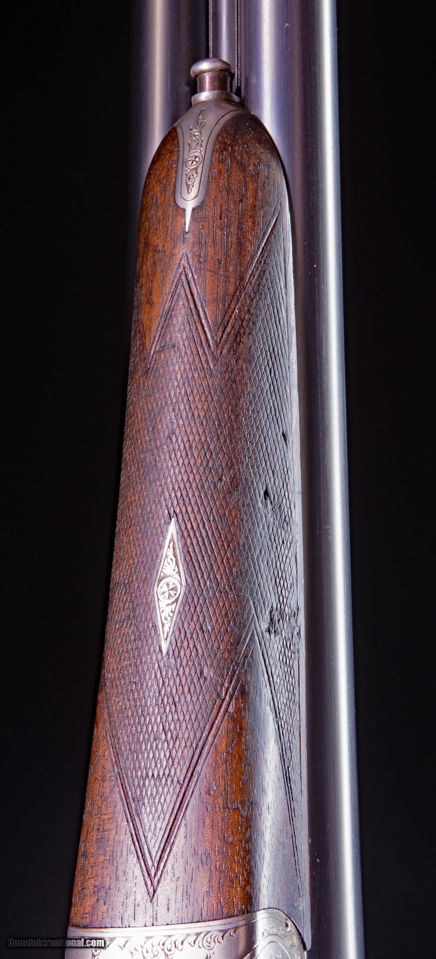 Description: Boxlocks - It is often thought Boss never produced any boxlocks, but in fact they did. On page 188 of "Boss & Co., Builders of the Best Guns Only" the author, Donald Dallas said: "Before World War I the British market was dominant, but this changed to the American market after the war. Some boxlocks were produced for the first time in the history of the firm. These boxlocks, of superb quality, were usually sold bearing the name "Robertson."" Our example, dating from circa 1938, is a fine and extremely rare in 16g. rare example of the Boss "Robertson" boxlock\'s.