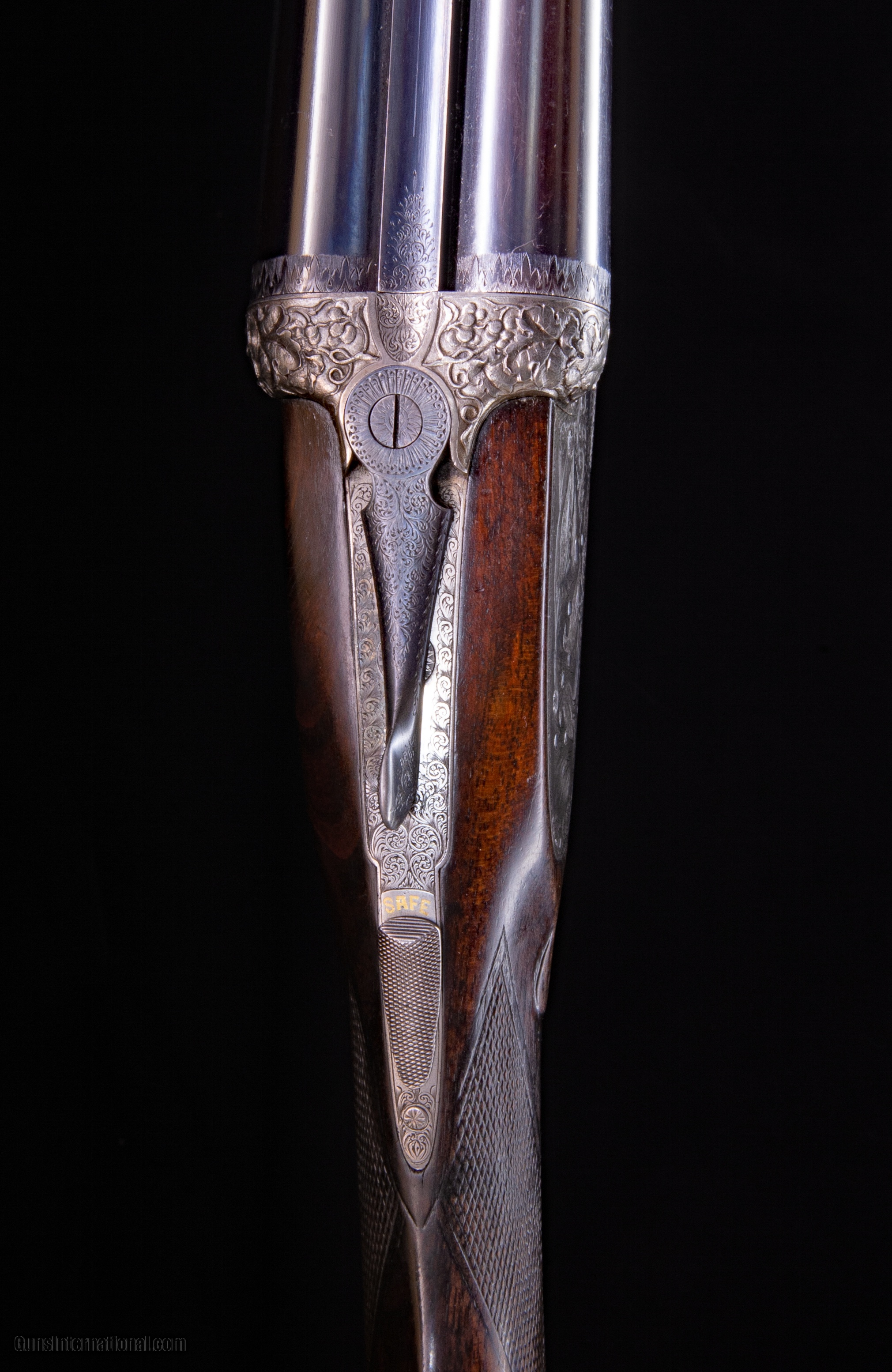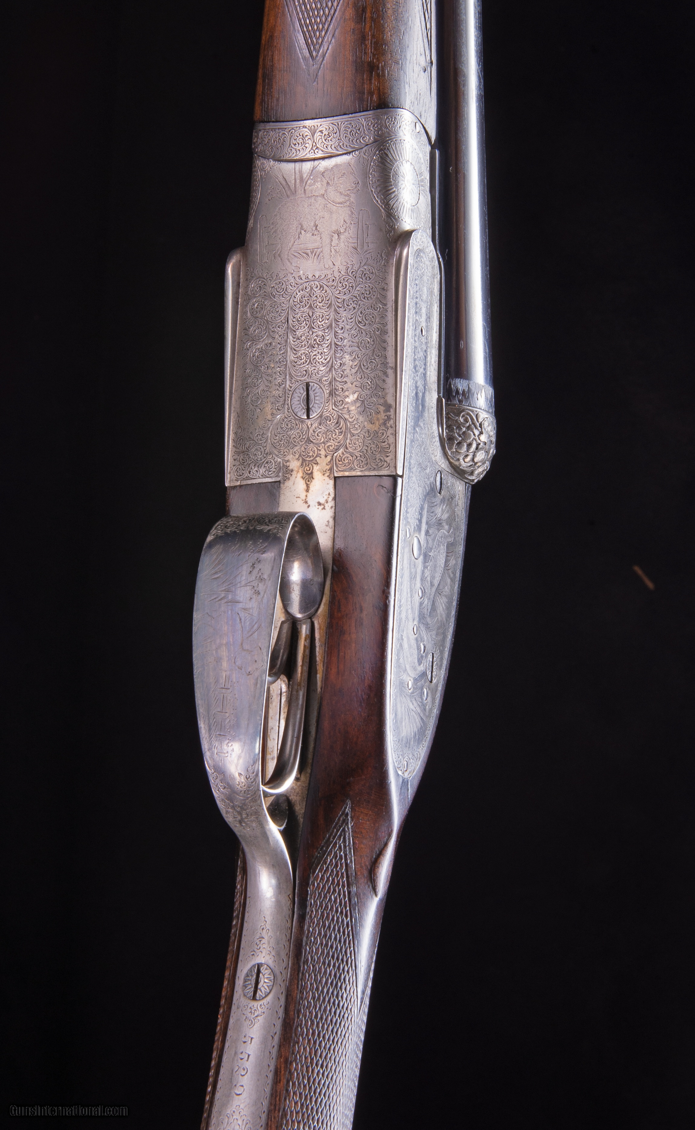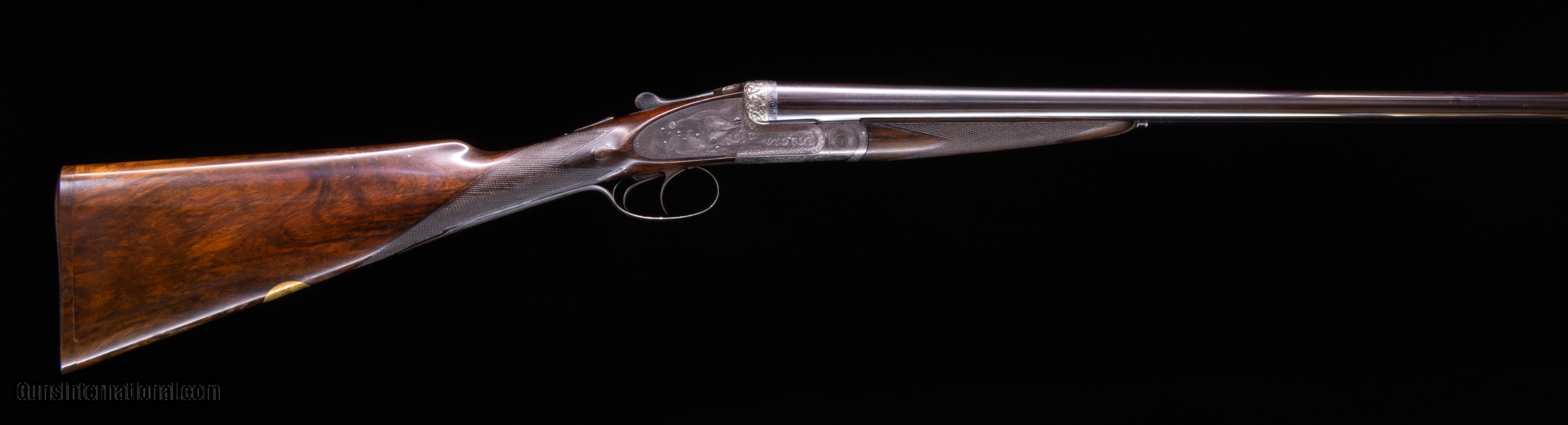 Description: Hammerless Sidelocks - I cannot say enough about this beautiful shotgun ! Six pounds nine and a half ounces with stout barrels with 3" London (1987) nitro proofs. Game scenes with a wonderful dog on the bottom plate with deep chisel fences just to get started on its features. . *** Note: To see this gun with high resolution photos and a zoom-in feature, go to the vintagedoubles main site and search for the gun ID: 4939 or browse the main site to see our full gun collection. SOLD Manufacturer: John Wilkes Sidelock with exquisite game scenes and dog from 1911 ~ I can\'t say...... Model: None Serial Number: 5529 Ejectors: Yes Barrels: 28 Barrel Type: Steel Action: Sidelock ejector Gauge Info: 12 gauge Stock Comb: 1 1/2 Stock Heel: 2 1/4 Stock Cast: 1/4 LOP: 14 1/8 with wood ext Weight: 6lb 9.5oz Choke Left: .014 Mod Choke Right: .007 Skeet Proof:Nitro: 3 Minimum Wall Thickness Left: .035 Minimum Wall Thickness Right: .038 |