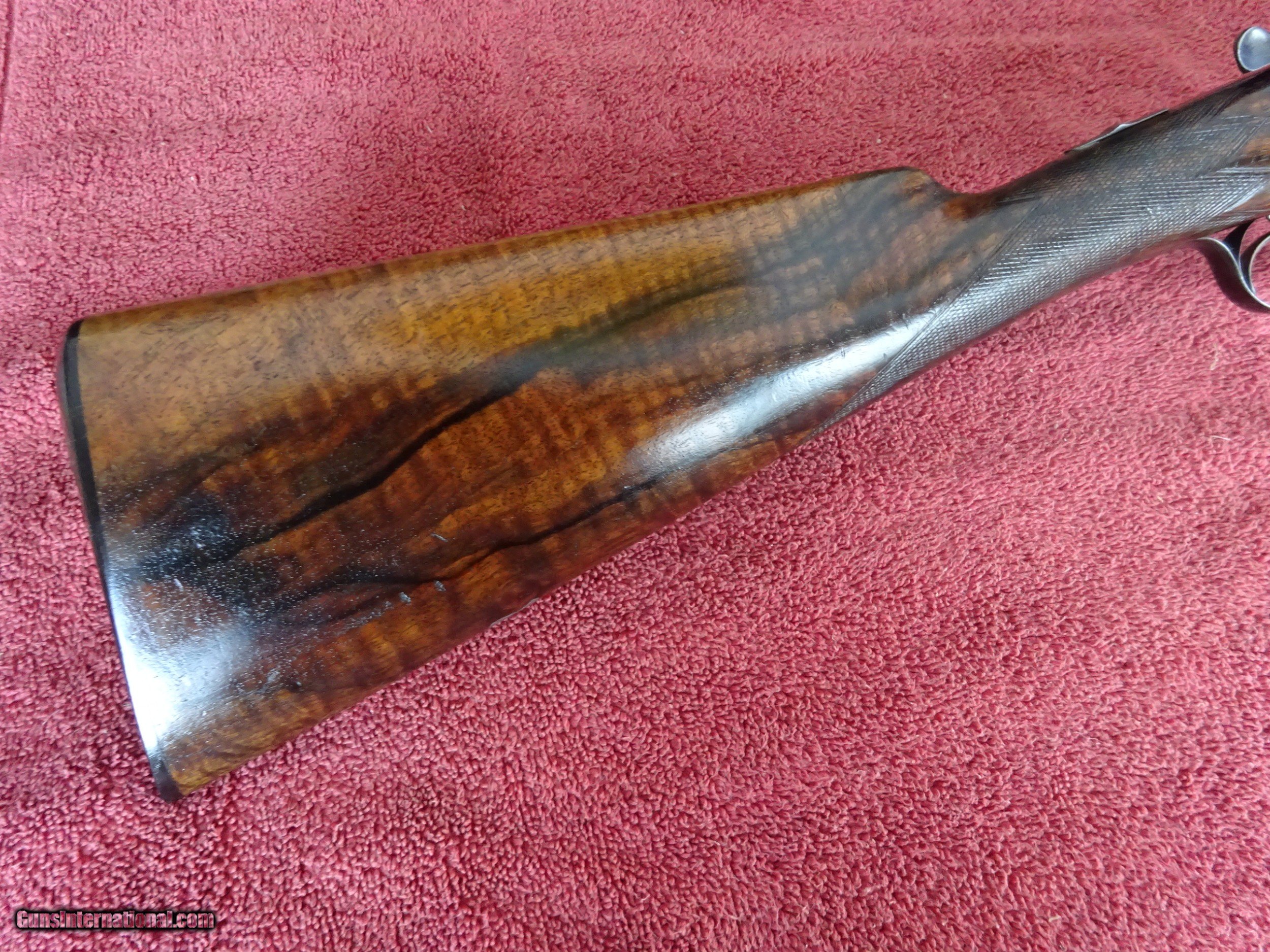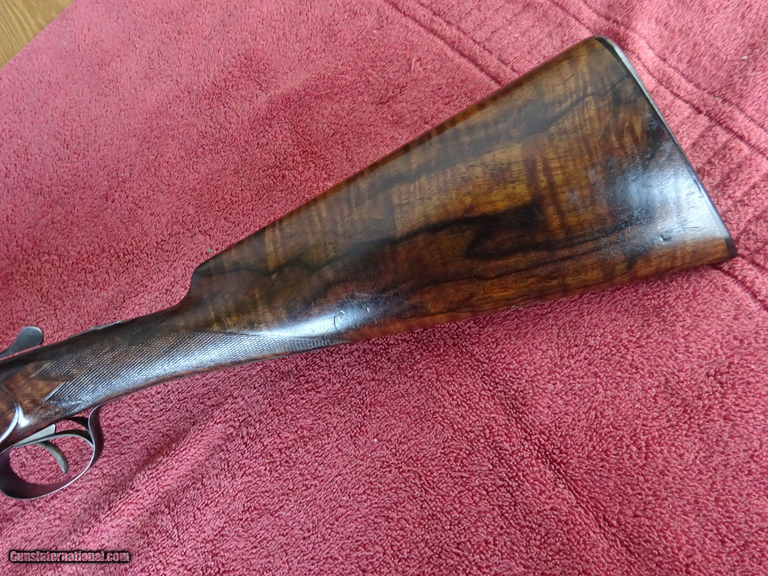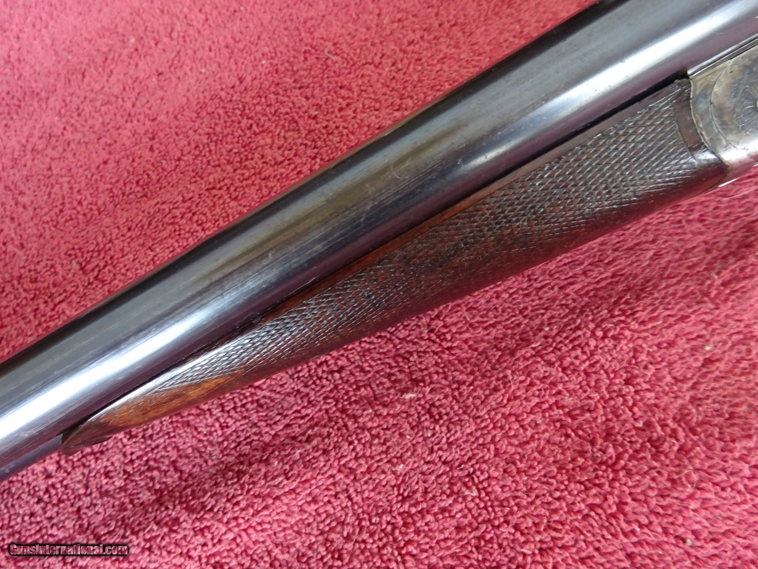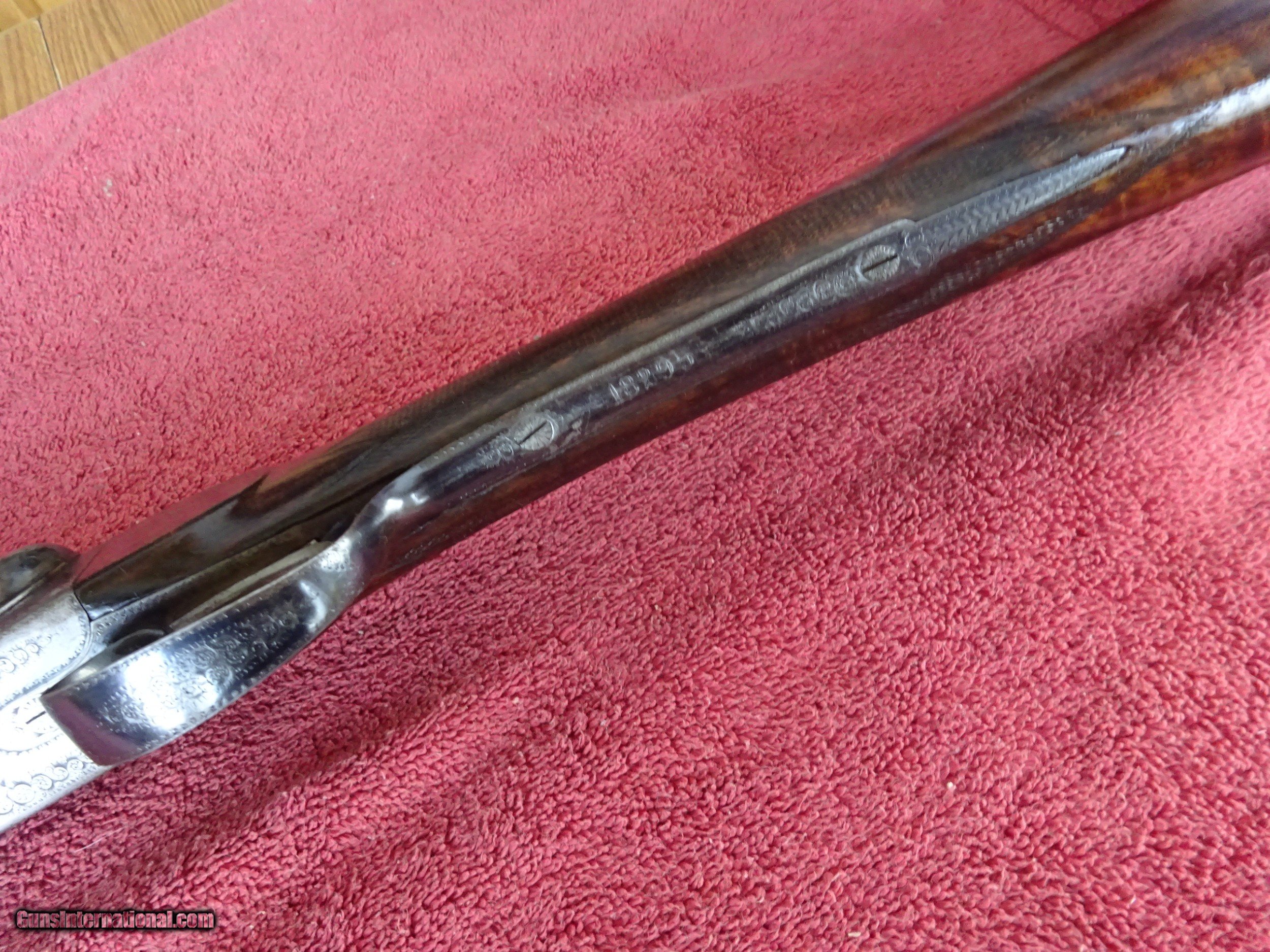 Description: LINSLEY BROTHERS, LEEDS ENGLAND, 12 GAUGE. 30" BARRELS, NARROW RIB MARKED "LINSLEY BROTHERS 14 LANDS LAND LEEDS", ENGRAVED DOLLS HEAD RIB EXTENSION, NITRO PROOF BARRELS RING LIKE A BELL, IMCYL. (.010) AND FULL (.035), 2 5/8" CHAMBERS, MINIMUM WALL THICKNESS .029 BOTH BARRELS. VERY GOOD BLUE, MIRROR BRIGHT BORES. BOXLOCK FRAME WITH NEAR FULL COVERAGE WITH TINY ENGLISH SCROLL, GOOD VIVID CASE COLOR, ENGRAVED SCREWS. ENGRAVED TRIGGERGUARD WITH VERY GOOD BLUE, TOP LEVER TO THE RIGHT - TIGHT ON FACE. STRAIGHT GRIP STOCK, SPLINTER FOREARM, GORGEOUS EUROPEAN WALNUT WITH BLACK STREAKS. VERY FINE CHECKERING WITH MULLERED BORDERS, VERY GOOD WOOD, WORN CHECKERING. CHECKERED HORN BUTTPATE, 1 5/16" X 2" X 14 1/4", 6 POUNDS 4 OUNCES, CAST 3/8" OFF. INTERESTING ACCESSORIES - BILLIARD CLOTH LINED LEATHER TRUNK CASE WITH LARGE GRAPHIC FACTORY PAPER LABEL UNDER TOP LID, TWO PIECE EBONY BRASS FITTED CLEANING ROD, BRUSH, SWAB, NICKEL PLATED BRASS OIL BOTTLE AND SNAP CAPS, ALSO ORIGINAL HUNTING LICENSE "CERTIFICATE TO KILL GAME" DATED OCT. 7, 1921. THE CASE HANDLE IS DETACHED AND IT'S MISSING THE STRAPS, SOUND CONDITION OTHERWISE. THE GUN IS IN VERY PLEASING ORIGINAL CONDITION. AN INTERESTING BRITISH PACKAGE FROM A RATHER OBSCURE MAKER. $2250.00+ $80.00 Insured shipping to an FFL address. Layaway is available. See all Pats gun listings on this site! We also have hundreds of pieces of ORIGINAL gun company advertising & memorabilia available for sale on our site SPORTINGCOLLECTIBLES. We have no reprints or reproductions. Email for more information. SOLD Curio/Relic: Yes |