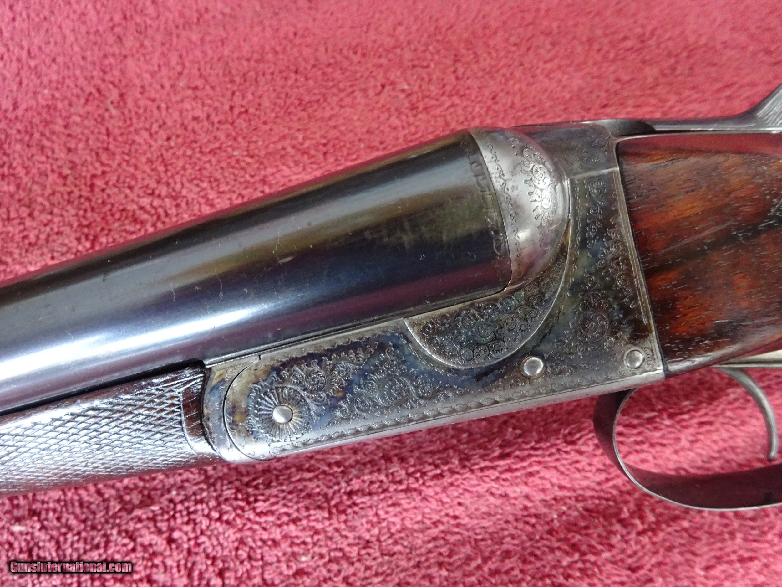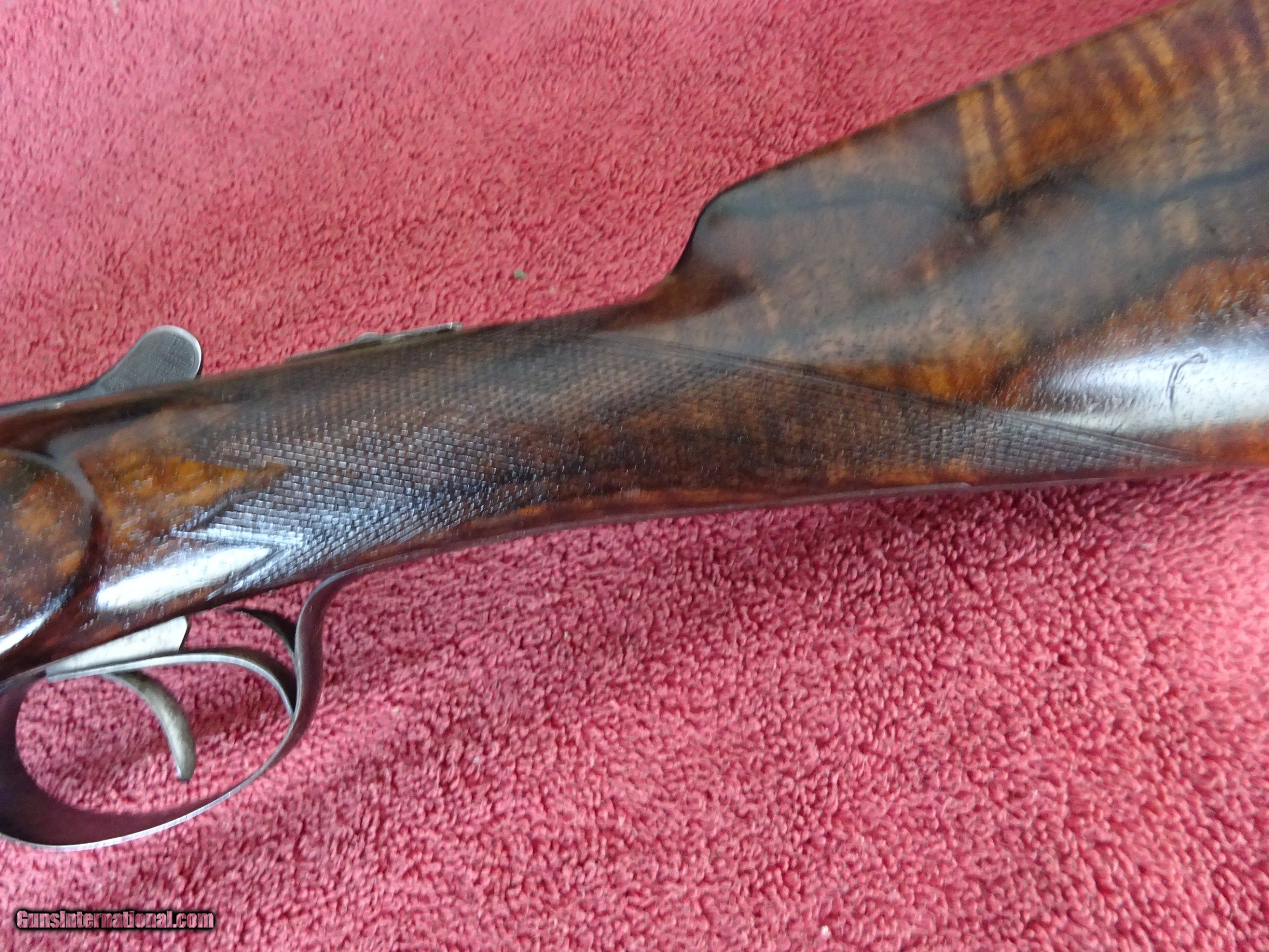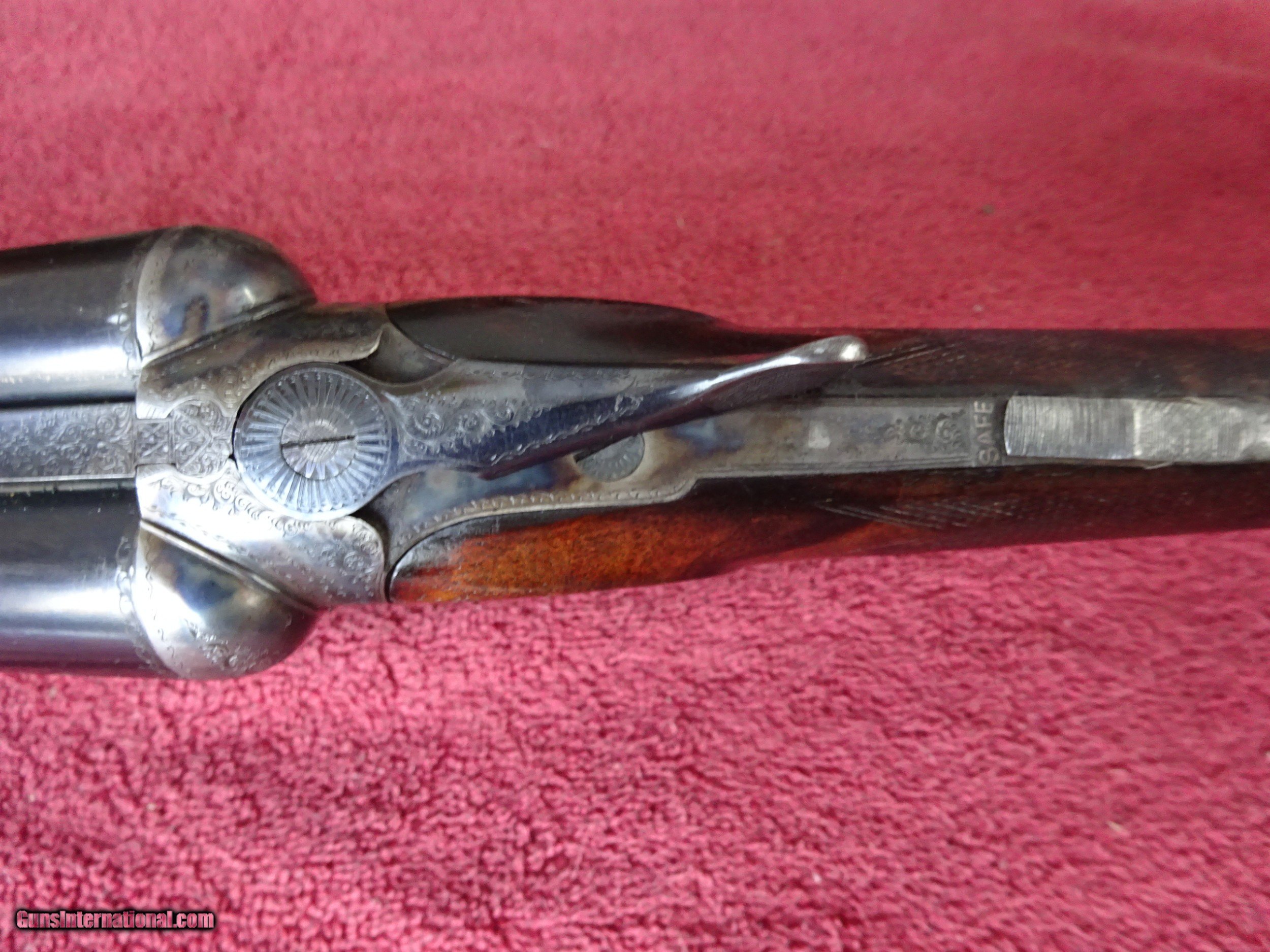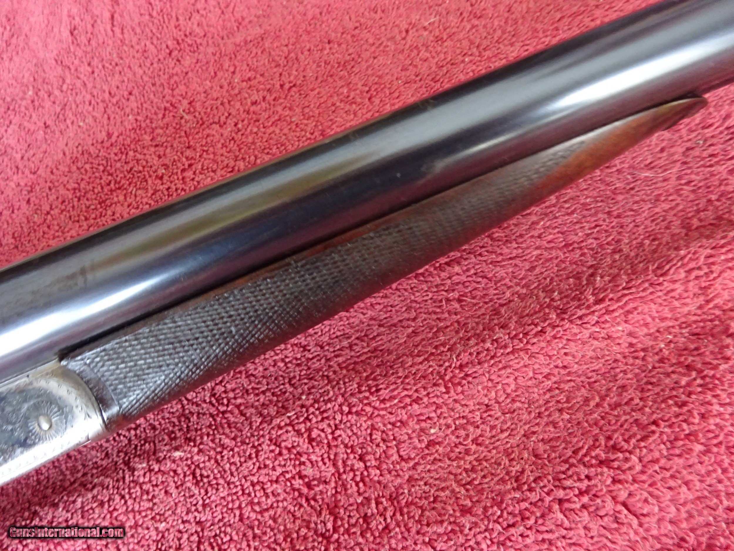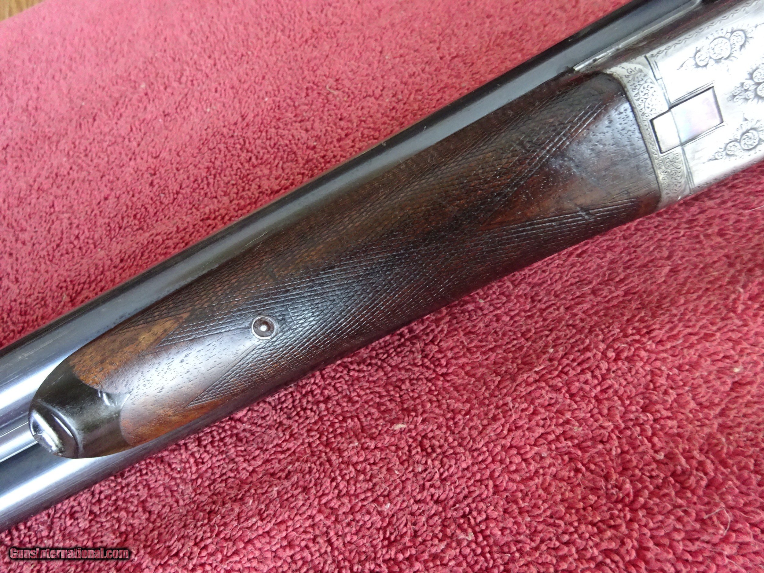 Description: LINSLEY BROTHERS, LEEDS ENGLAND, 12 GAUGE. 30" BARRELS, NARROW RIB MARKED "LINSLEY BROTHERS 14 LANDS LAND LEEDS", ENGRAVED DOLLS HEAD RIB EXTENSION, NITRO PROOF BARRELS RING LIKE A BELL, IMCYL. (.010) AND FULL (.035), 2 5/8" CHAMBERS, MINIMUM WALL THICKNESS .029 BOTH BARRELS. VERY GOOD BLUE, MIRROR BRIGHT BORES. BOXLOCK FRAME WITH NEAR FULL COVERAGE WITH TINY ENGLISH SCROLL, GOOD VIVID CASE COLOR, ENGRAVED SCREWS. ENGRAVED TRIGGERGUARD WITH VERY GOOD BLUE, TOP LEVER TO THE RIGHT - TIGHT ON FACE. STRAIGHT GRIP STOCK, SPLINTER FOREARM, GORGEOUS EUROPEAN WALNUT WITH BLACK STREAKS. VERY FINE CHECKERING WITH MULLERED BORDERS, VERY GOOD WOOD, WORN CHECKERING. CHECKERED HORN BUTTPATE, 1 5/16" X 2" X 14 1/4", 6 POUNDS 4 OUNCES, CAST 3/8" OFF. INTERESTING ACCESSORIES - BILLIARD CLOTH LINED LEATHER TRUNK CASE WITH LARGE GRAPHIC FACTORY PAPER LABEL UNDER TOP LID, TWO PIECE EBONY BRASS FITTED CLEANING ROD, BRUSH, SWAB, NICKEL PLATED BRASS OIL BOTTLE AND SNAP CAPS, ALSO ORIGINAL HUNTING LICENSE "CERTIFICATE TO KILL GAME" DATED OCT. 7, 1921. THE CASE HANDLE IS DETACHED AND IT'S MISSING THE STRAPS, SOUND CONDITION OTHERWISE. THE GUN IS IN VERY PLEASING ORIGINAL CONDITION. AN INTERESTING BRITISH PACKAGE FROM A RATHER OBSCURE MAKER. $2250.00+ $80.00 Insured shipping to an FFL address. Layaway is available. See all Pats gun listings on this site! We also have hundreds of pieces of ORIGINAL gun company advertising & memorabilia available for sale on our site SPORTINGCOLLECTIBLES. We have no reprints or reproductions. Email for more information. SOLD Curio/Relic: Yes |
