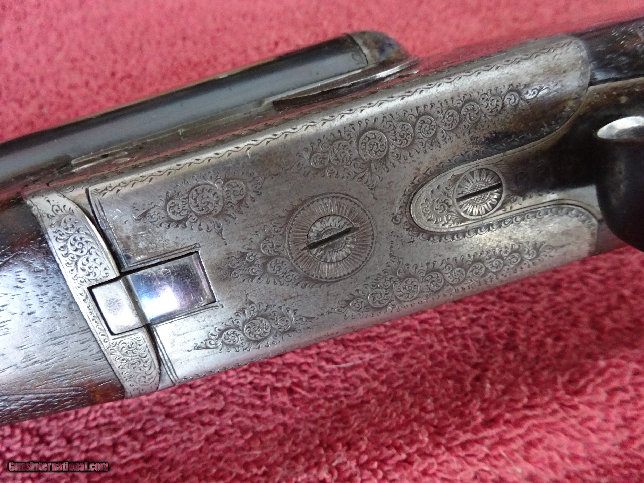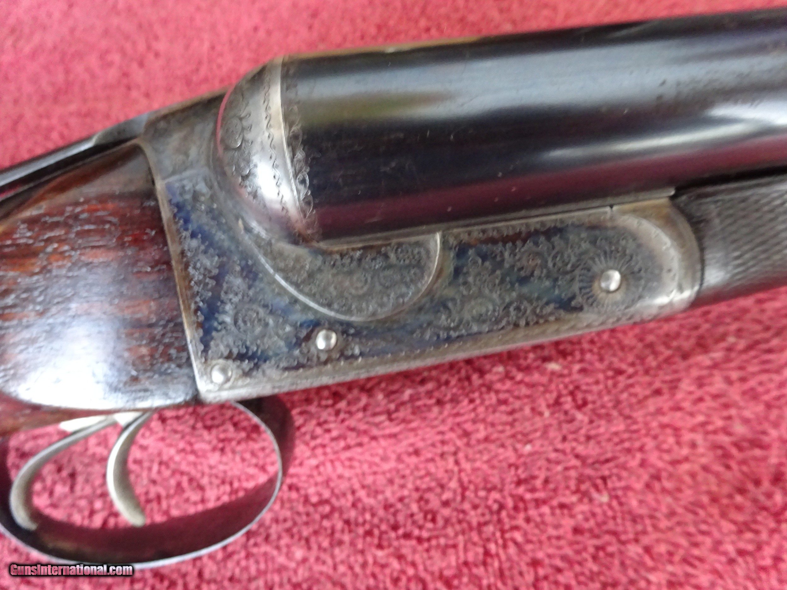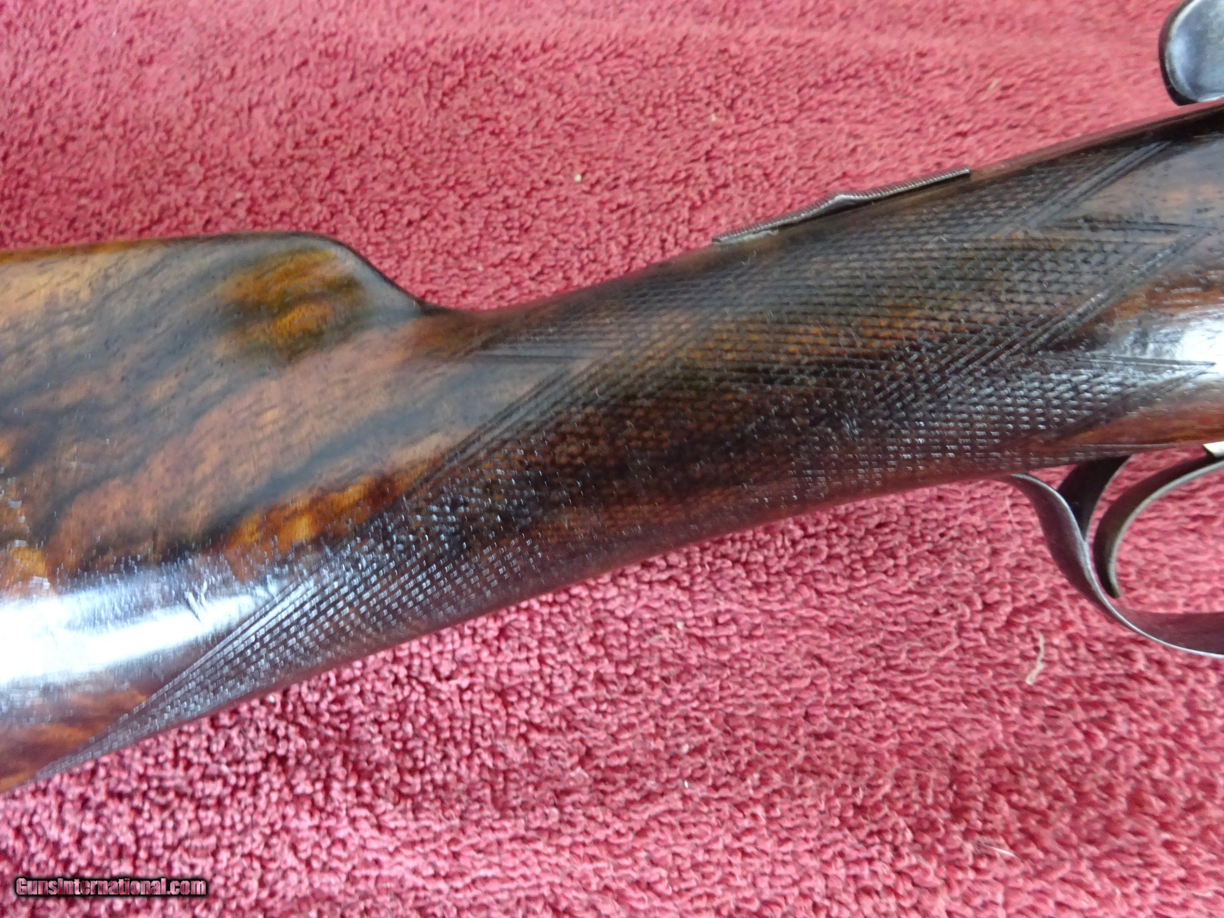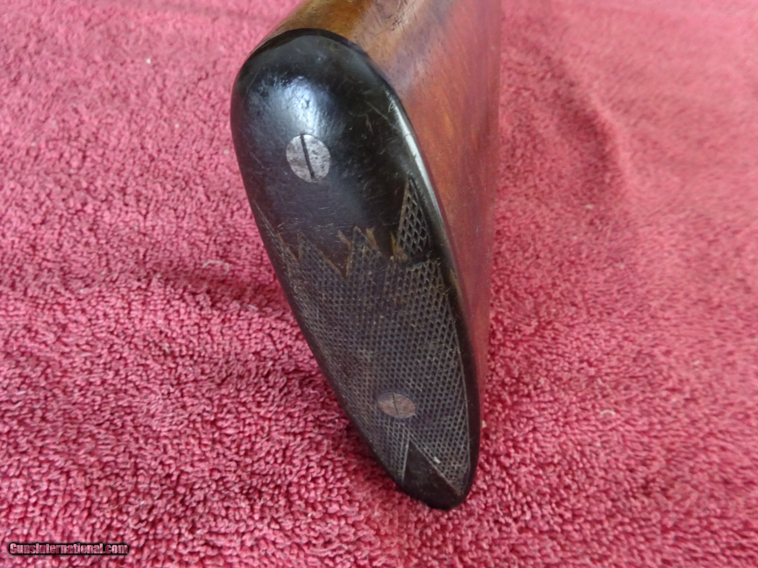 Description: LINSLEY BROTHERS, LEEDS ENGLAND, 12 GAUGE. 30" BARRELS, NARROW RIB MARKED "LINSLEY BROTHERS 14 LANDS LAND LEEDS", ENGRAVED DOLLS HEAD RIB EXTENSION, NITRO PROOF BARRELS RING LIKE A BELL, IMCYL. (.010) AND FULL (.035), 2 5/8" CHAMBERS, MINIMUM WALL THICKNESS .029 BOTH BARRELS. VERY GOOD BLUE, MIRROR BRIGHT BORES. BOXLOCK FRAME WITH NEAR FULL COVERAGE WITH TINY ENGLISH SCROLL, GOOD VIVID CASE COLOR, ENGRAVED SCREWS. ENGRAVED TRIGGERGUARD WITH VERY GOOD BLUE, TOP LEVER TO THE RIGHT - TIGHT ON FACE. STRAIGHT GRIP STOCK, SPLINTER FOREARM, GORGEOUS EUROPEAN WALNUT WITH BLACK STREAKS. VERY FINE CHECKERING WITH MULLERED BORDERS, VERY GOOD WOOD, WORN CHECKERING. CHECKERED HORN BUTTPATE, 1 5/16" X 2" X 14 1/4", 6 POUNDS 4 OUNCES, CAST 3/8" OFF. INTERESTING ACCESSORIES - BILLIARD CLOTH LINED LEATHER TRUNK CASE WITH LARGE GRAPHIC FACTORY PAPER LABEL UNDER TOP LID, TWO PIECE EBONY BRASS FITTED CLEANING ROD, BRUSH, SWAB, NICKEL PLATED BRASS OIL BOTTLE AND SNAP CAPS, ALSO ORIGINAL HUNTING LICENSE "CERTIFICATE TO KILL GAME" DATED OCT. 7, 1921. THE CASE HANDLE IS DETACHED AND IT'S MISSING THE STRAPS, SOUND CONDITION OTHERWISE. THE GUN IS IN VERY PLEASING ORIGINAL CONDITION. AN INTERESTING BRITISH PACKAGE FROM A RATHER OBSCURE MAKER. $2250.00+ $80.00 Insured shipping to an FFL address. Layaway is available. See all Pats gun listings on this site! We also have hundreds of pieces of ORIGINAL gun company advertising & memorabilia available for sale on our site SPORTINGCOLLECTIBLES. We have no reprints or reproductions. Email for more information. SOLD Curio/Relic: Yes |