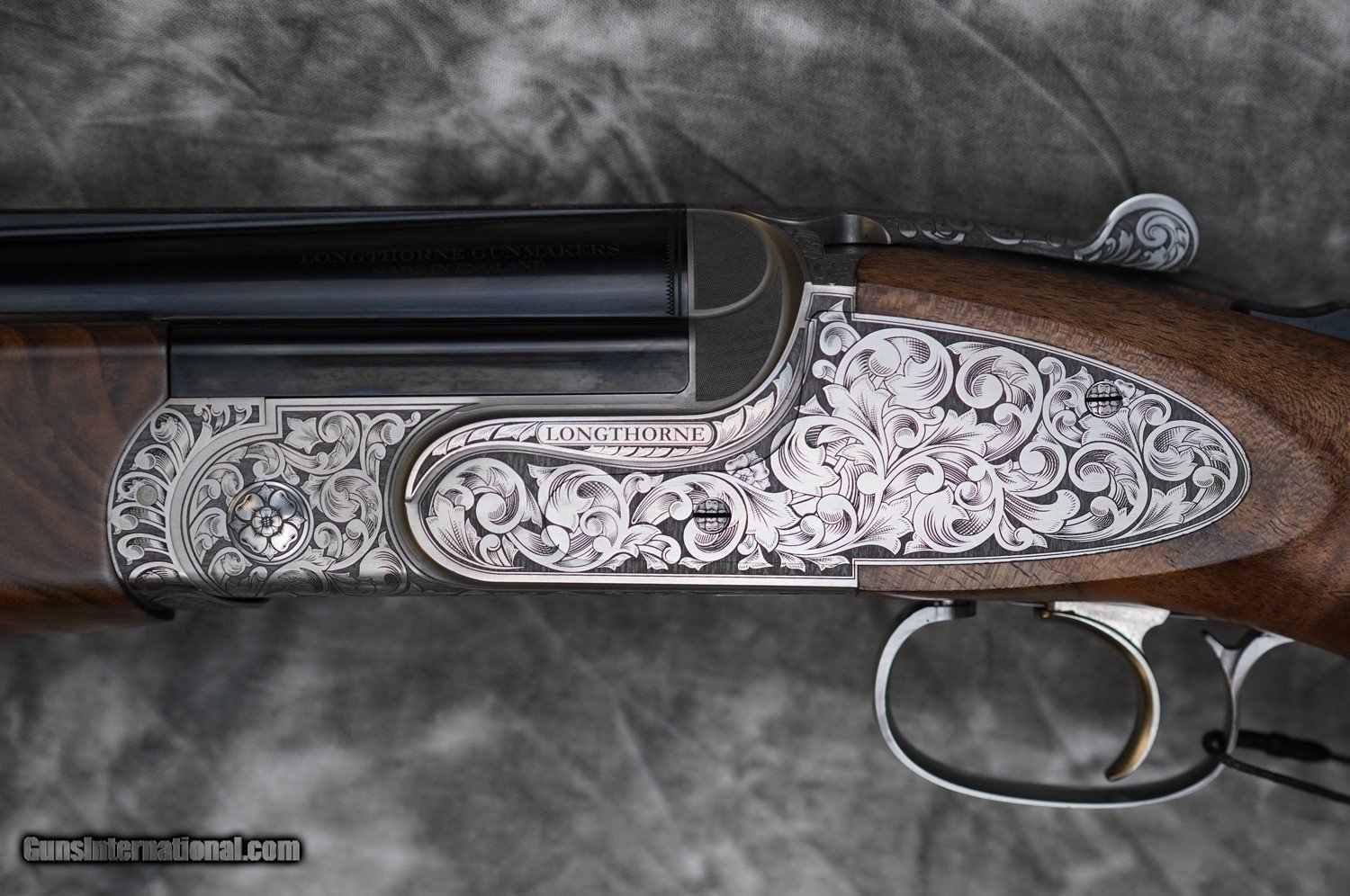 Description: New Longthorne 2006 Vivo Boxlock Sporting 12GA with 32" factory choke tubed, monolithic barrels with flat-tapered sporting rib. Nitride finished trigger-plate action with selective, adj. trigger. Features fully engraved side-plates with highly detailed scrolls and acanthus leaves, highly figured factory pistol grip sporting stock with adj. comb and beavertail forearm. Includes factory case, chokes and tools. SOLD Shotgun Gauge: 12 Gauge |