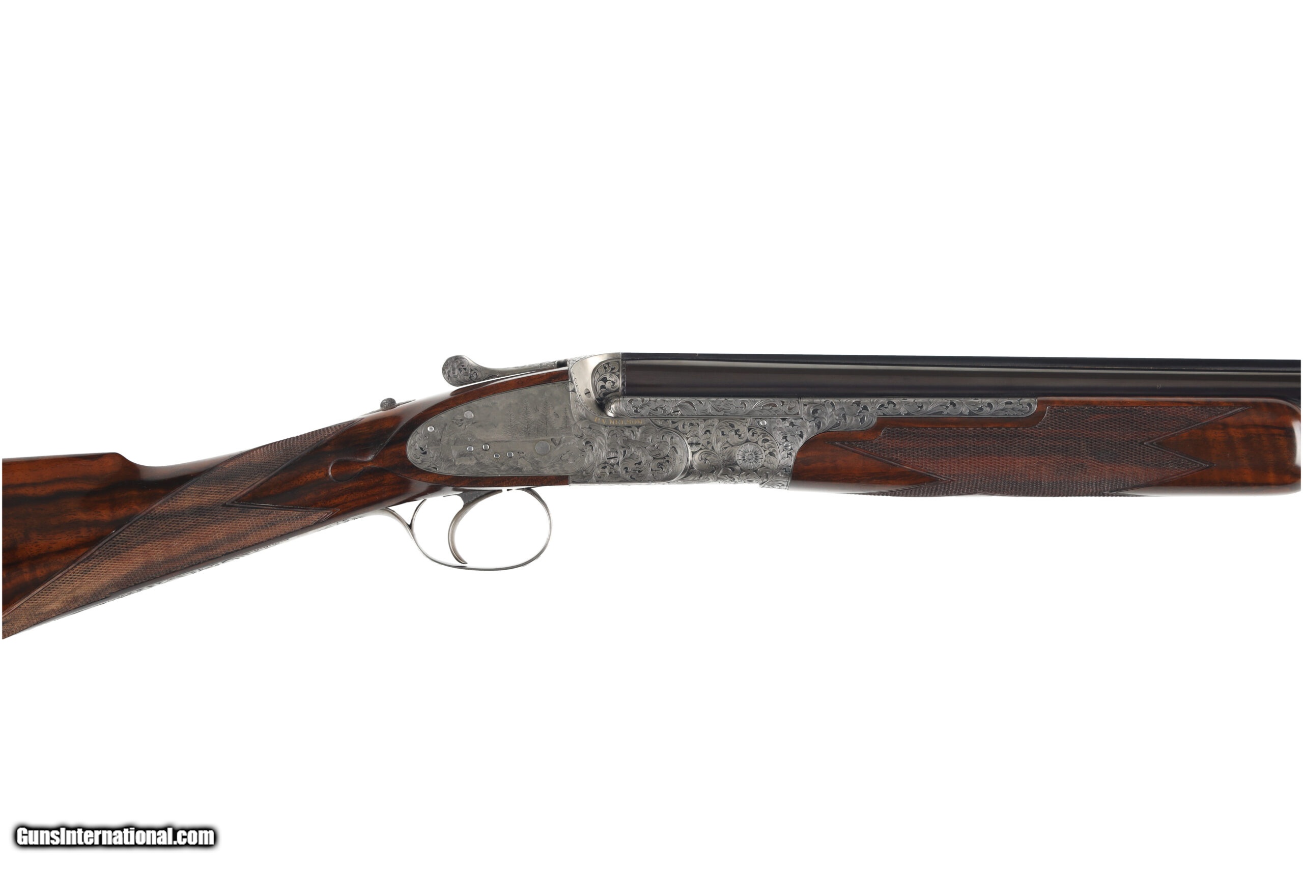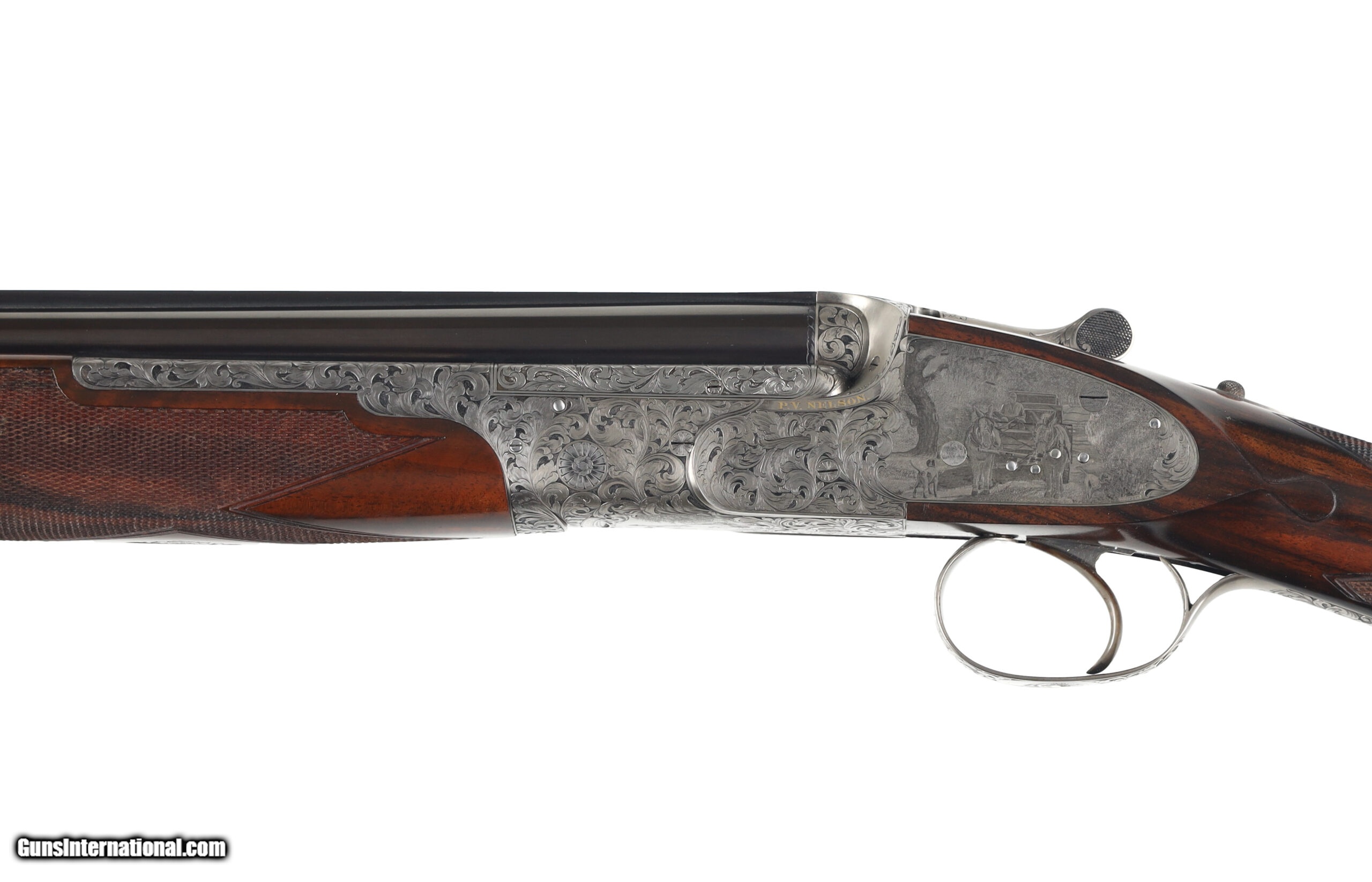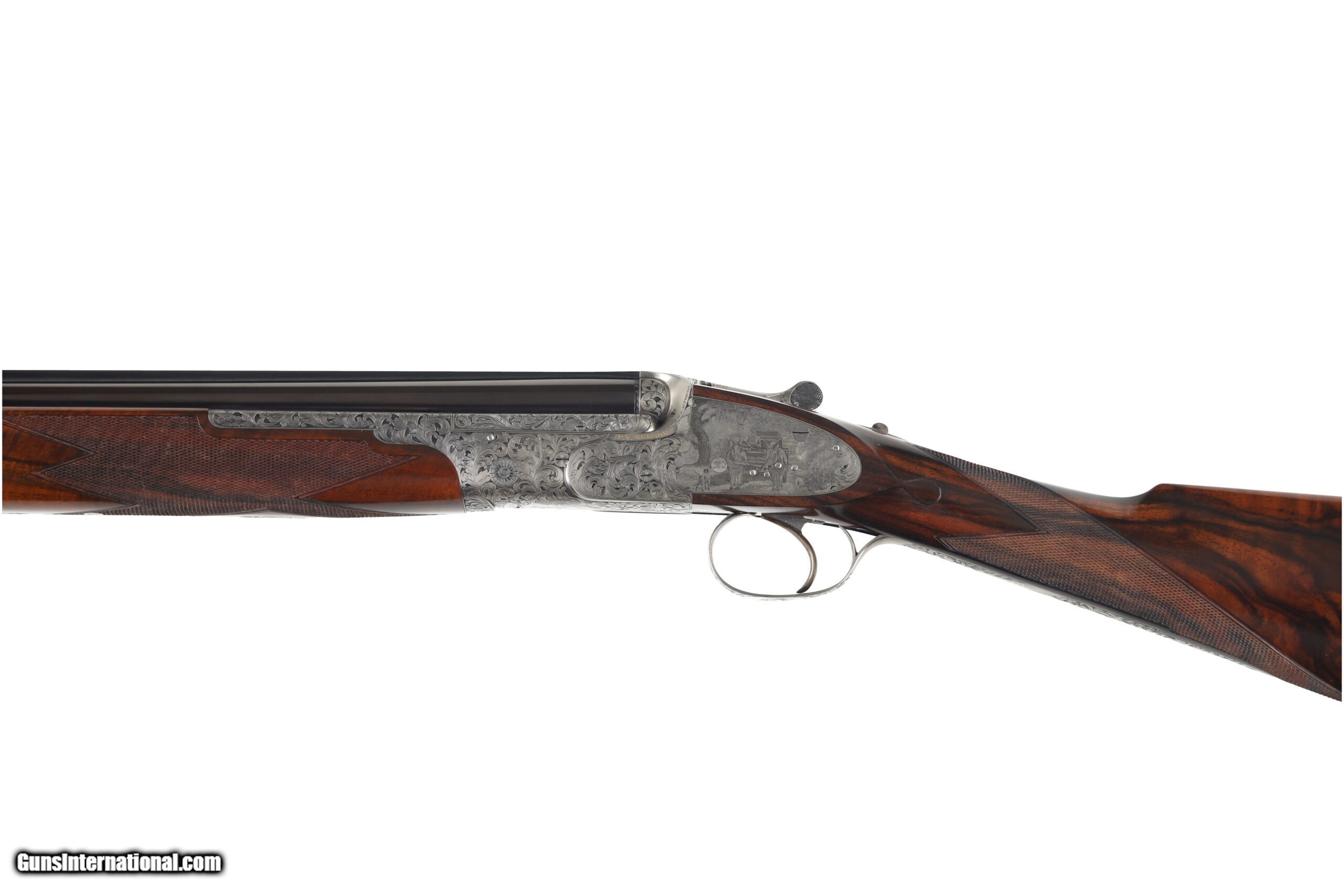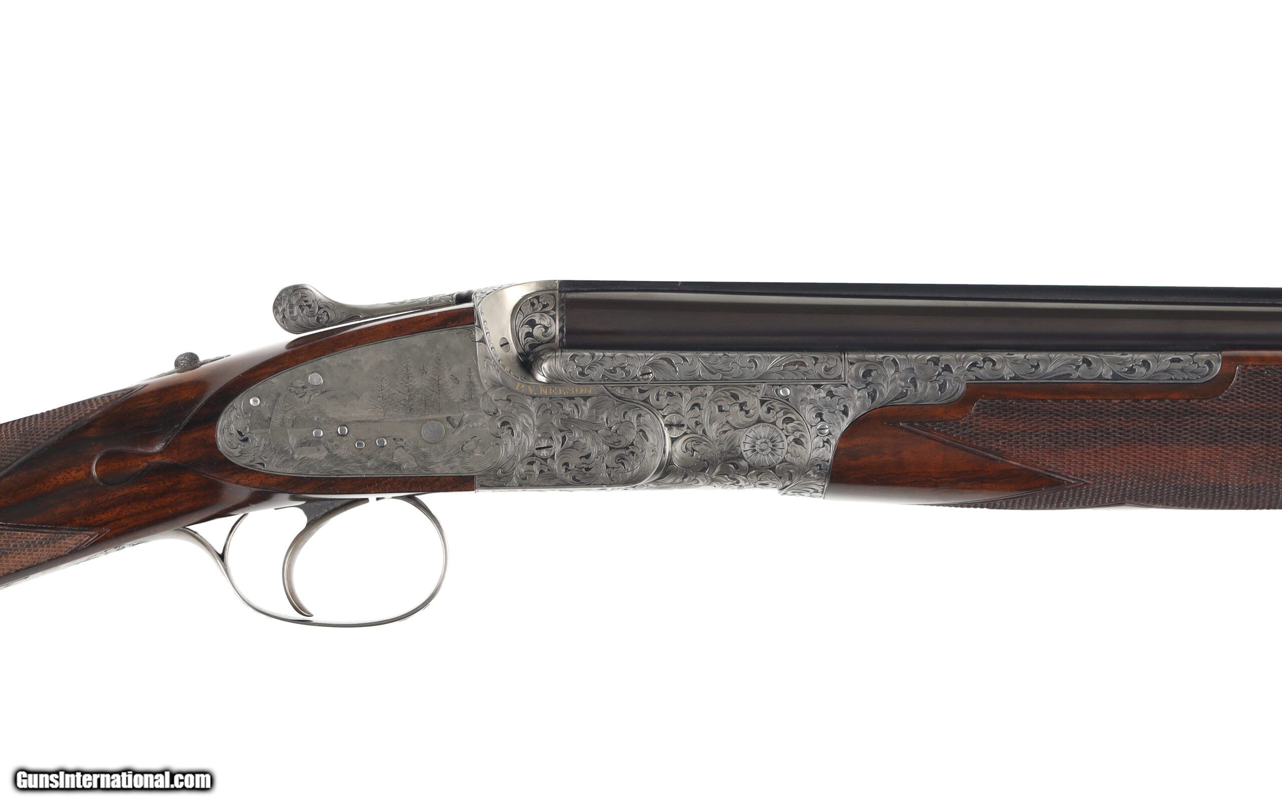 Description: Peter Nelson (PVN), started his gun making career as an apprentice actioner at Purdey through the 1950's and 60's. In 1971 he joined forces with the iconic firm of Hartmann & Weiss in Hamburg. In 1974 he returned to London to start Hartmann & Weiss, UK., making guns for 18 years under their brand, before later starting his own famous brand of P. V. Nelson. Sporting guns which became known for their quality and craftsmanship, incorporating all of the best aspects of fine English gun making. The Mackay Point is one of the finest examples of PVN's work, partnering with Phil Coggan, arguably the world's finest engraver, is an over/under two-barrel set, built using a Boss & Co style action in 28 bore and .410, bearing the unique serial number of "28410". Engraving theme for this firearm is a beautiful acanthus leaf pattern, with Bulino Game Scene of the original owner hunting over his famous 6,000-acre South Carolina Quail Plantation, dating back to1732. The stock on this beautiful shotgun is of exhibition grade figured walnut with near flawless checkering. It should be noted, this was the last gun built by Peter Nelson and is commemorated with the words "My Last Gun 2011" inlaid in gold on the rib of each barrel set. As we write, Phil Coggan is completing his last engraving for a Griffin & Howe client, before retiring. Making this a 'doubly' rare opportunity! Overall condition of this gun is immaculate, with only the faintest of handling marks on the stock. We were surprised to find that this firearm had actually been shot, as bores are near perfect, barrels are incredibly tight on the action. This game gun has been incredibly well taken care of and it shows throughout. Offered for your consideration $250,000.00USD Manufactured in: England Hand: Right Hand Action Finish: Engraved Action Description: Over / Under Metal Finish: Original Barrel Length: 28 Inches Barrel Condition: Excellent Stock Finish: Original Stock Condition: Excellent Type of Butt: Checkered Butt Pad Thickness: NONE Grip: Straight Grip Forend: Checkered Cast Amount: 3/8" Extra Barrels: Yes SOLD Manufacturer: P.V. Nelson Model: Best Over/Under 2 Barrel Set Chambers: 2 3/4 Ejectors: Yes Condition: Preowned Metal Condition: Excellent Action: Over / Under Triggers: Single Gauge Info: 28 Gauge Stock Comb: 1 1/2 Stock Heel: 2 1/8 Stock Cast: Off Fore End: Checkered Butt Pad: NONE LOP: 14 1/2 Rib: Solid Finish: Original Weight: 5.6 lbs Manufacture Date: 2011 Chokes: M/IM Extras: Yes Case: Leather Luggage |