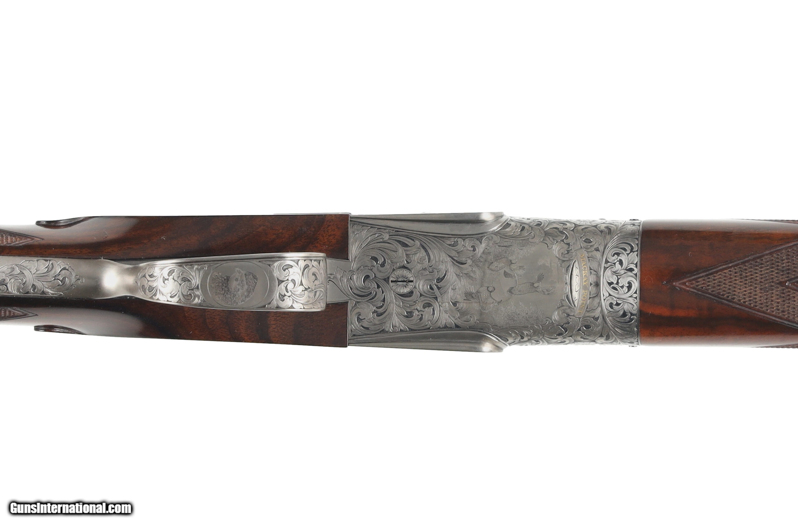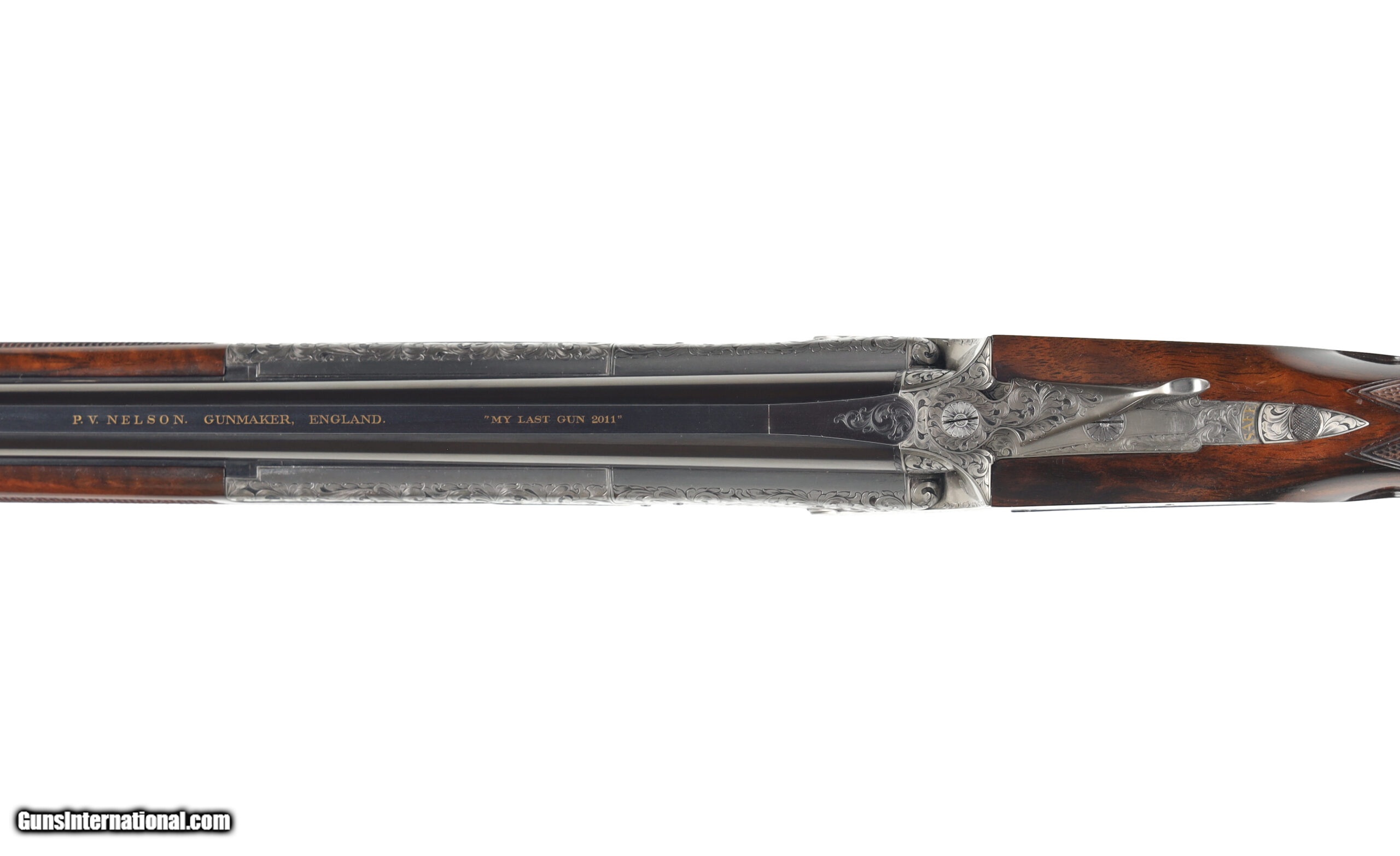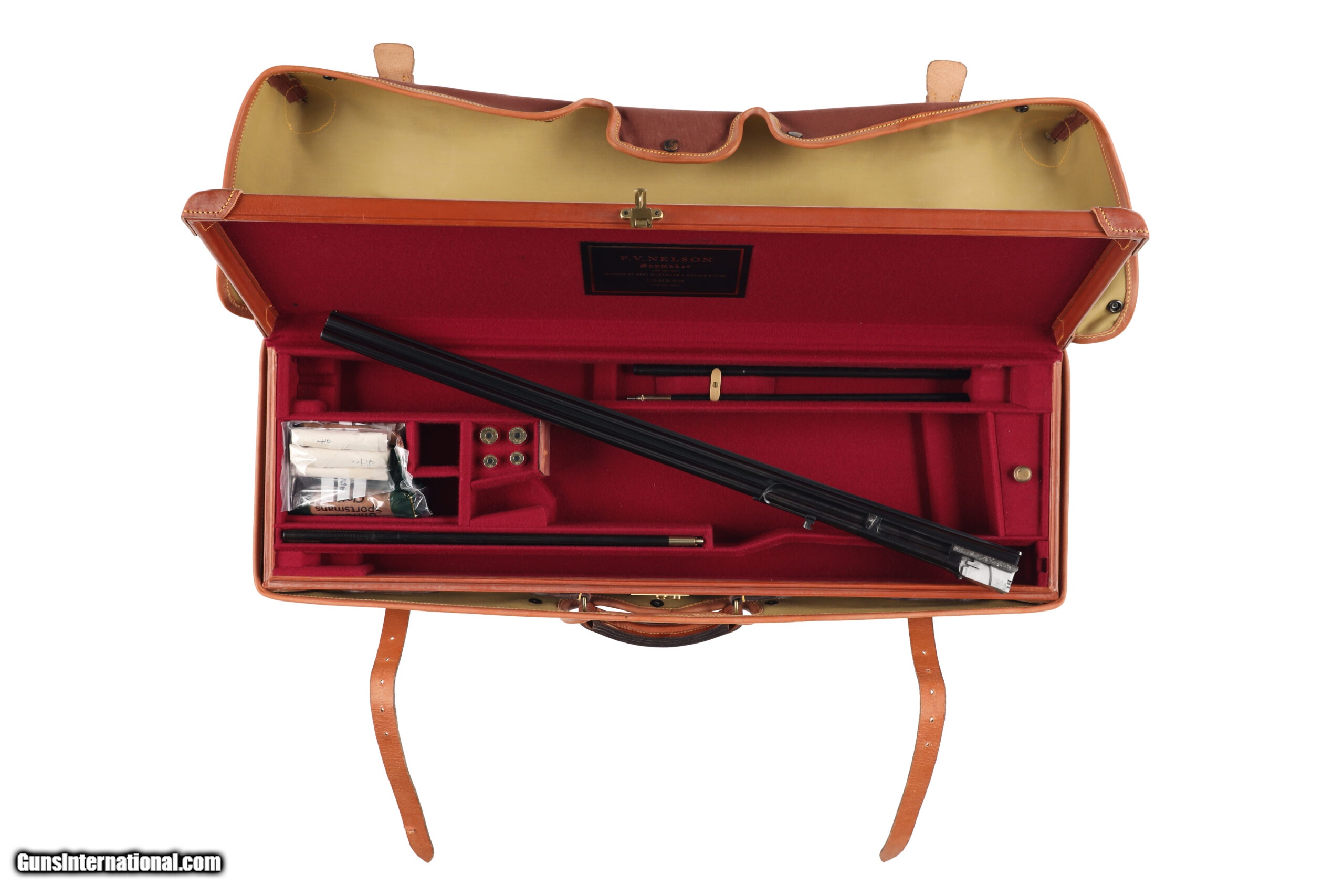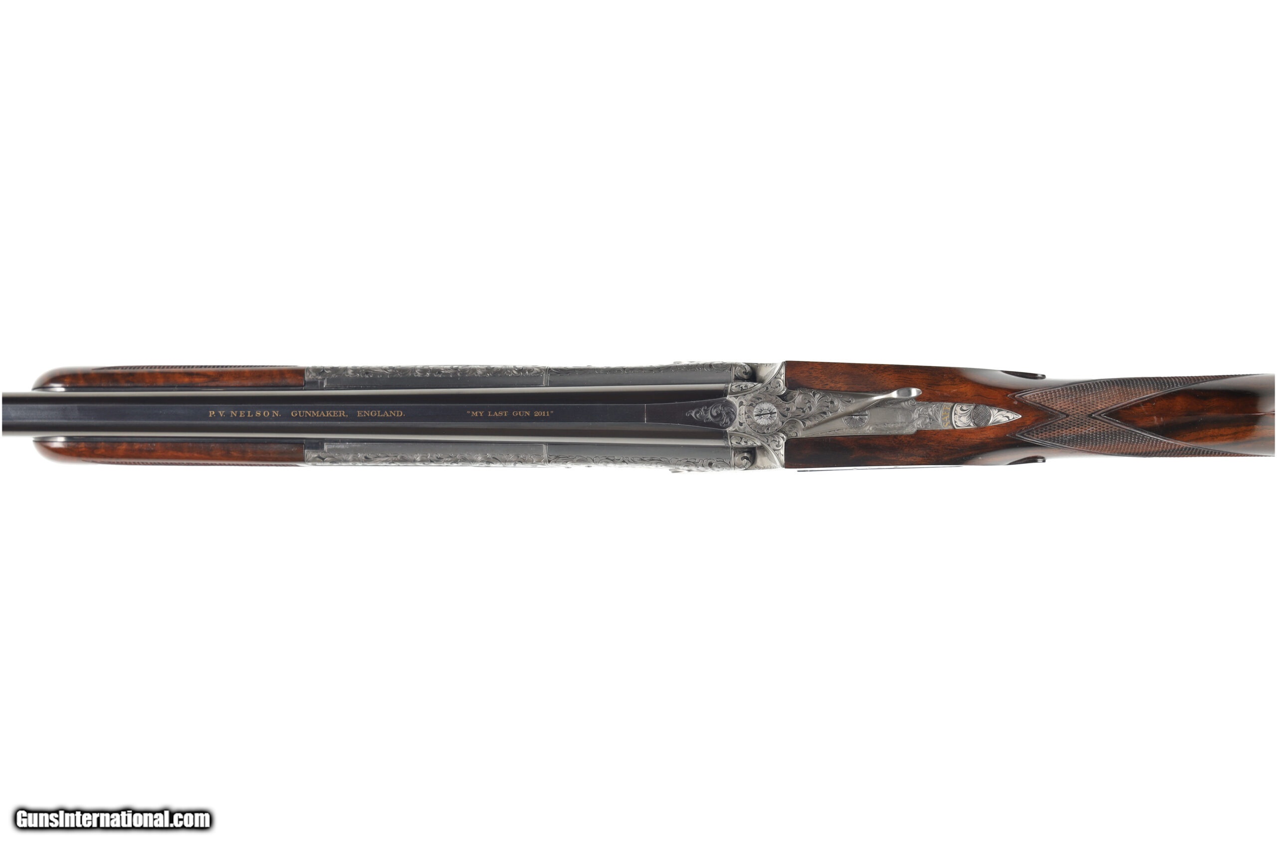 Description: Peter Nelson (PVN), started his gun making career as an apprentice actioner at Purdey through the 1950's and 60's. In 1971 he joined forces with the iconic firm of Hartmann & Weiss in Hamburg. In 1974 he returned to London to start Hartmann & Weiss, UK., making guns for 18 years under their brand, before later starting his own famous brand of P. V. Nelson. Sporting guns which became known for their quality and craftsmanship, incorporating all of the best aspects of fine English gun making. The Mackay Point is one of the finest examples of PVN's work, partnering with Phil Coggan, arguably the world's finest engraver, is an over/under two-barrel set, built using a Boss & Co style action in 28 bore and .410, bearing the unique serial number of "28410". Engraving theme for this firearm is a beautiful acanthus leaf pattern, with Bulino Game Scene of the original owner hunting over his famous 6,000-acre South Carolina Quail Plantation, dating back to1732. The stock on this beautiful shotgun is of exhibition grade figured walnut with near flawless checkering. It should be noted, this was the last gun built by Peter Nelson and is commemorated with the words "My Last Gun 2011" inlaid in gold on the rib of each barrel set. As we write, Phil Coggan is completing his last engraving for a Griffin & Howe client, before retiring. Making this a 'doubly' rare opportunity! Overall condition of this gun is immaculate, with only the faintest of handling marks on the stock. We were surprised to find that this firearm had actually been shot, as bores are near perfect, barrels are incredibly tight on the action. This game gun has been incredibly well taken care of and it shows throughout. Offered for your consideration $250,000.00USD Manufactured in: England Hand: Right Hand Action Finish: Engraved Action Description: Over / Under Metal Finish: Original Barrel Length: 28 Inches Barrel Condition: Excellent Stock Finish: Original Stock Condition: Excellent Type of Butt: Checkered Butt Pad Thickness: NONE Grip: Straight Grip Forend: Checkered Cast Amount: 3/8" Extra Barrels: Yes SOLD Manufacturer: P.V. Nelson Model: Best Over/Under 2 Barrel Set Chambers: 2 3/4 Ejectors: Yes Condition: Preowned Metal Condition: Excellent Action: Over / Under Triggers: Single Gauge Info: 28 Gauge Stock Comb: 1 1/2 Stock Heel: 2 1/8 Stock Cast: Off Fore End: Checkered Butt Pad: NONE LOP: 14 1/2 Rib: Solid Finish: Original Weight: 5.6 lbs Manufacture Date: 2011 Chokes: M/IM Extras: Yes Case: Leather Luggage |