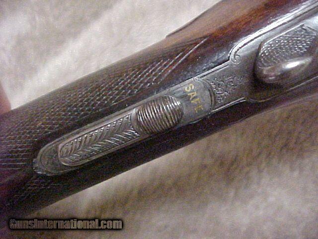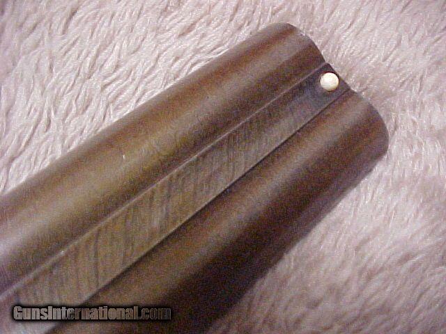 Description: SINGLESHOT SPORTER TRADE CONSIDERED. SALE SALE SALE SALE Excellent, early, 12b double Richaed Ellis, quite obviously a Westley Richards "for the trade" piece as described in the '"Double Gun Journal", Wnter 2015, article on Pg 61. Built on a classic scroll engraved, A&D action with R. ELLIS & SONS in a banner, patent use number 608, with much original case color & retaining VG bright original blue on the floor plate, TG, and the classic WR top lever. 30" Damascus barrels marks " RICHARD ELLIS & SONS MAKERS ST. MARYS SQUARE BIRMINGHAM ENGLAND", bright bores, originally 2 1/2" chambers lengthened to 2 3/4", retaining excellent damascus finish & pattern, ivory bead and BP proof. Excellent 1/2 PG / Spl wood with VG figure and color, LOP 14 1/8" to an original horn buttplate, vacant gold shield . Choked F / F, DAC 1 7/8, DAH 3", Wgt 7lbs. 4oz. A very nice, classic, collectible shooter. SOLD Antique: Yes |