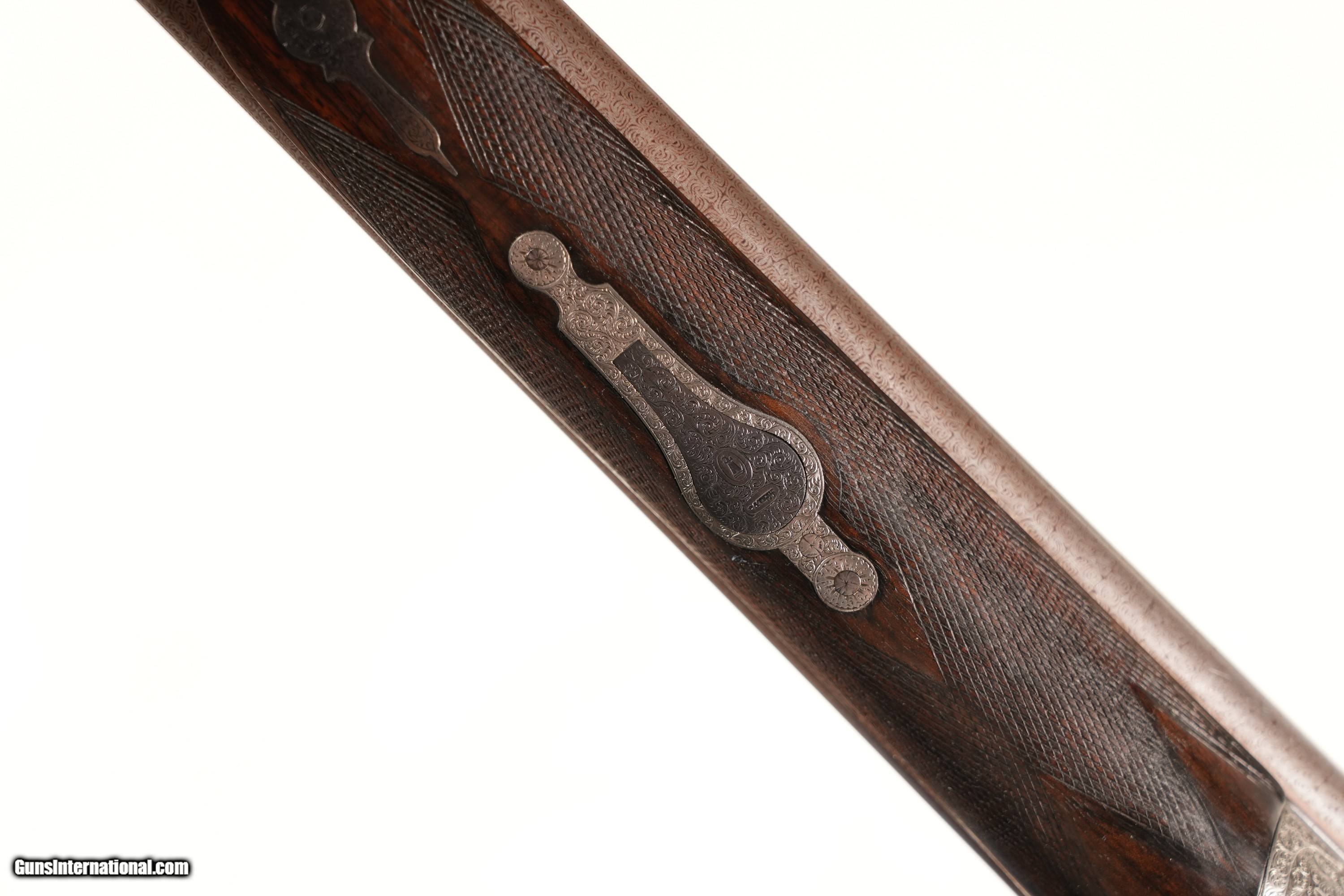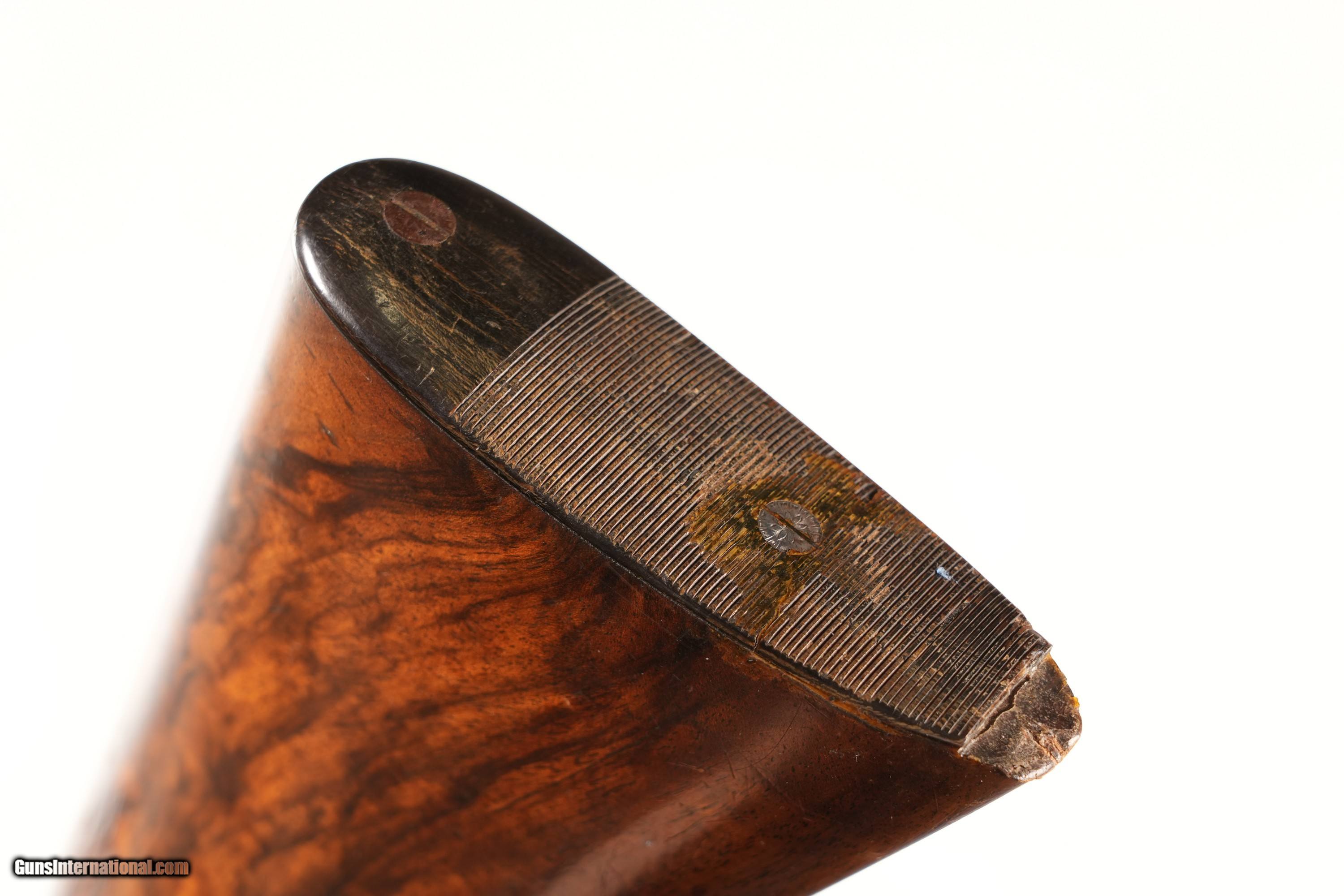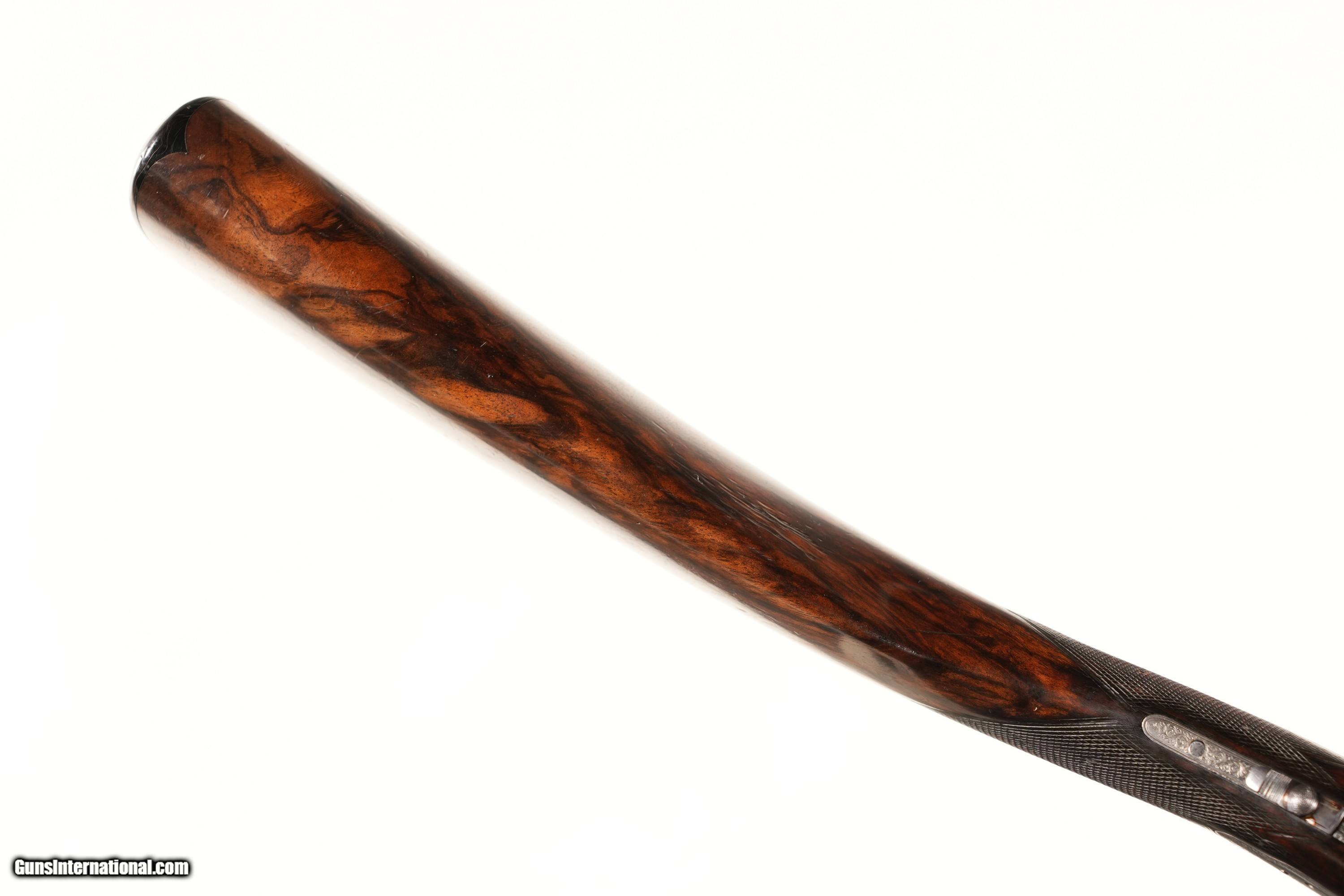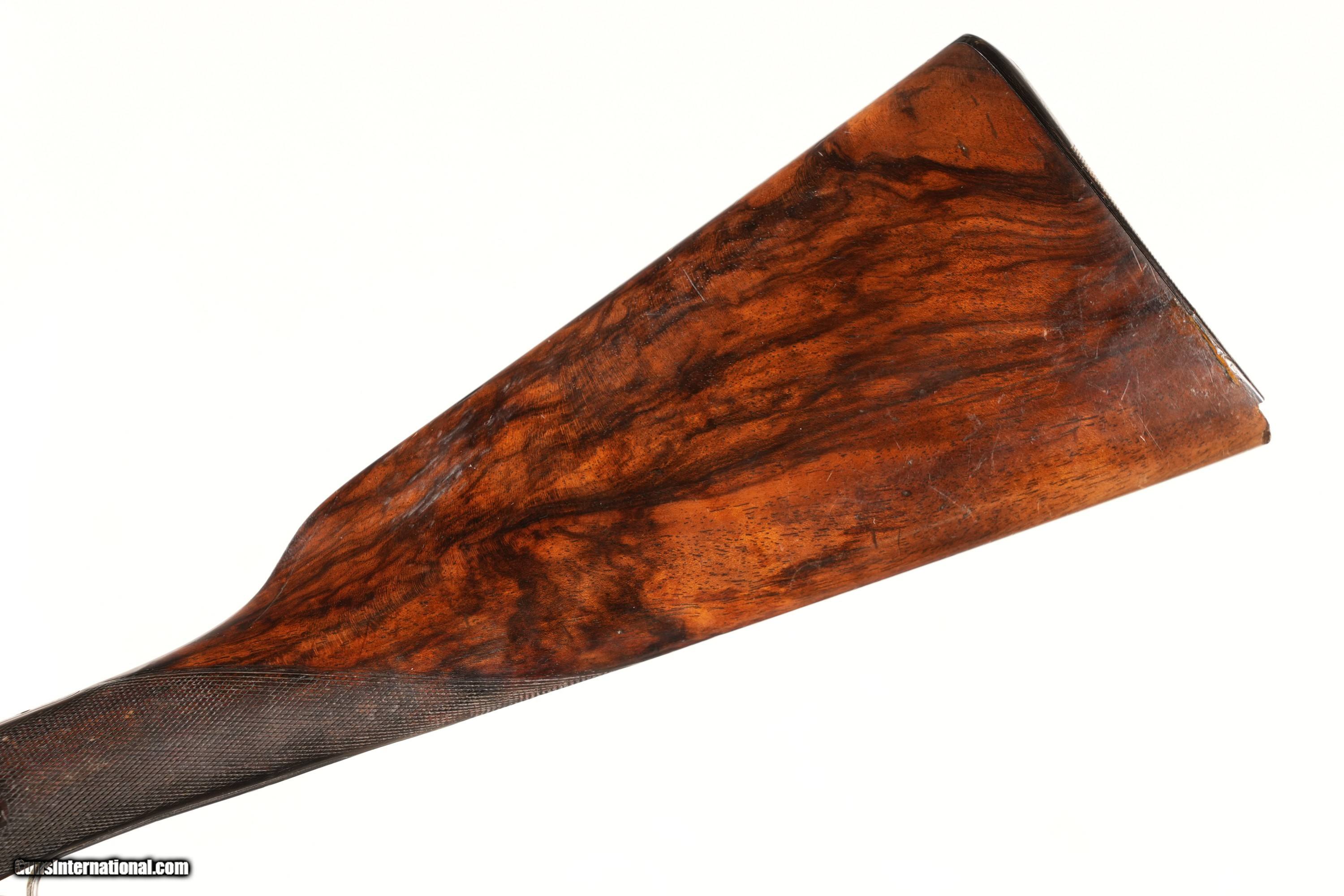 Description: WM Golden 16 Ga Side Lock double with ejectors and Cross Over stock with cocking viewing windows. 2 1/2" chamber choked Mod & Cyl with double triggers 14 1/4" LOP. condition, Very good as older refinished with soft markings. Mechanically fine with small chip at toe. • Free Shipping, No Credit Card Fees. • Lay-a-way available for this firearm. • 1/3 Down, a 1/3 in 30 Days 1/3 in 60 Days. SOLD Antique: Yes Shotgun Gauge: 16 Gauge Manufacturer: WM. Golden Model: Sidelock Serial Number: NSN Barrel Length: 30 |