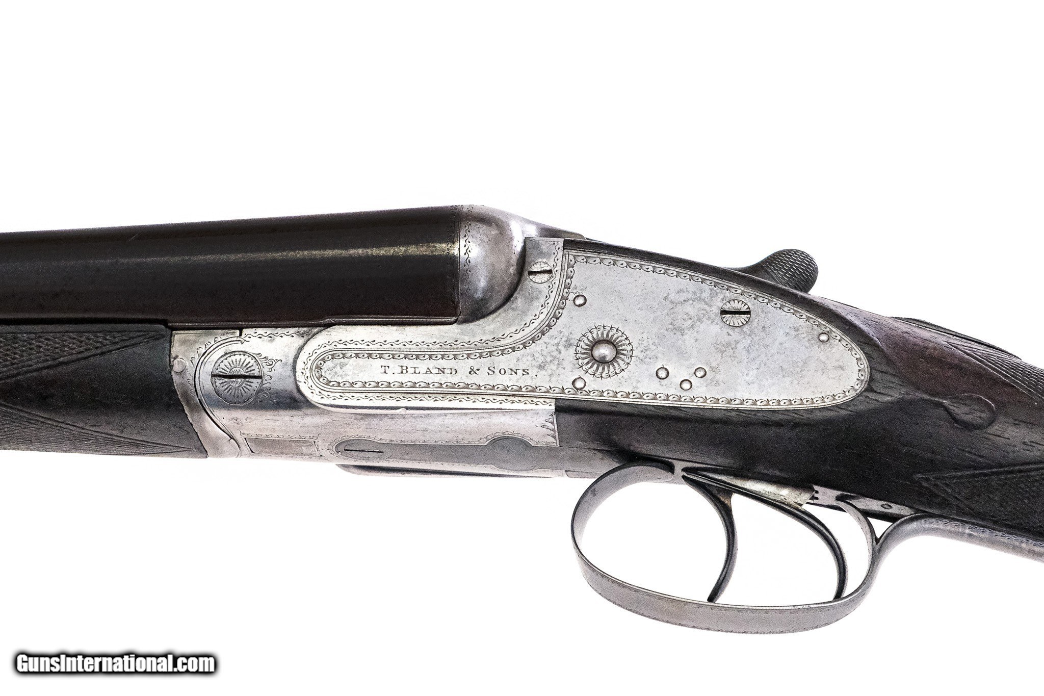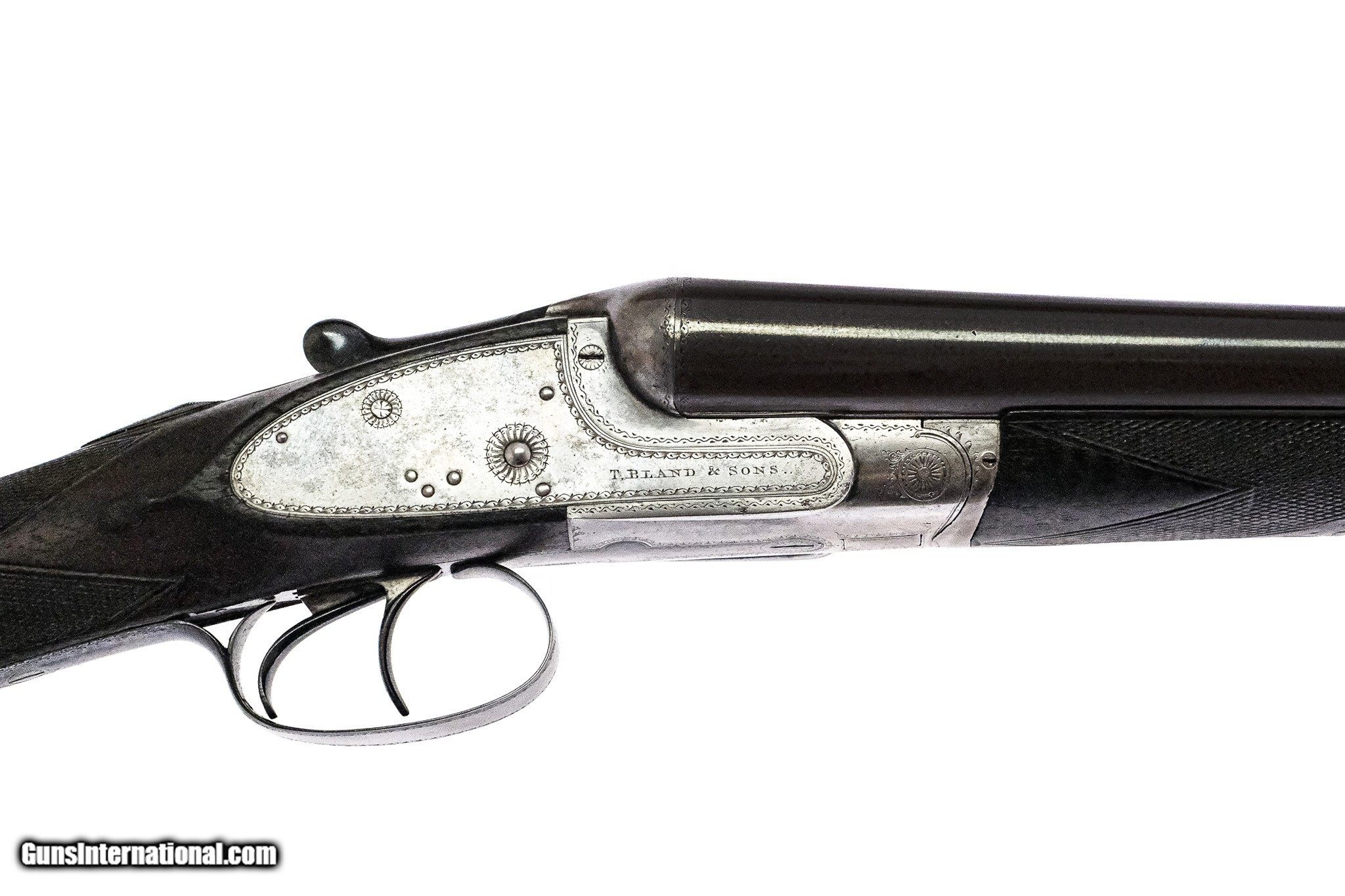 Description: T. Bland & Sons - SIdelock, SxS, 12ga. 30" Barrels Choked SK/IC. Ejectors, Damascus barrels, double triggers, auto safety, nicely figured European walnut, factory butt plate, straight grip stock, drop points, splinter forend with ebony tip, in good working condition. Inv: 52110 6 lbs. 14 oz. 14 1/2" x 1 1/2" x 2 1/2" $3,750.00 SOLD |