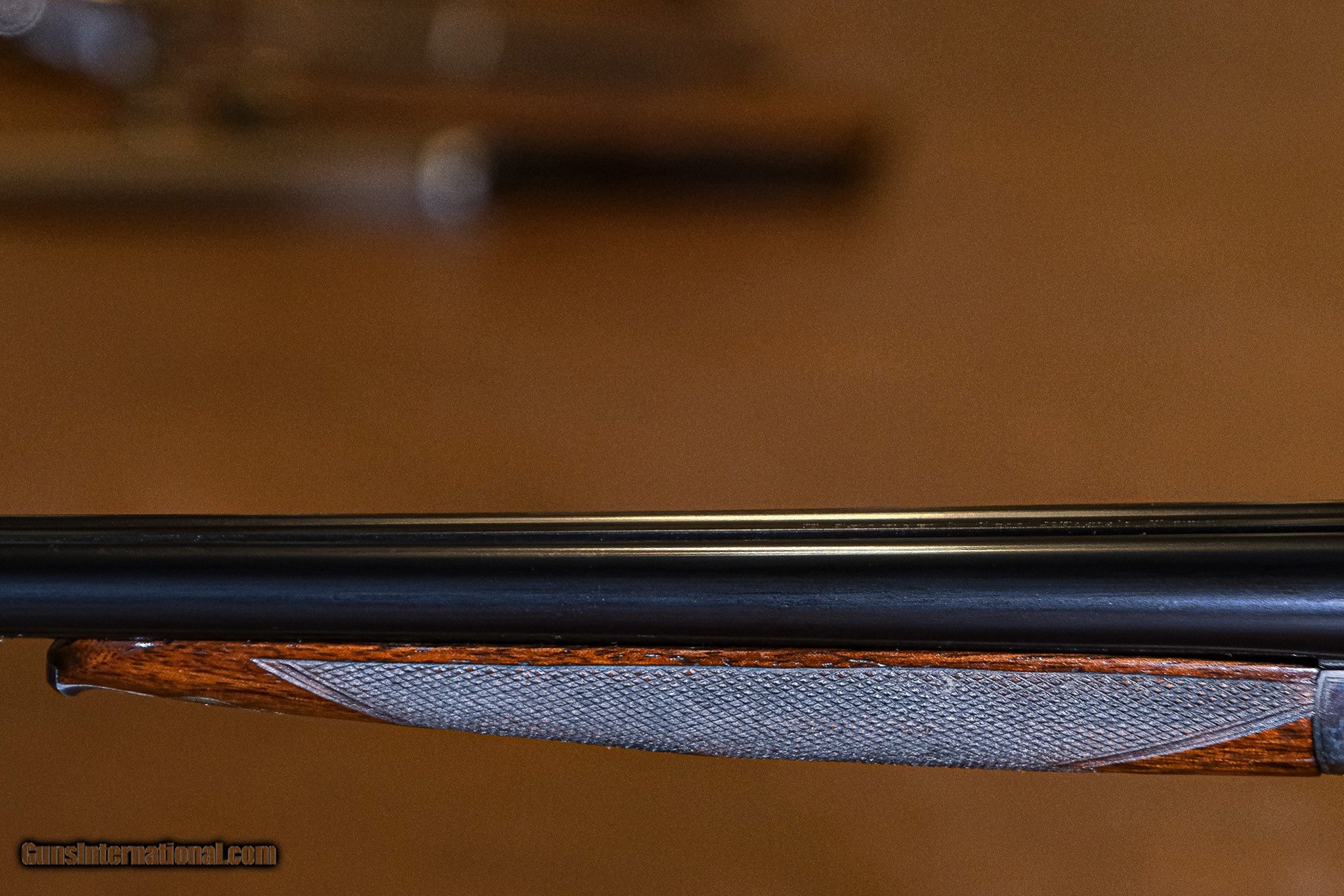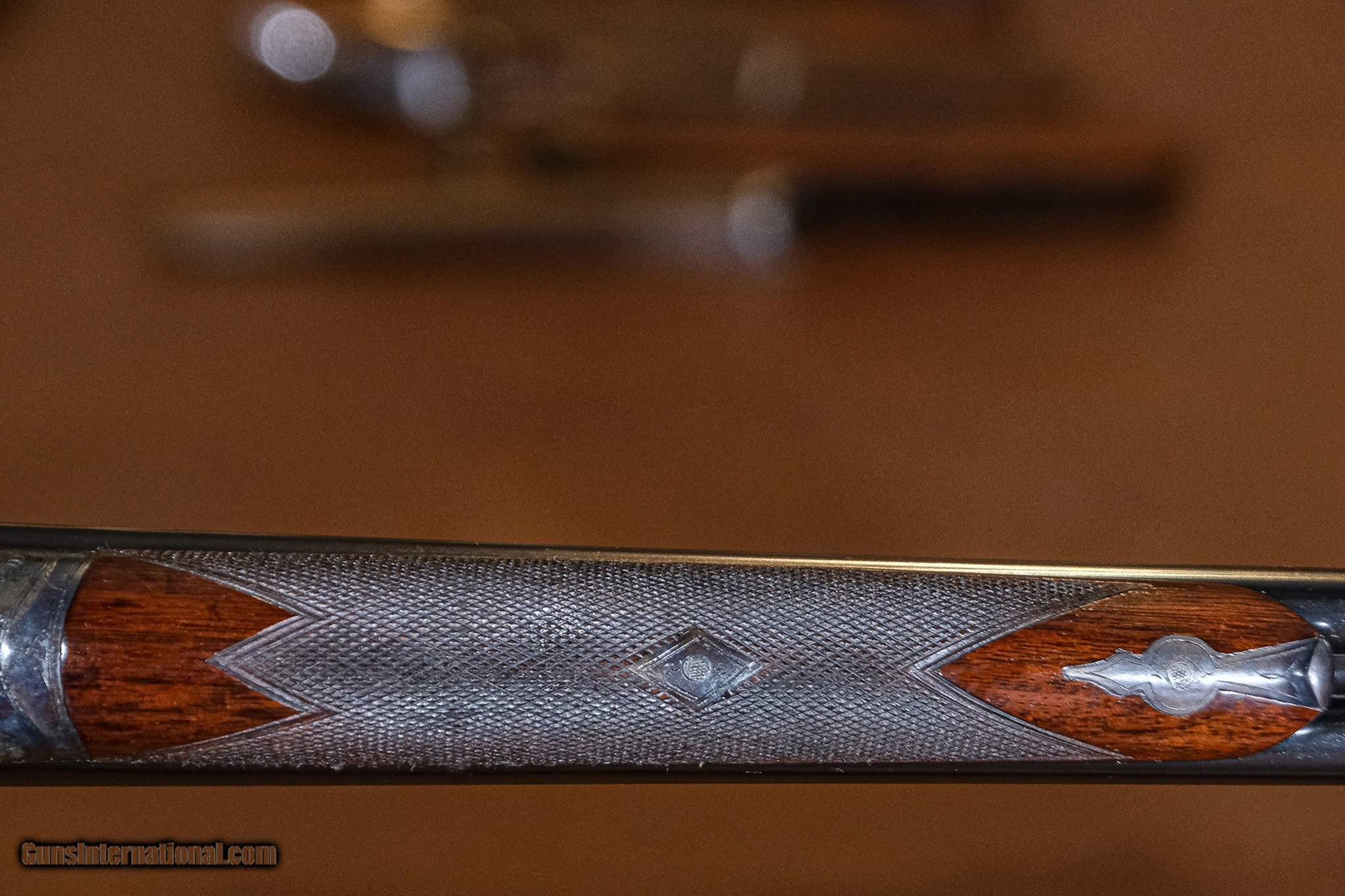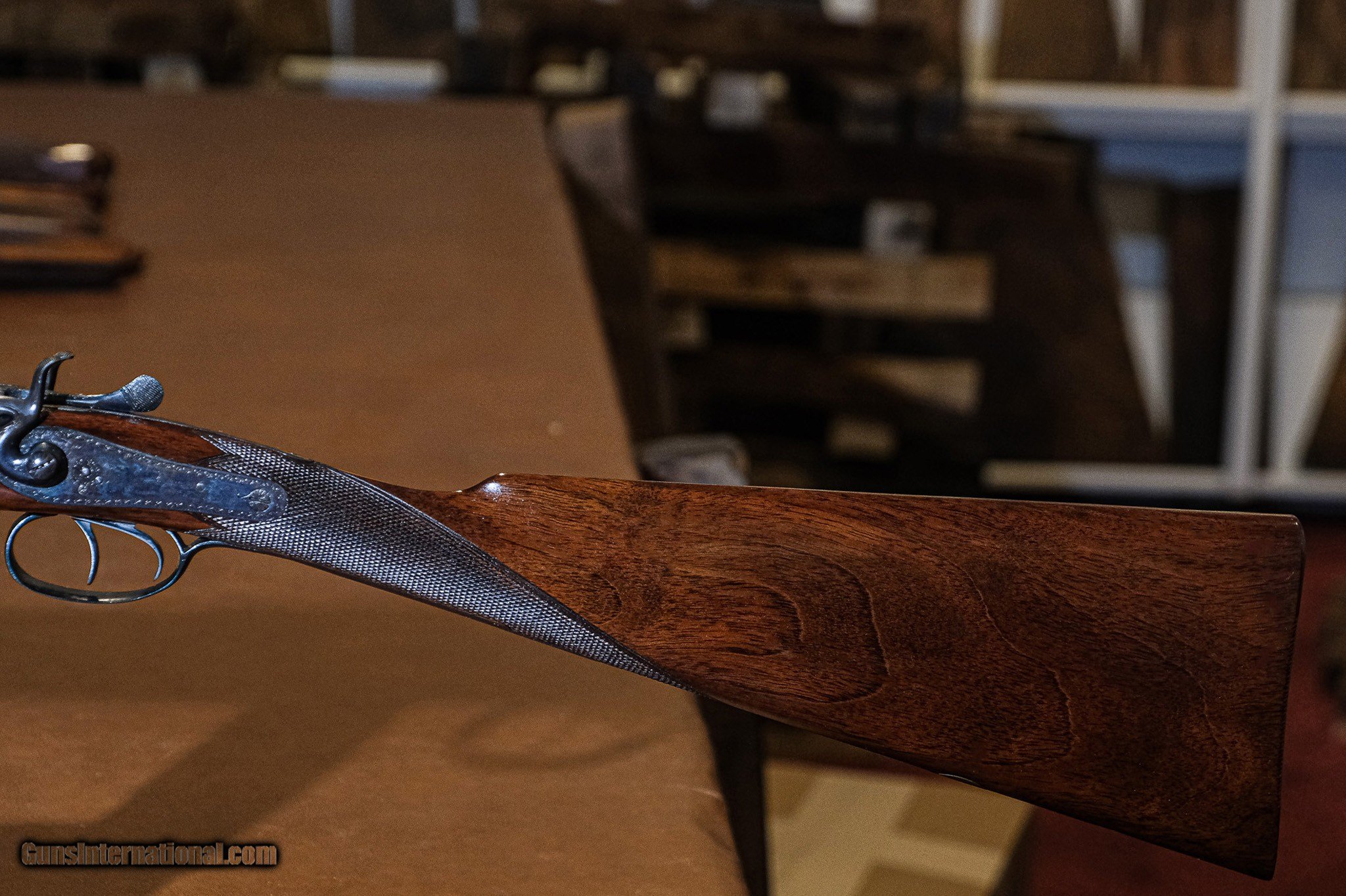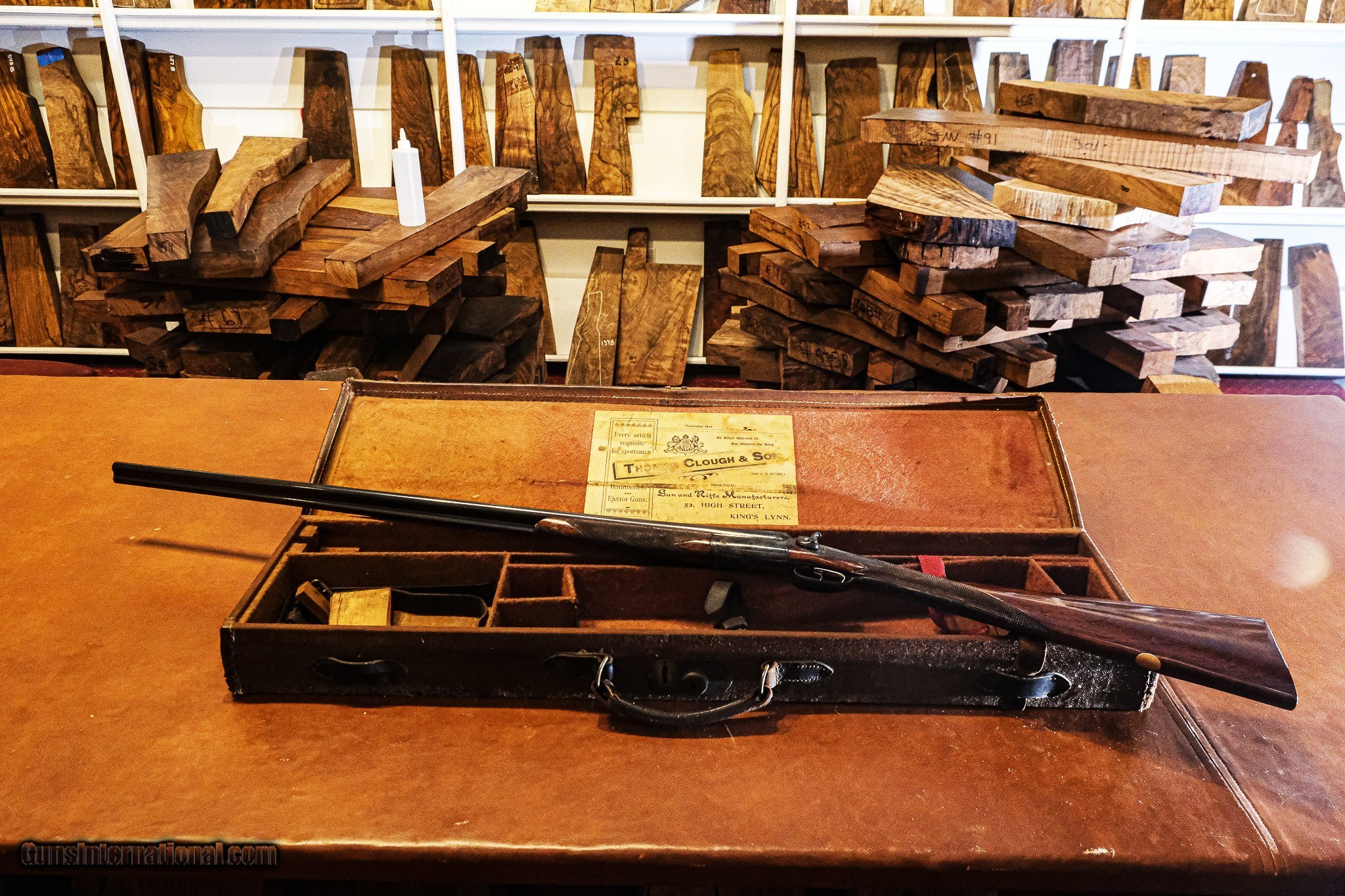 Description: T. Clough & Son - Double Barrel Top Lever Hammer Gun, .410. 28" Barrels Choked CYL/F. Made in 1919, nitro barrels, rib engraved with “T. CLOUGH & SON. KING’S LYNN”, rebounding back action locks, border engraved, straight grip, serrated butt, single trigger, extractor, gold oval. Overall, the gun is very clean and tight. 99% blue, wood finish, and checkering. In its original canvas case with Thomas Clough label. The case is in poor shape, but the gun has been used very little. Inv: 87654 4 lbs. 4 oz. 14 ½" x 1 ¼" x 2" $4,995.00 SOLD |