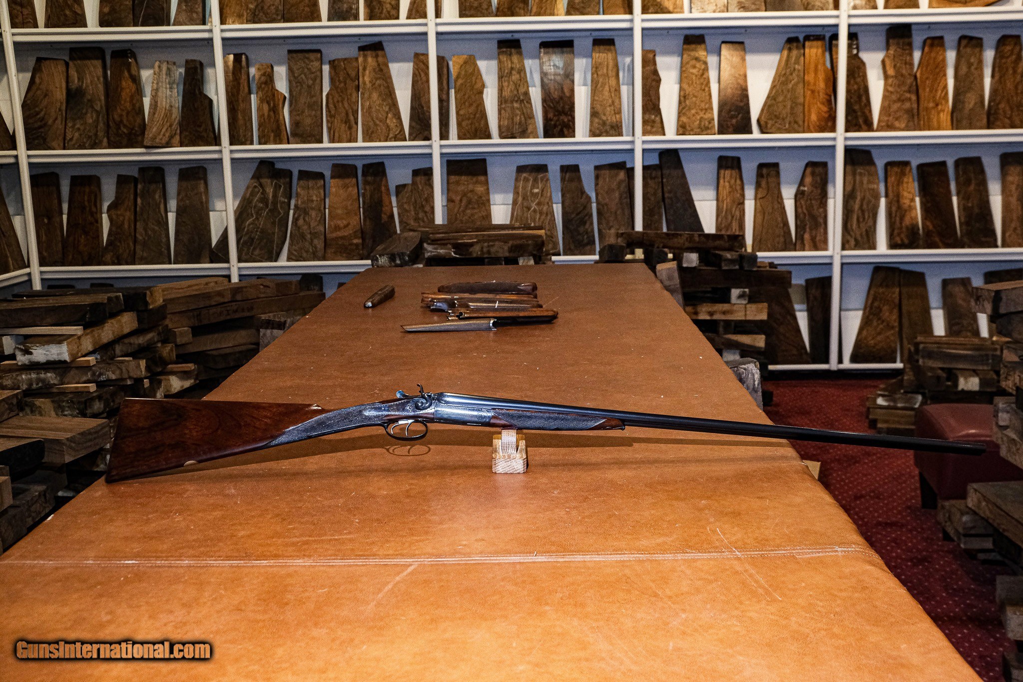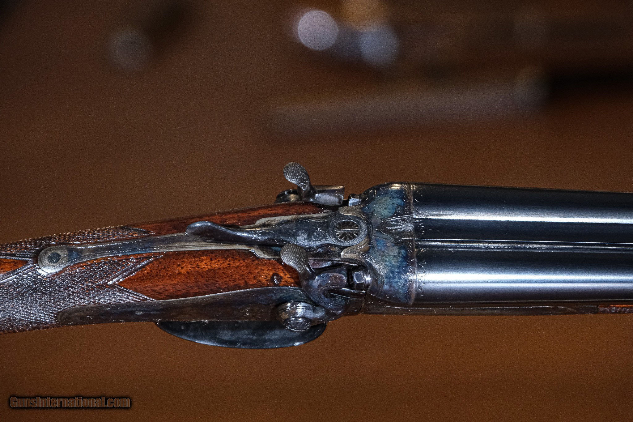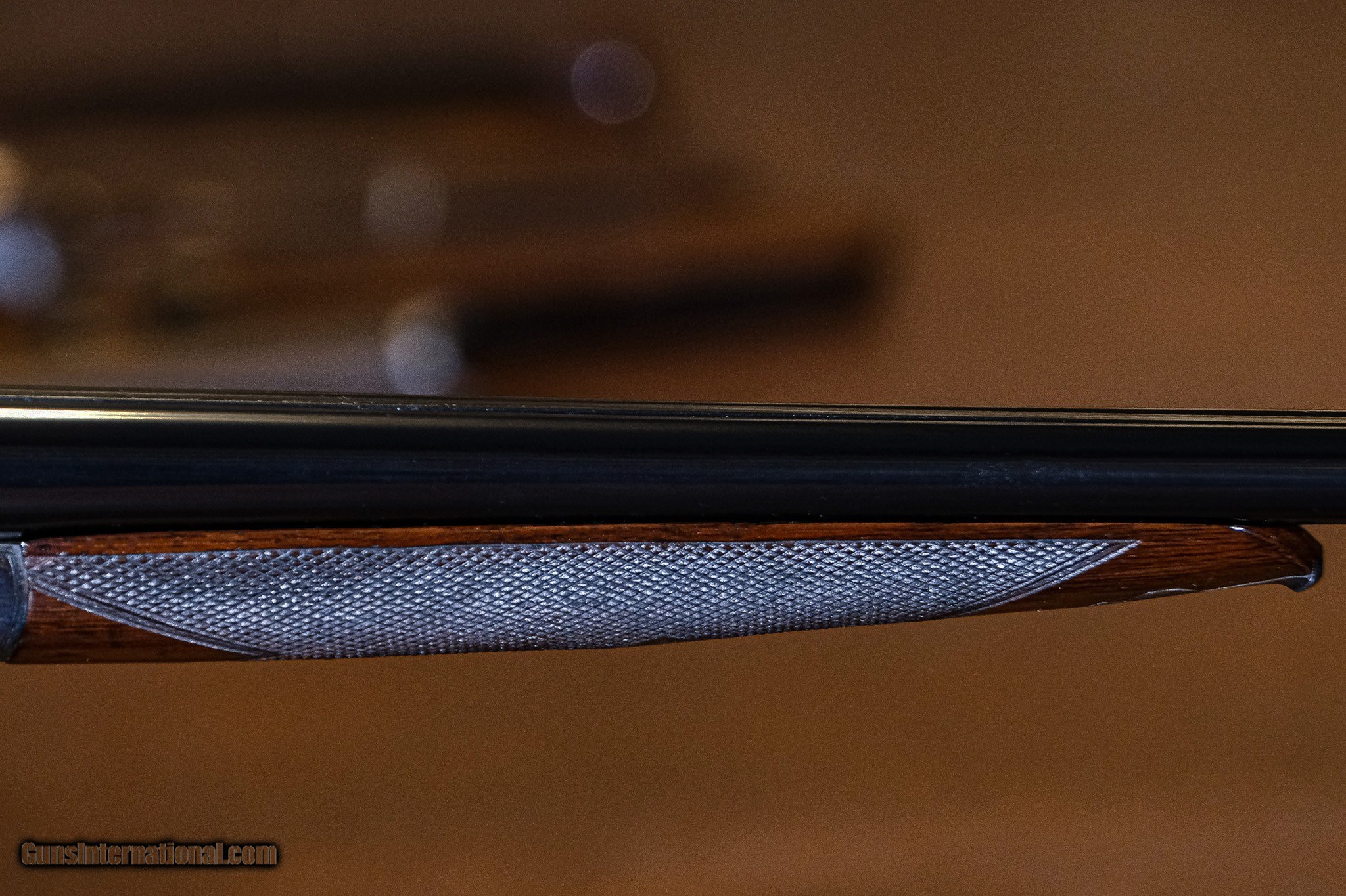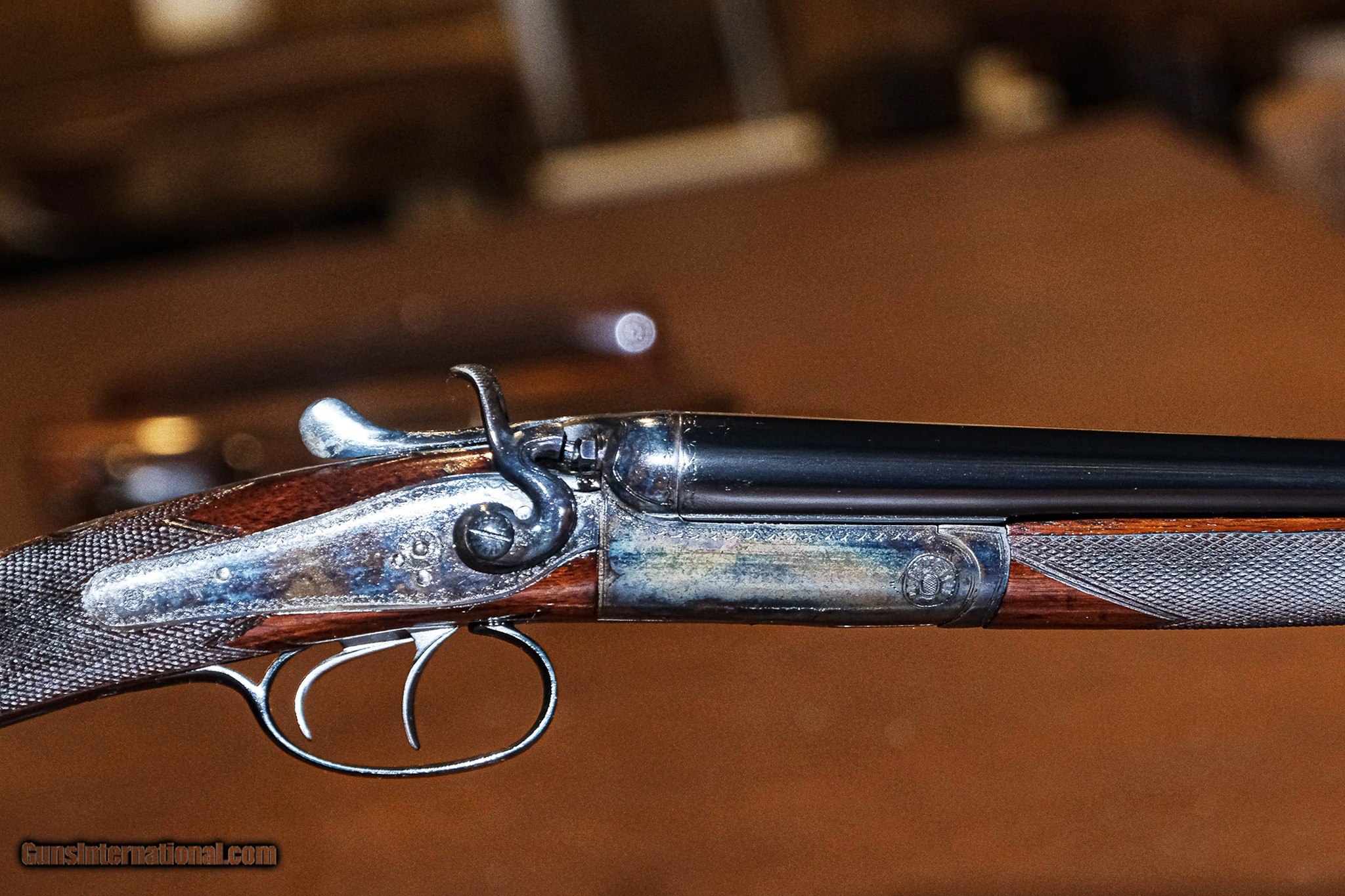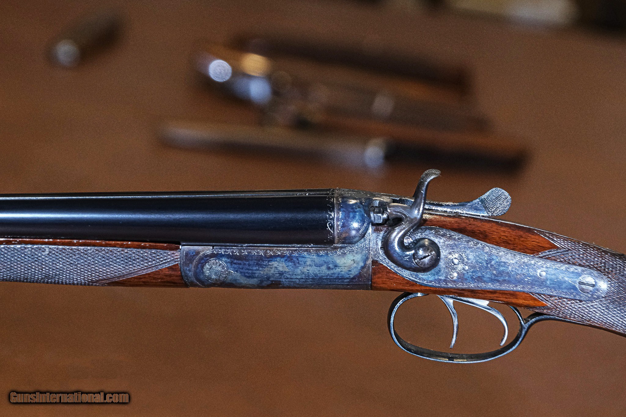 Description: T. Clough & Son - Double Barrel Top Lever Hammer Gun, .410. 28" Barrels Choked CYL/F. Made in 1919, nitro barrels, rib engraved with “T. CLOUGH & SON. KING’S LYNN”, rebounding back action locks, border engraved, straight grip, serrated butt, single trigger, extractor, gold oval. Overall, the gun is very clean and tight. 99% blue, wood finish, and checkering. In its original canvas case with Thomas Clough label. The case is in poor shape, but the gun has been used very little. Inv: 87654 4 lbs. 4 oz. 14 ½" x 1 ¼" x 2" $4,995.00 SOLD |