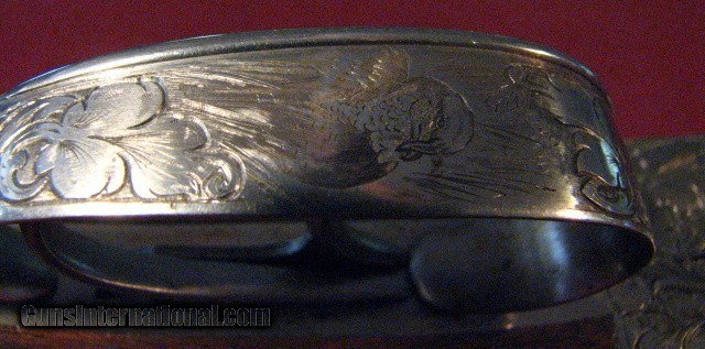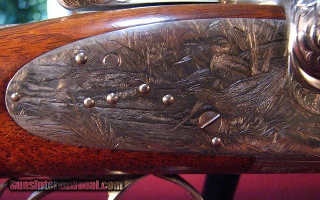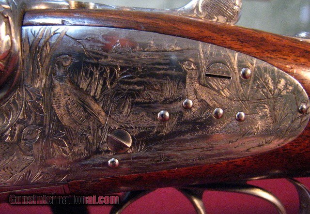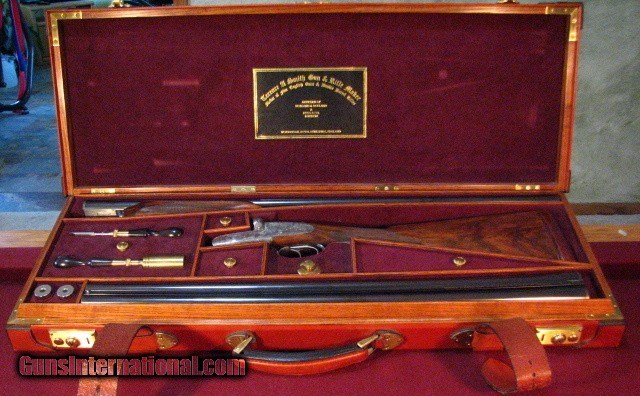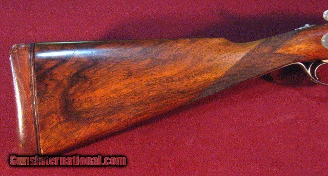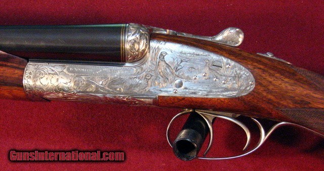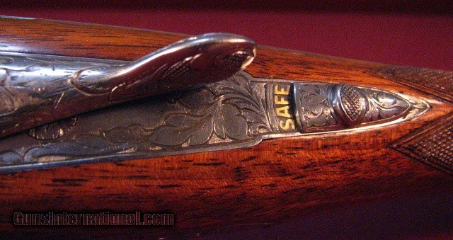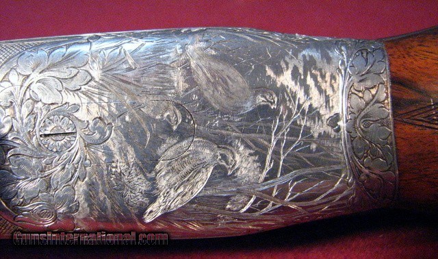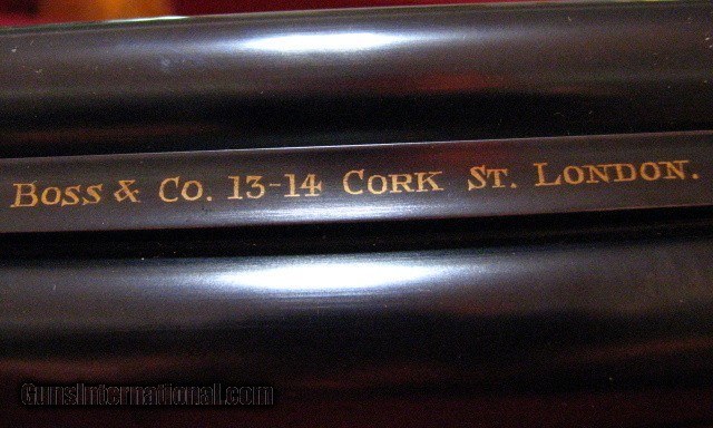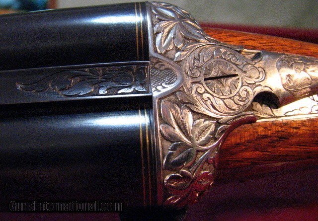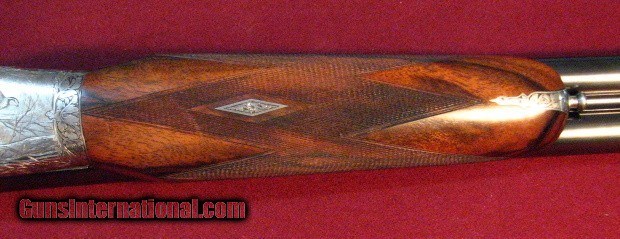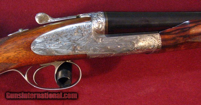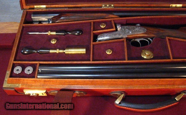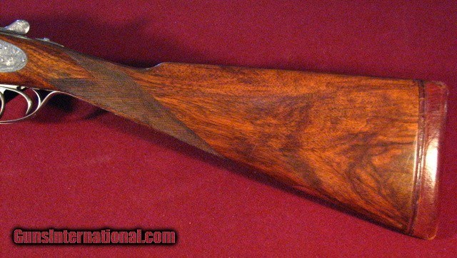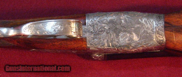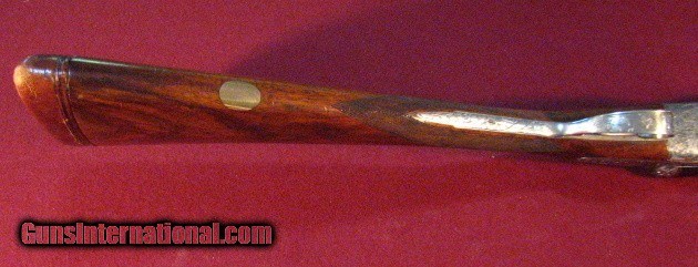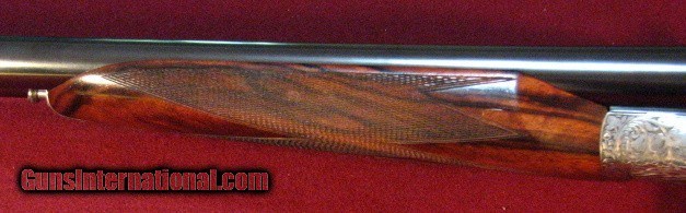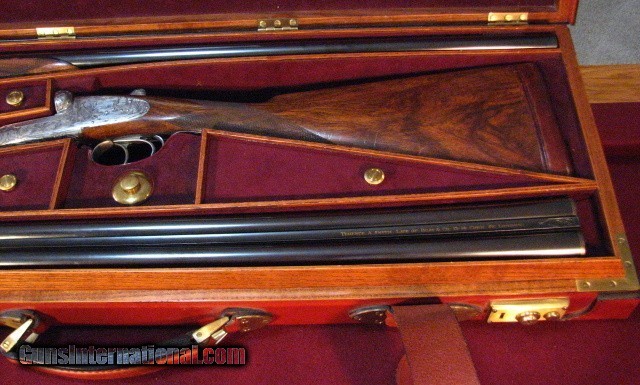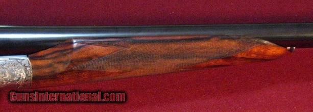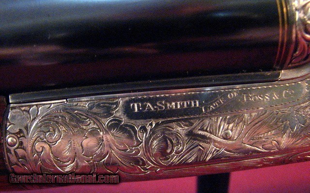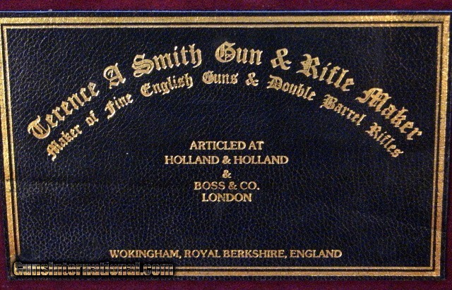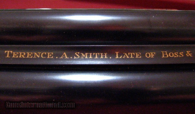 Description: Fabulous Terrence A. Smith. Late of Boss & Co. 13-14 Cork St. London 12 Gauge round body sidelock two barrel set with 28" and 25" chopper lump ejector barrels all with bores as new and all measuring .729 as London proved in 1981. Chambers proved 2 3/4". Concave game ribs with makers name inlayed in gold and double gold bands at the breech end. The 25" barrels are choked R- .008(IC) and L- .022(M). The 28" barrels choked R- .010(IC) and L- .031(F). The coin finished bar action round body sidelock action has bushed strikers and cocking indicators. It has full coverage engraving with deep relief vine engraving on the fences and bulino game scene engraving on the sides and floorplate. Pheasants on the left, Woodcock on the right, and Bobwhite on the floorplate with a Turkey on the trigger guard and English Setter on the top lever. Pictures do not do justice to the quality of the engraving. Stocked in the English style with 28 LPI point pattern checkering and a small beavertail forend using a very nice piece of European Walnut. LOP is 14 1/2" over a leather covered pad. DAC - 1 5/8" DAH - 2 3/8" Cast off 1/4" Weight is 6lb 12oz with 25" barrels and 7lb 1oz with 28" barrels. Cased in a French fitted Marvin Huey oak and leather trunk case with nickel plated snap caps and brass cleaning rod, oil bottle, brush, and turnscrew. Terrence A. Smith was a highly talented London gunmaker who uniquely served consecutive full apprenticeships to Boss and Holland & Holland in the 1960's. At Boss he apprenticed under Bill Wise who in turn apprenticed under Bob Henderson who designed the Boss over and under. At Holland & Holland he apprenticed under renowned double rifle maker Bill Keniston. Sadly Mr. Smith passed in December of 2021. This is a London best gun in every respect. Round body sidelock action, bushed strikers, cocking indicators, chopper lump barrels, and stocked to the fences. This is a very well done piece with lots of eye appeal. The stock has a number of slight impressions from light hunting use. Barrel blue remains at 99+% for both barrels. It is very tight and appears to have been shot very little. Just an outstanding upland game piece! SOLD |