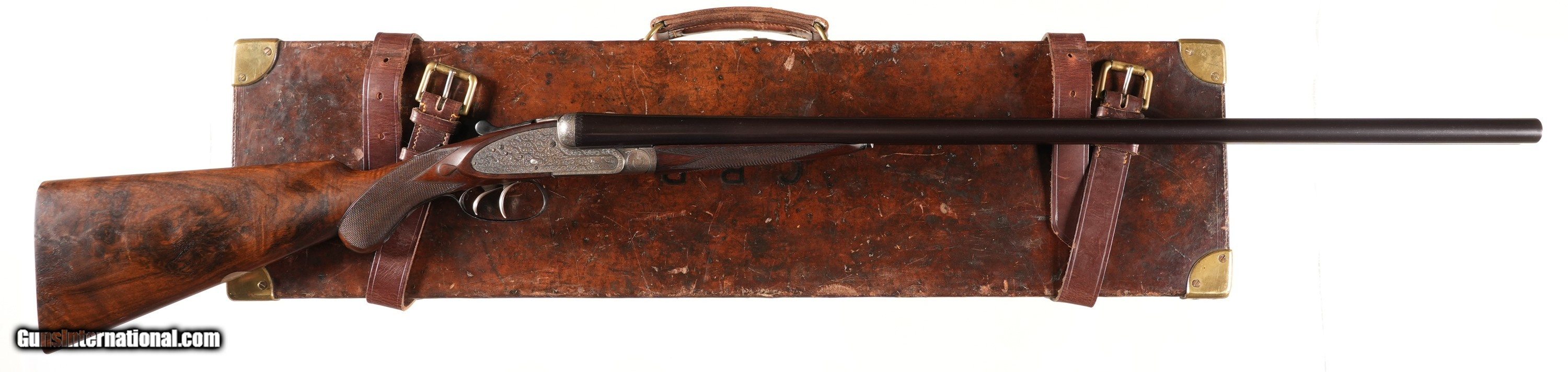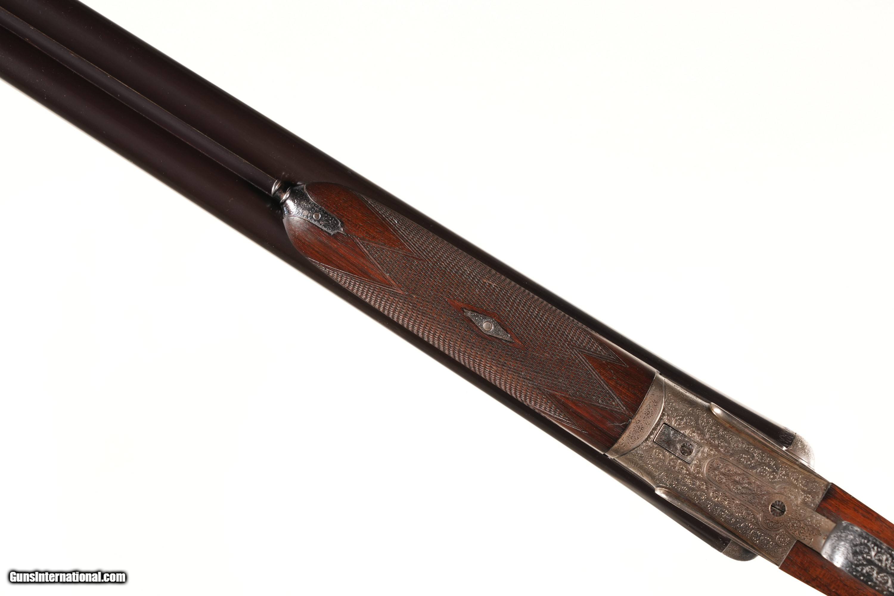 Description: 12 GA Serial # 8083 Thomas Wild 7 pin Side Lock Ejector 12 ga with double triggers and 2 1/2" chambers choked IM & IC with ejectors. Locks marked and top rib marked T.Wild with Top rib having 17-18 Whitehall st Birmingham. Teardrop pattern round knob pistol grip walnut stock with oil finish and checkered butt. Comes in relined Leather Transit case with accessories. 14 1/2" LOP 1 5/8" DAC 2 1/4" DAH Neutral Cast 6 lbs 9 oz Bbl, thickness RT=.029 L .030 Condition, Very fine with 90% bright barrel finish with fine bores and receiver remains in polish with crisp legends and engraving. Stocks are very fine with period of use impressions and fine checkering. Case is very fine as relined. Mechanically excellent Barrel 30 • Free Shipping, No Credit Card Fees. • Lay-a-way available for this firearm. • 1/3 Down, a 1/3 in 30 Days 1/3 in 60 Days. SOLD Manufacturer: Thomas Wild Model: Sidelock Serial Number: 8083 Barrel Length: 30 |