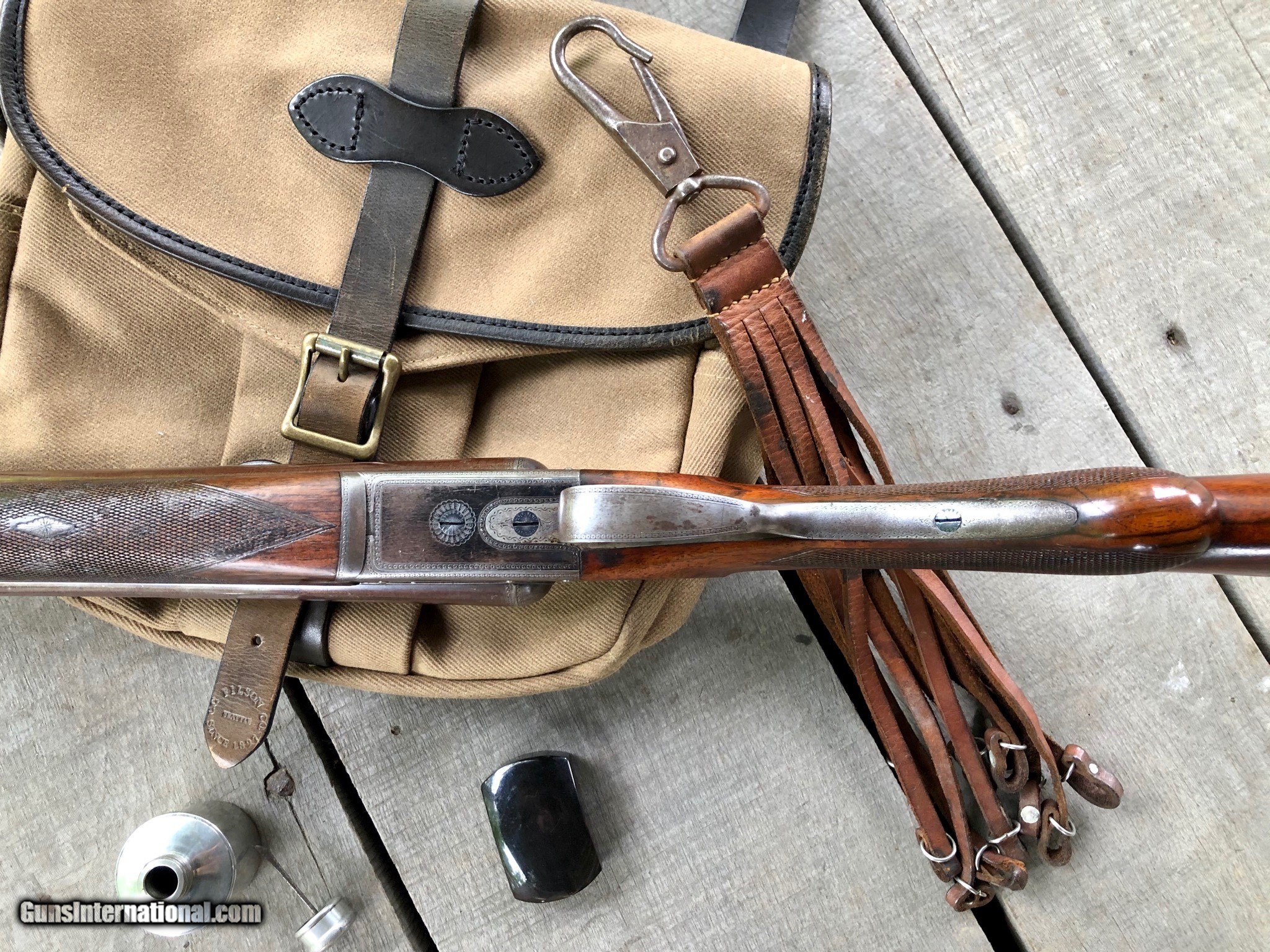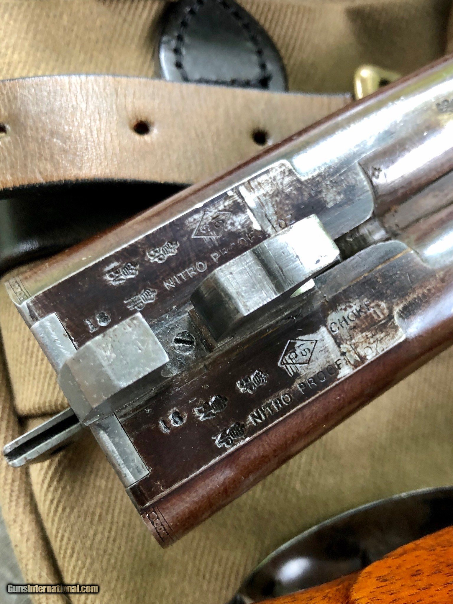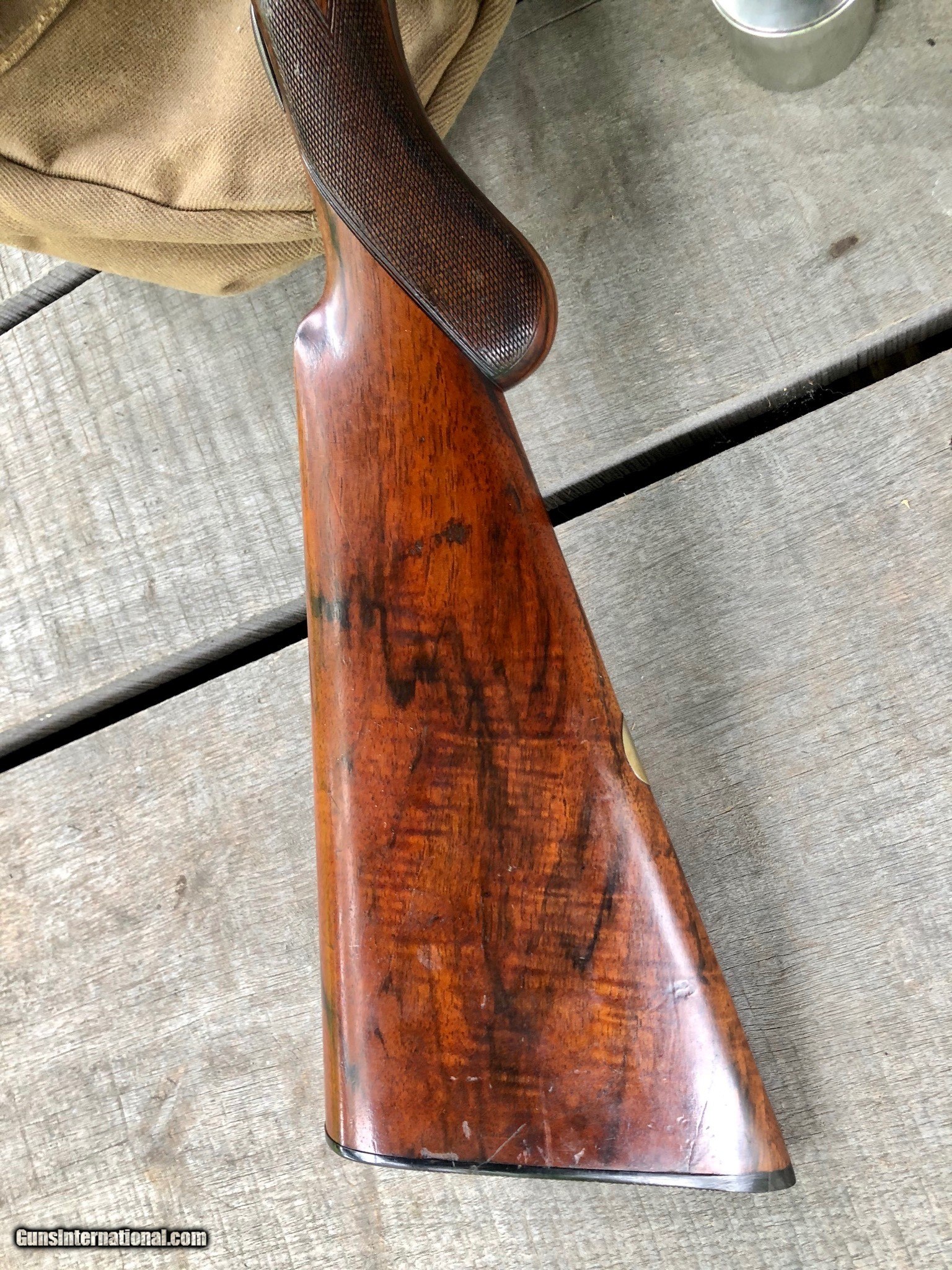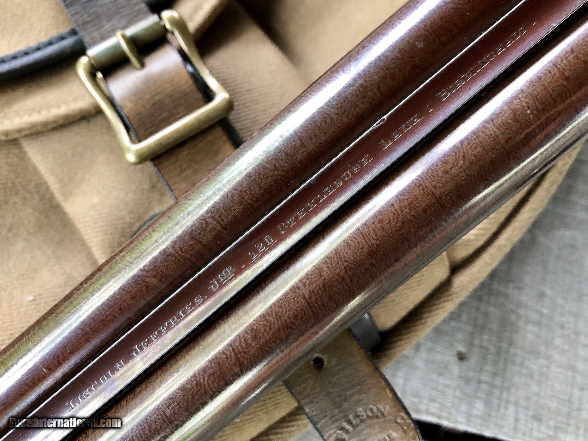 Description: A very good lightweight Lincoln Jeffries Jnr boxlock double 16 bore nitro proofed damascus sporting gun. I love the beauty of Damascus barrels but with the functionality of nitro proofing! This lovely little Anson & Deeley boxlock gun has a diminutive frame and wrist. It weighs just 5lbs 14ozs. The beautiful Damascus barrels are 30" long, have mint bores, cylinder on the right and the left choked light modified or, as the English put it, between 1/4 and 1/2, 2 1/2" chambers, and are nitro proofed. The barrels are fast to the gun with double lumps and grips and a rib extension cross-bolt similar to Greener's Wedge-fast. The configuration is thus similar to Greener's patented Treble Wedge-fast or Facile Princeps but it is an Anson & Deeley action with a cross-bolt. The gun has extractors but no ejectors. It is stocked in a Prince of Wales fashion in English walnut showing considerable curl at the butt and some interesting dark streak graining throughout, particularly through the left side of the wrist making one wonder if the wrist has been broken and repaired. It has not. The fine flat top checkering is in near excellent condition at the wrist but could stand to be freshened on the forearm. The stock has the usual bumps and bruises. The butt plate is horn. Lincoln Jeffries Jnr was in business at 120 Steelhouse Lane in Birmingham from 1917 to about 1939 making this a late Damascus barreled gun but again, it is nitro proofed. If your looking for a light and lively English side-by-side bird gun with beautiful Damascus barrels but nitro proofed to take to the field, this gun should be a contender. SOLD Curio/Relic: Yes Manufacturer: Lincoln Jeffries Jnr Model: double 16 bore sporting Serial Number: none Bore: 16 Chambers: 2 1/2” Ejectors: none Condition: very good Bore Condition: mint Barrels: Damascus Barrel Type: Damascus Action: Anson & Deeley Triggers: double Gauge Info: 16 Stock: English walnut Stock Drop: 1 3/4” Stock Heel: 2 9/16” Stock Cast: for right hand shooter Butt Pad: horn LOP: 14 1/4 Rib: game Weight: 5lbs 14 ozs Sights: brass bead Manufacture Date: 1917-1939 Choke Left: light modified or between 1/4 and 1/2 Choke Right: cylinder Extras: nitro proofed Damascus barrels Proof:Nitro: yes |